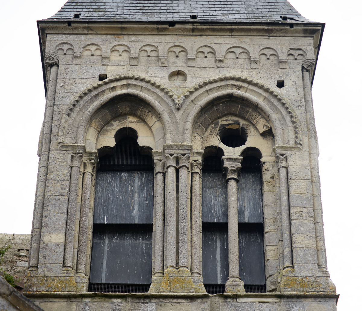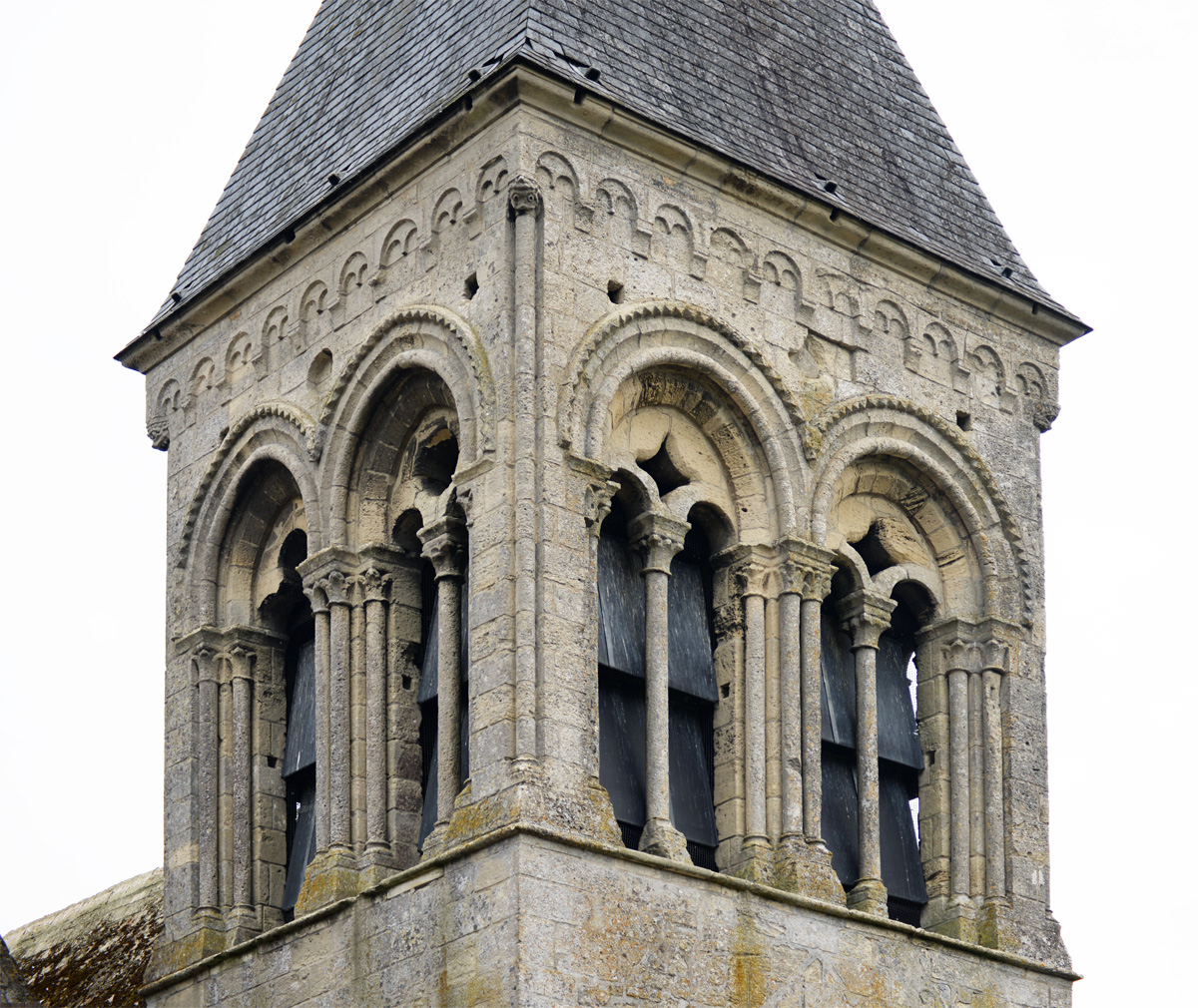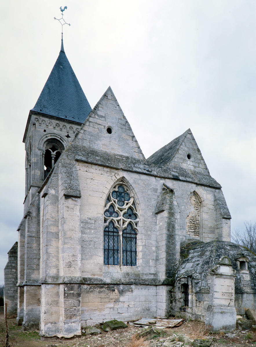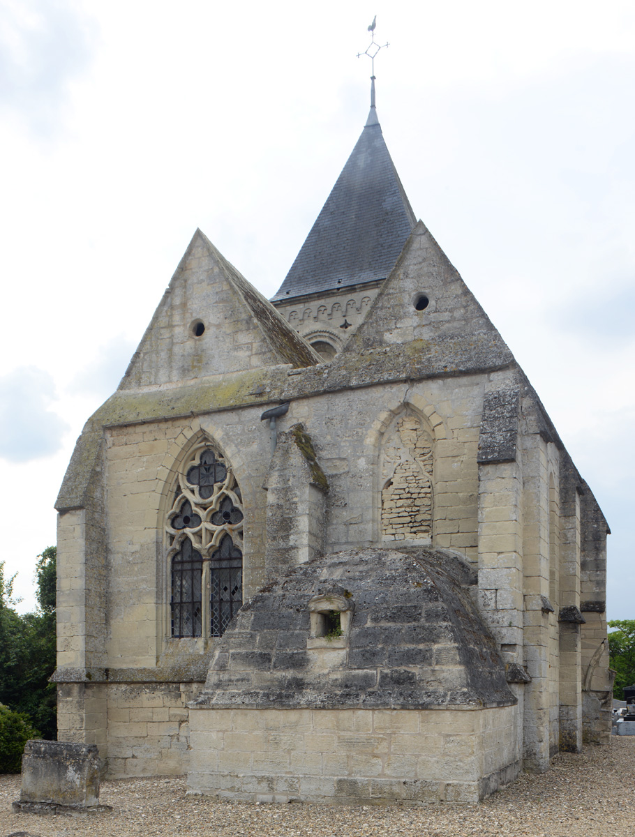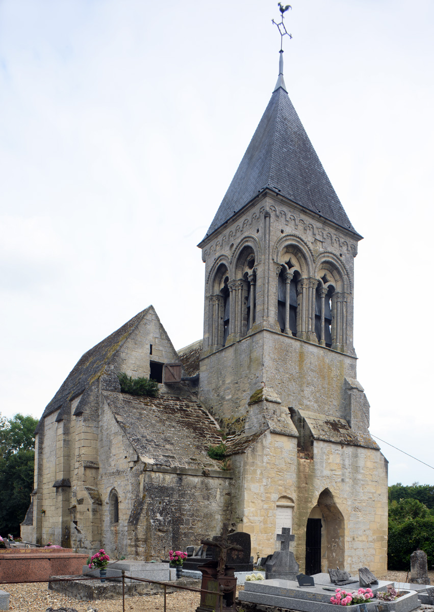 La travée qui porte le clocher, bâtie au milieu du 12ème siècle, comporte une voûte en berceau brisé. Une petite chapelle lui a été adjointe au nord dans le dernier quart du même siècle. C’est aussi de cette époque que date le clocher, que l’on rapprochera, par sa conception et son décor, de ceux de Mogneville et Cauffry.