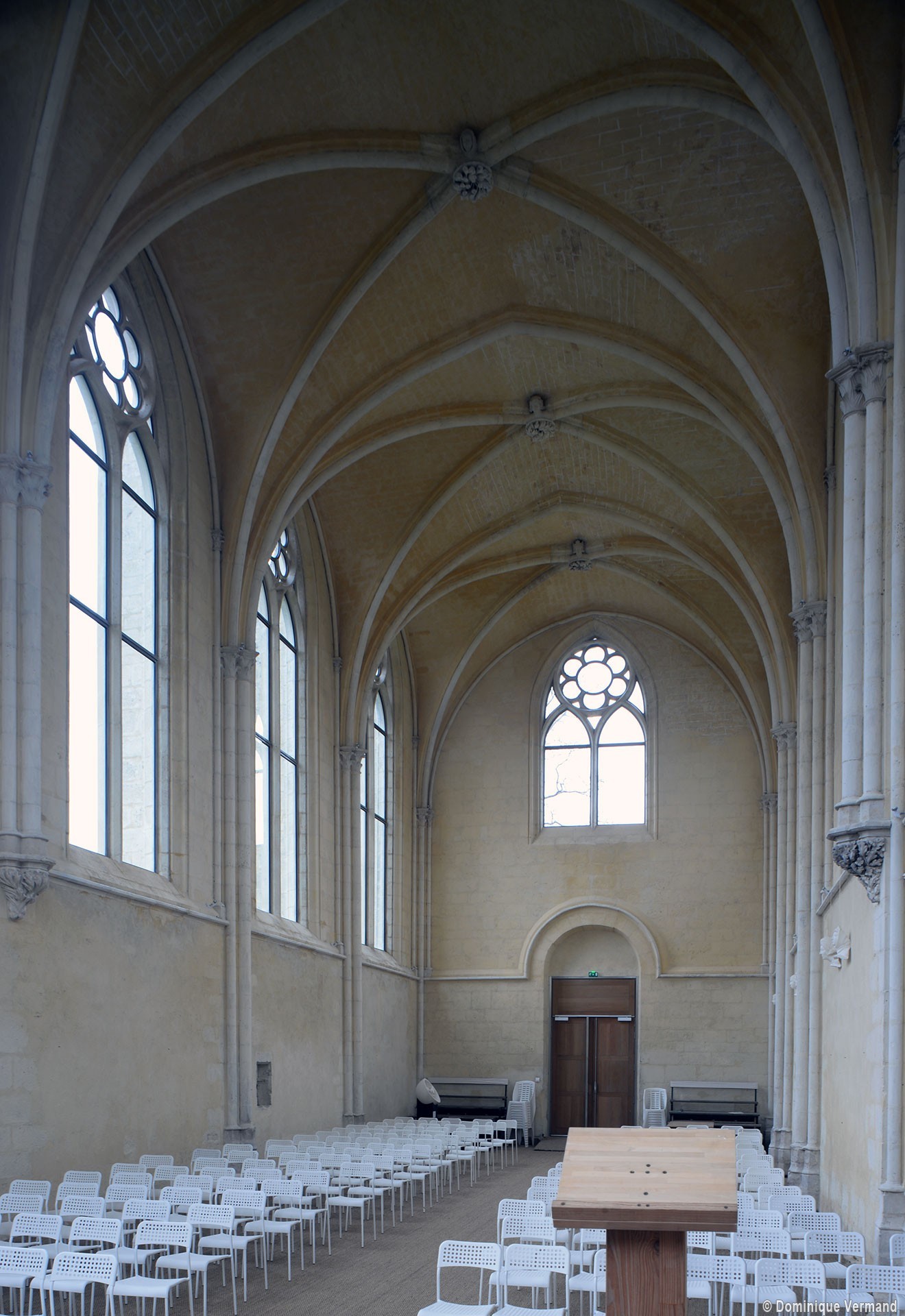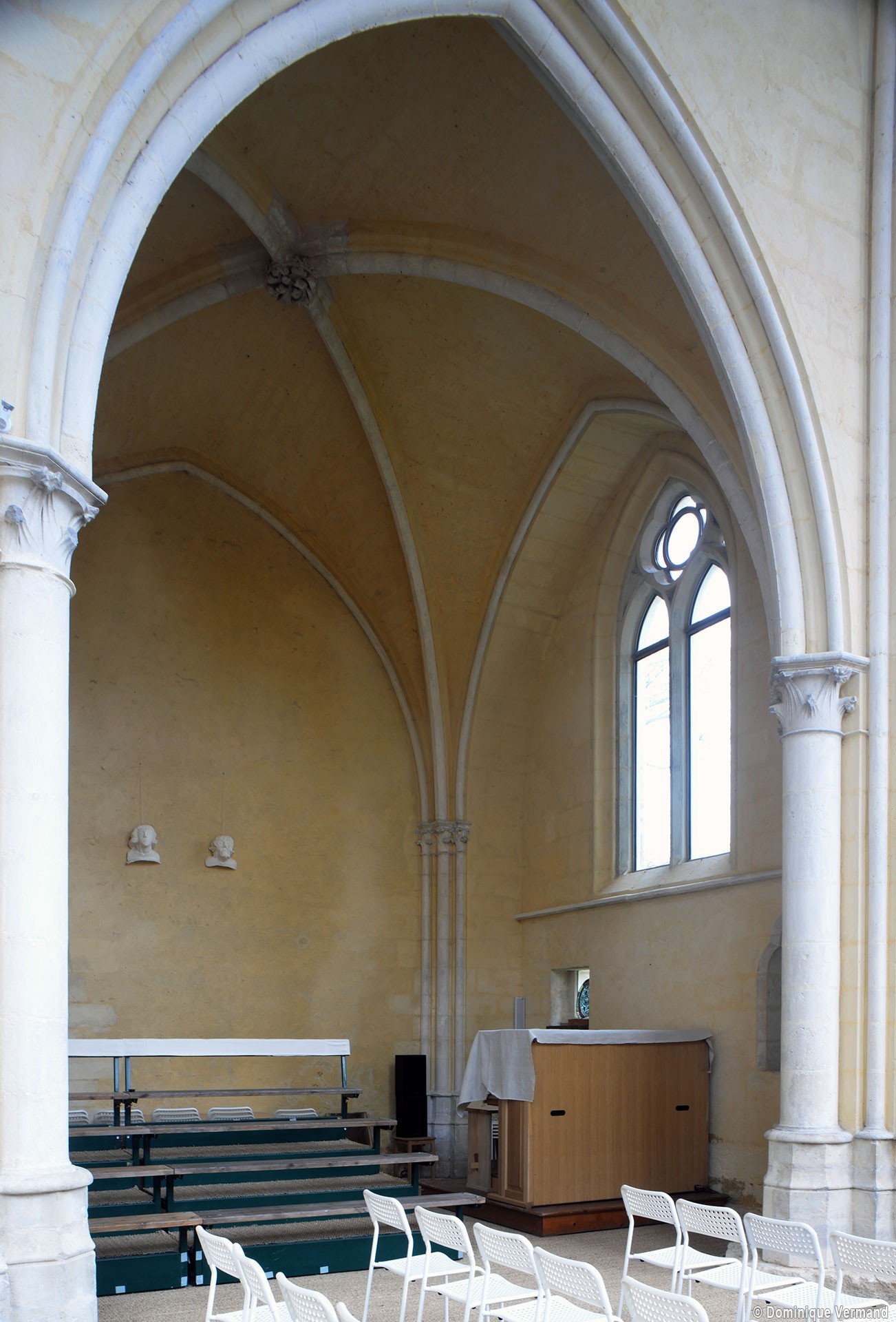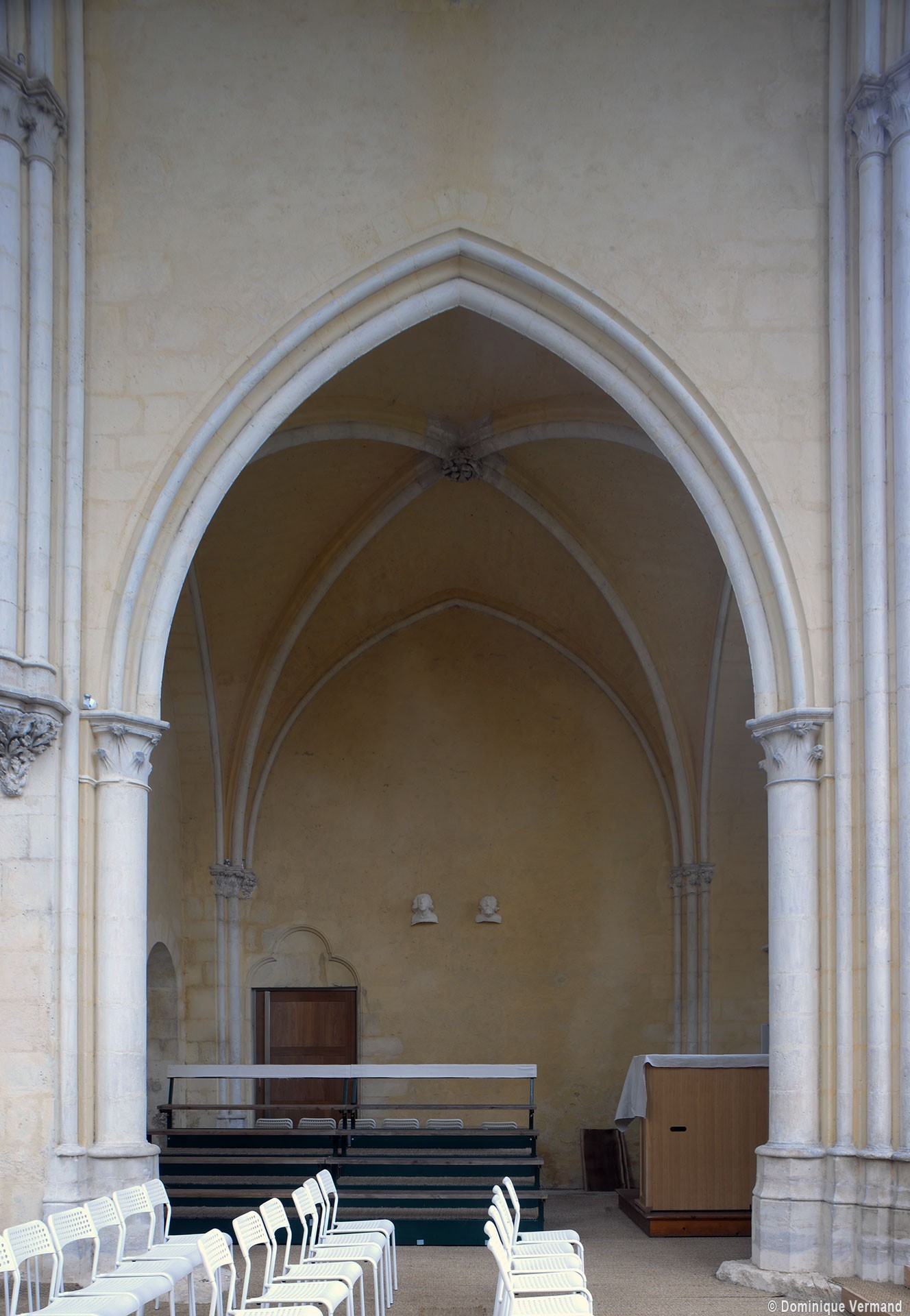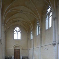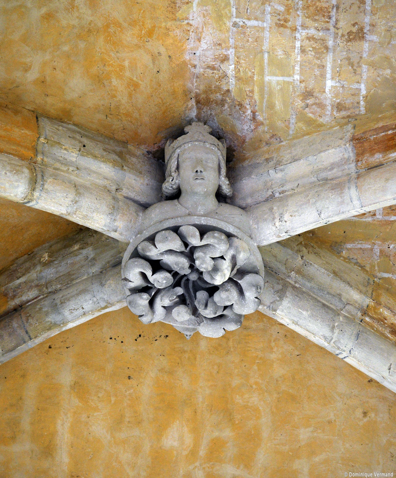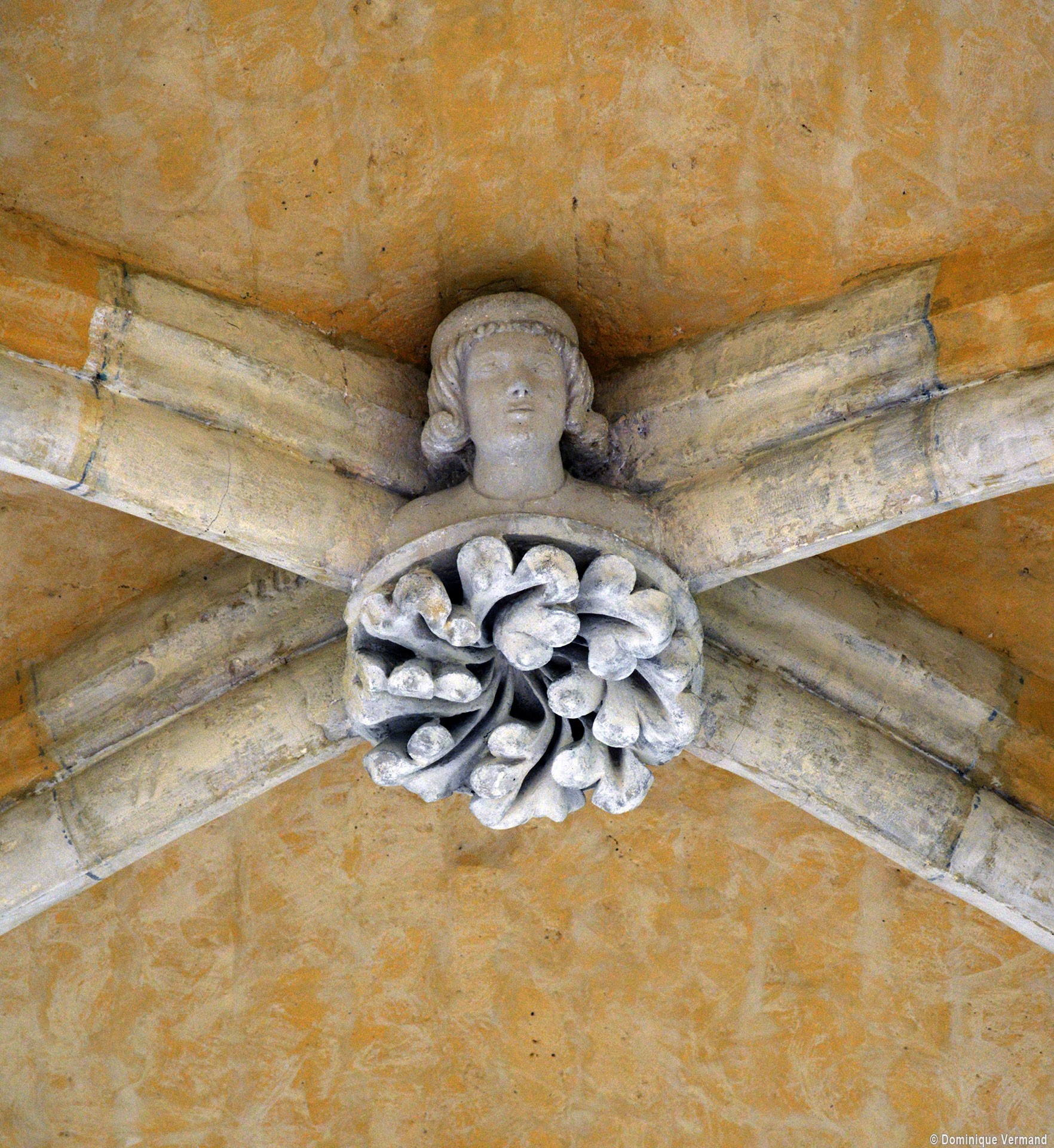 L’intérieur offre la belle unité spatiale propre aux chapelles palatines ou abbatiales contemporaines. Les voûtes d’ogives sont reçues sur des chapiteaux à crochets, rigoureusement structurés par l’intermédiaire de tailloirs disposés en diagonale (à bec) pour ne pas interrompre visuellement la continuité des lignes de force de l’architecture. Juste avant la dernière travée, les retombées s’effectuent toutefois sur des culs-delampe – sans doute en relation avec une clôture de chœur disparue – dont la sculpture d’une exceptionnelle qualité se retrouve aux clefs de voûte, agrémentées de têtes féminines et masculines, parfois couronnées.