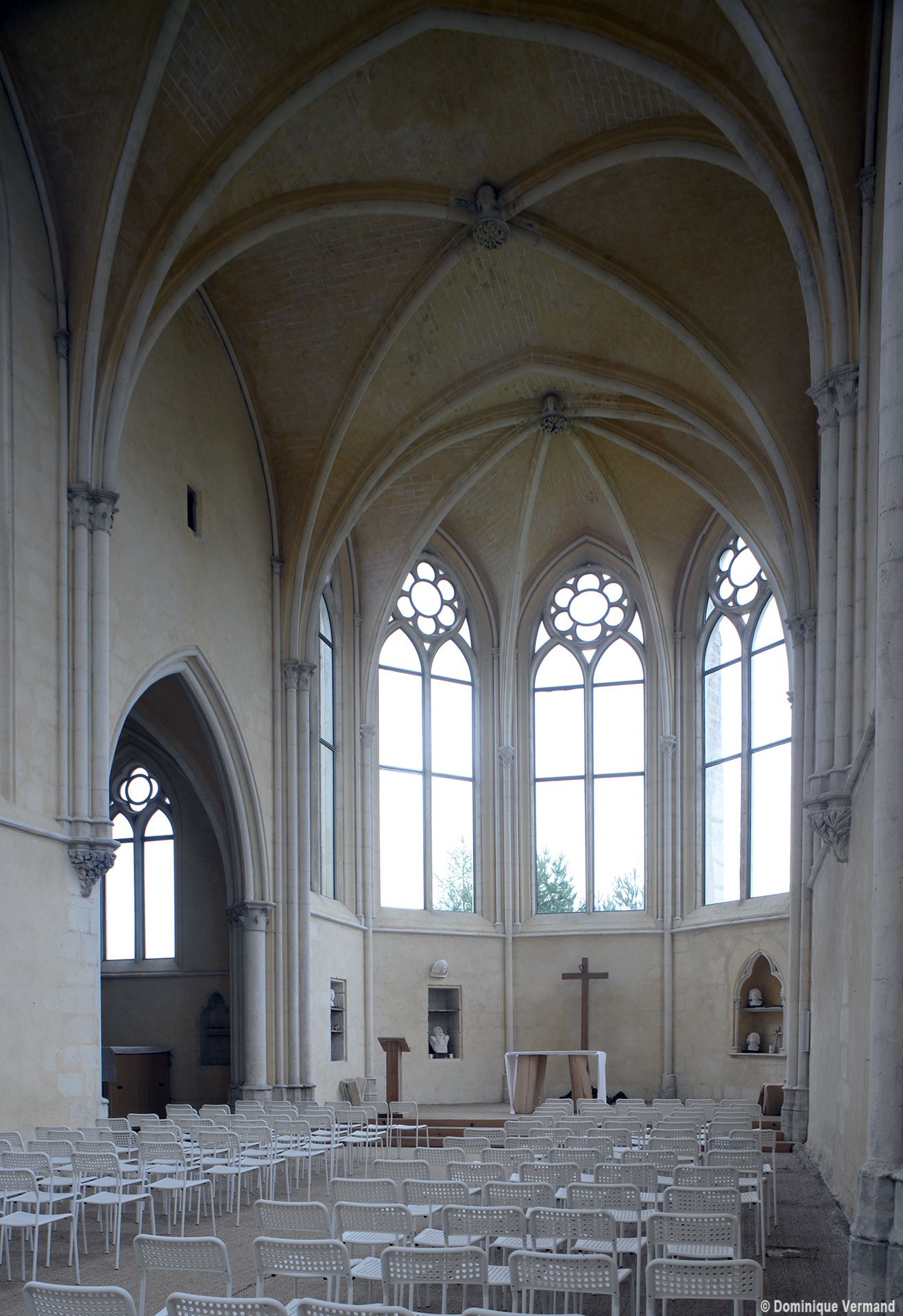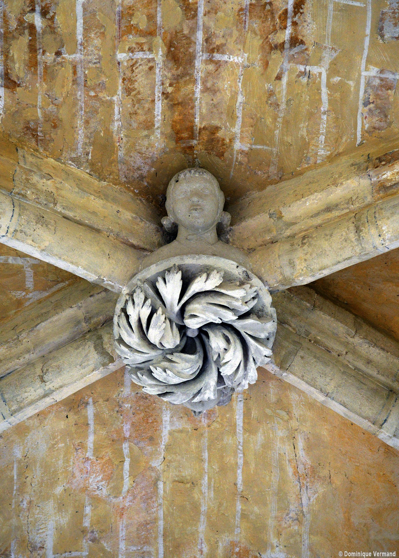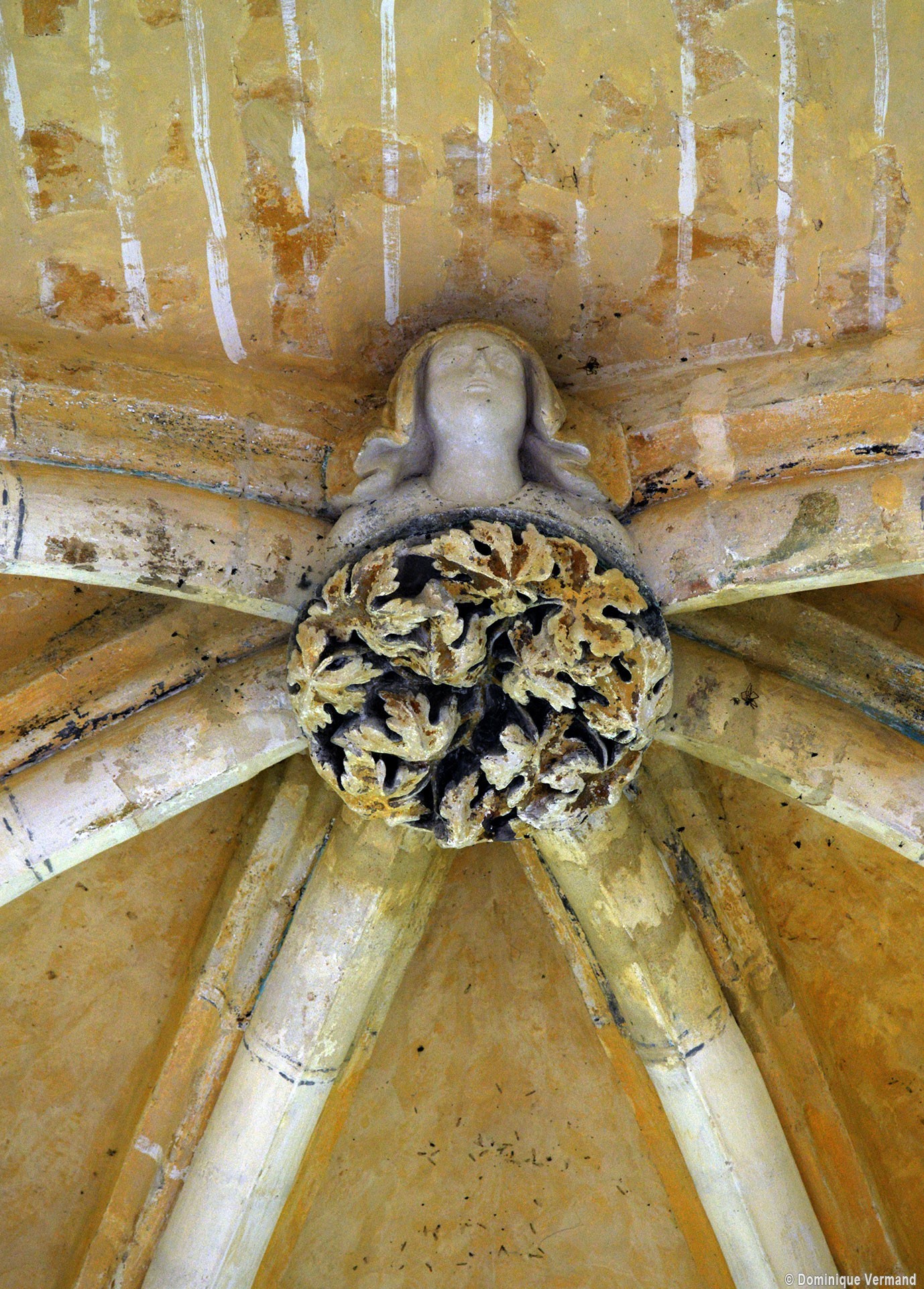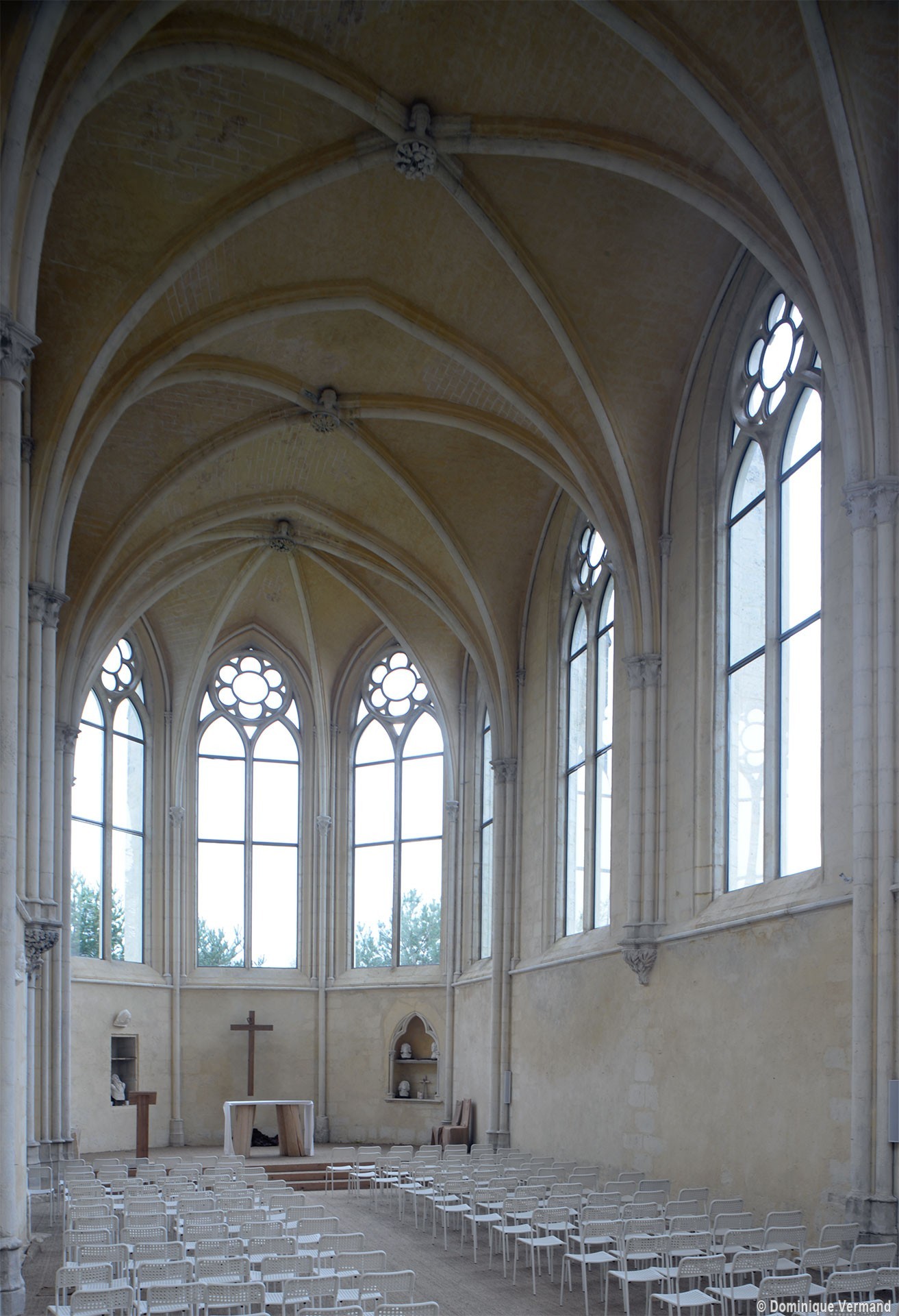 L’intérieur offre la belle unité spatiale propre aux chapelles palatines ou abbatiales contemporaines. Les voûtes d’ogives sont reçues sur des chapiteaux à crochets, rigoureusement structurés par l’intermédiaire de tailloirs disposés en diagonale (à bec) pour ne pas interrompre visuellement la continuité des lignes de force de l’architecture. Juste avant la dernière travée, les retombées s’effectuent toutefois sur des culs-delampe – sans doute en relation avec une clôture de chœur disparue – dont la sculpture d’une exceptionnelle qualité se retrouve aux clefs de voûte, agrémentées de têtes féminines et masculines, parfois couronnées.