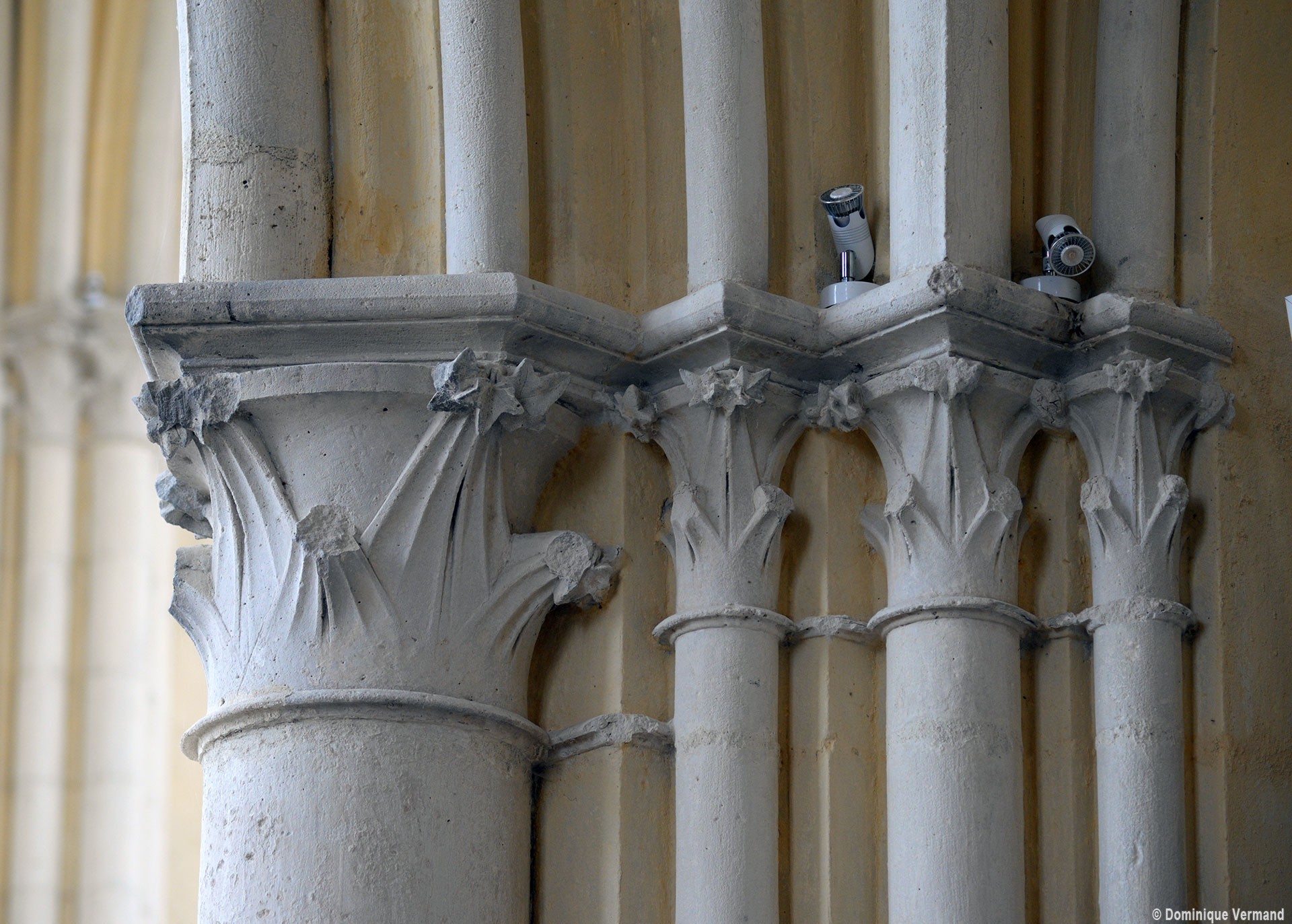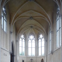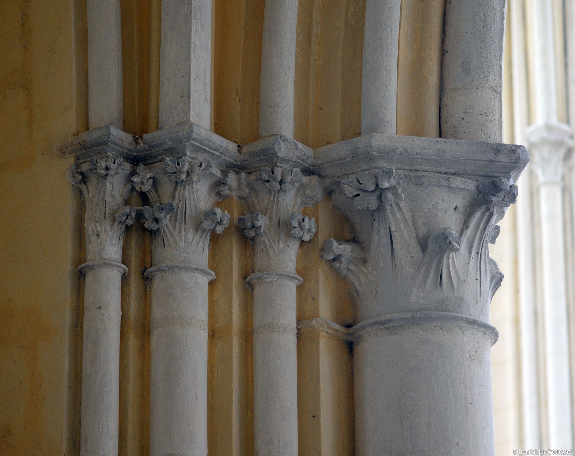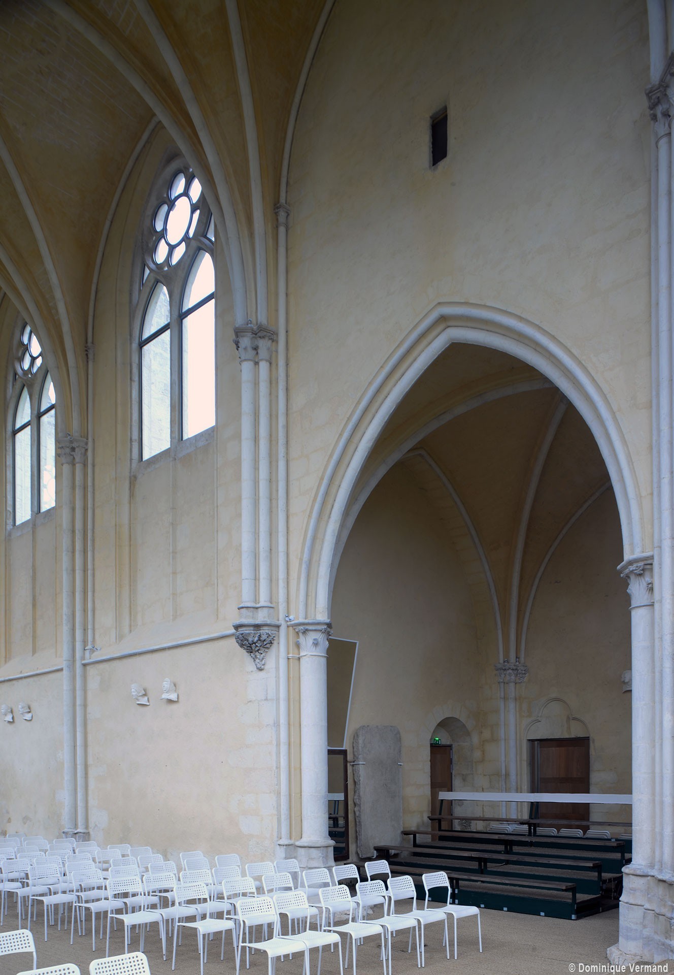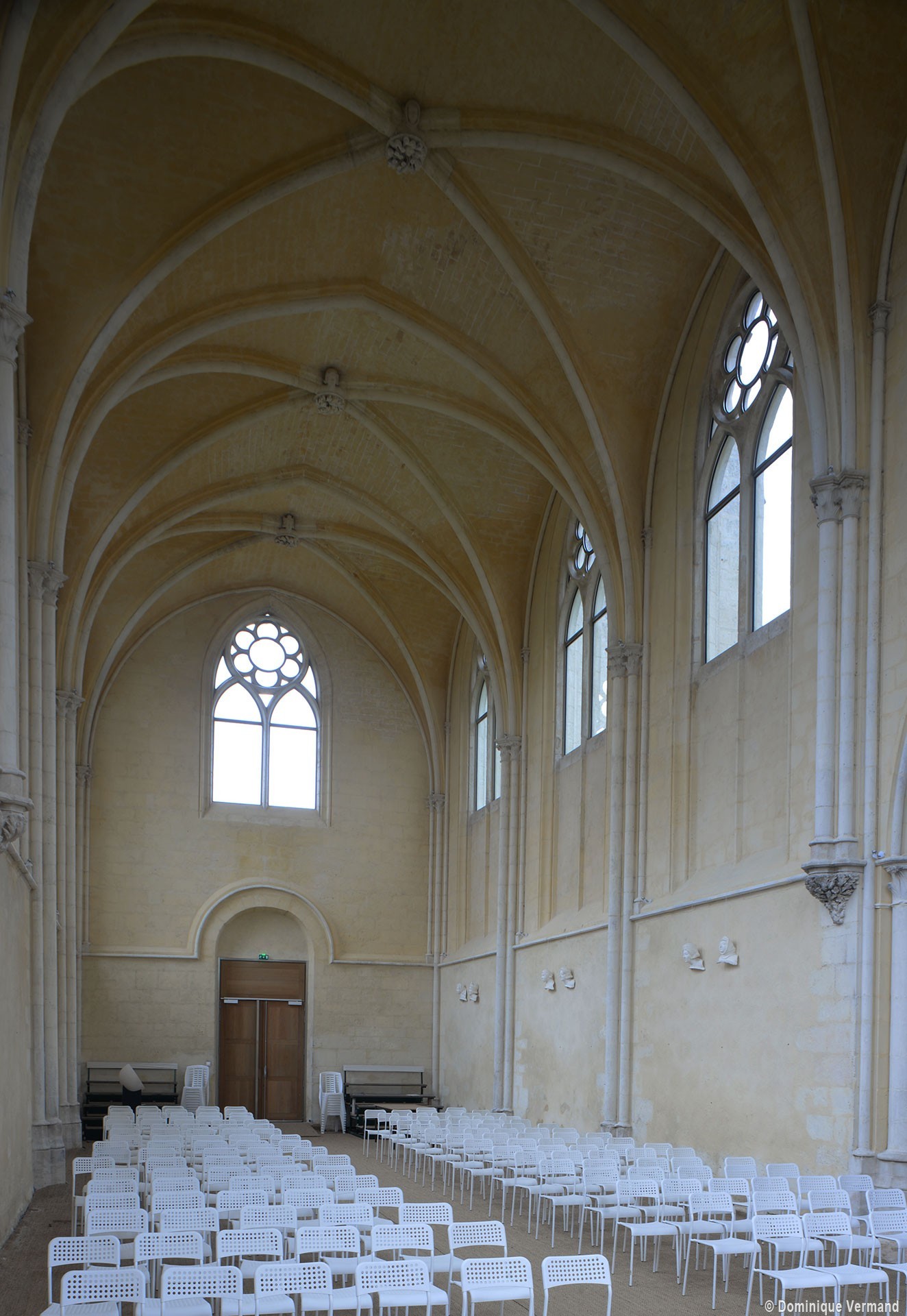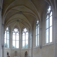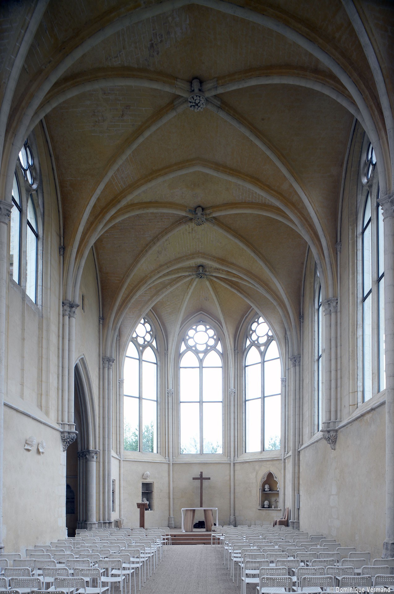 L’intérieur offre la belle unité spatiale propre aux chapelles palatines ou abbatiales contemporaines. Les voûtes d’ogives sont reçues sur des chapiteaux à crochets, rigoureusement structurés par l’intermédiaire de tailloirs disposés en diagonale (à bec) pour ne pas interrompre visuellement la continuité des lignes de force de l’architecture. Juste avant la dernière travée, les retombées s’effectuent toutefois sur des culs-delampe – sans doute en relation avec une clôture de chœur disparue – dont la sculpture d’une exceptionnelle qualité se retrouve aux clefs de voûte, agrémentées de têtes féminines et masculines, parfois couronnées.