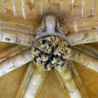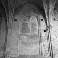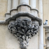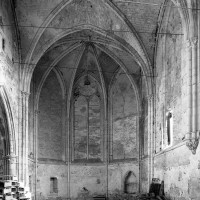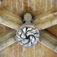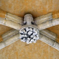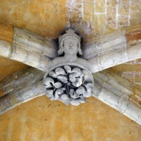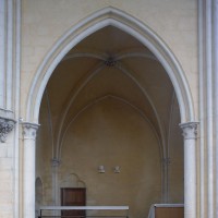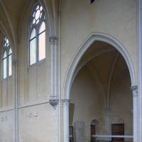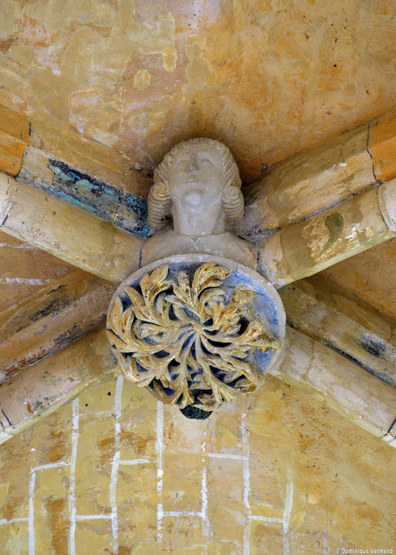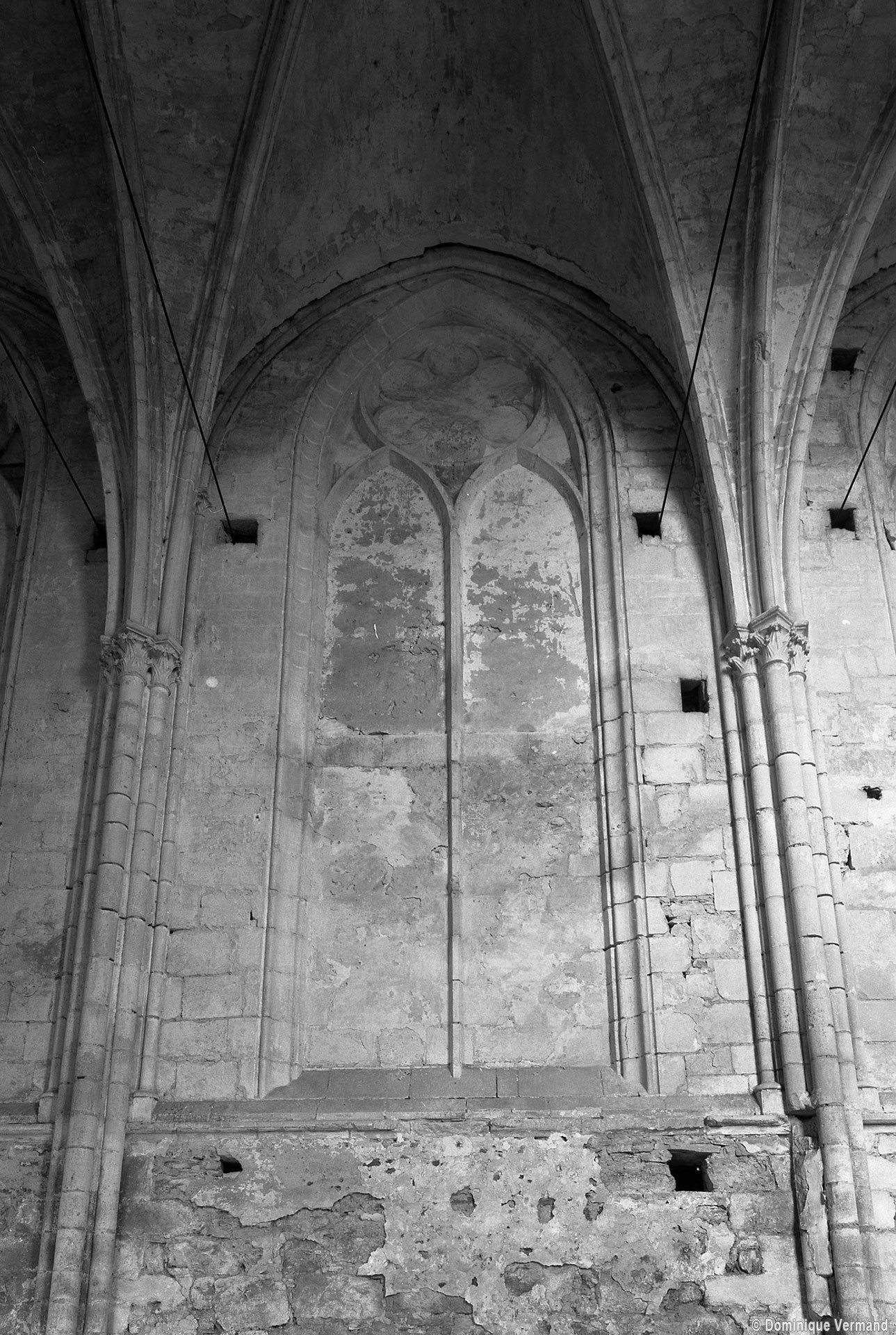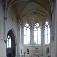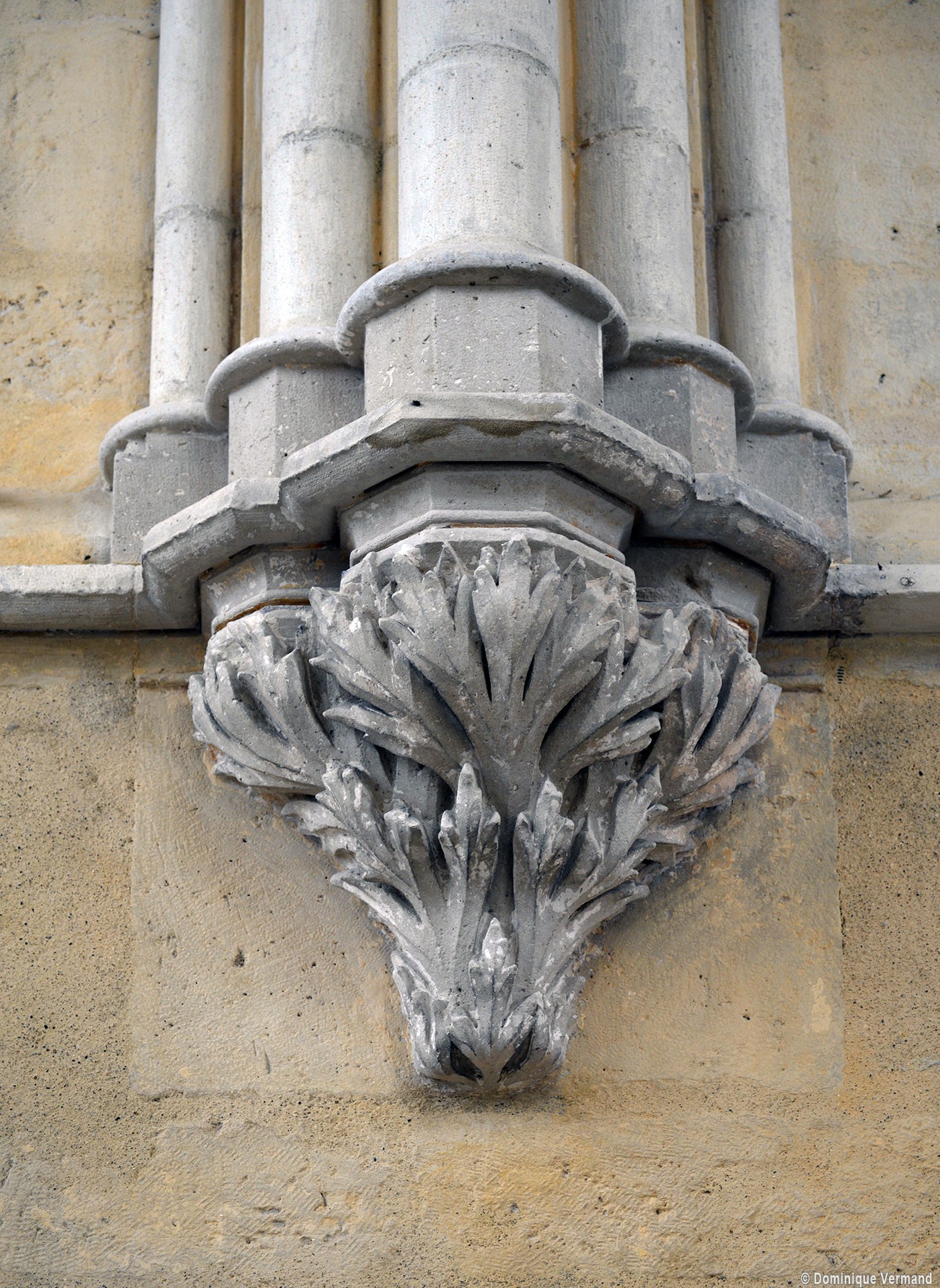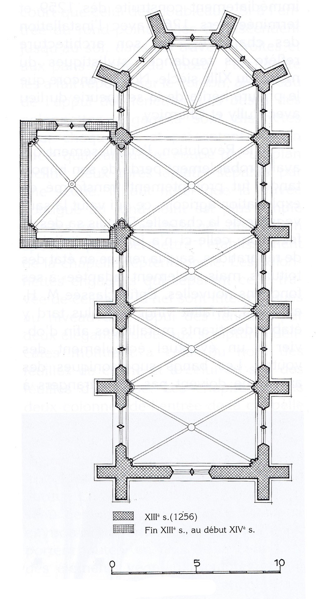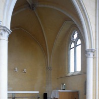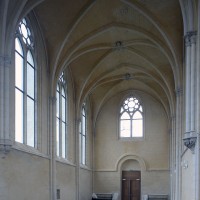 L’intérieur offre la belle unité spatiale propre aux chapelles palatines ou abbatiales contemporaines. Les voûtes d’ogives sont reçues sur des chapiteaux à crochets, rigoureusement structurés par l’intermédiaire de tailloirs disposés en diagonale (à bec) pour ne pas interrompre visuellement la continuité des lignes de force de l’architecture. Juste avant la dernière travée, les retombées s’effectuent toutefois sur des culs-delampe – sans doute en relation avec une clôture de chœur disparue – dont la sculpture d’une exceptionnelle qualité se retrouve aux clefs de voûte, agrémentées de têtes féminines et masculines, parfois couronnées.