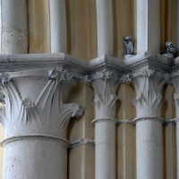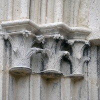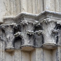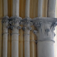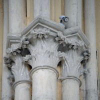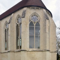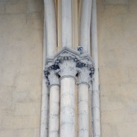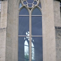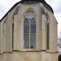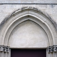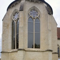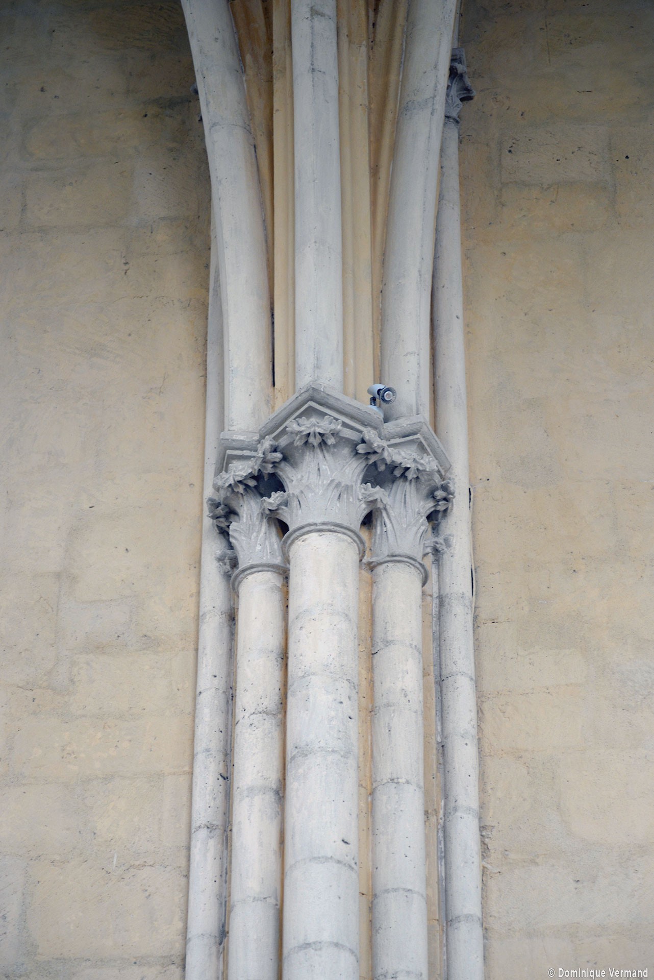 A l’extérieur, le vaisseau et l’abside ne sont rythmés que par l’alternance rigoureuse des contreforts et des fenêtres. Toutes identiques et composées simplement d’une double lancette surmontée d’une rose à six lobes, ces fenêtres ne comportent ni colonnettes ni chapiteaux selon une démarche tendant à l’austérité, caractéristique des constructions de l’ordre de Saint-Augustin. Seul le petit portail ouest, qui a malheureusement perdu ses triples colonnettes à diamètre décroissant, apporte une touche moins rigide.