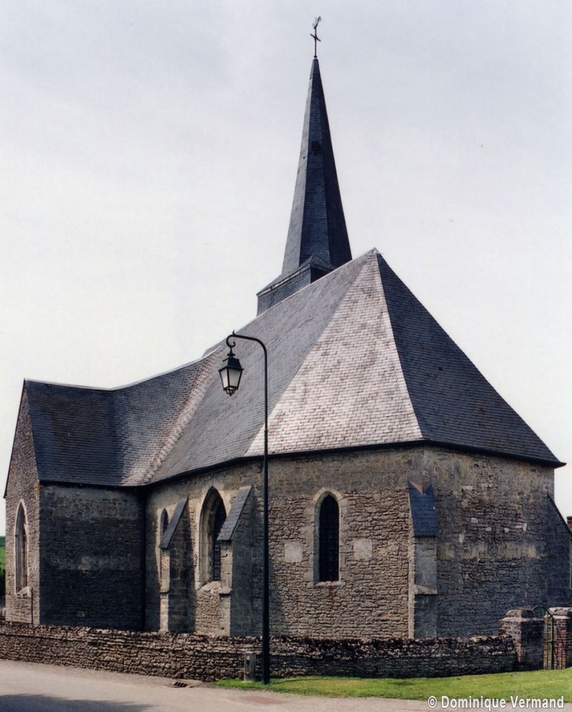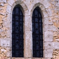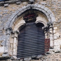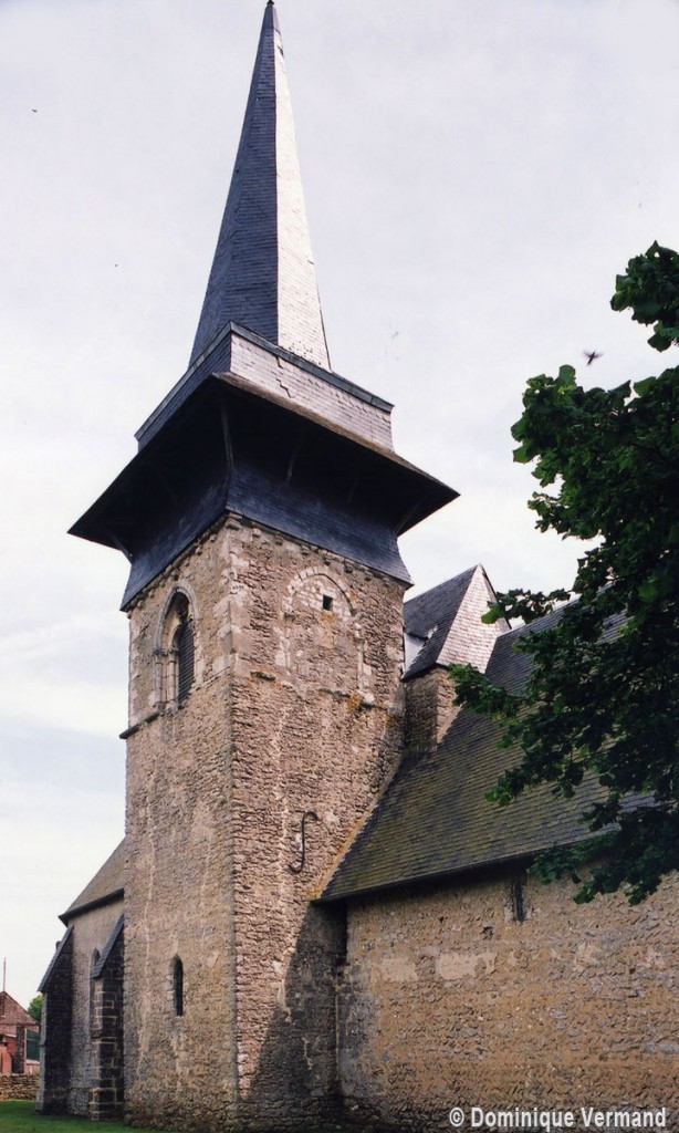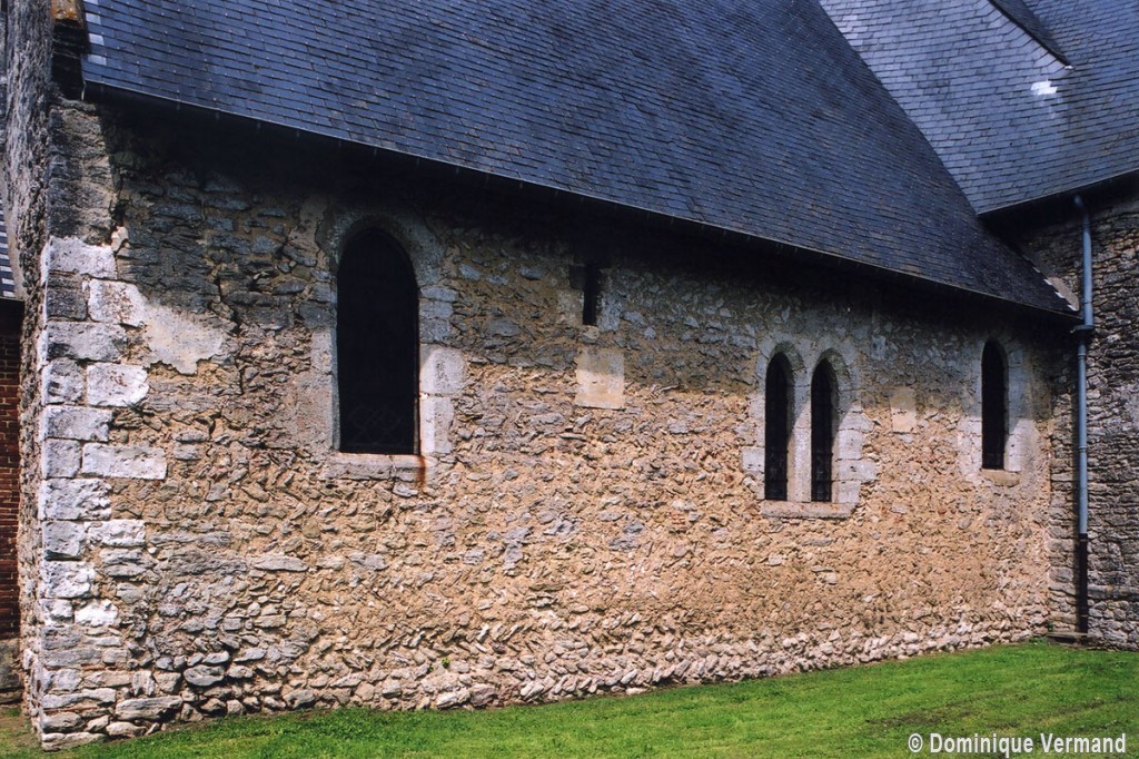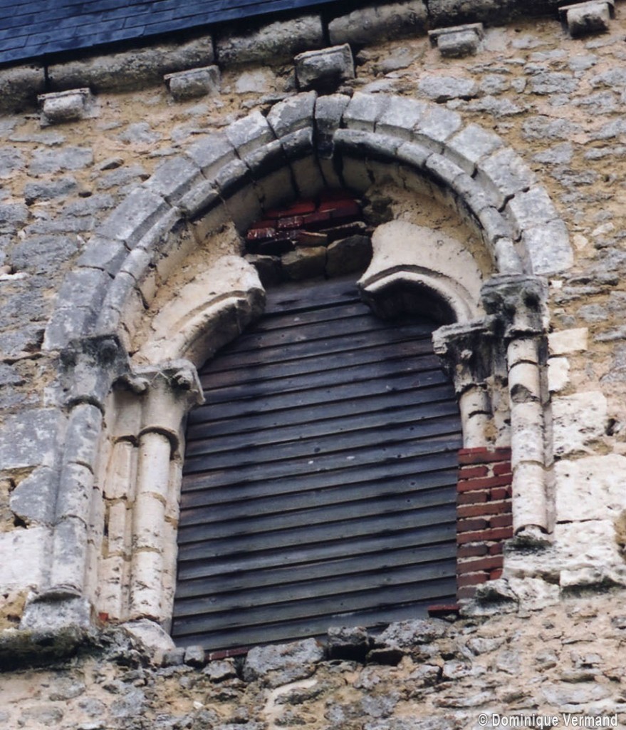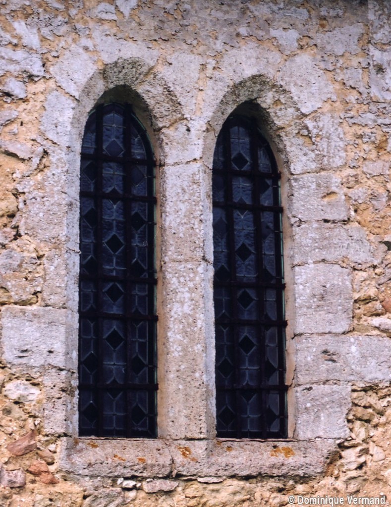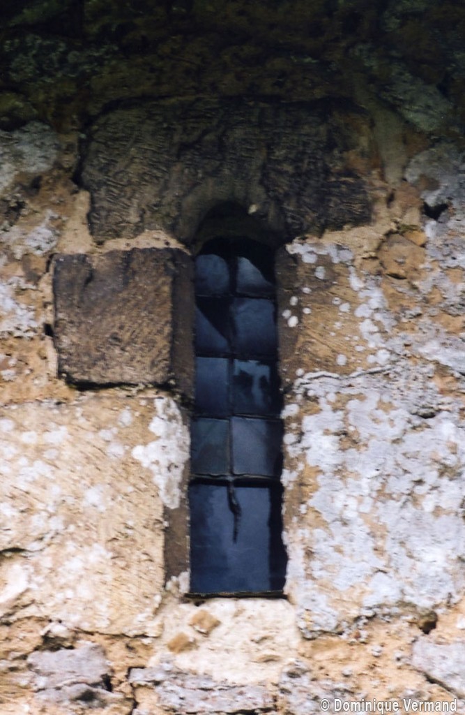 Le plan de l’édifice était complété par un choeur plus étroit -aujourd’hui disparu – sur le flanc nord duquel fut construit, au 13ème siècle, le clocher qui existe toujours. Au-dessus d’un haut soubassement nu, l’unique étage du beffroi était ajouré sur chaque face d’une baie géminée dont une seule, bien que dégradée, s’est conservée au nord. Une fenêtre à double lancette, percée dans le mur sud de la nef, doit également remonter à cette époque.