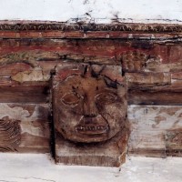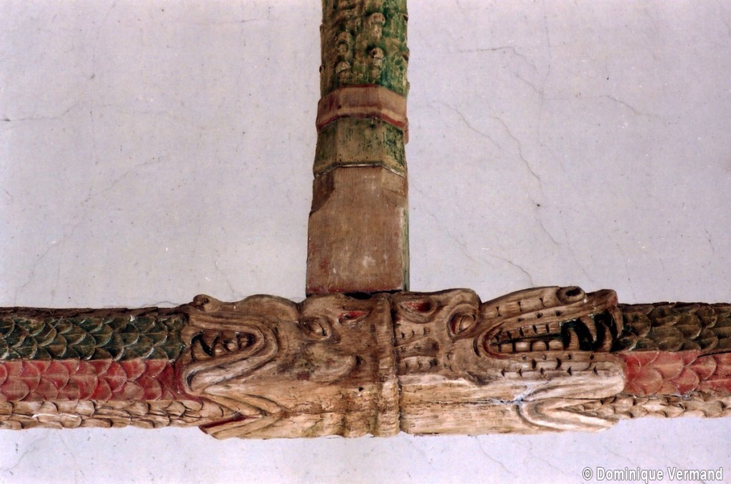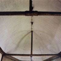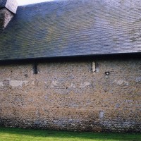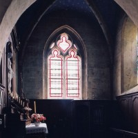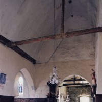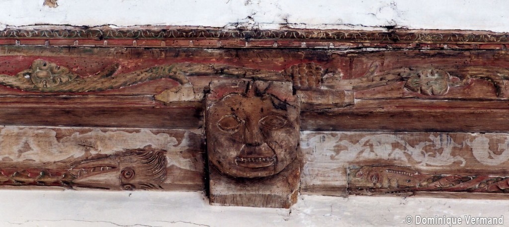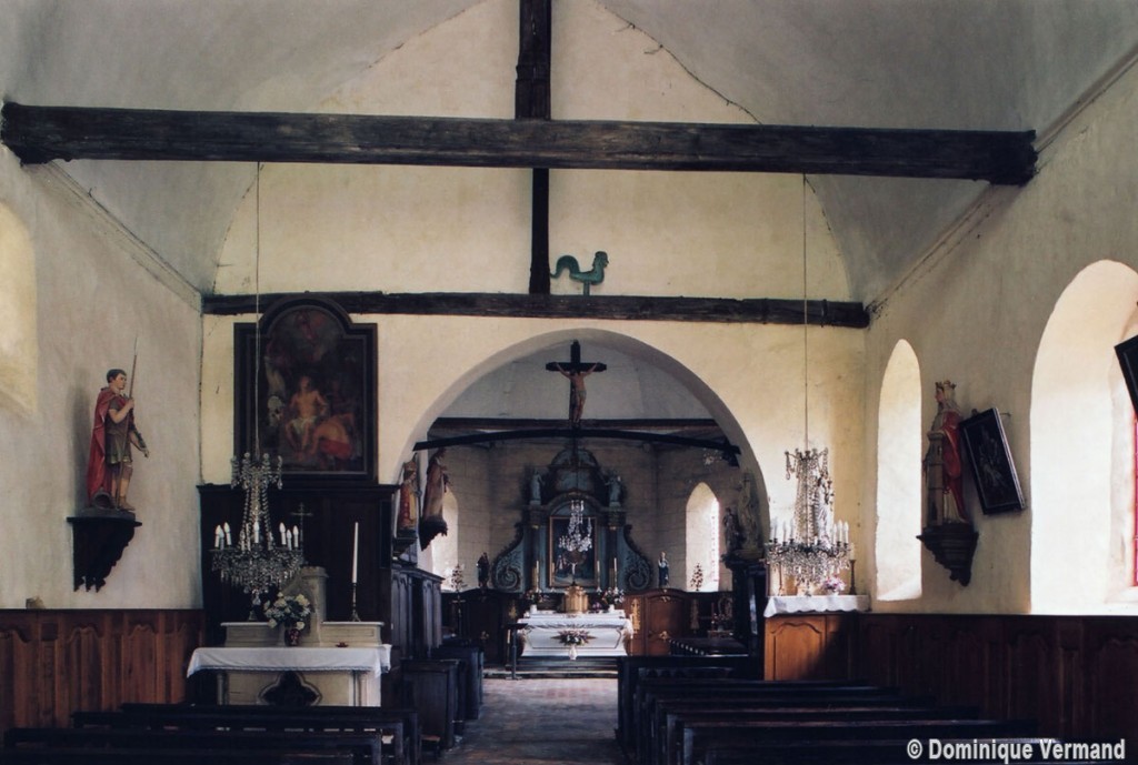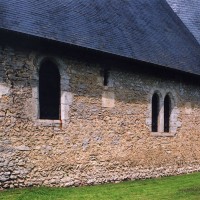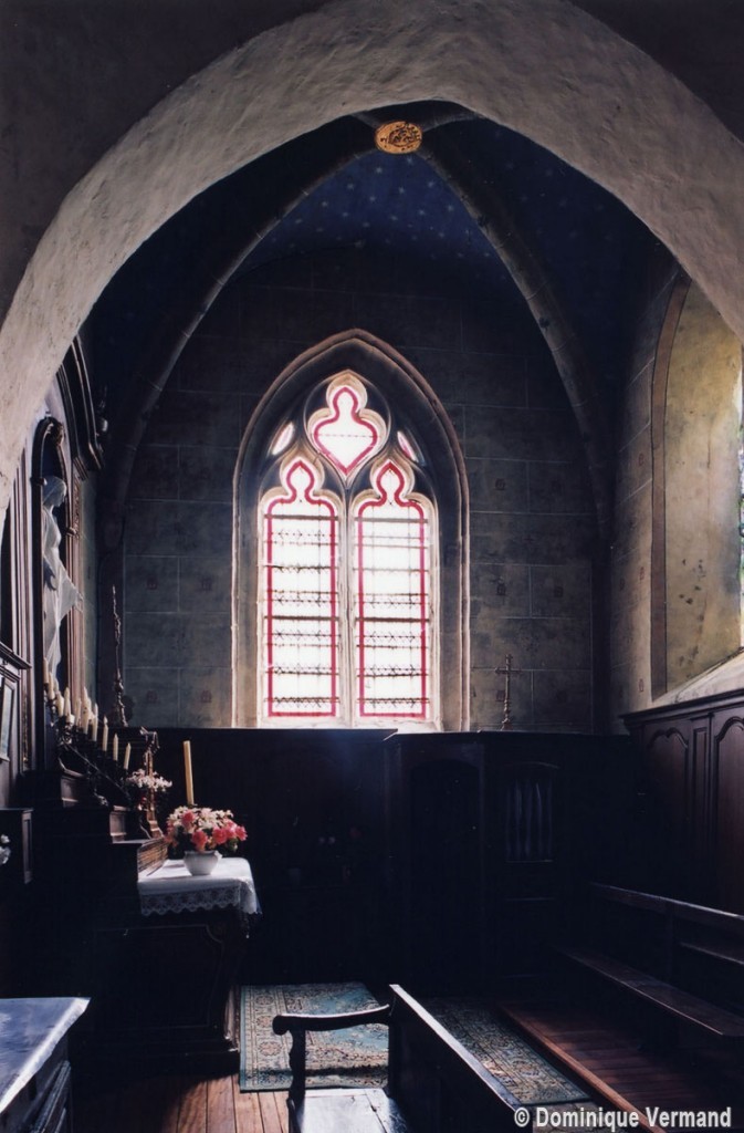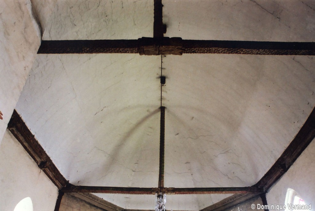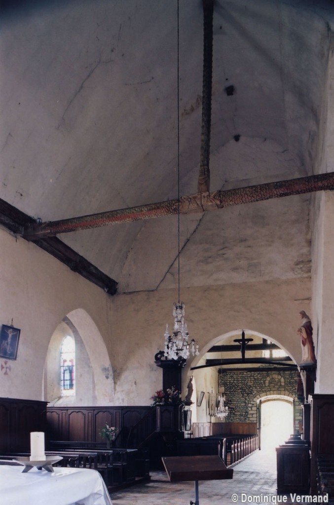 A une date difficile à préciser mais qui peut probablement se situer au 15ème siècle, seront construits le choeur et la chapelle sud. Les fenêtres en forme de simple lancette, le type des contreforts et la voûte de la chapelle – unique voûte en pierre de l’église – ne s’opposent pas, en effet, à une telle datation. Enfin, c’est au 16ème siècle qu’il reviendra, outre le percement de plusieurs grandes fenêtres à la chapelle et au choeur, de doter celui-ci d’une nouvelle charpente. Du type à carène renversée et portée très haut, elle est remarquable par la finesse de ses deux entraits avec poinçons et par la richesse de leur décor : des engoulants en forme de monstres avalent les poutres entièrement sculptées d’écailles. Cette richesse du décor se retrouve sur les sablières et les blochets en forme de masques.