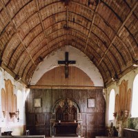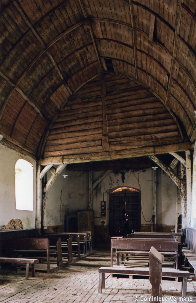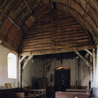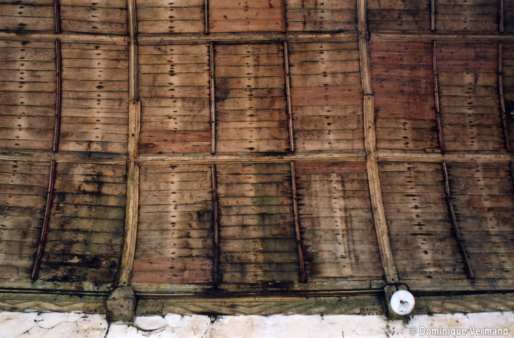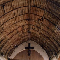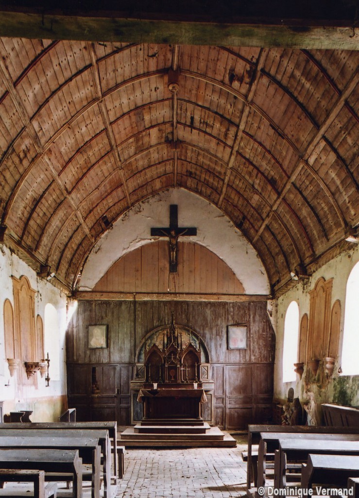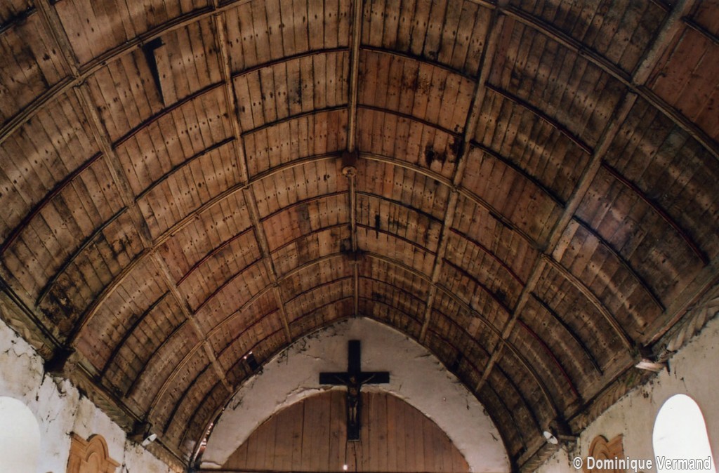 La modestie de l’architecture est compensée par la belle charpente en carène du 16ème siècle, vierge de toutes restaurations. Ses dimensions réduites n’ont pas nécessité le montage d’entraits avec poinçons. Des clefs sculptées ornent la ligne de faîte et l’ensemble est reçu sur des sablières ornées d’une torsade. Les blochets, qui étaient décorés vraisemblablement de masques ou de têtes humaines, ont été malheureusement sectionnés (2007).