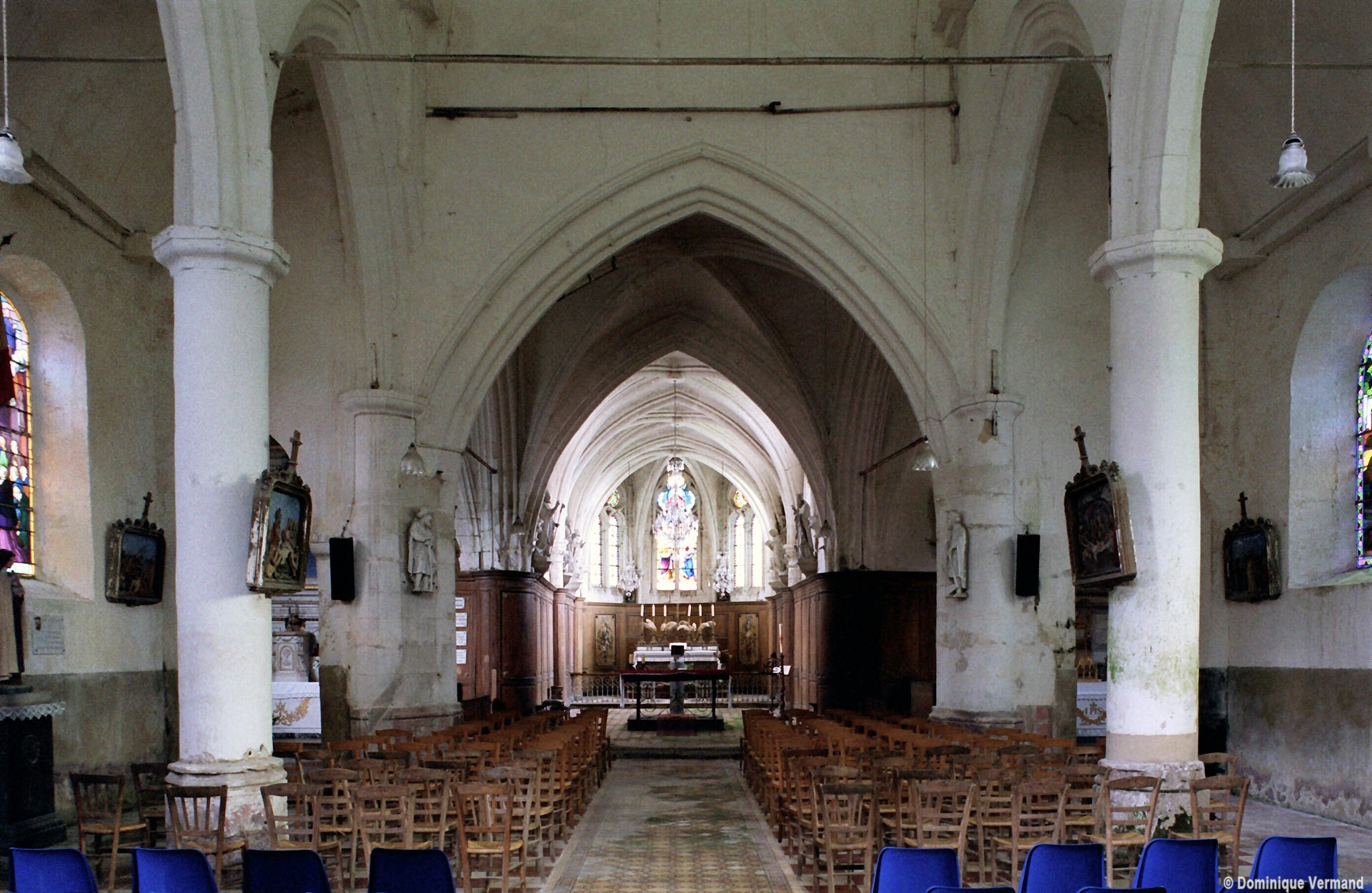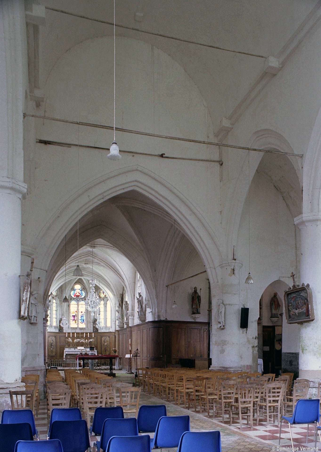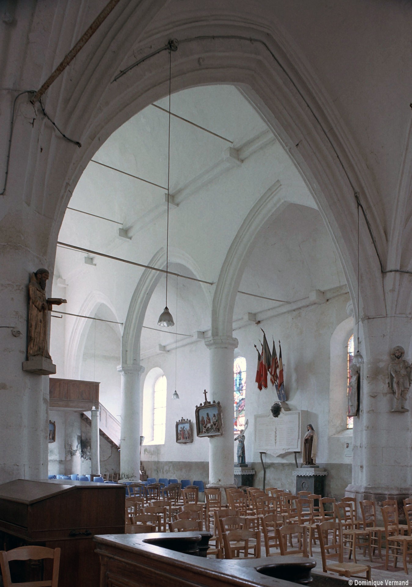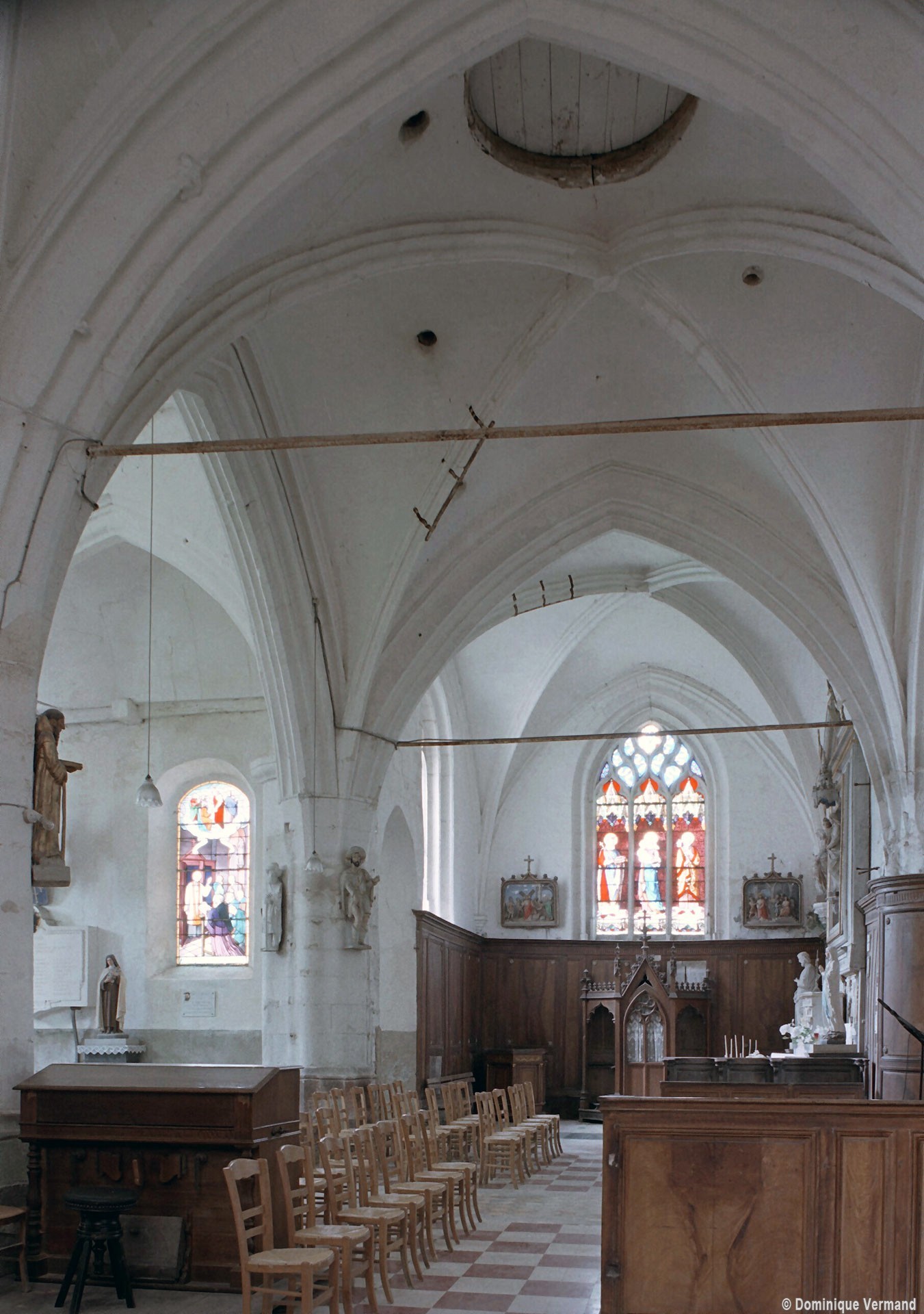 A l’intérieur, le même souci de simplification a prévalu. Les voûtes d’ogives – deux pour la partie droite et une, à six compartiments, pour l’abside – sont dépourvues d’arcs formerets (arc qui reçoit la voûte du côté du mur). Les retombées des ogives et des doubleaux se concentrent sur un unique chapiteau reposant sur une colonnette presque détachée du mur. La sculpture des chapiteaux, très soignée, représente uniformément des crochets qui se terminent en boules de feuillages, un thème presque systématique à l’époque. Parfait exemple du style gothique rayonnant, le choeur de Saint-Pierre de Sarcus fait écho, toutes proportions gardées, à l’abside de Saint-Martin-aux-Bois, avec laquelle les rapports ne relèvent certainement pas du hasard : fenêtres à trilobe non inscrit, profil semblable des ogives, concentration des retombées de la voûte sur un seul chapiteau, agencement similaire des contreforts, même simplification des volumes extérieurs.
