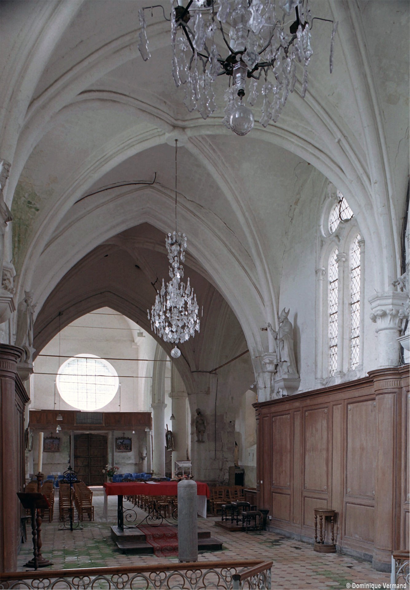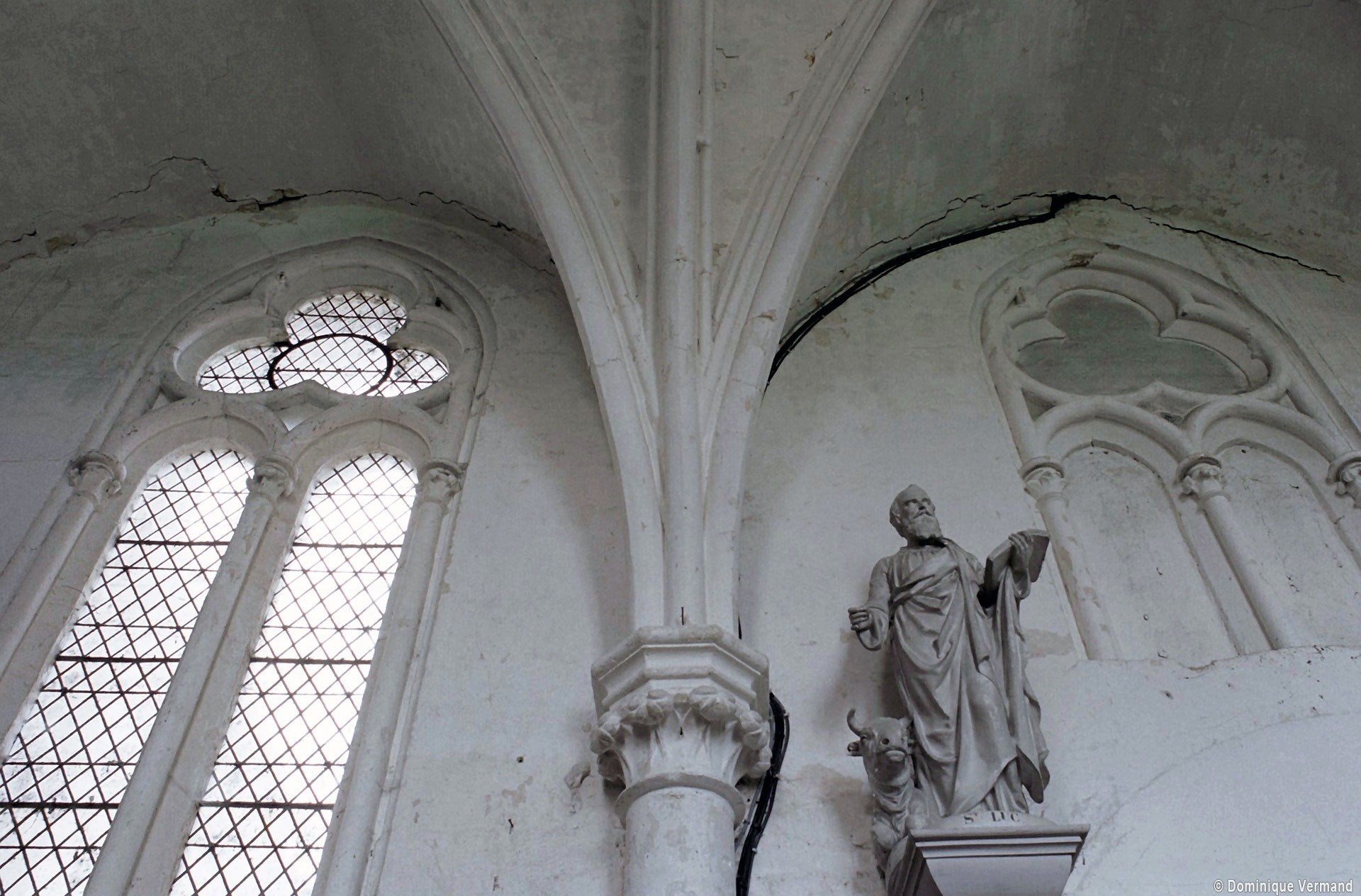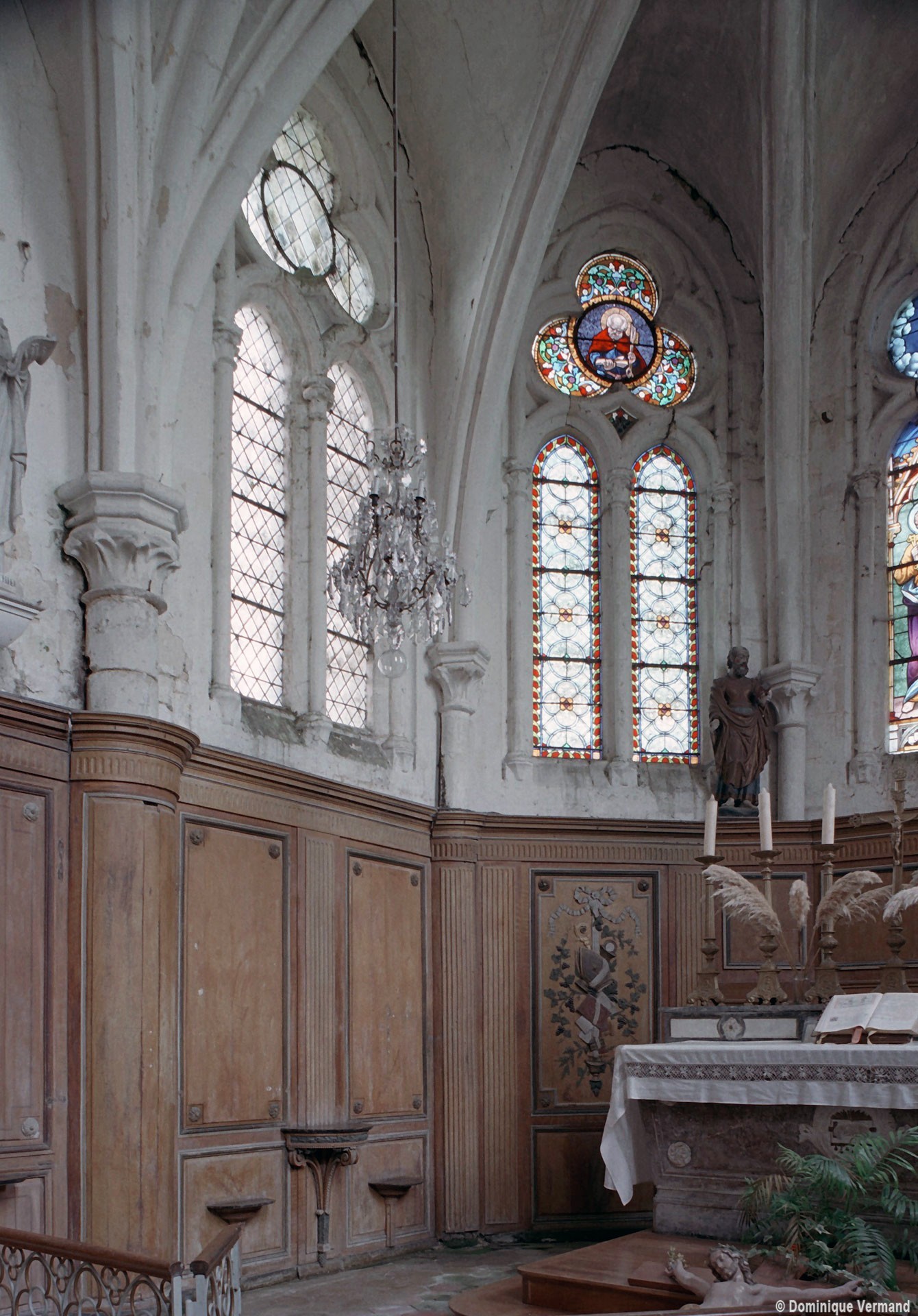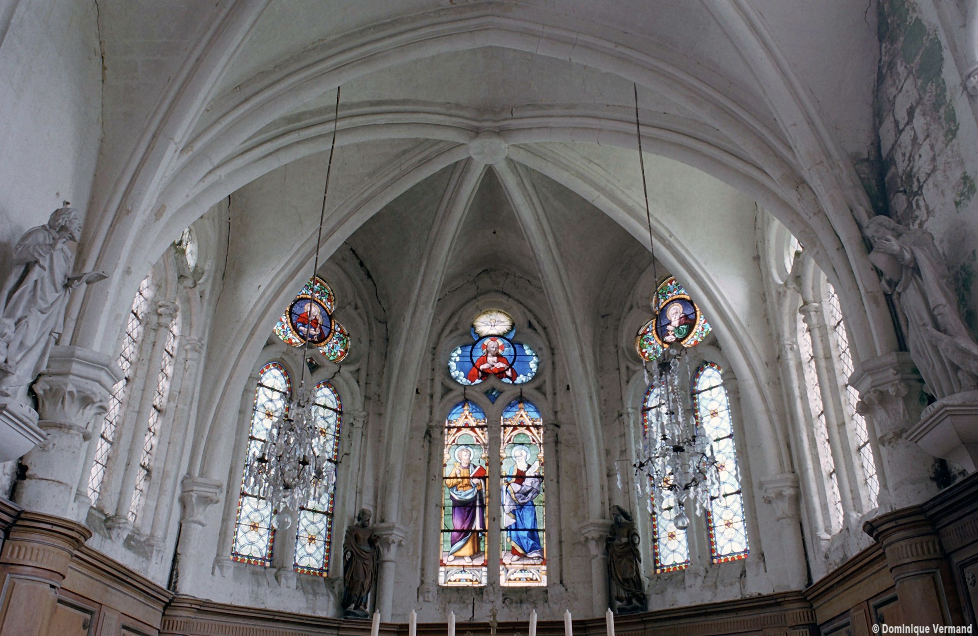 A l’intérieur, le même souci de simplification a prévalu. Les voûtes d’ogives – deux pour la partie droite et une, à six compartiments, pour l’abside – sont dépourvues d’arcs formerets (arc qui reçoit la voûte du côté du mur). Les retombées des ogives et des doubleaux se concentrent sur un unique chapiteau reposant sur une colonnette presque détachée du mur. La sculpture des chapiteaux, très soignée, représente uniformément des crochets qui se terminent en boules de feuillages, un thème presque systématique à l’époque. Parfait exemple du style gothique rayonnant, le choeur de Saint-Pierre de Sarcus fait écho, toutes proportions gardées, à l’abside de Saint-Martin-aux-Bois, avec laquelle les rapports ne relèvent certainement pas du hasard : fenêtres à trilobe non inscrit, profil semblable des ogives, concentration des retombées de la voûte sur un seul chapiteau, agencement similaire des contreforts, même simplification des volumes extérieurs.