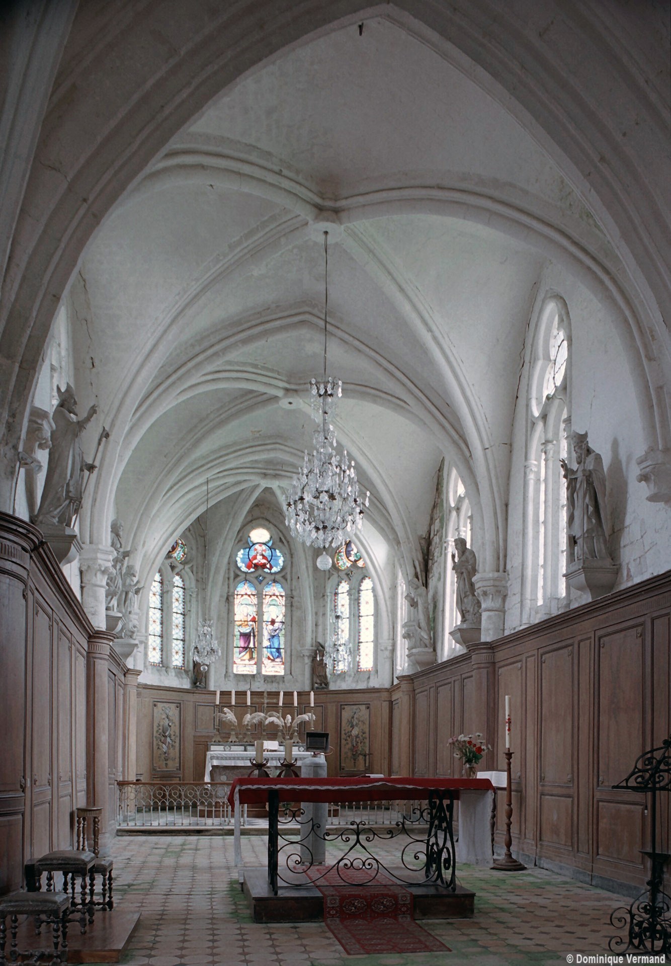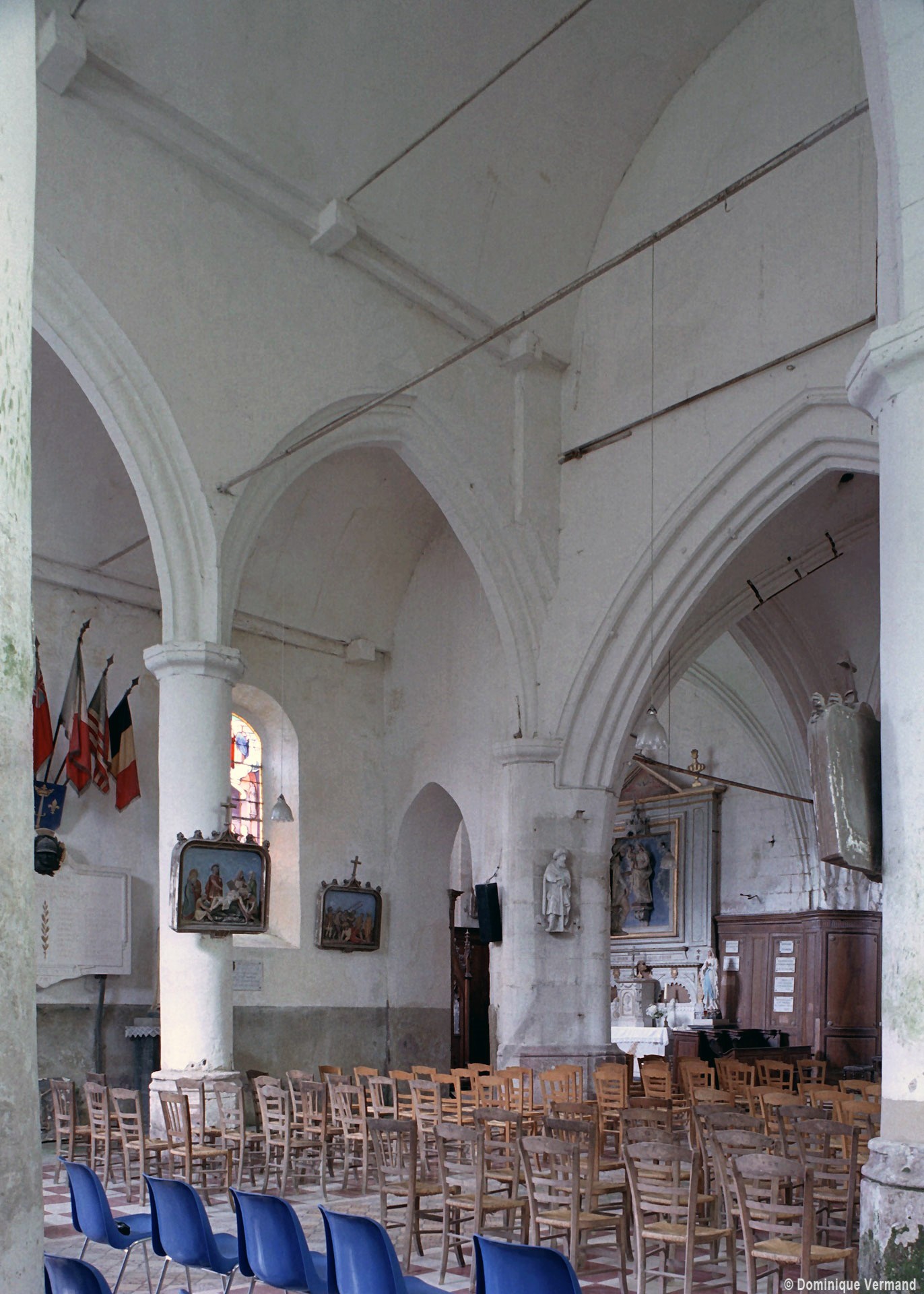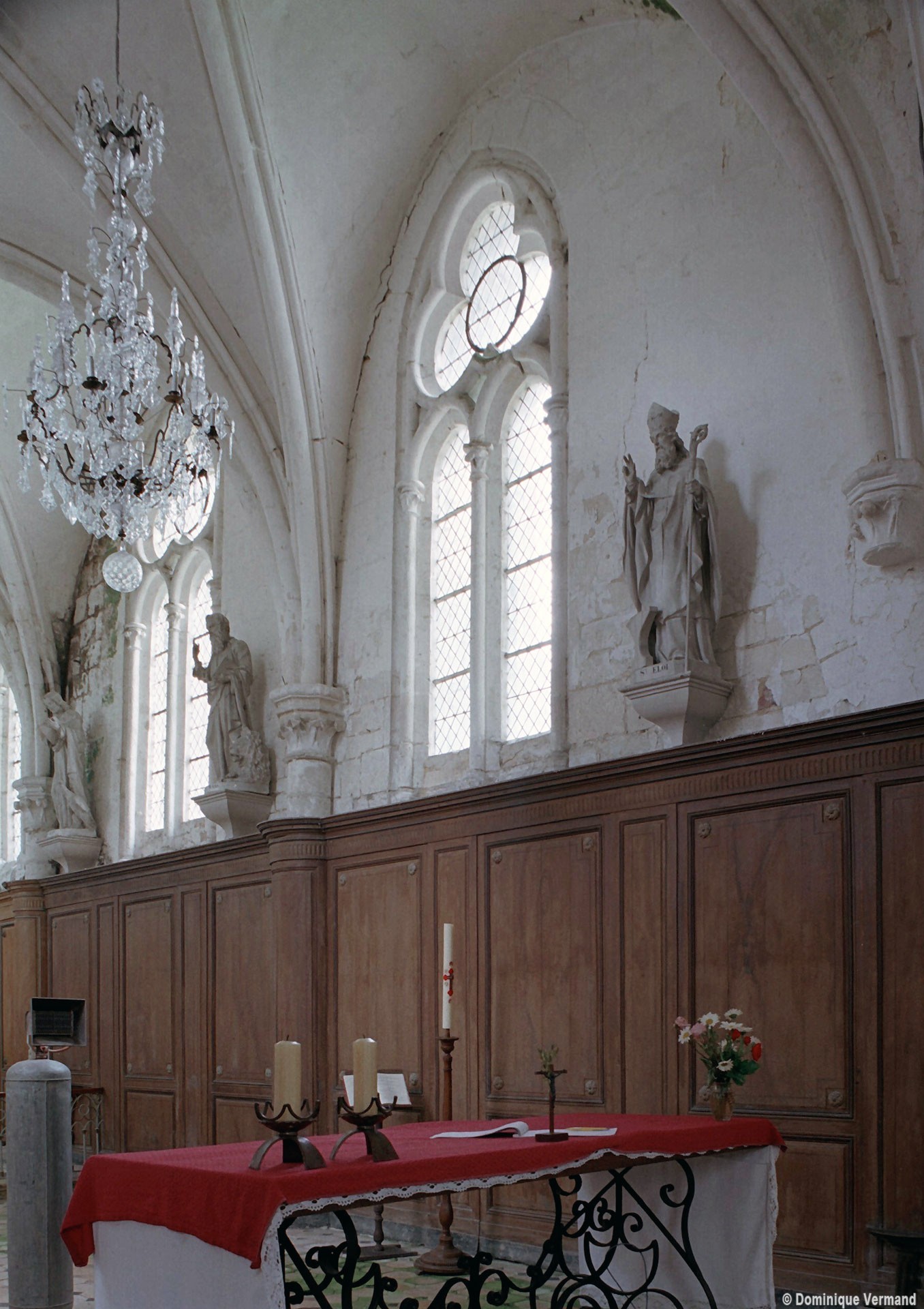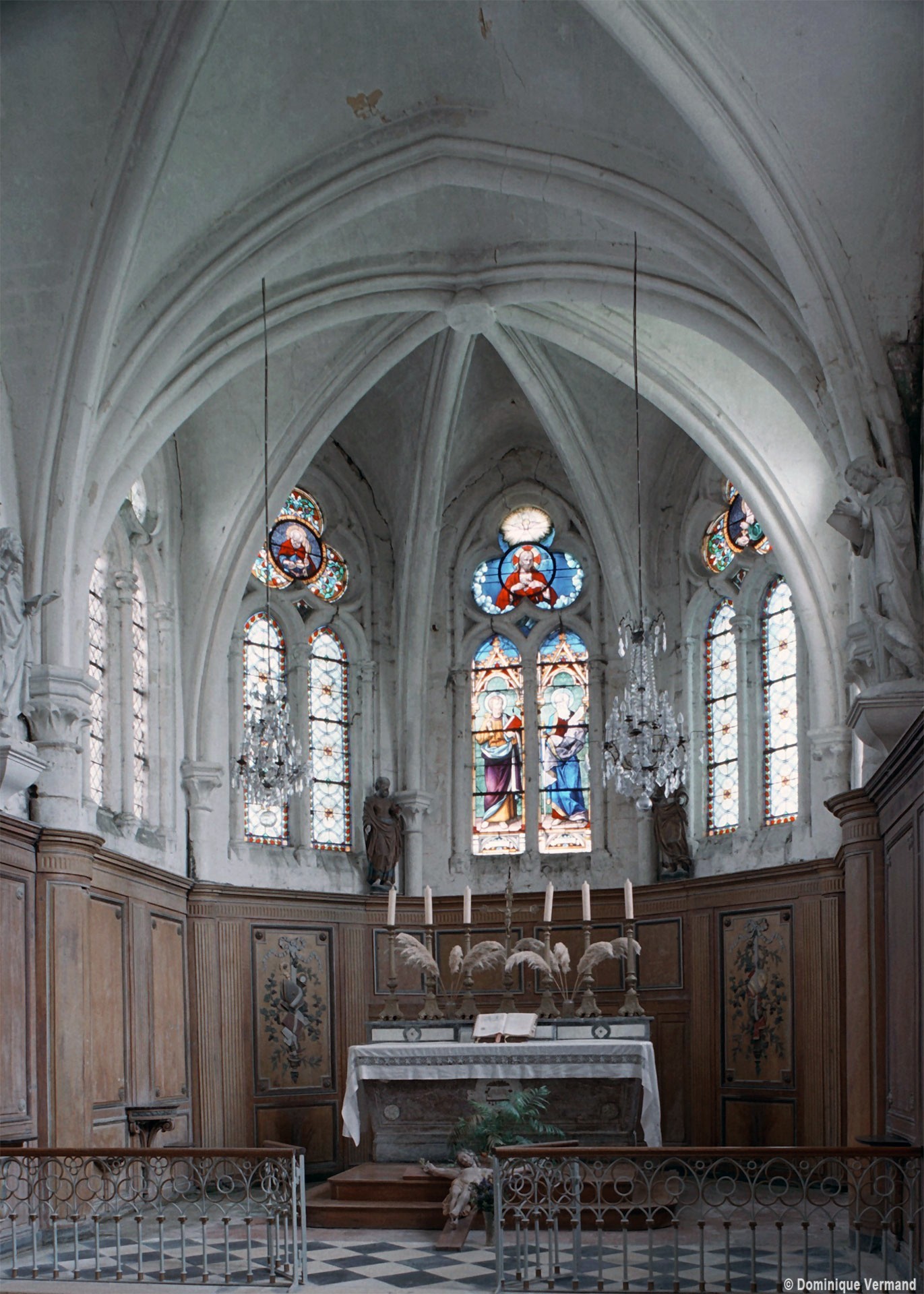 A l’intérieur, le même souci de simplification a prévalu. Les voûtes d’ogives – deux pour la partie droite et une, à six compartiments, pour l’abside – sont dépourvues d’arcs formerets (arc qui reçoit la voûte du côté du mur). Les retombées des ogives et des doubleaux se concentrent sur un unique chapiteau reposant sur une colonnette presque détachée du mur. La sculpture des chapiteaux, très soignée, représente uniformément des crochets qui se terminent en boules de feuillages, un thème presque systématique à l’époque. Parfait exemple du style gothique rayonnant, le choeur de Saint-Pierre de Sarcus fait écho, toutes proportions gardées, à l’abside de Saint-Martin-aux-Bois, avec laquelle les rapports ne relèvent certainement pas du hasard : fenêtres à trilobe non inscrit, profil semblable des ogives, concentration des retombées de la voûte sur un seul chapiteau, agencement similaire des contreforts, même simplification des volumes extérieurs.