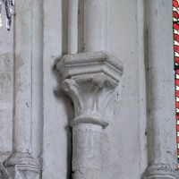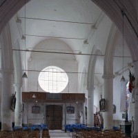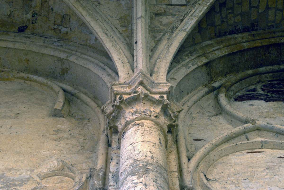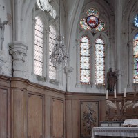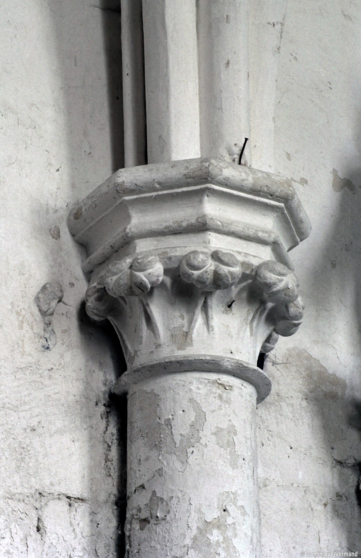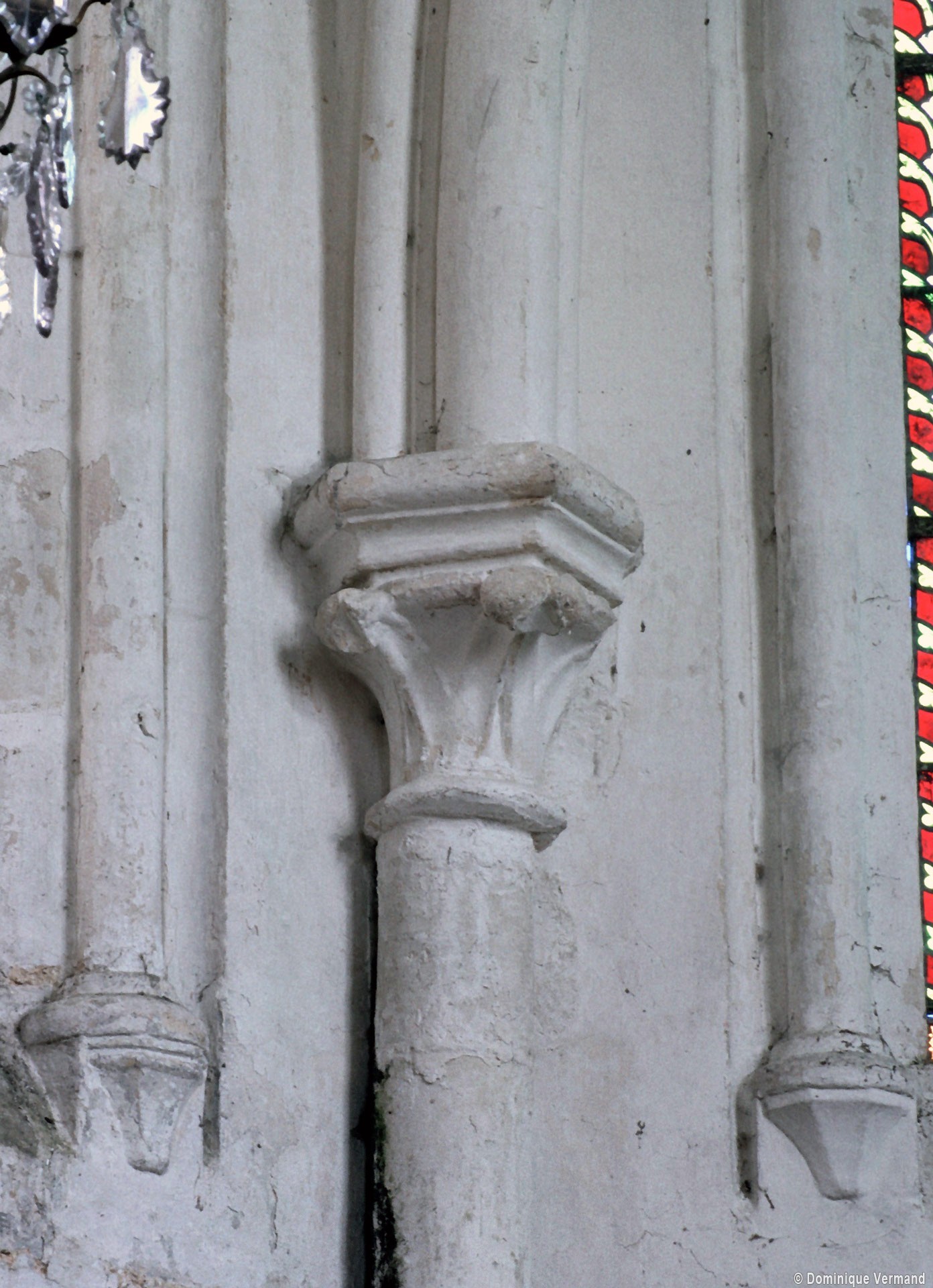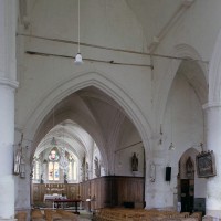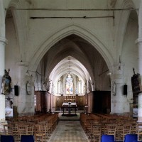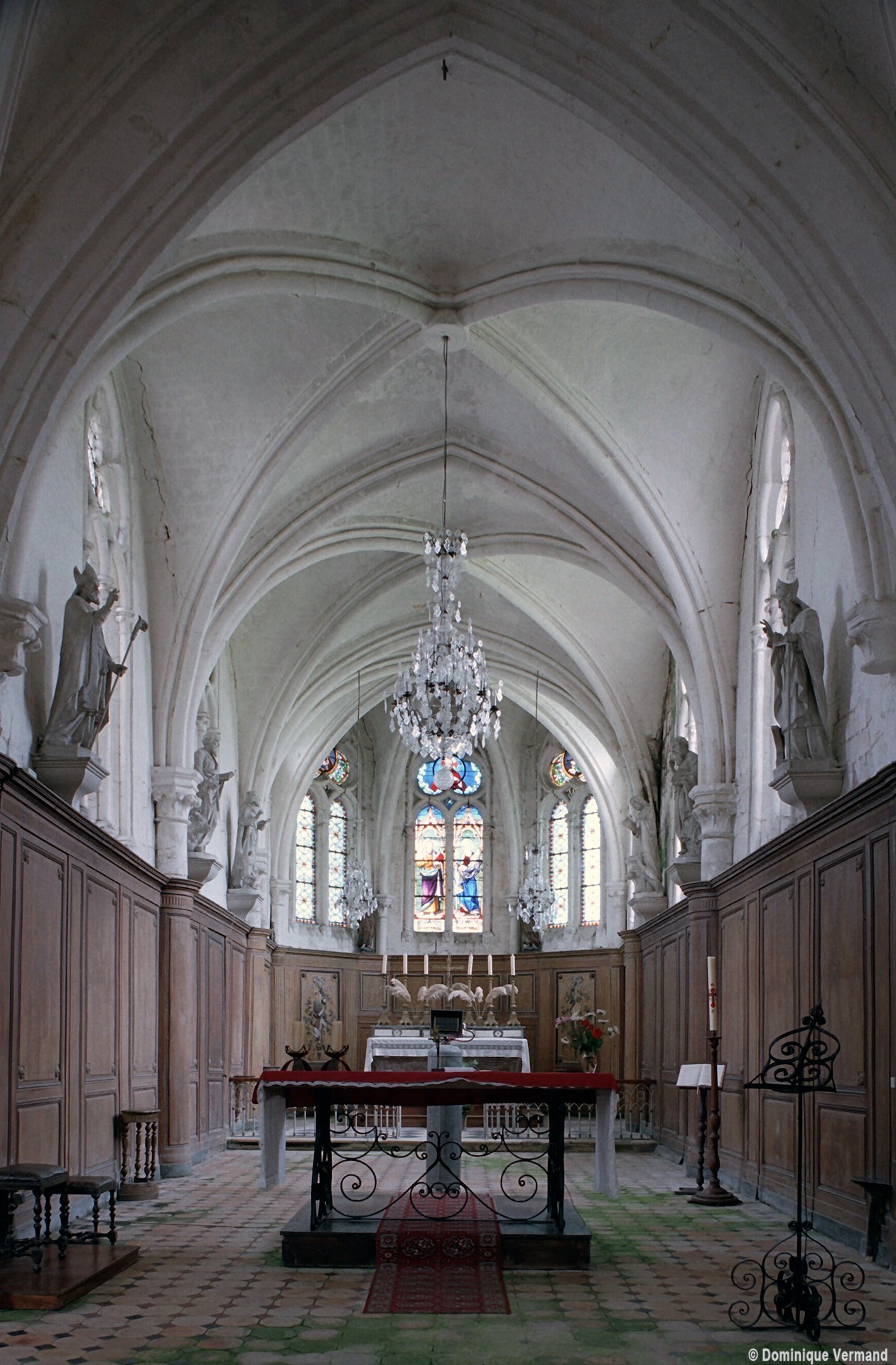A l’intérieur, le même souci de simplification a prévalu. Les voûtes d’ogives – deux pour la partie droite et une, à six compartiments, pour l’abside – sont dépourvues d’arcs formerets (arc qui reçoit la voûte du côté du mur). Les retombées des ogives et des doubleaux se concentrent sur un unique chapiteau reposant sur une colonnette presque détachée du mur. La sculpture des chapiteaux, très soignée, représente uniformément des crochets qui se terminent en boules de feuillages, un thème presque systématique à l’époque. Parfait exemple du style gothique rayonnant, le choeur de Saint-Pierre de Sarcus fait écho, toutes proportions gardées, à l’abside de Saint-Martin-aux-Bois, avec laquelle les rapports ne relèvent certainement pas du hasard : fenêtres à trilobe non inscrit, profil semblable des ogives, concentration des retombées de la voûte sur un seul chapiteau, agencement similaire des contreforts, même simplification des volumes extérieurs.
