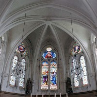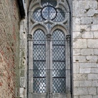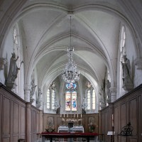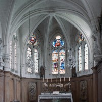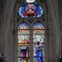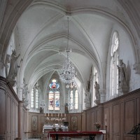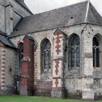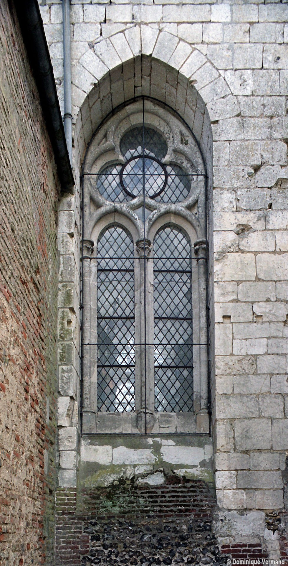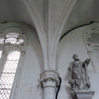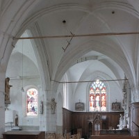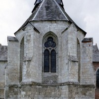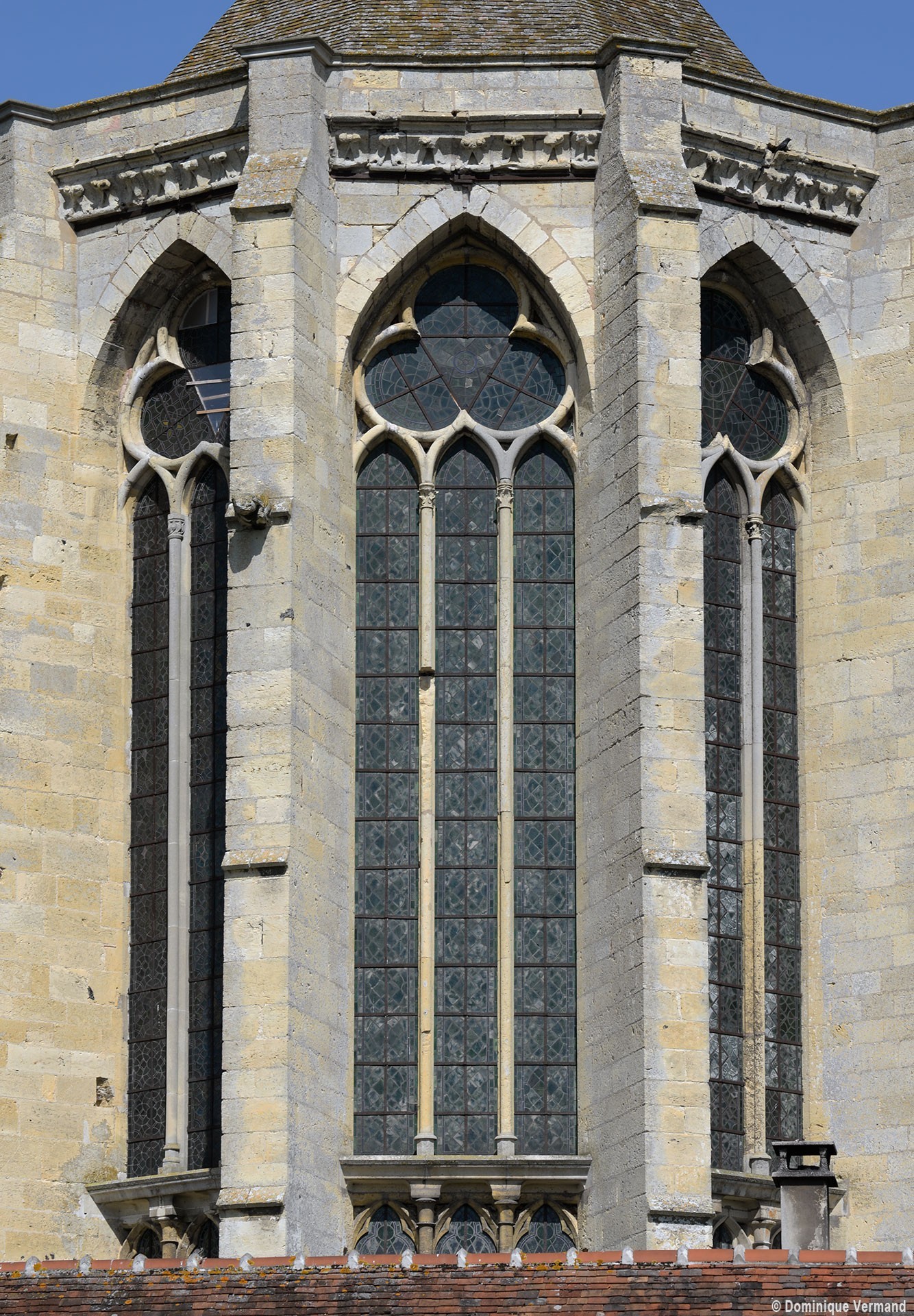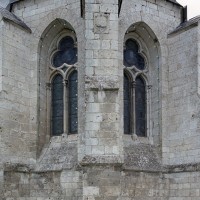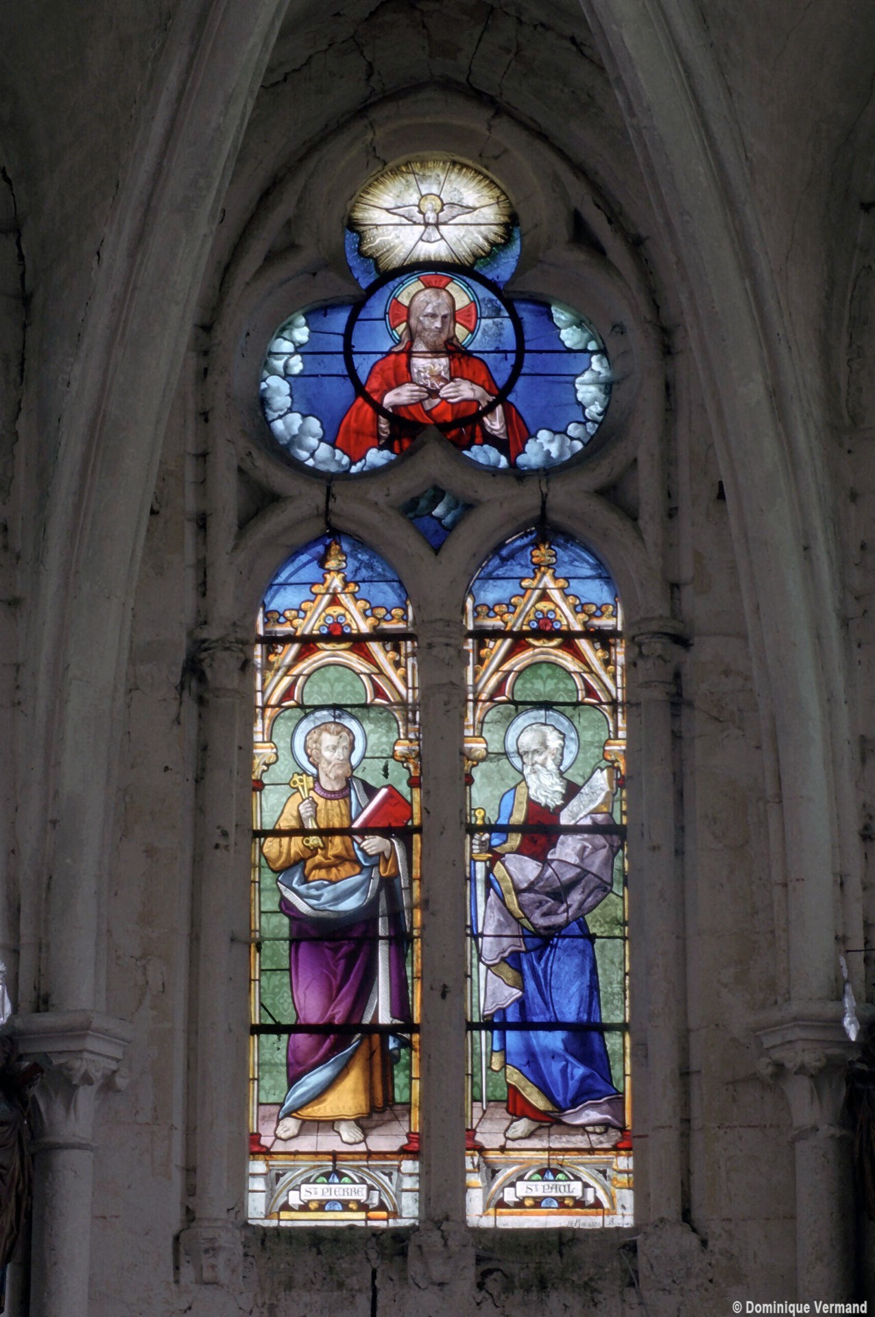 De dimensions respectables, Saint-Pierre comprend une nef avec bas-côtés et un transept saillant, bâtis en deux campagnes au 16ème siècle, et un choeur allongé terminé par une abside à cinq pans qui remonte au second quart du 13ème siècle. Une haute flèche octogonale en charpente et ardoises s’élève à la croisée. Le choeur, construit en pierres calcaires soigneusement appareillées, est la partie la plus remarquable. A l’extérieur, des contreforts larges et profonds qui se terminent en bâtière épaulent les murs à intervalles réguliers. Le soubassement est souligné par un larmier continu qui sert d’appui aux fenêtres. Le remplage de celles-ci, partout identique, est constitué de deux lancettes surmontées d’un trilobe. Leur positionnement à l’aplomb de la face interne du mur a pour effet d’en révéler toute l’épaisseur et renforce le caractère à la fois sobre et puissant de cette architecture.