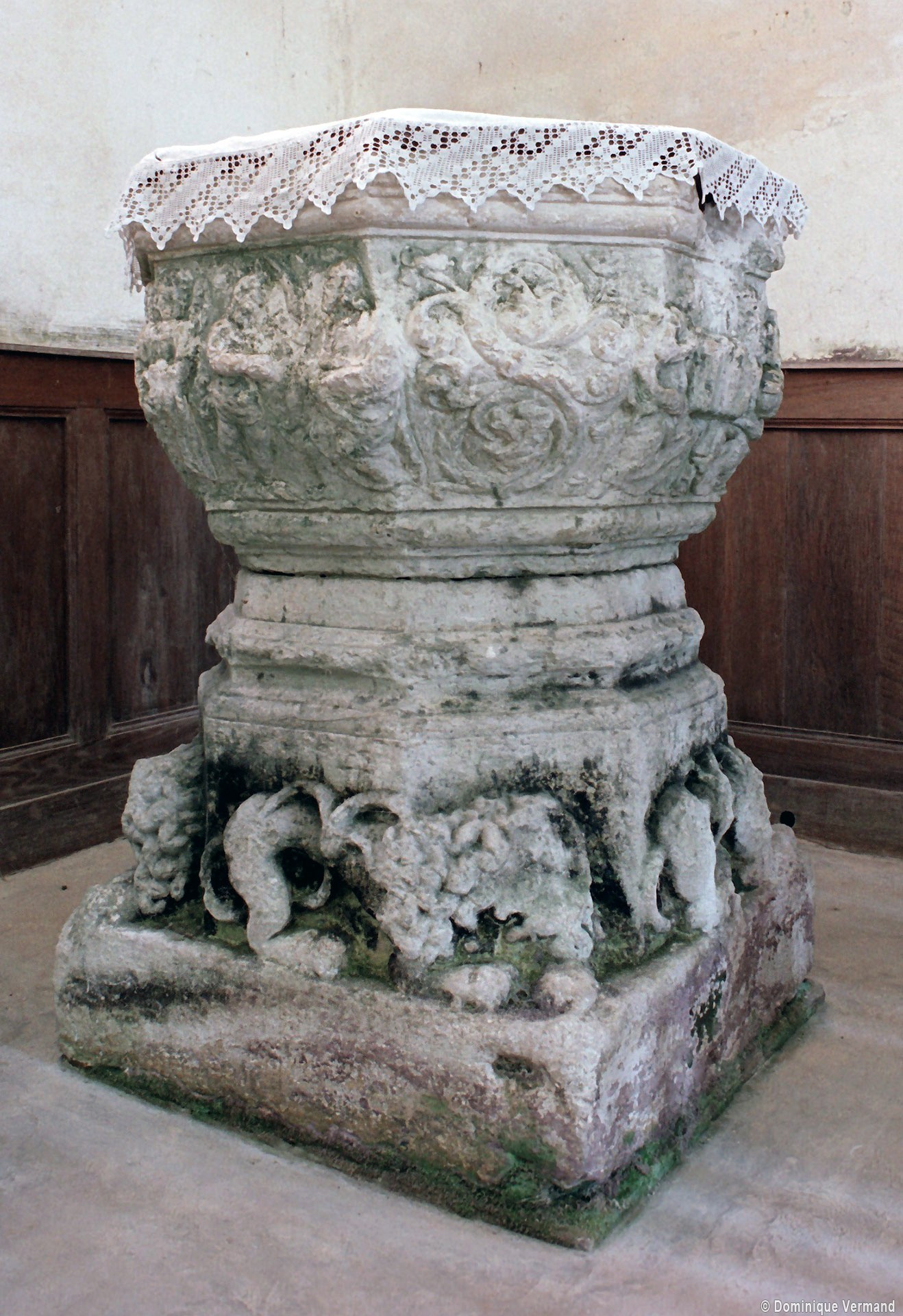 L’élément le plus remarquable du mobilier est la cuve baptismale octogonale en pierre de style renaissance datée, par une inscription, de 1552. Ses faces portent, notamment, des représentations sculptées de l’Annonciation, du baptême du Christ et de la Trinité (2007, modifié 2016).