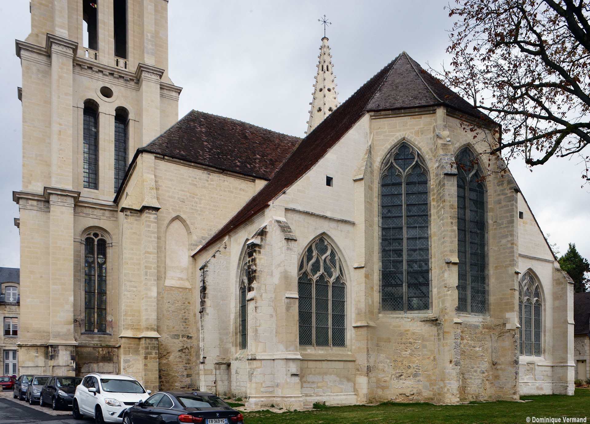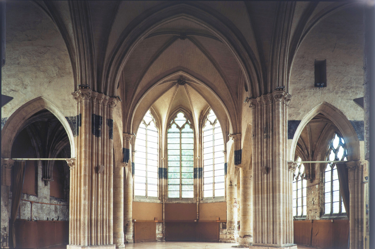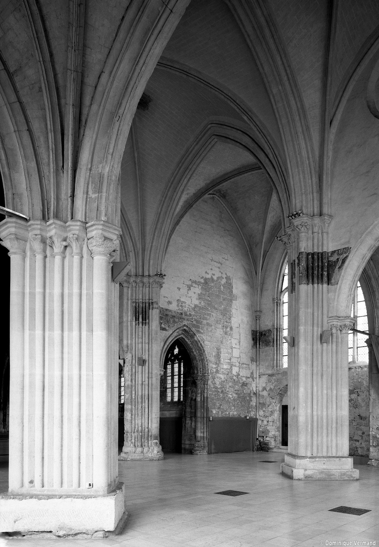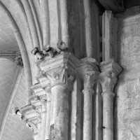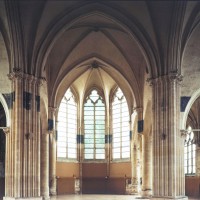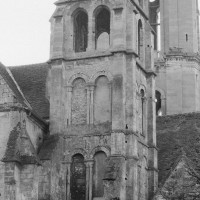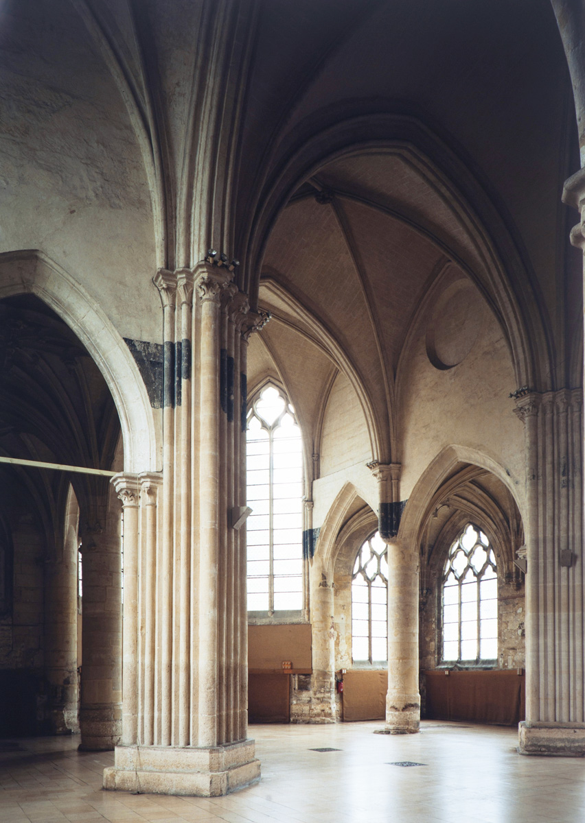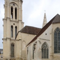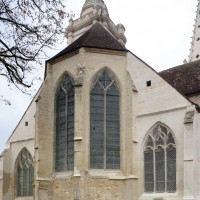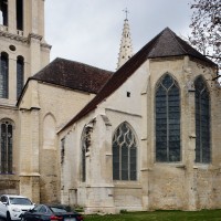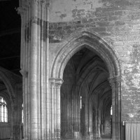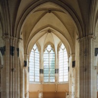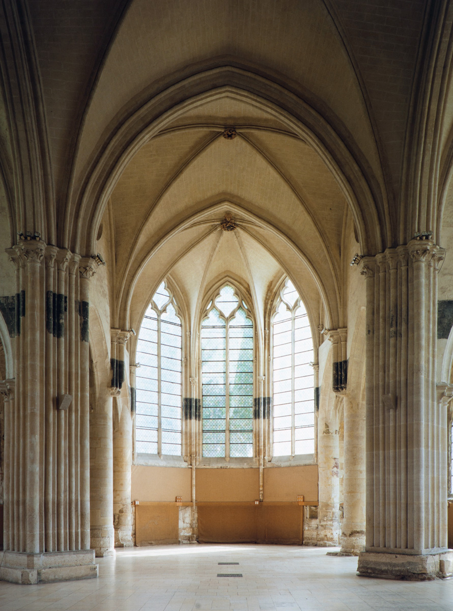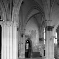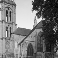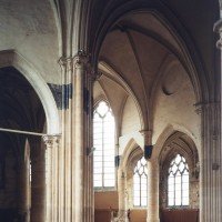 Fortement remanié au 16ème siècle, l’ensemble choeur/transept a été bâti dans les années 1240. Les fouilles de 1977/78 ont permis de montrer que le choeur du 13ème siècle comportait initialement une travée droite flanquée de deux chapelles terminées carrément et une abside à cinq pans. La communication entre les chapelles et la partie centrale s’effectuait par une arcade très étroite – une disposition qui se retrouve à Chambly – au-dessus de laquelle s’ouvrait un oculus.
