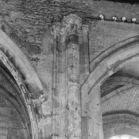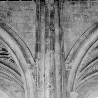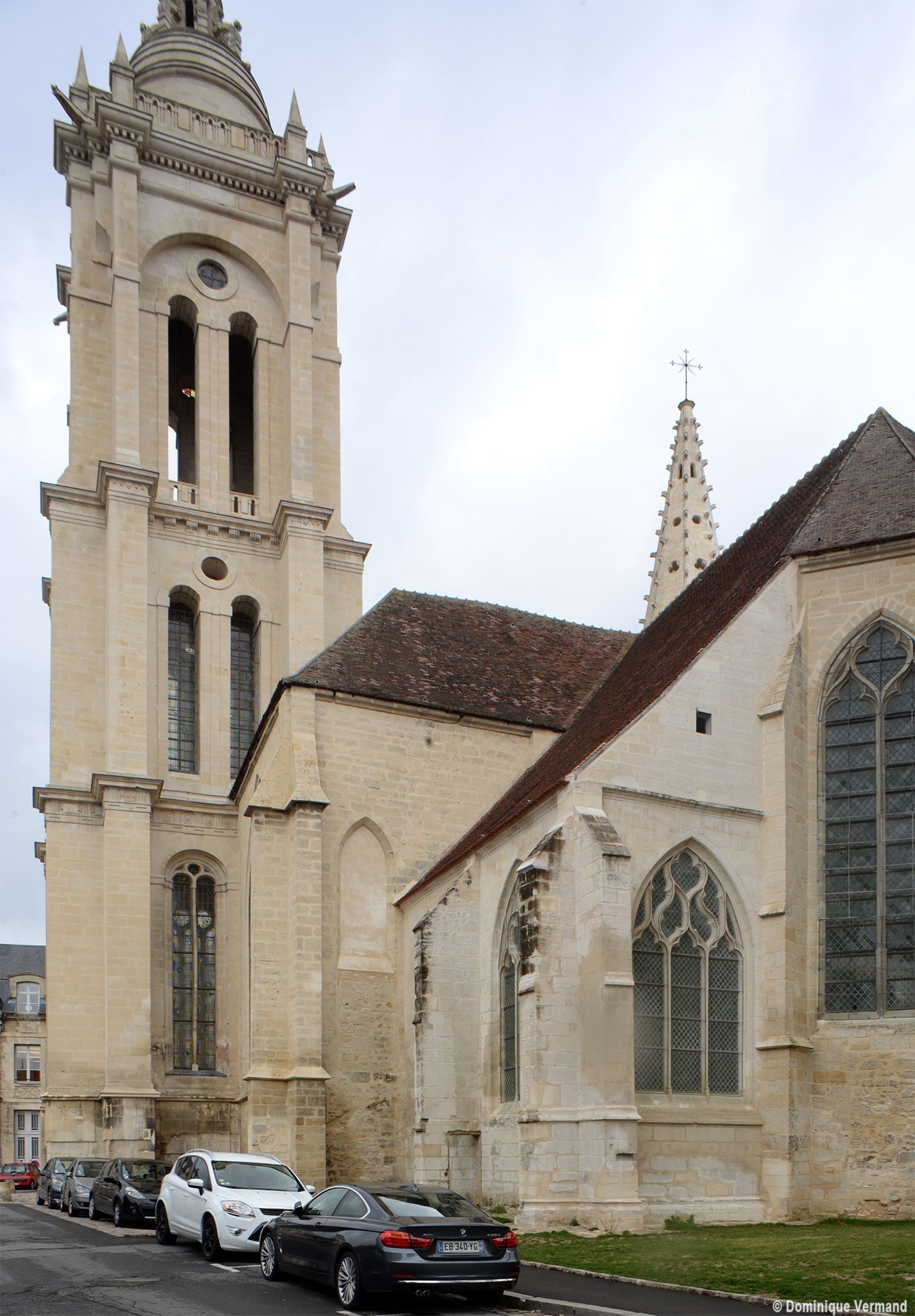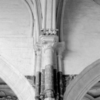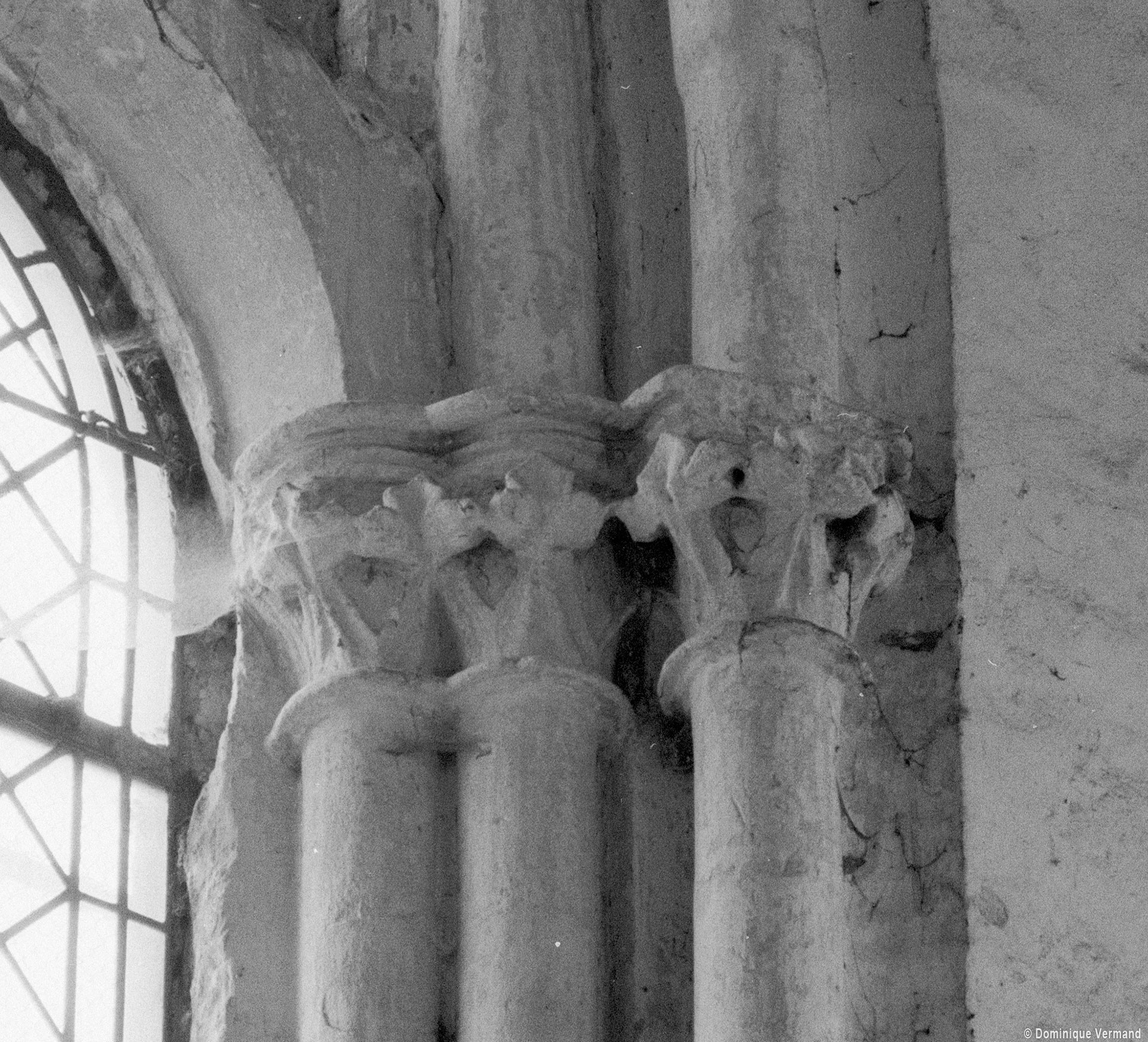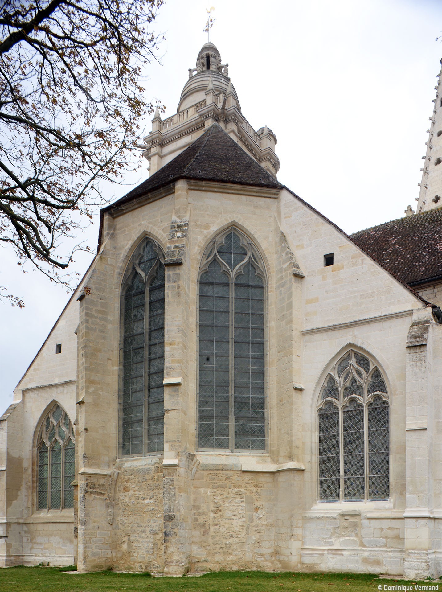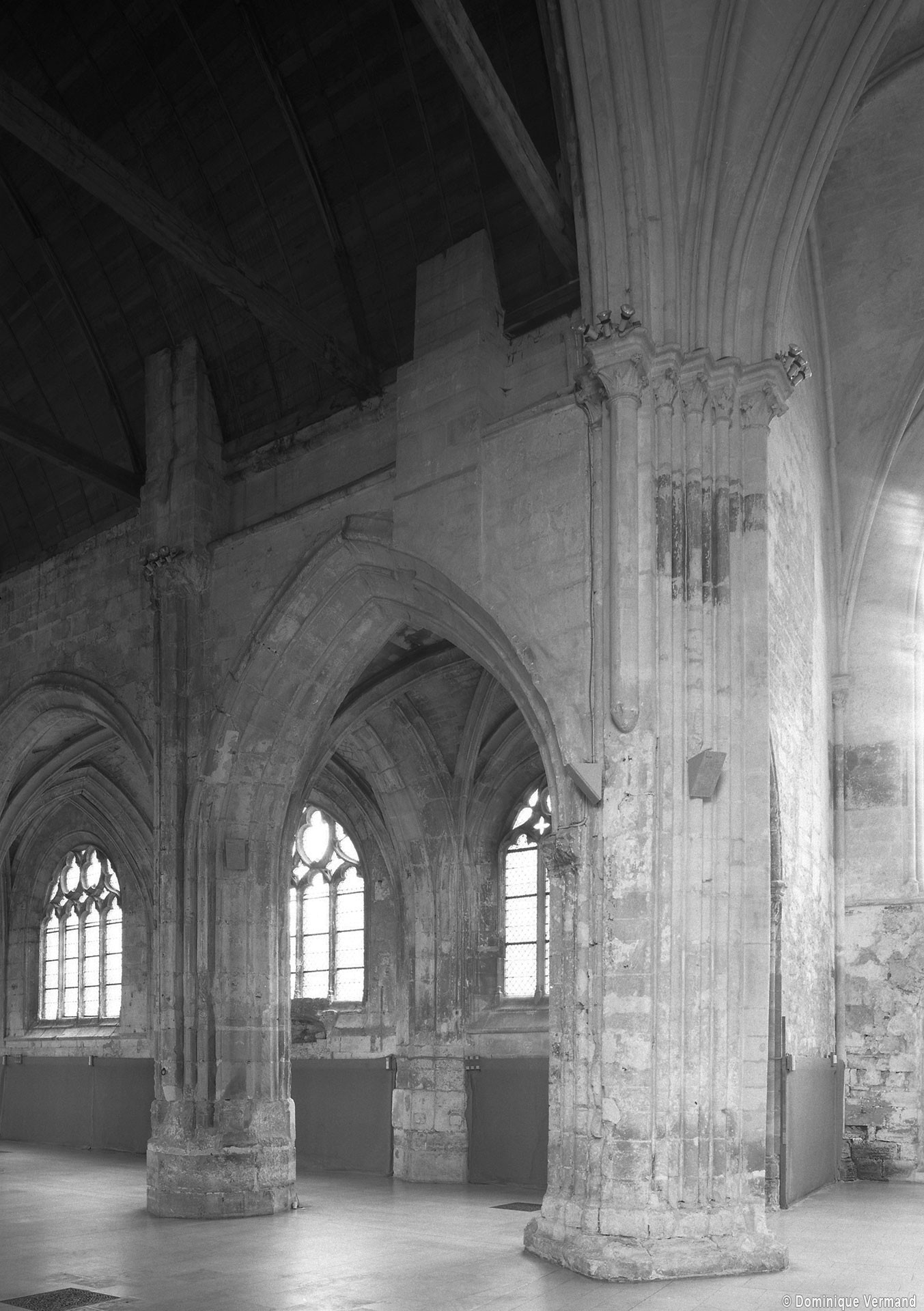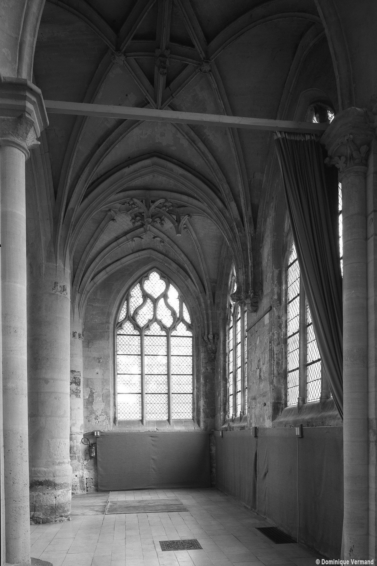 Fortement remanié au 16ème siècle, l’ensemble choeur/transept a été bâti dans les années 1240. Les fouilles de 1977/78 ont permis de montrer que le choeur du 13ème siècle comportait initialement une travée droite flanquée de deux chapelles terminées carrément et une abside à cinq pans. La communication entre les chapelles et la partie centrale s’effectuait par une arcade très étroite – une disposition qui se retrouve à Chambly – au-dessus de laquelle s’ouvrait un oculus.