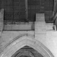 Longue de quatre travées et très fortement désaxée vers le nord, la nef sera bâtie en deux campagnes au milieu du 15ème siècle (deux dernières travées) et dans les années 1510 (façade et deux premières travées). Seuls les bas-côtés sont voûtés d’ogives, le vaisseau central étant couvert d’une belle charpente en carène. Des faisceaux de colonnettes en attente sur les piles montrent toutefois qu’un étage de fenêtres hautes et des voûtes d’ogives étaient prévus. Les fenêtres des bas-côtés comportent des réseaux flamboyants aux dessins variés.