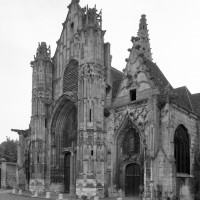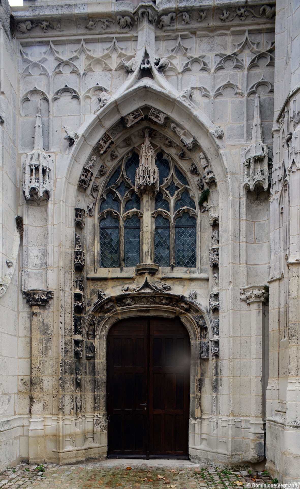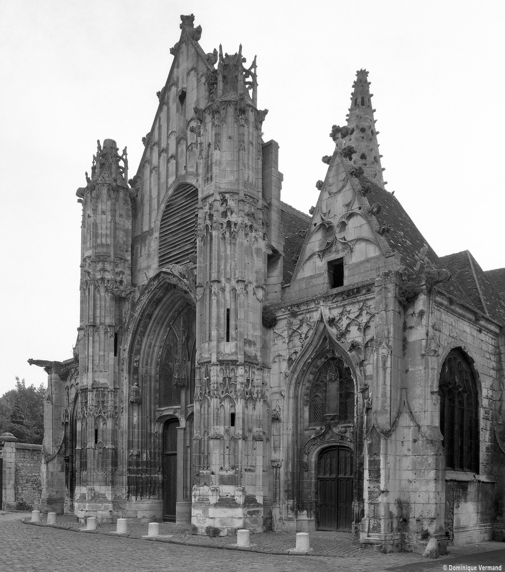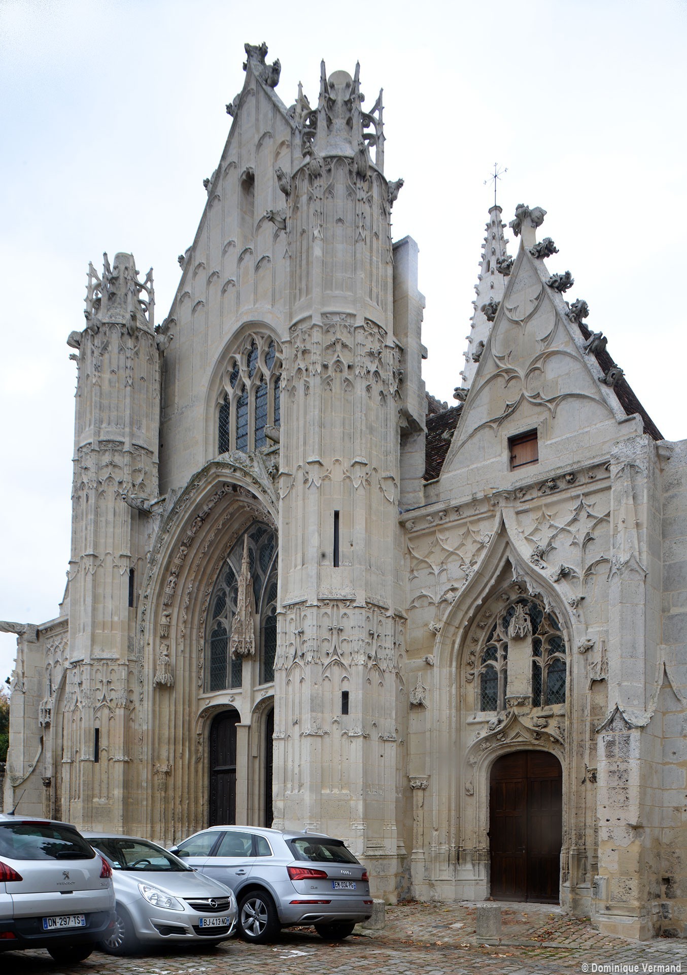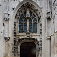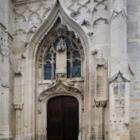 La partie la plus remarquable est la façade, magnifique exemple de style gothique flamboyant. Un cartouche portant la date de 1516, à gauche du portail central, authentifie la date de sa construction. Sa division tripartite bien hiérarchisée, qu’accentuent les deux tourelles d’escalier, répond exactement à celle de la nef (un vaisseau central encadré de deux bas-côtés). L’abondance et le raffinement du décor ne nuisent nullement à la clarté d’une composition qui privilégie la partie centrale, entièrement occupée par le portail dont le haut tympan est complètement vitré selon un usage qui tend à se généraliser à l’époque. Les voussures sont sculptées de douze personnages issus, pour la plupart, de la Bible (2002).