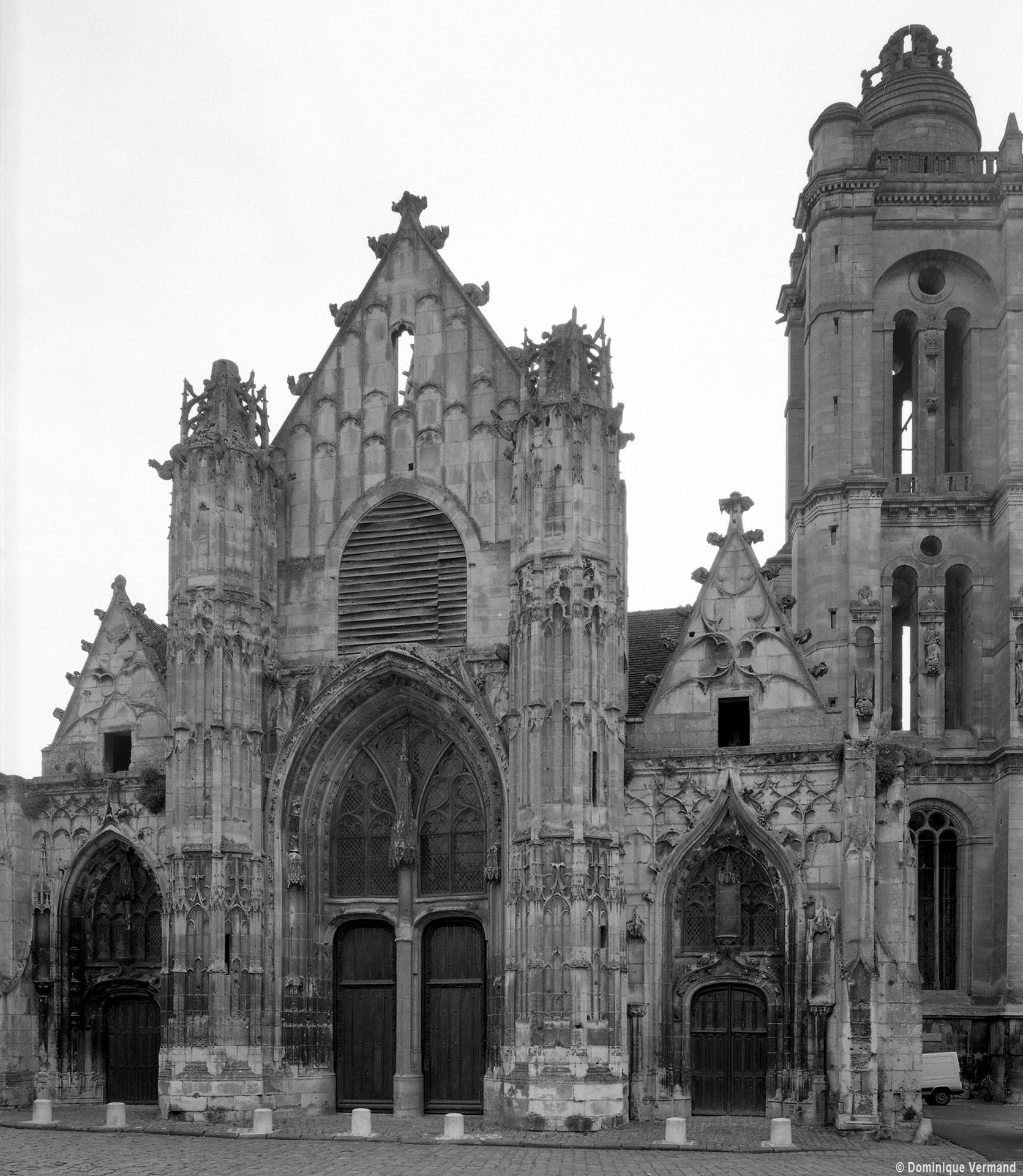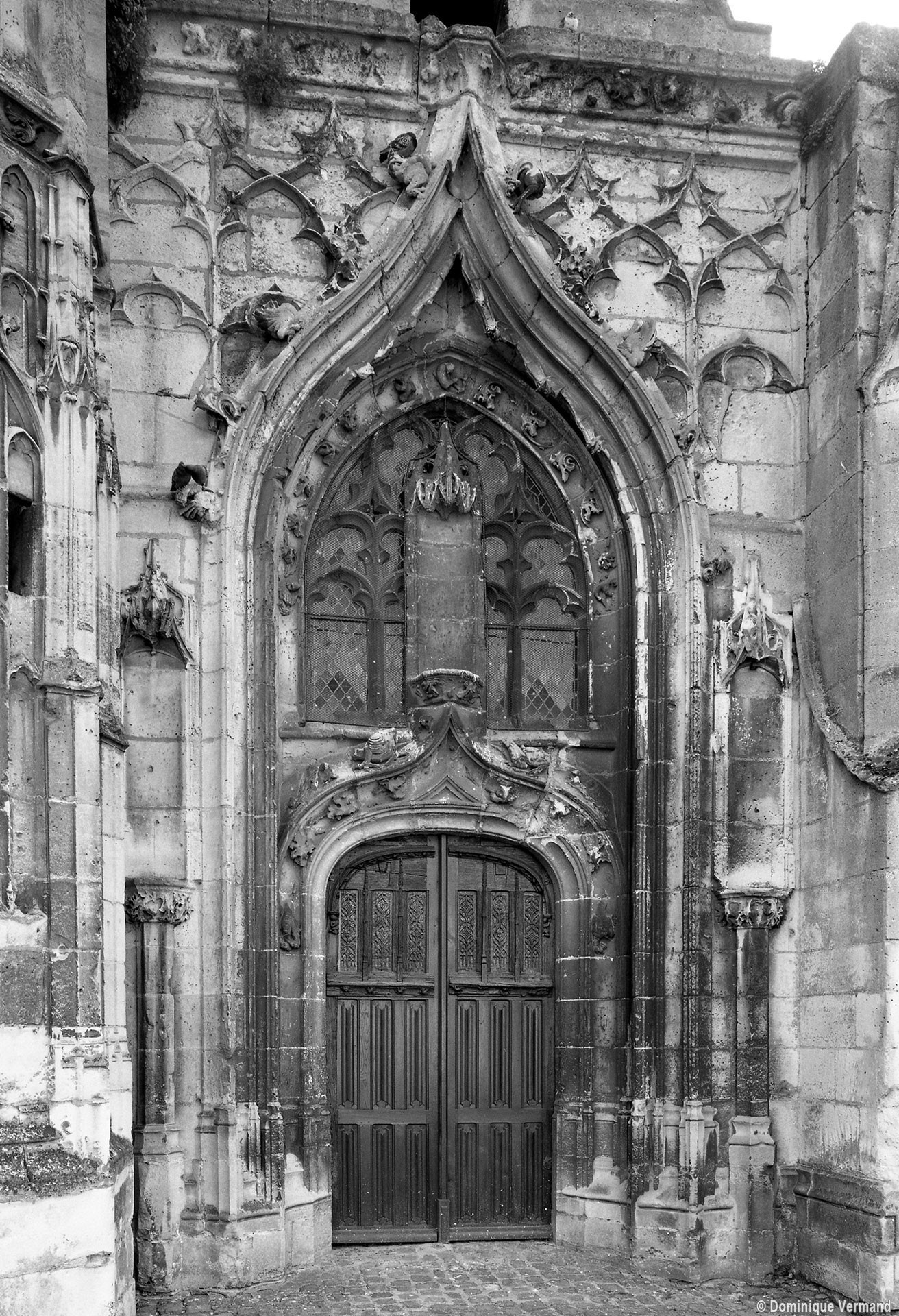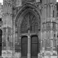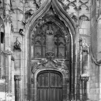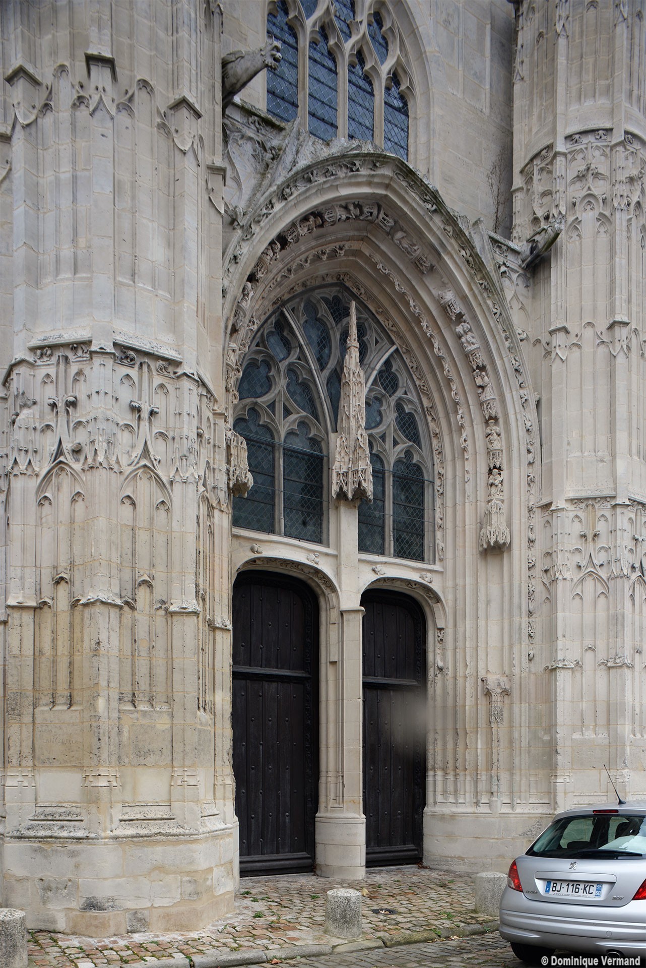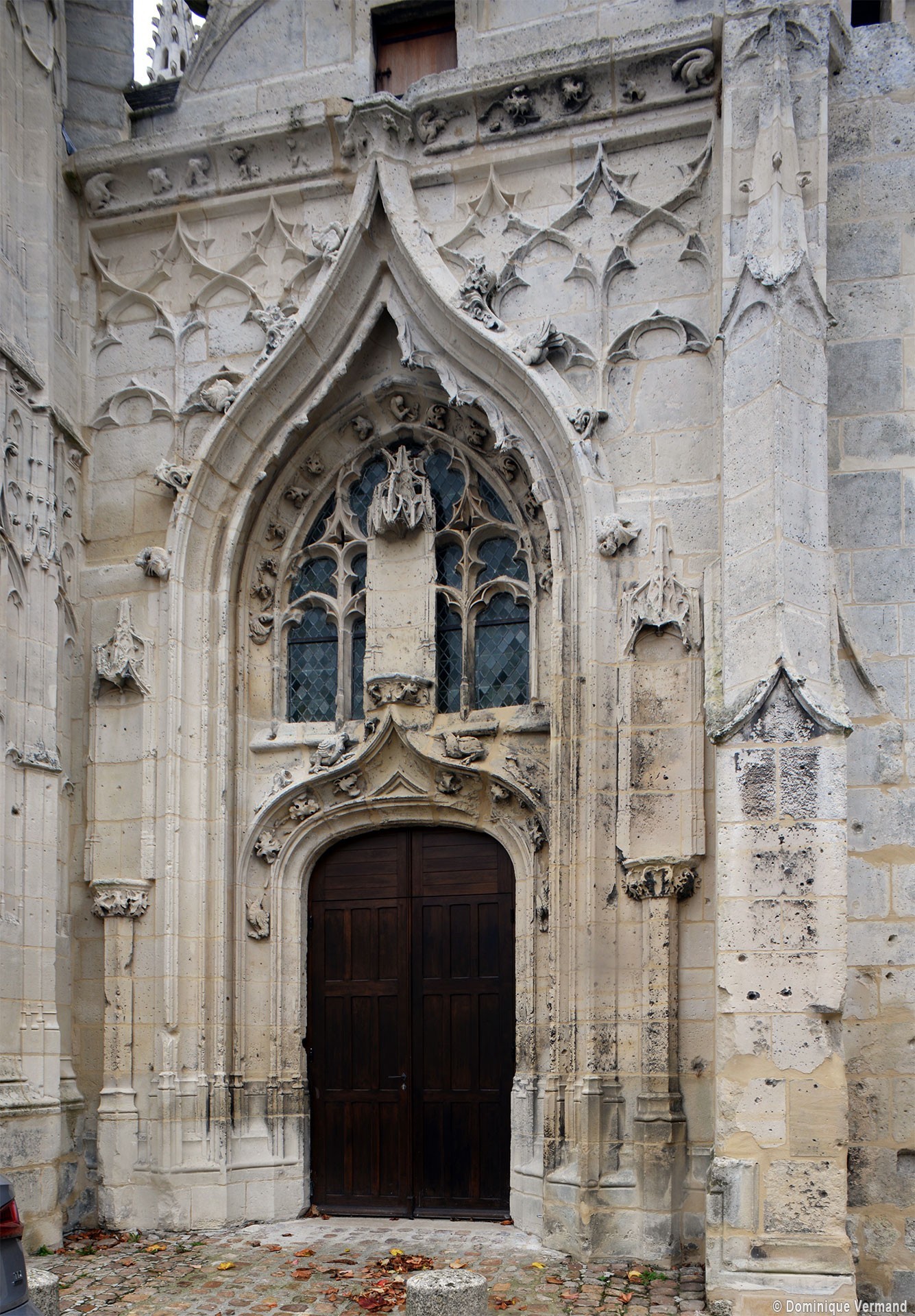 La partie la plus remarquable est la façade, magnifique exemple de style gothique flamboyant. Un cartouche portant la date de 1516, à gauche du portail central, authentifie la date de sa construction. Sa division tripartite bien hiérarchisée, qu’accentuent les deux tourelles d’escalier, répond exactement à celle de la nef (un vaisseau central encadré de deux bas-côtés). L’abondance et le raffinement du décor ne nuisent nullement à la clarté d’une composition qui privilégie la partie centrale, entièrement occupée par le portail dont le haut tympan est complètement vitré selon un usage qui tend à se généraliser à l’époque. Les voussures sont sculptées de douze personnages issus, pour la plupart, de la Bible (2002).