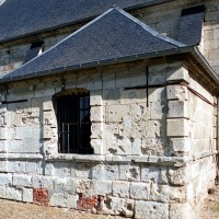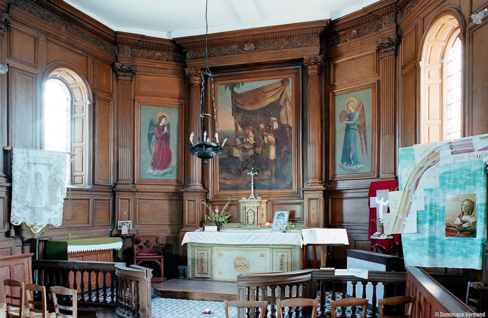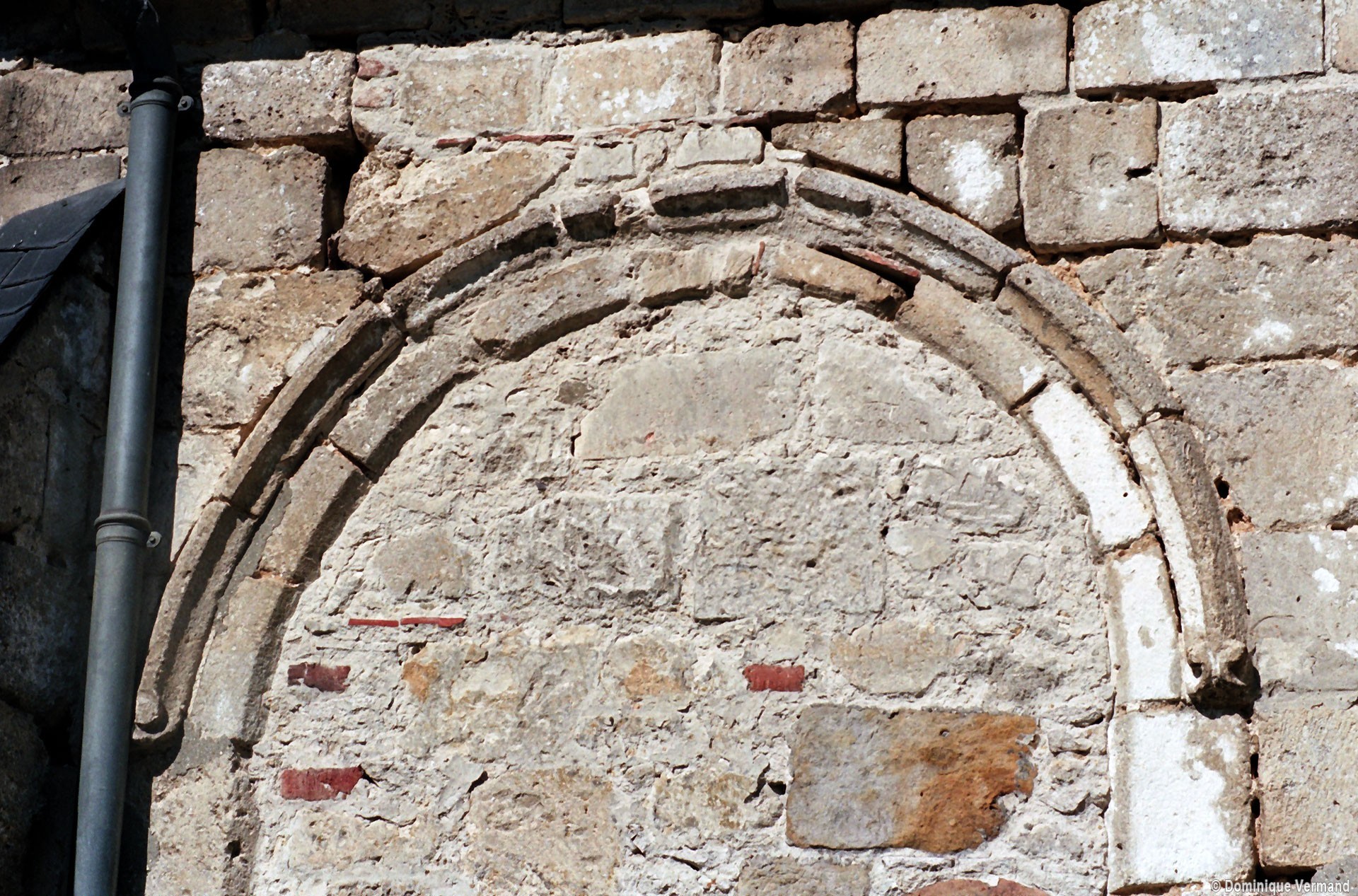 Saint-Cosme et Saint-Damien est un petit édifice au plan très simple consistant en une nef unique et un choeur pentagonal. Tout l’édifice est assis sur un haut soubassement en grés. Le choeur est la partie la plus ancienne et doit remonter à la fin du 12ème ou au début du 13ème siècle comme le montrent les trois fenêtres conservées. En forme de simple lancette, leur archivolte est soulignée par une moulure qui se termine aux deux extrémités par un petit crochet ou un élément végétal.