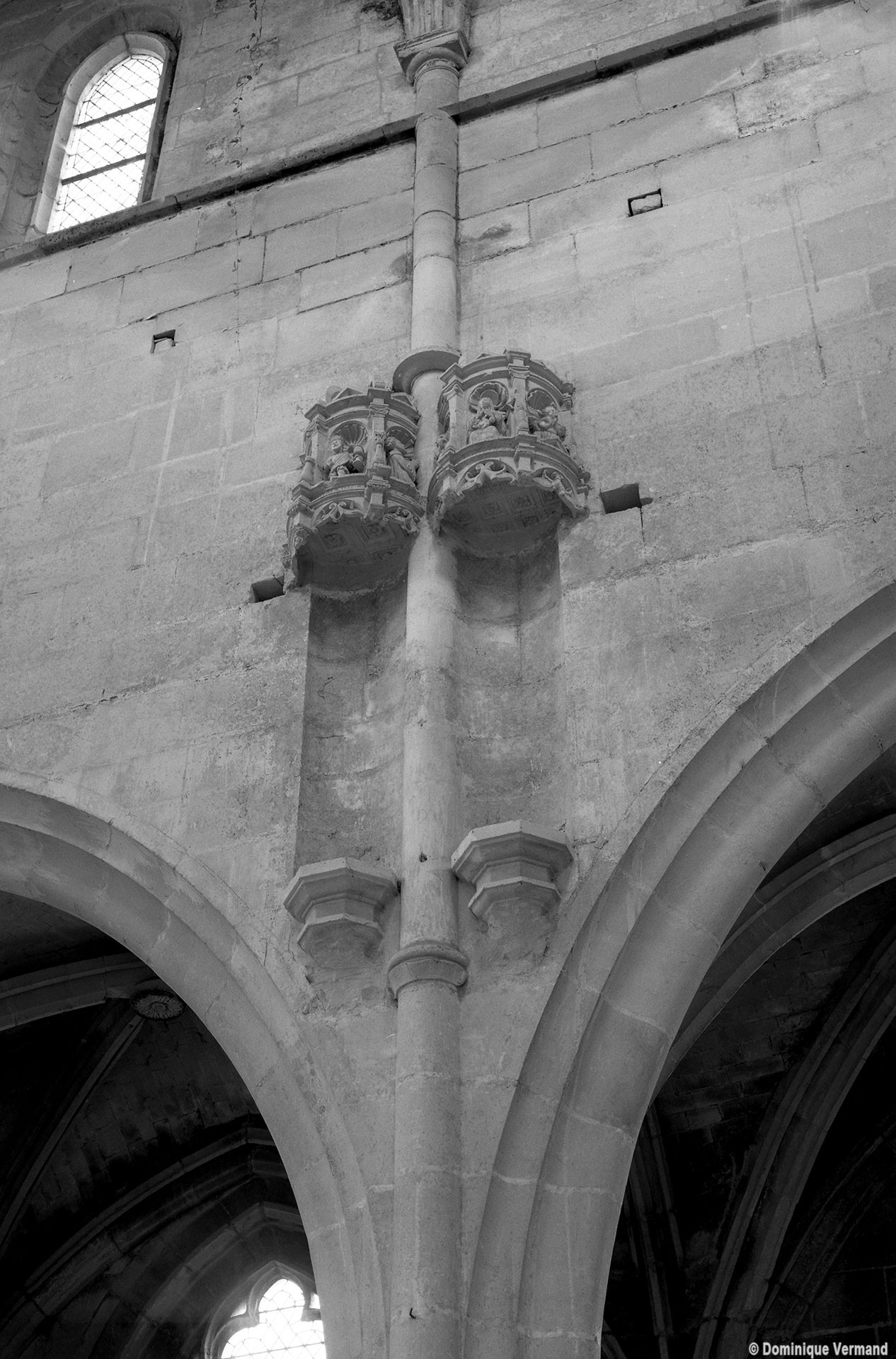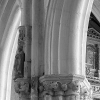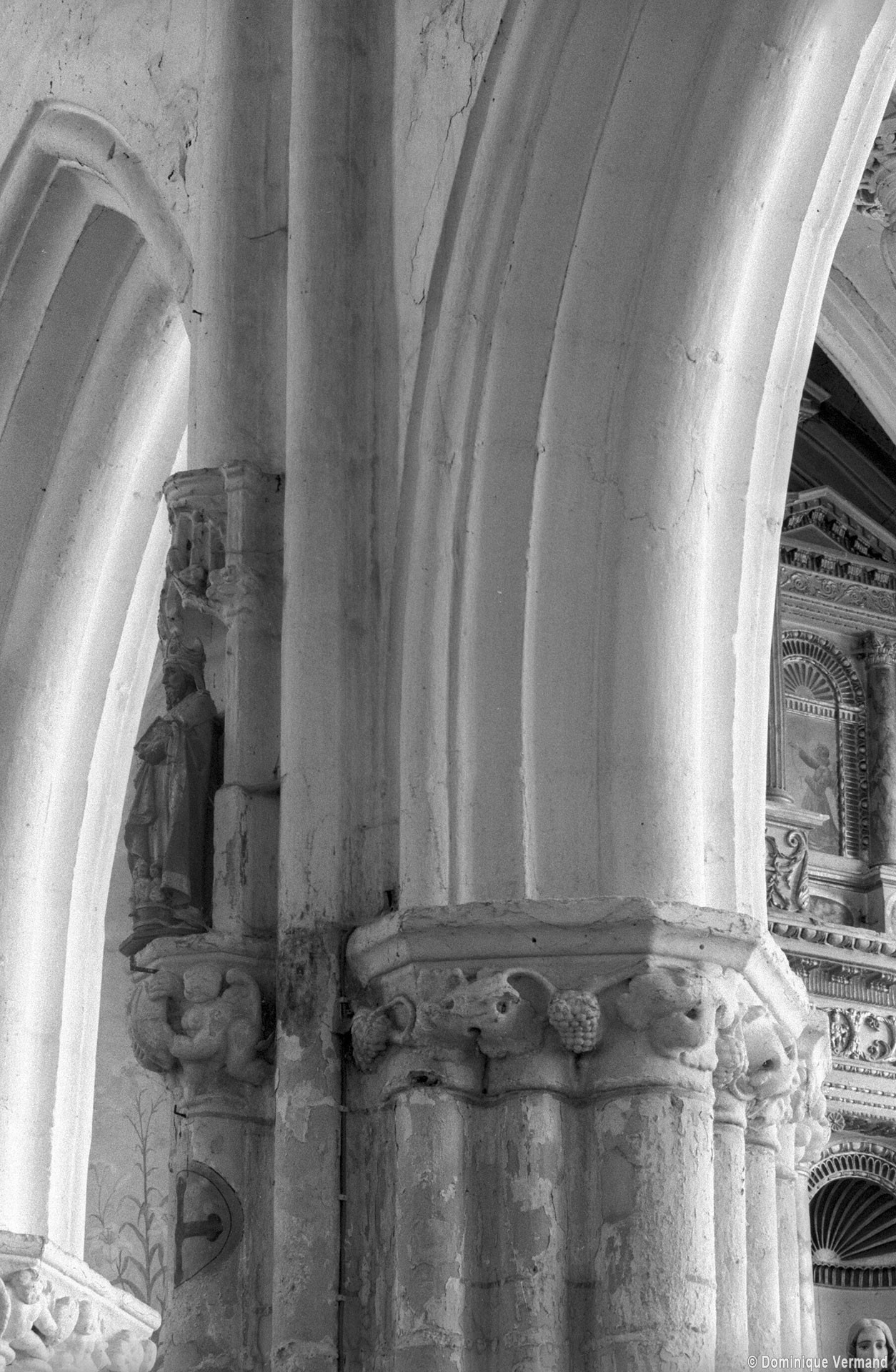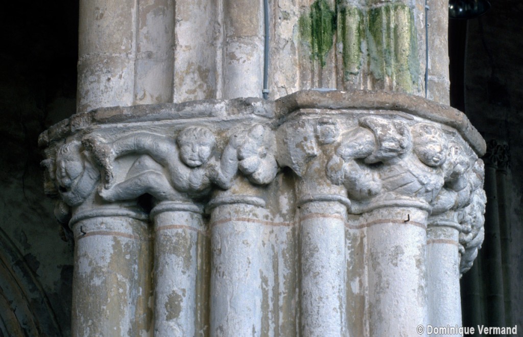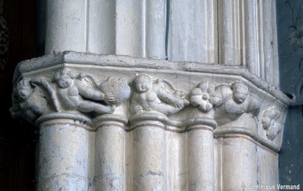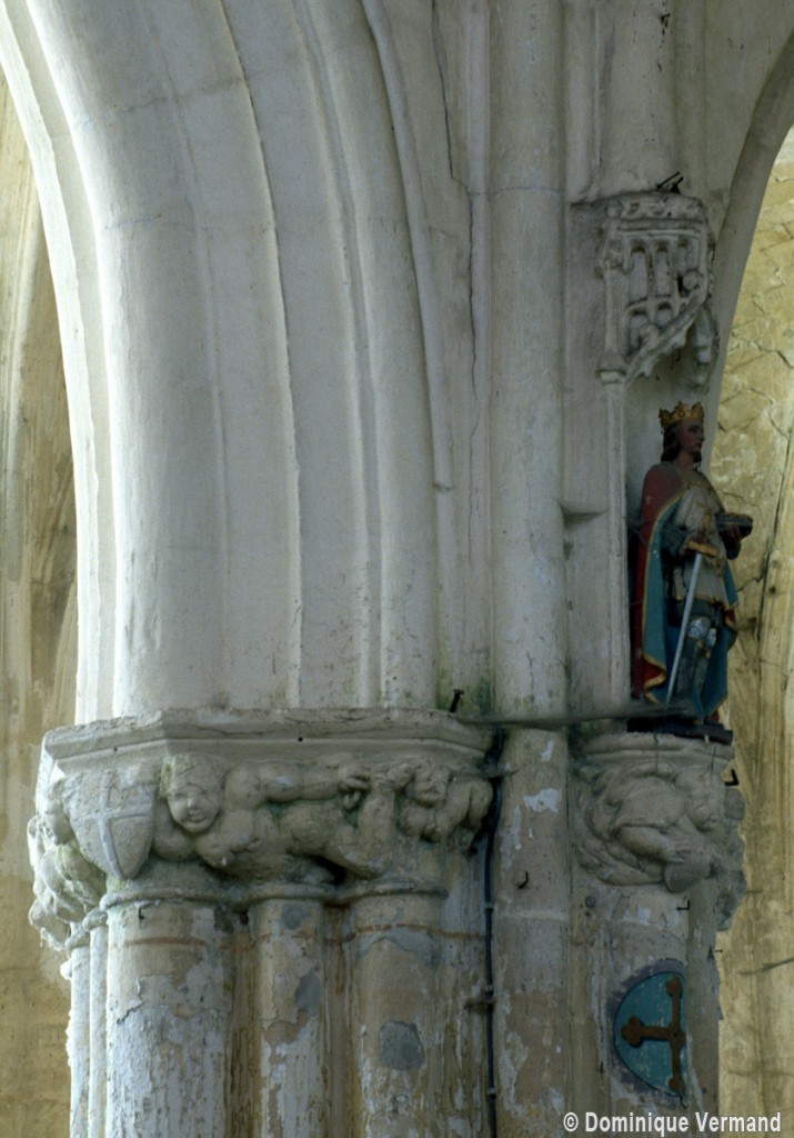 Les arcades finement moulurées retombent sur des piles qui ne comportent pas moins de seize colonnettes. Treize d’entre elles, associées aux retombées des arcades et des voûtes du bas-côté, sont surmontées par des chapiteaux dont le décor de personnages, de feuilles et de fruits se poursuit d’une corbeille à l’autre à la manière d’une frise. Vers le vaisseau central, le tailloir du chapiteau de la demi-colonne médiane, qui correspond au doubleau de la voûte, sert de socle à une niche surmontée d’un dais finement ouvragé abritant une statue. Une disposition semblable se retrouve, pour le 16ème siècle, à l’église de Serans, dans le Vexin, et l’église de Trumilly l’adoptait déjà au 13ème siècle dans une variante avec petits panneaux peints.