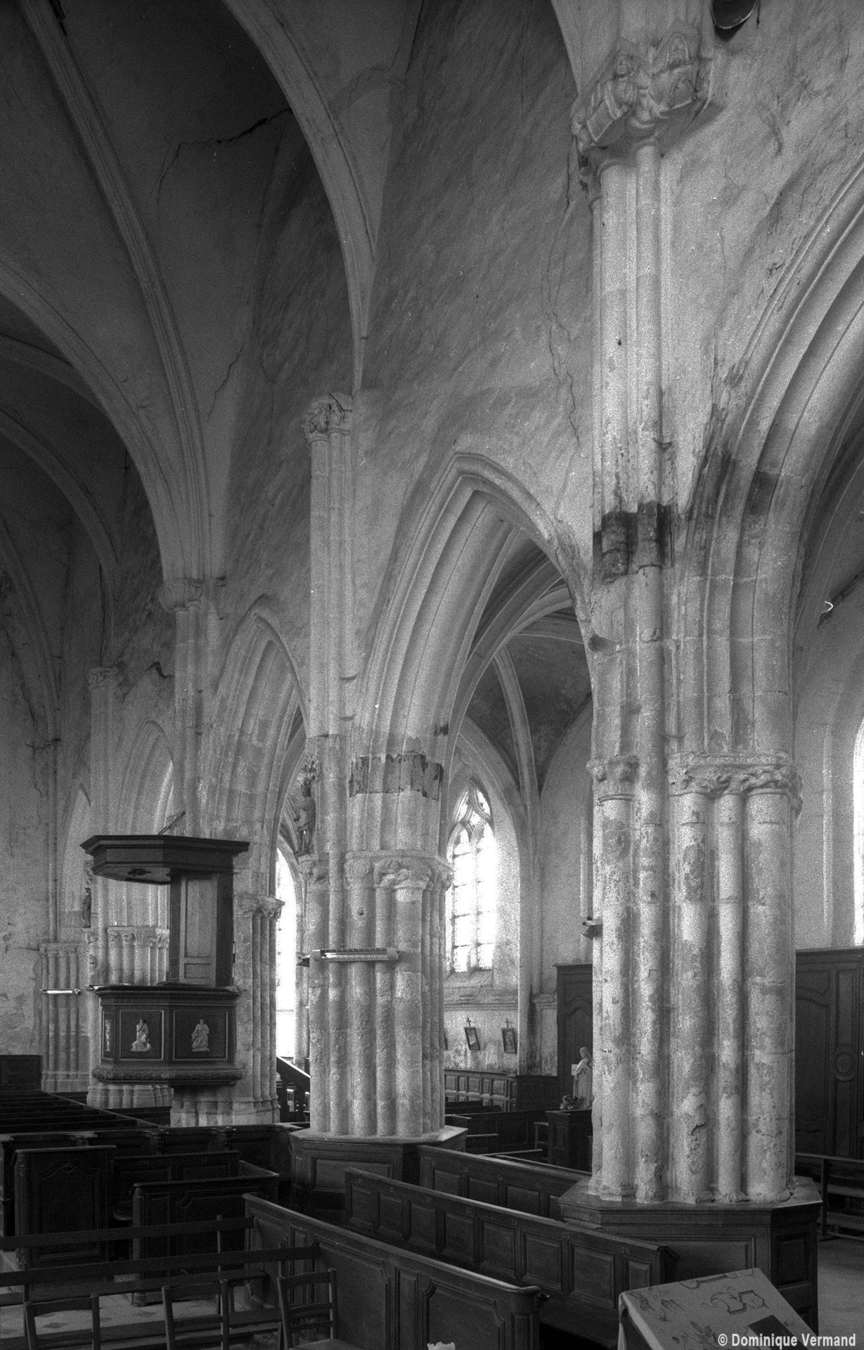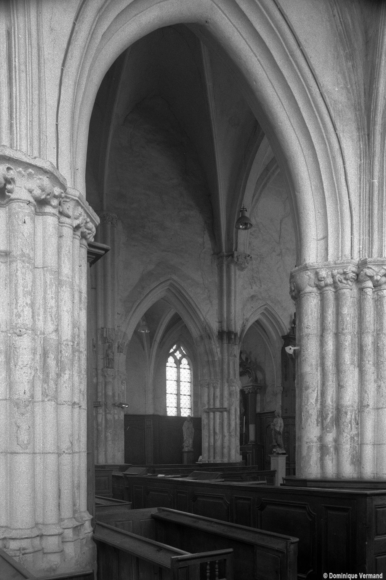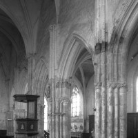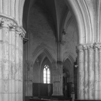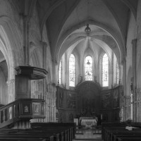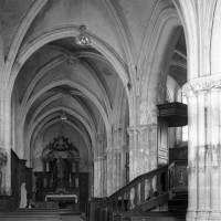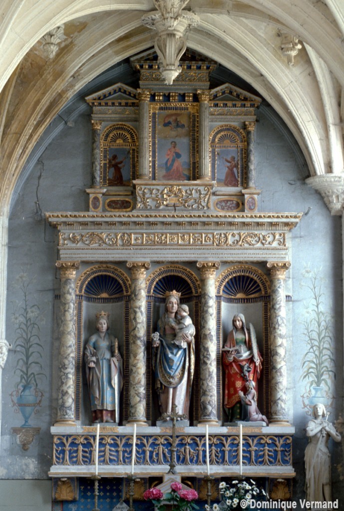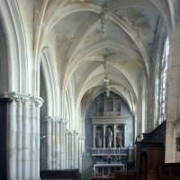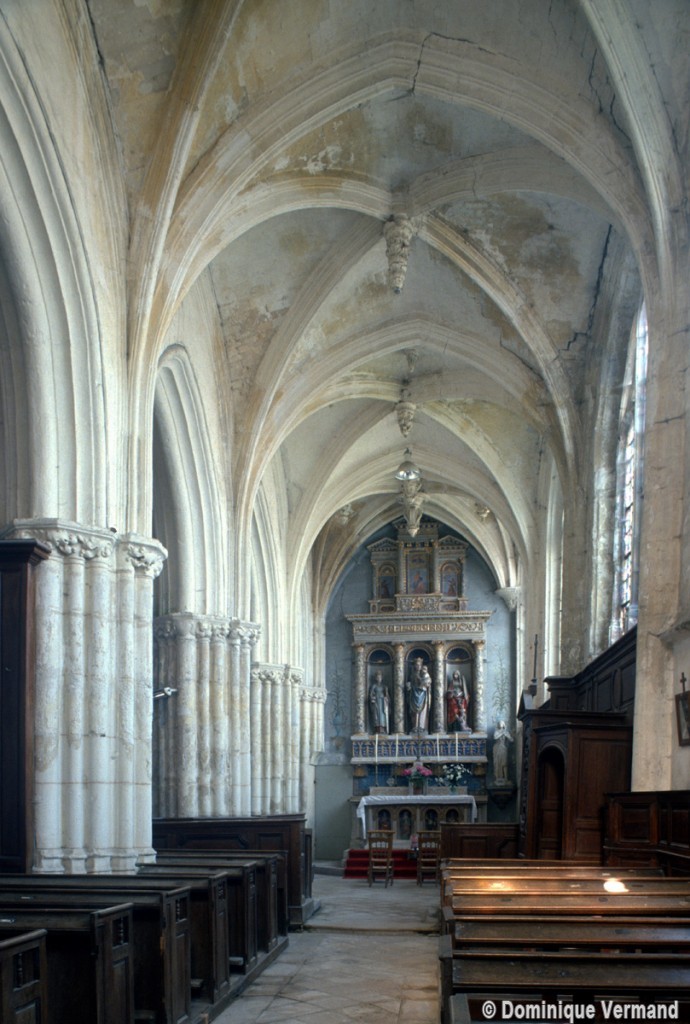 Les parties hautes de la nef, les bas-côtés et le voûtement de l’abside furent refaits au 16ème siècle. Les traces de réparation sont particulièrement spectaculaires sur les murs gouttereaux de la nef qui, beaucoup plus minces, se raccordent maladroitement à la construction précédente. Deux voûtes sexpartites remplacèrent alors les voûtes quadripartites d’origine. On remarquera enfin la chapelle terminant le bas-côté sud, couverte d’une belle voûte avec clef pendante, liernes et tiercerons et abritant un intéressant autel du 17ème siècle (1996, modifié 2017).