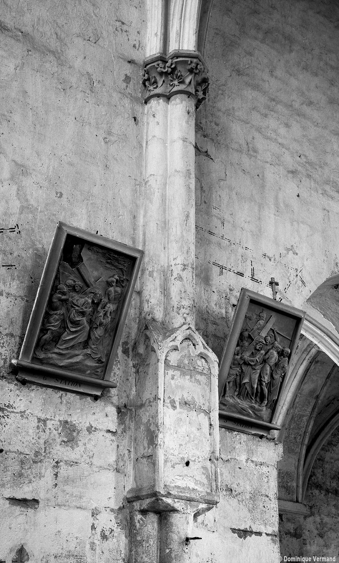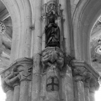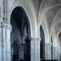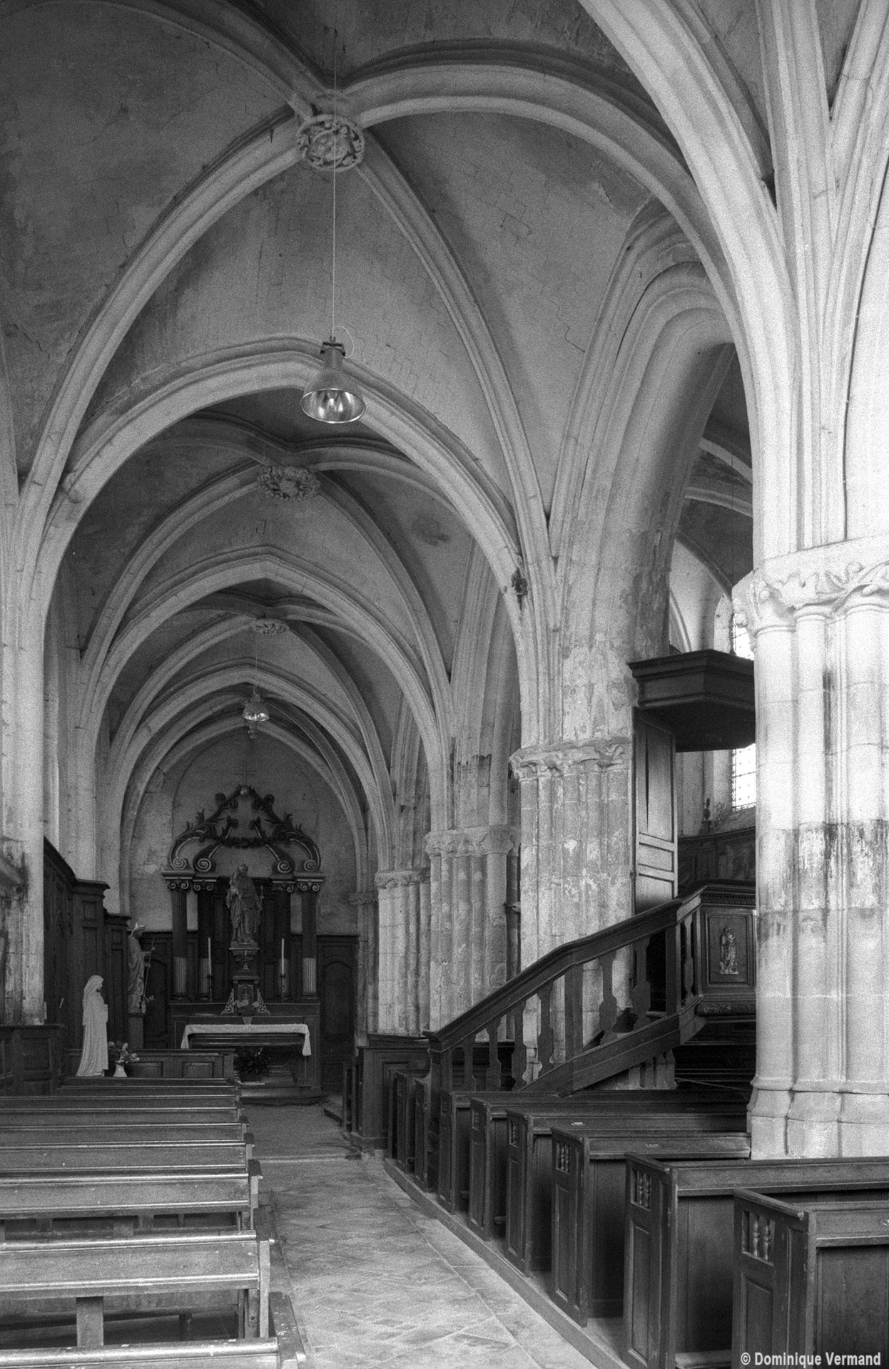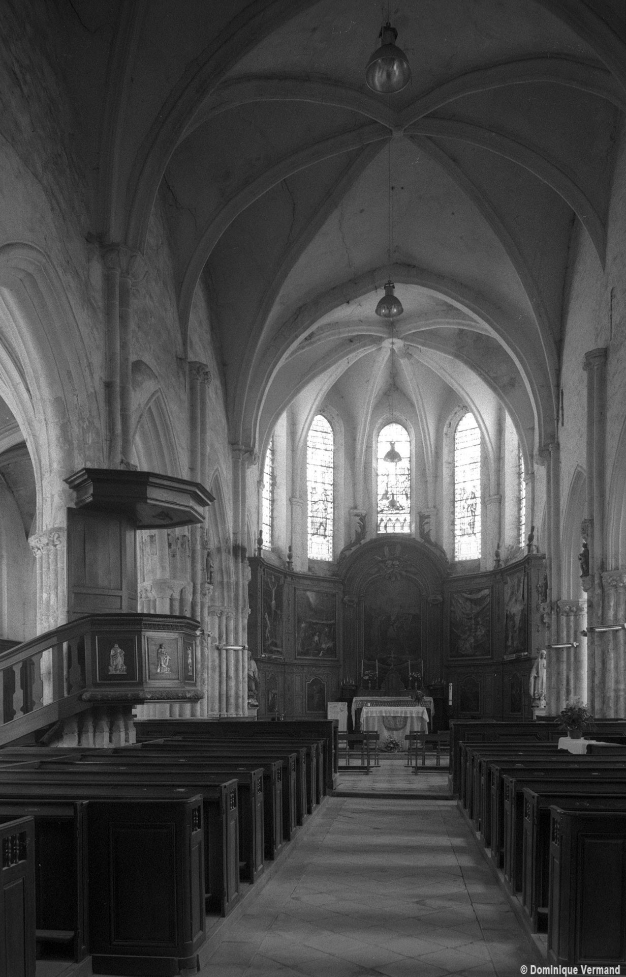 Les parties hautes de la nef, les bas-côtés et le voûtement de l’abside furent refaits au 16ème siècle. Les traces de réparation sont particulièrement spectaculaires sur les murs gouttereaux de la nef qui, beaucoup plus minces, se raccordent maladroitement à la construction précédente. Deux voûtes sexpartites remplacèrent alors les voûtes quadripartites d’origine. On remarquera enfin la chapelle terminant le bas-côté sud, couverte d’une belle voûte avec clef pendante, liernes et tiercerons et abritant un intéressant autel du 17ème siècle (1996, modifié 2017).