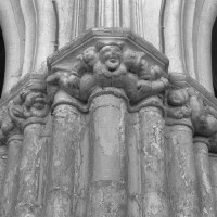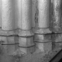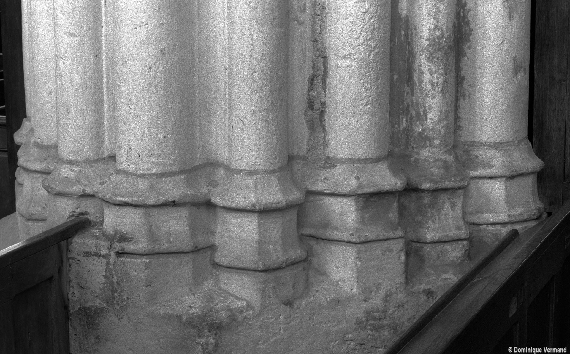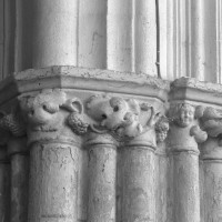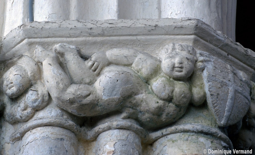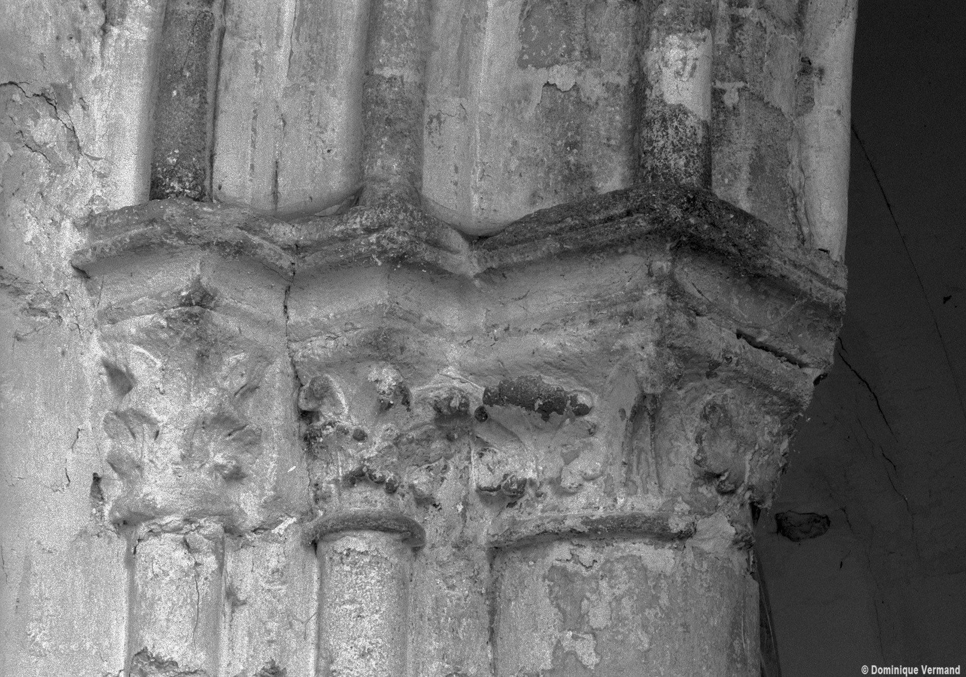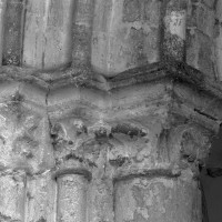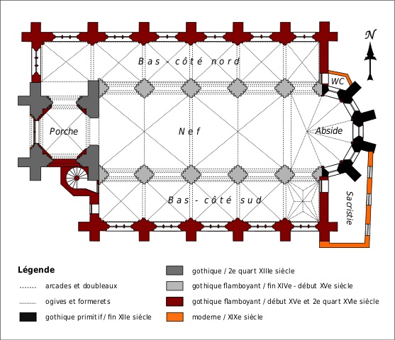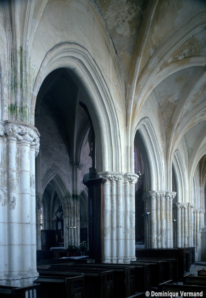 Exceptées cette tour et l’enveloppe de l’abside, l’église subit une reconstruction totale fin 14ème/début 15ème siècle, une époque dont les témoins sont rares dans cette région qui eut beaucoup à souffrir de la guerre contre les Anglais et des désordres politiques qui l’accompagnèrent. S’il ne reste de cette reconstruction que les grandes arcades des quatre travées de la nef, ces vestiges sont néanmoins suffisants pour juger du très grand raffinement avec lequel l’église avait été alors partiellement rebâtie.