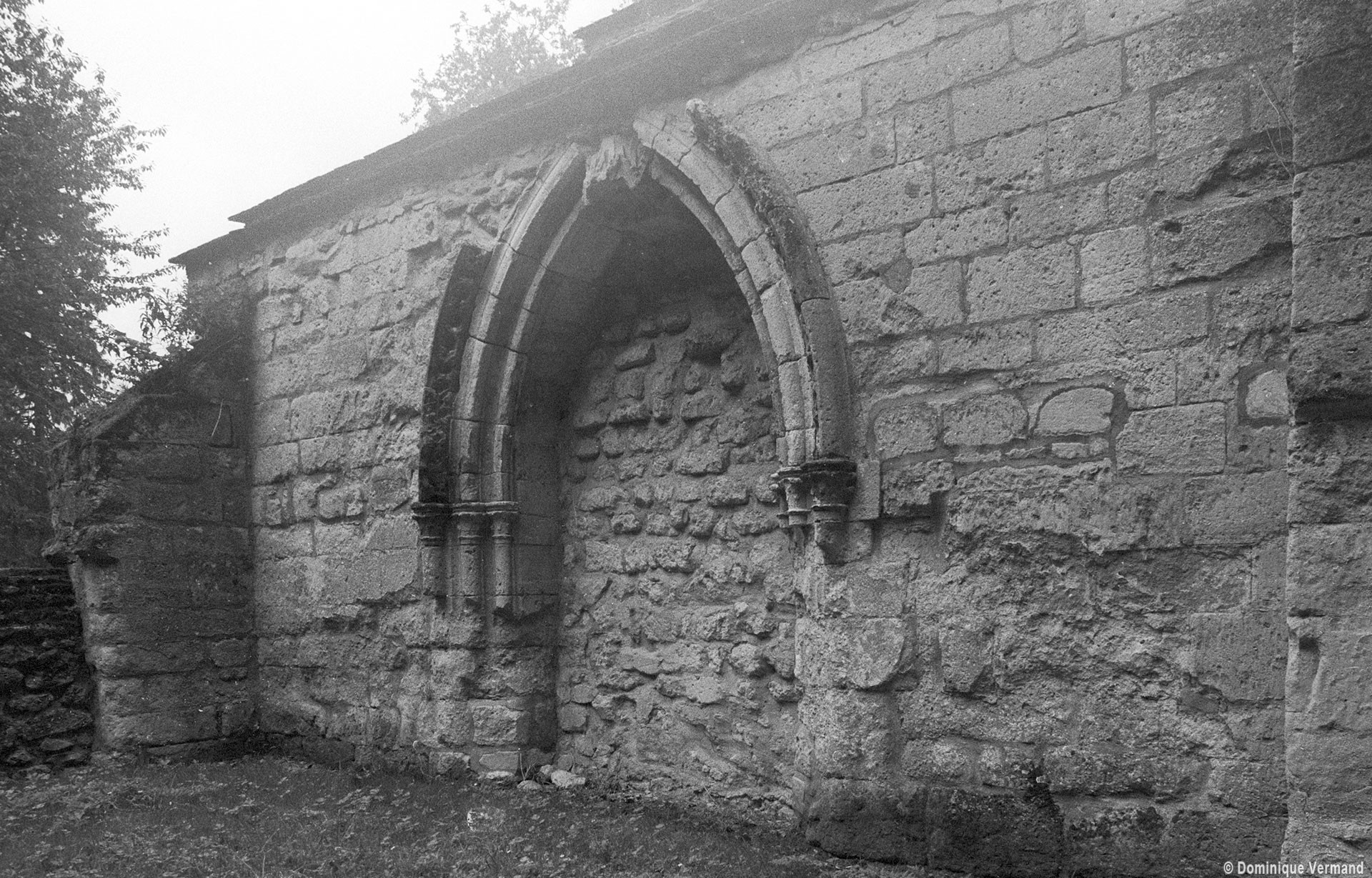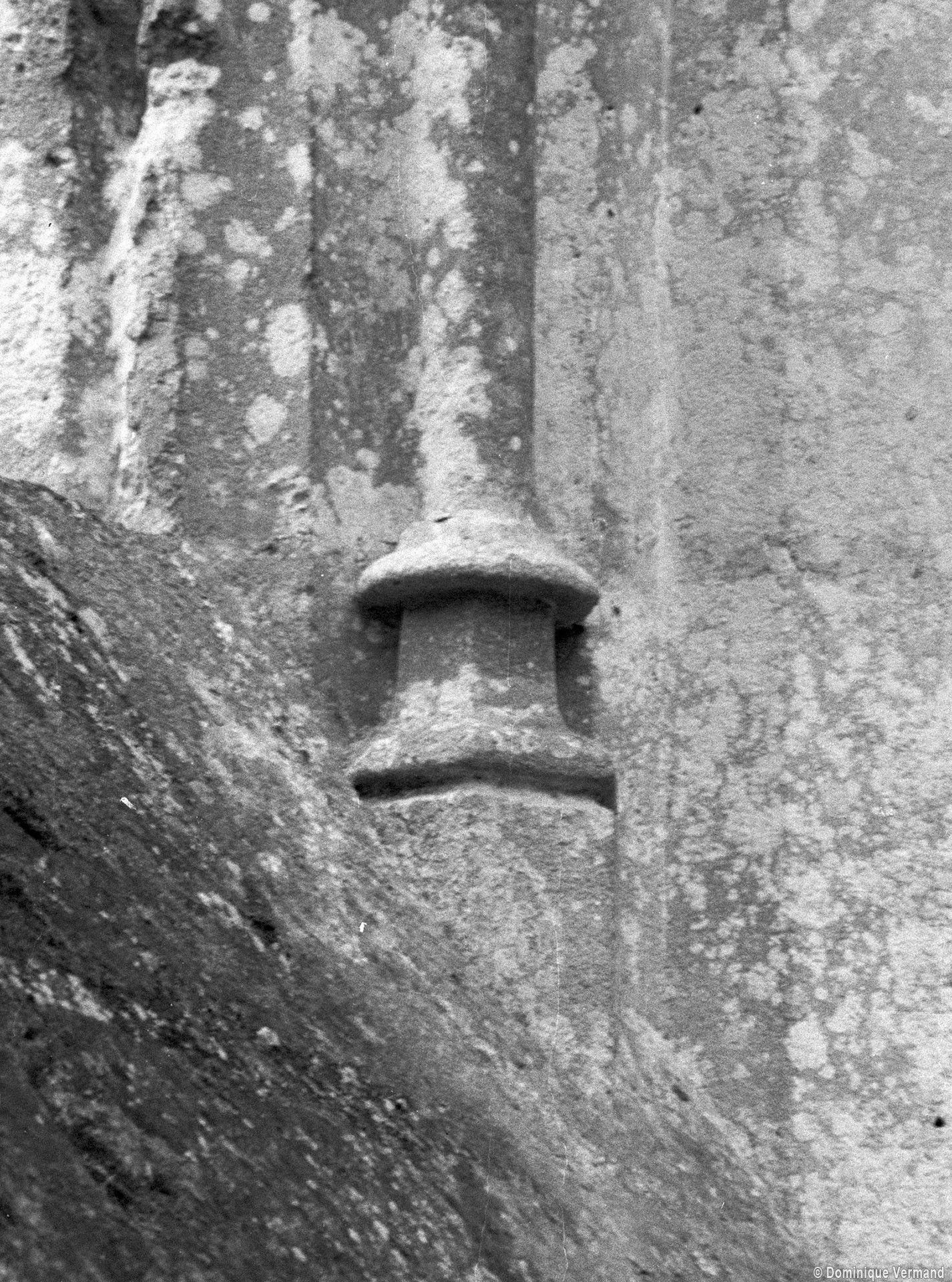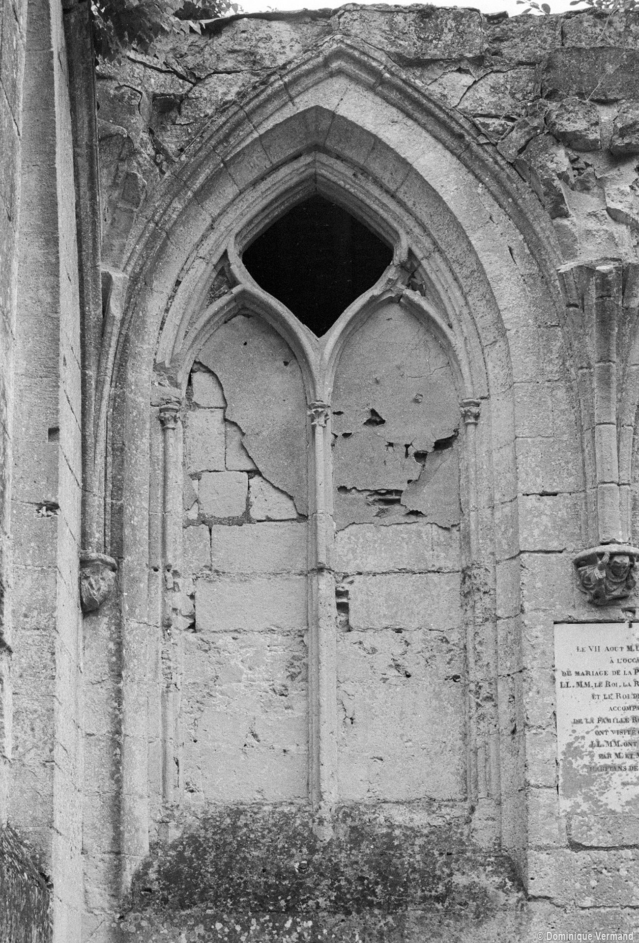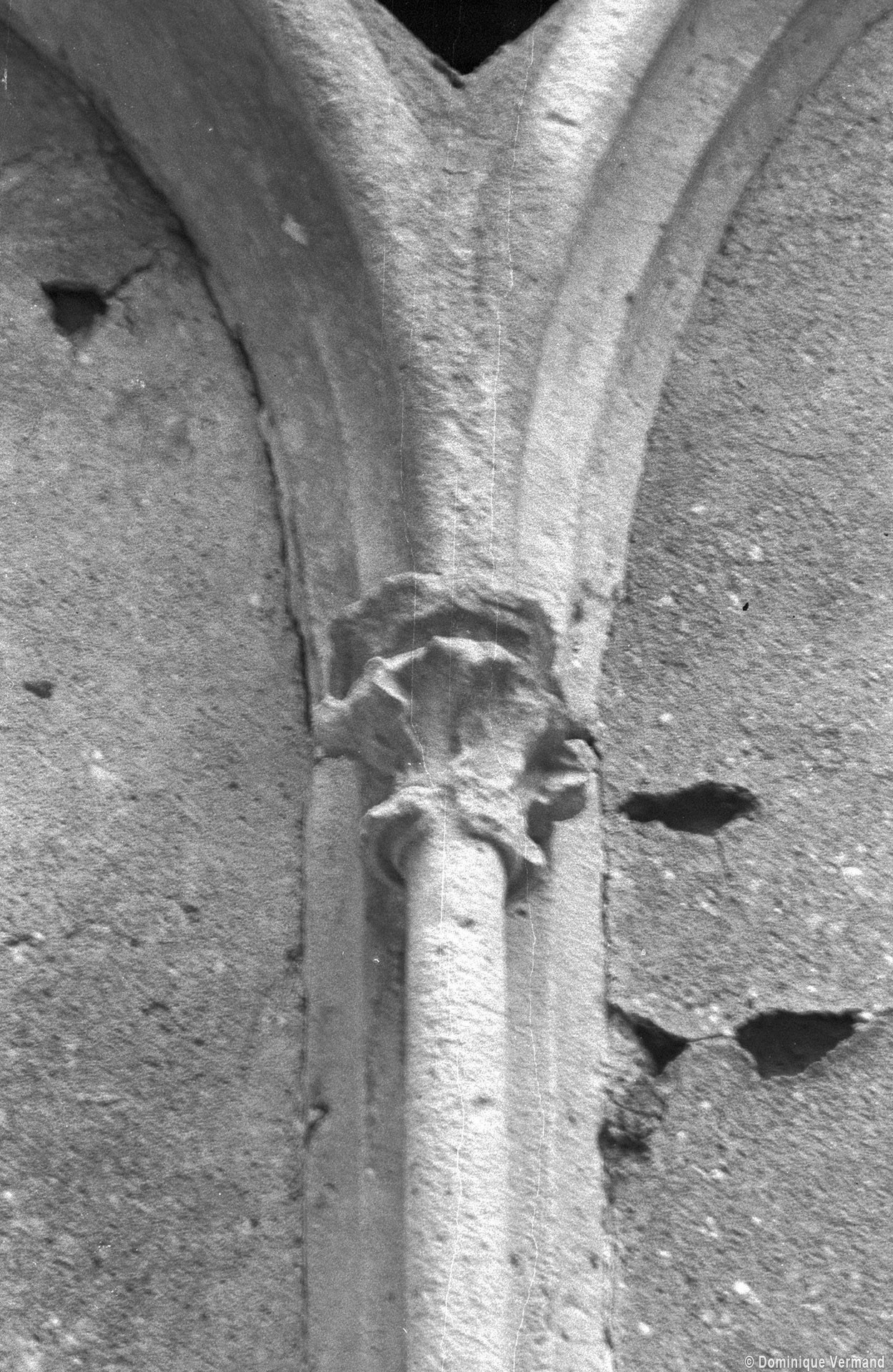 Entre les deux, on accordera toute son attention à la chapelle méridionale qui, bien que privée de ses voûtes, est d’un grand intérêt. Flanquée à l’angle sud-ouest d’une tourelle d’escalier polygonale contemporaine, elle constitue un rare exemple d’architecture de la fin du 14ème siècle dans notre région. Les retombées des trois voûtes d’ogives s’effectuent sur des culs-de-lampe finement sculptés. Si le réseau des plus grandes fenêtres a disparu, celui des trois fenêtres du mur sud subsiste et deux d’entre elles montrent un tracé très précoce – et encore timide – avec courbe et contre-courbe, à l’origine du flamboyant (2001, modifié 2016).