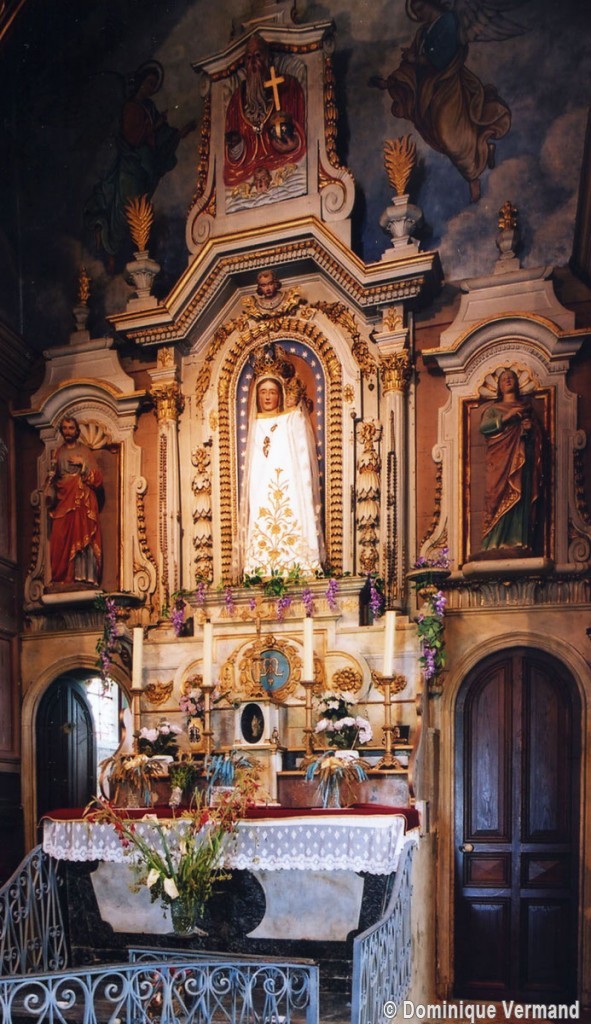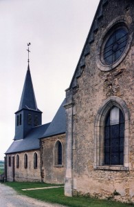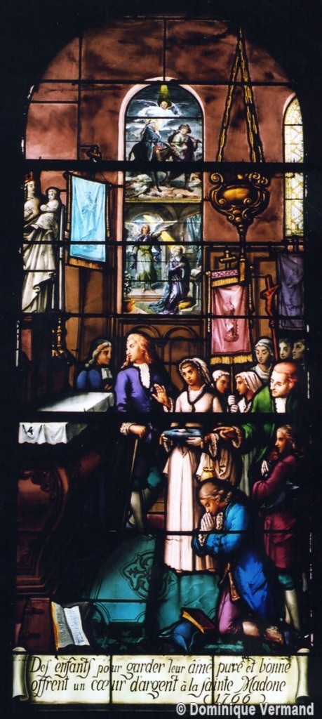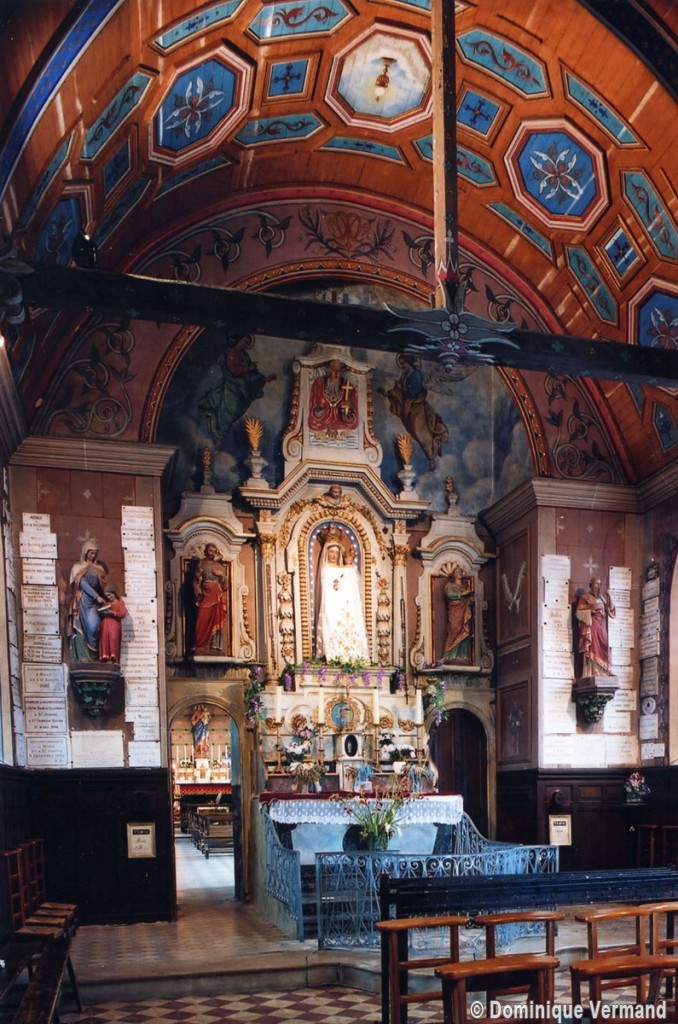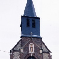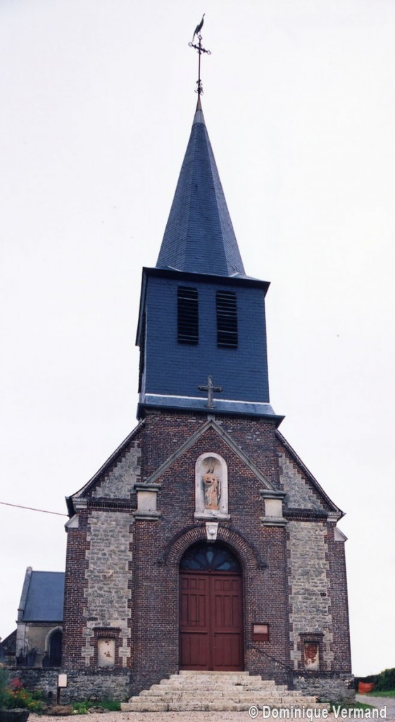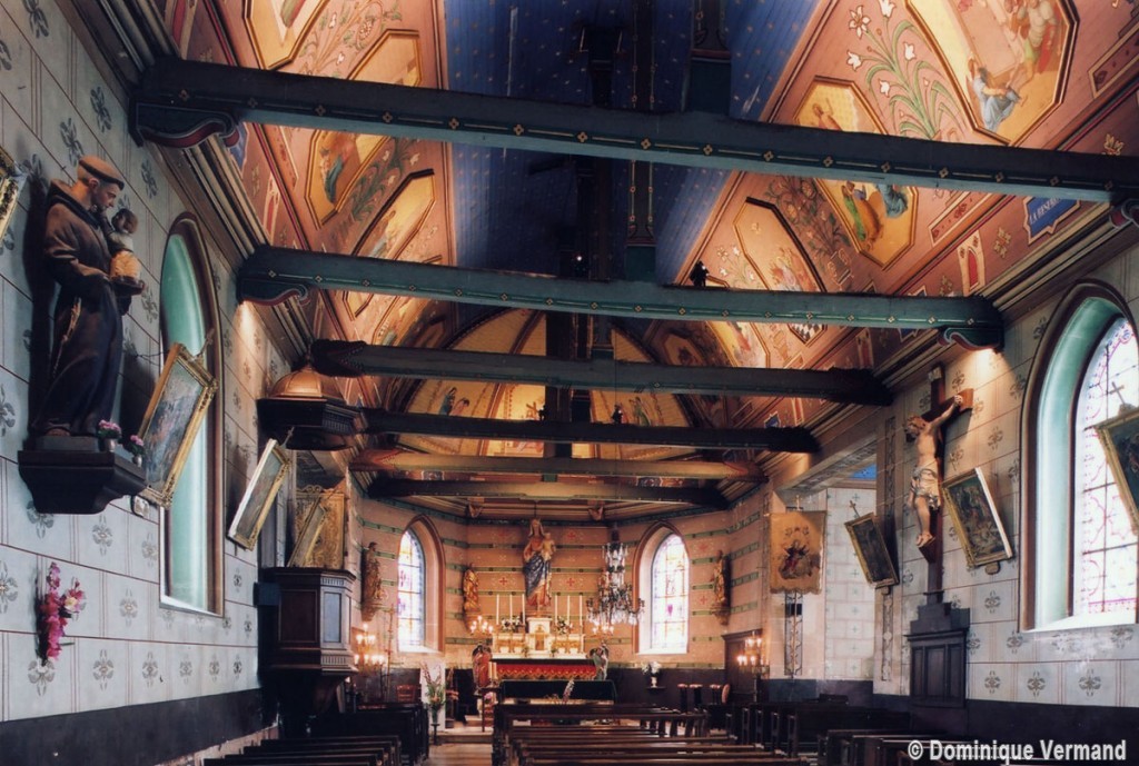 La moitié ouest de la nef et la chapelle qui la précède et abrite la statue de la Vierge miraculeuse, sont plus récentes, toujours d’après la charpente. Les apports du 19ème siècle sont en revanche facilement identifiables : clocher porche en briques et grès surmonté d’un beffroi en charpente couverte d’ardoises et chapelles orientales – dédiées au Sacré Coeur et à saint Joseph – construites en 1878 à l’initiative du curé, A.V. Heu.