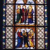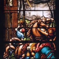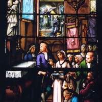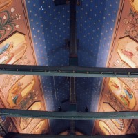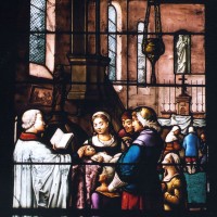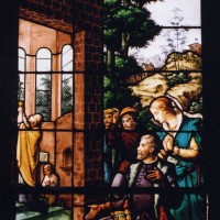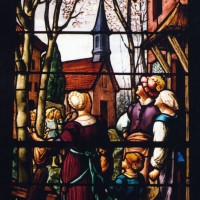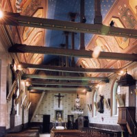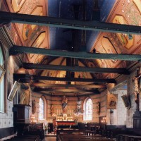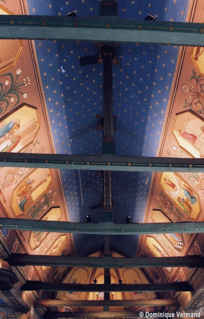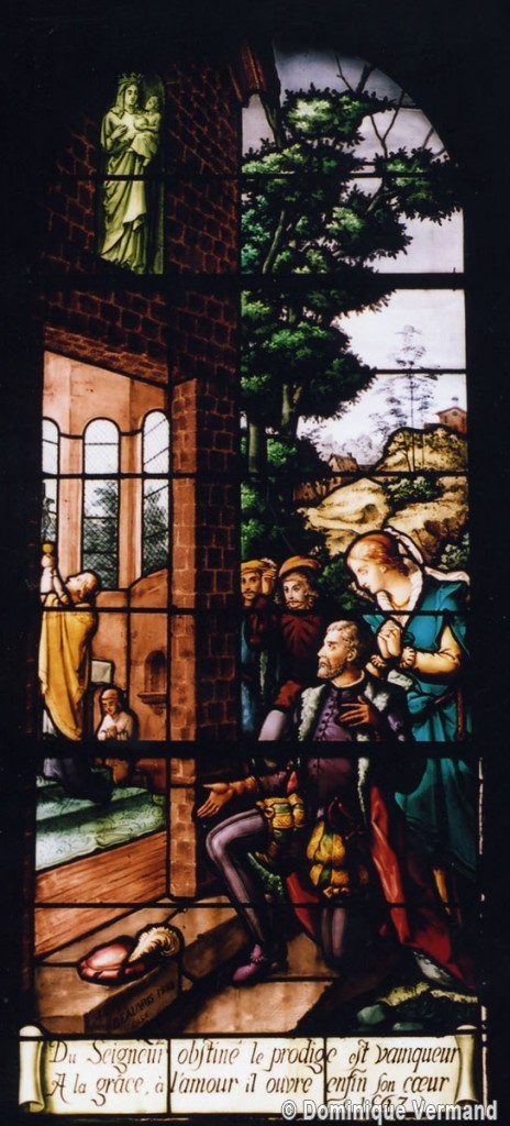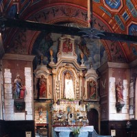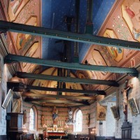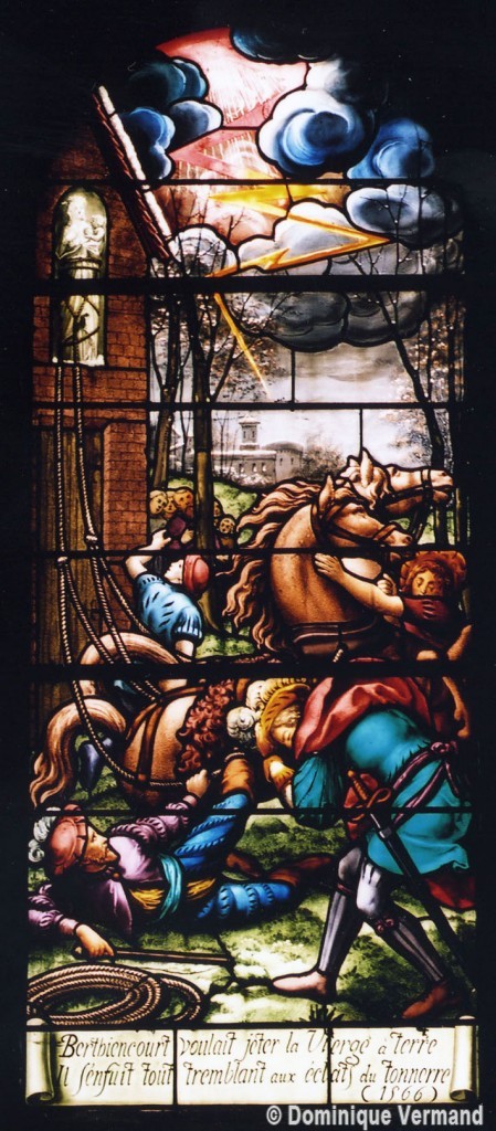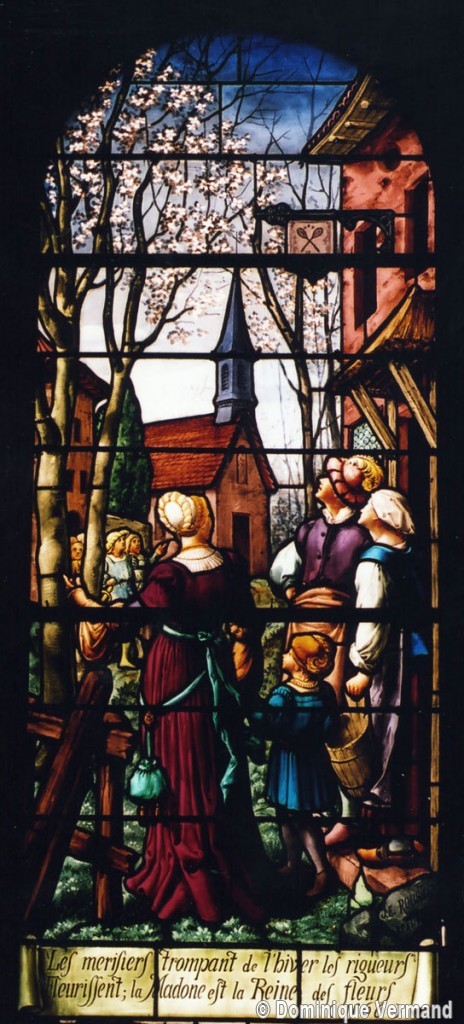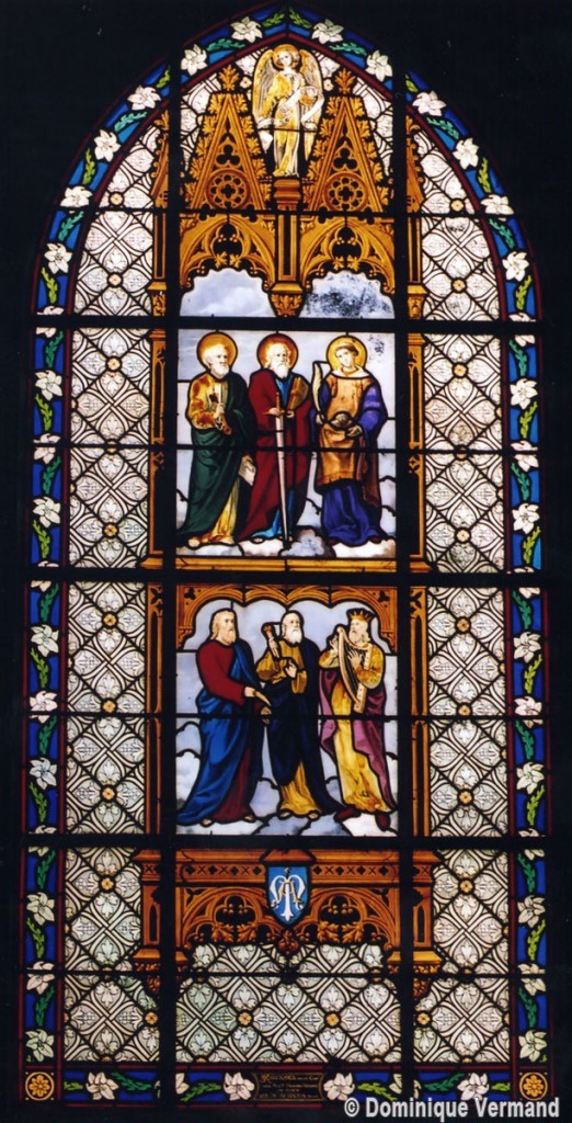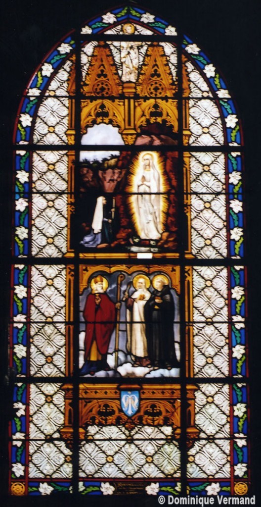 La moitié ouest de la nef et la chapelle qui la précède et abrite la statue de la Vierge miraculeuse, sont plus récentes, toujours d’après la charpente. Les apports du 19ème siècle sont en revanche facilement identifiables : clocher porche en briques et grès surmonté d’un beffroi en charpente couverte d’ardoises et chapelles orientales – dédiées au Sacré Coeur et à saint Joseph – construites en 1878 à l’initiative du curé, A.V. Heu.