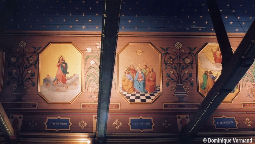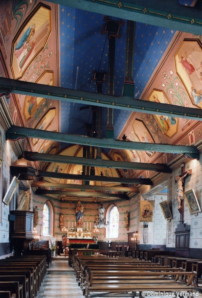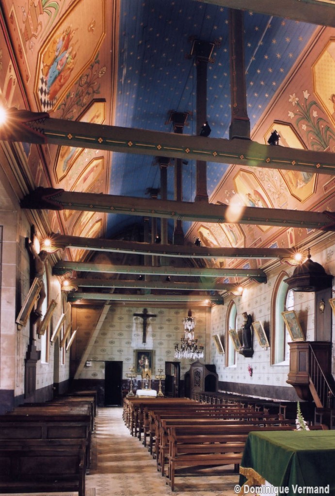 Entièrement refait au 19ème siècle, le décor peint de l’église est tout à fait remarquable, tout particulièrement à la charpente de la nef, où ont été représentés, par le frère Arthème, de l’Institut agricole de Beauvais, des épisodes de la Vie du Christ et des mystères du Rosaire dans un style qui rappelle les enluminures du Moyen Age. Il se complète de six vitraux de Roussel (1878) sur des thèmes divers.