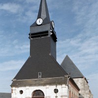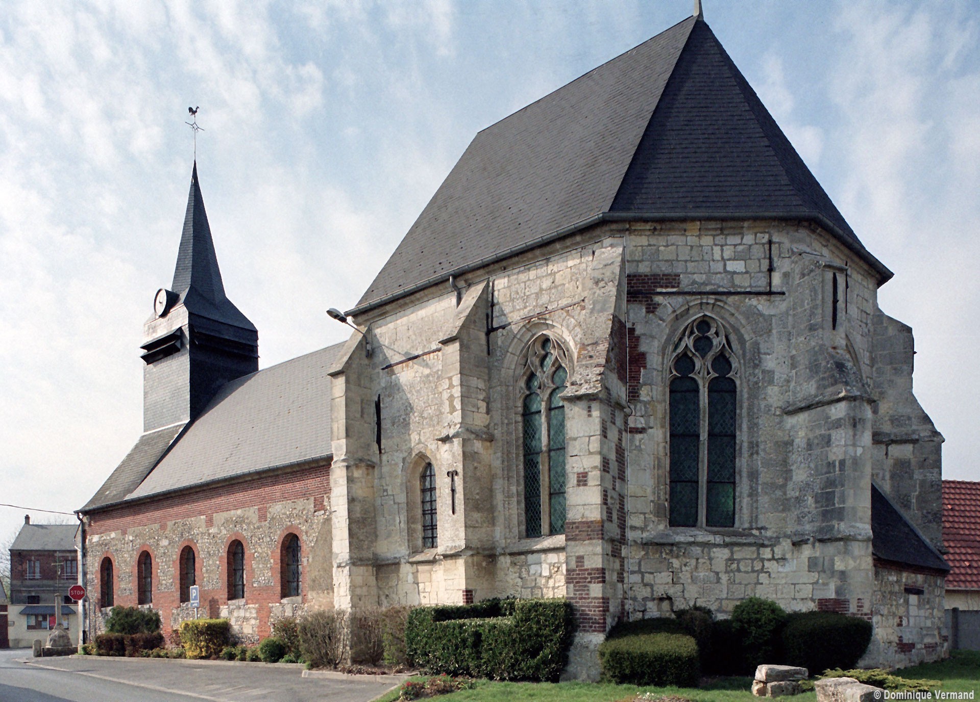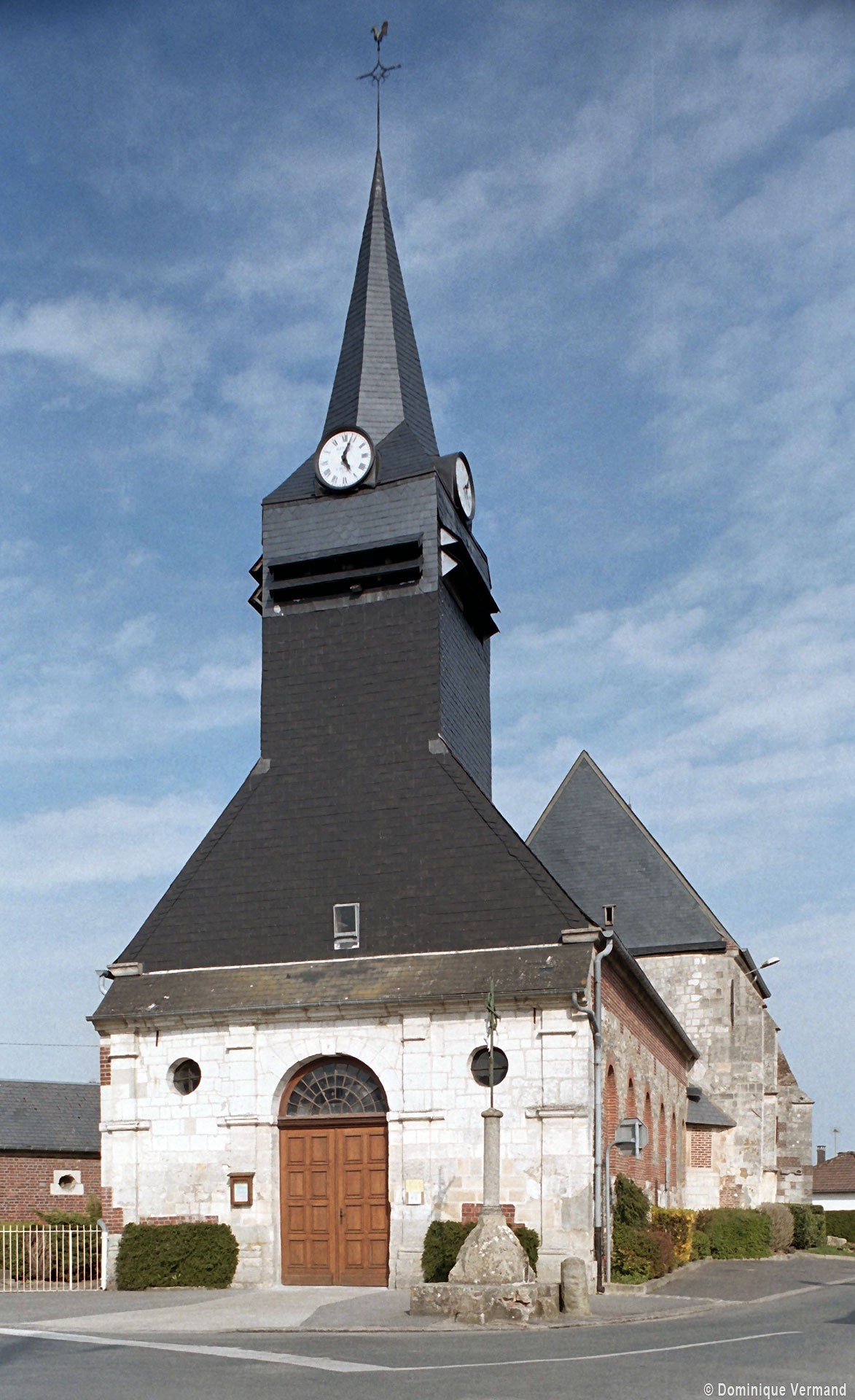 Saint-Laurent montre la silhouette, caractéristique en Picardie, d’un chœur de la fin du gothique dominant la nef. D’origine romane comme le montre encore partiellement le mur nord avec ses petites pierres disposées régulièrement, cette dernière a été réparée à de nombreuses reprises. Mélangeant la pierre, le silex et la brique, le mur méridional appartient principalement aux 18ème et 19ème siècles tandis que la façade est de 1791, une période pourtant peu propice aux constructions religieuses. Surmontée d’un haut clocher en charpente et appareillée avec soin, elle est scandée par quatre pilastres encadrant le portail central et deux oculi.