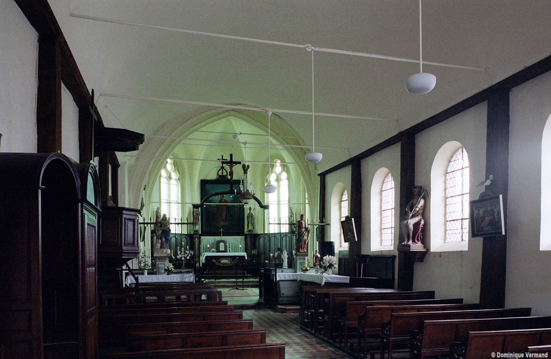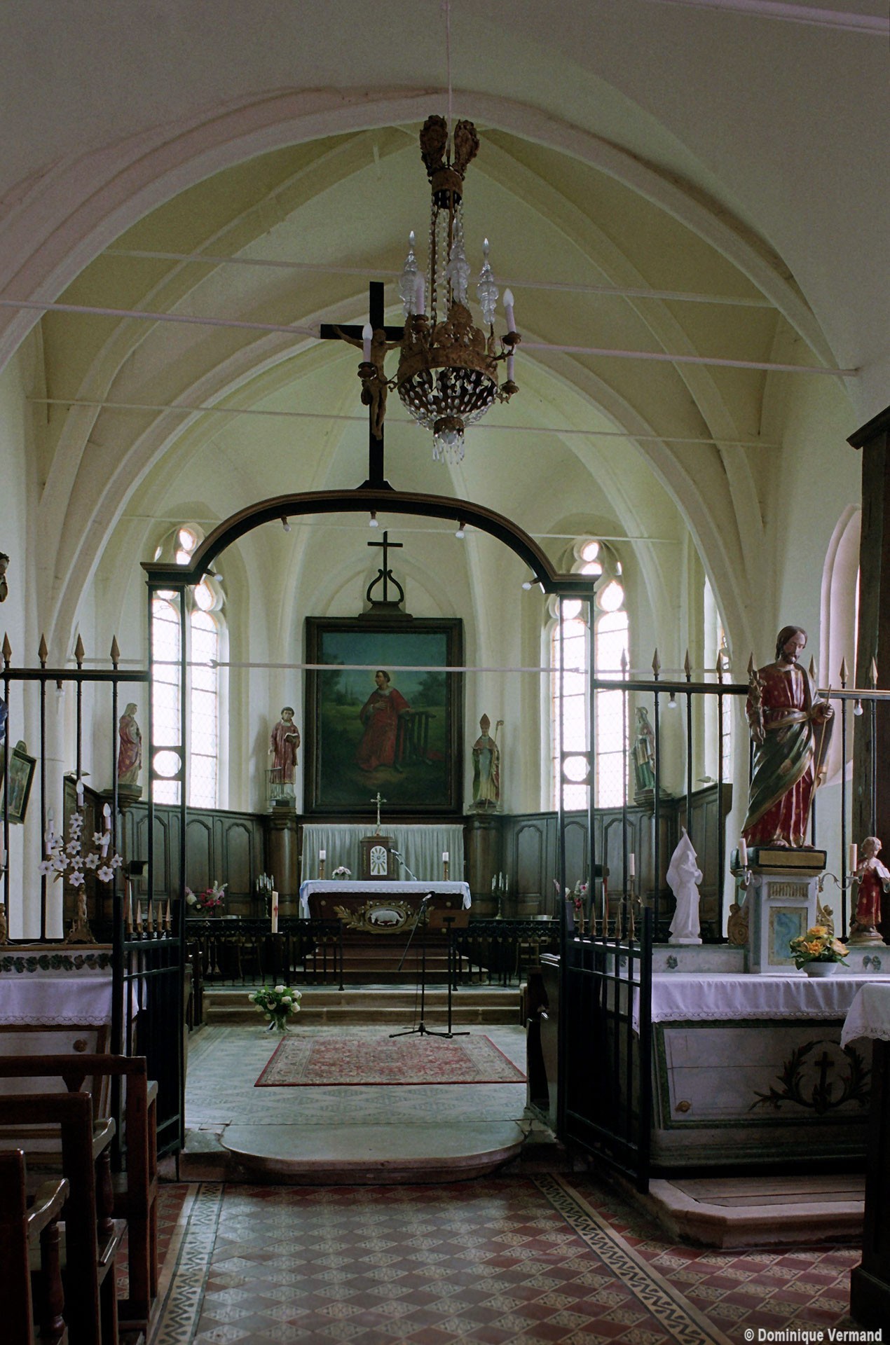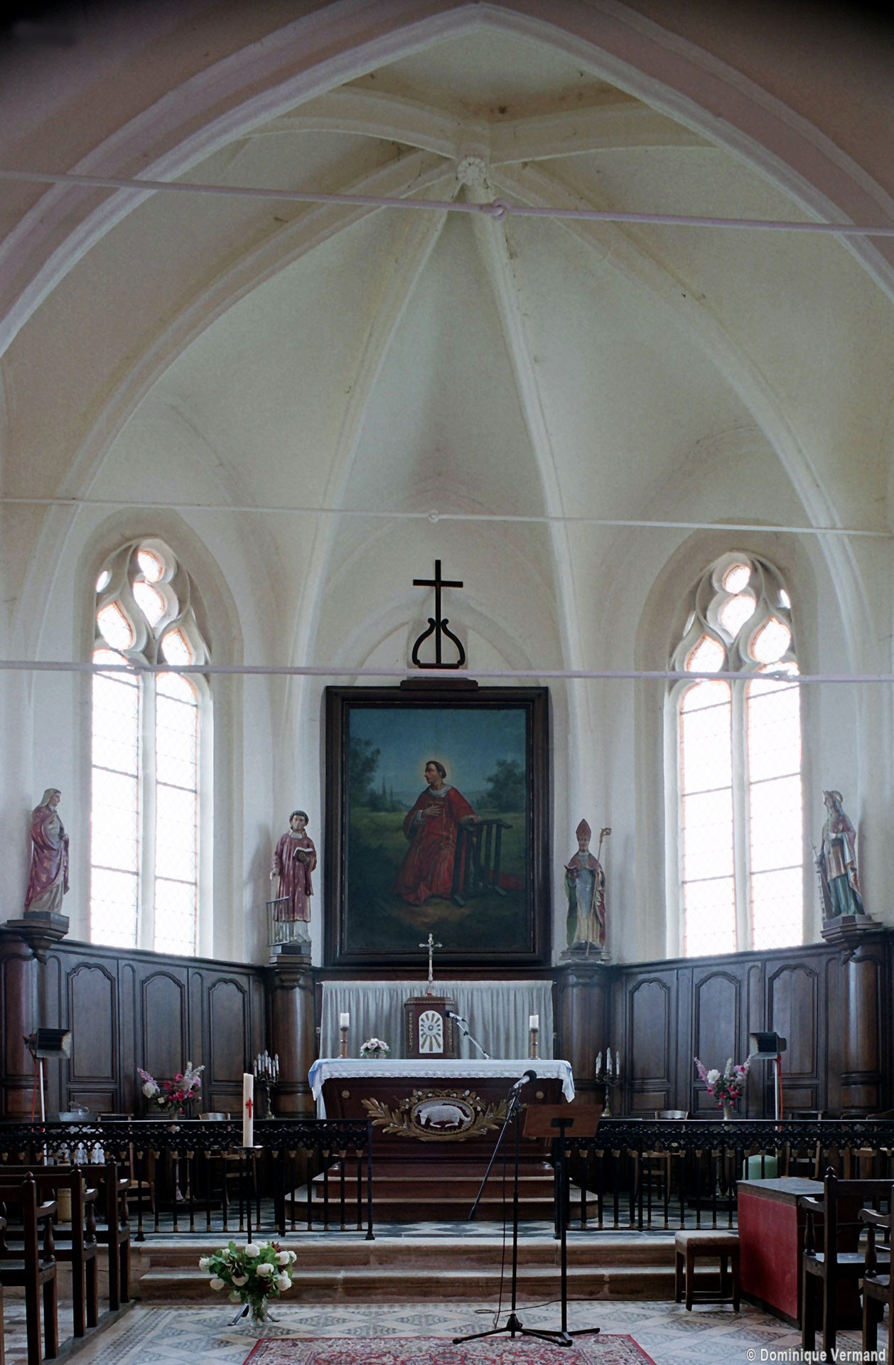 A l’intérieur, la charpente retombe sur des poutres en bois disposées le long des murs afin de ne pas solliciter directement ces derniers. Le chœur est constitué d’une travée droite et d’une abside à cinq côtés. Il est voûté d’ogives qui retombent directement par pénétration dans les murs. Les fenêtres qui l’ajoure sont, soit de simples lancettes, soit constituées d’un réseau flamboyant. Très simple dans sa conception comme dans sa réalisation, ce type de chœur se retrouve à de très nombreux exemplaires dans la région picarde.
