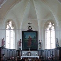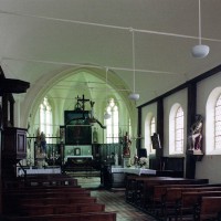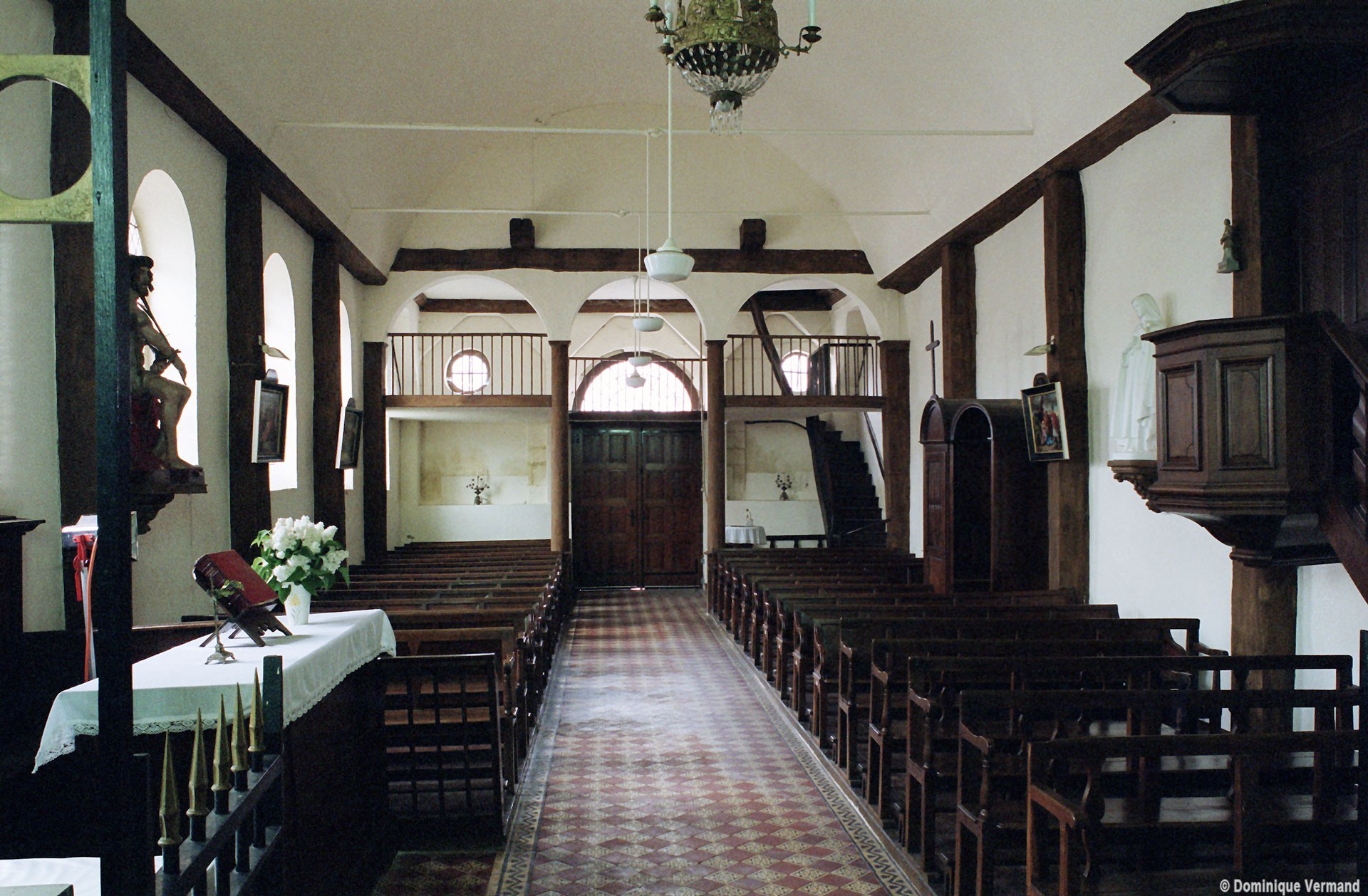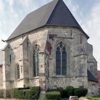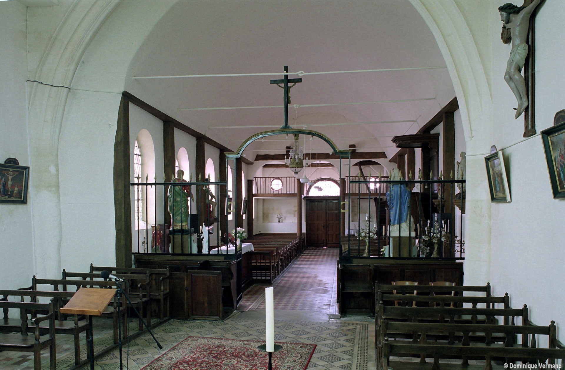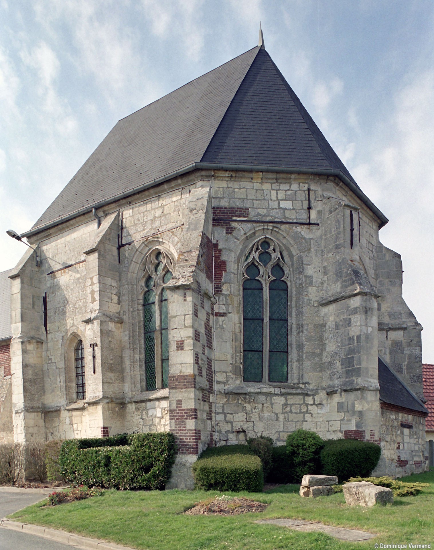A l’intérieur, la charpente retombe sur des poutres en bois disposées le long des murs afin de ne pas solliciter directement ces derniers. Le chœur est constitué d’une travée droite et d’une abside à cinq côtés. Il est voûté d’ogives qui retombent directement par pénétration dans les murs. Les fenêtres qui l’ajoure sont, soit de simples lancettes, soit constituées d’un réseau flamboyant. Très simple dans sa conception comme dans sa réalisation, ce type de chœur se retrouve à de très nombreux exemplaires dans la région picarde.