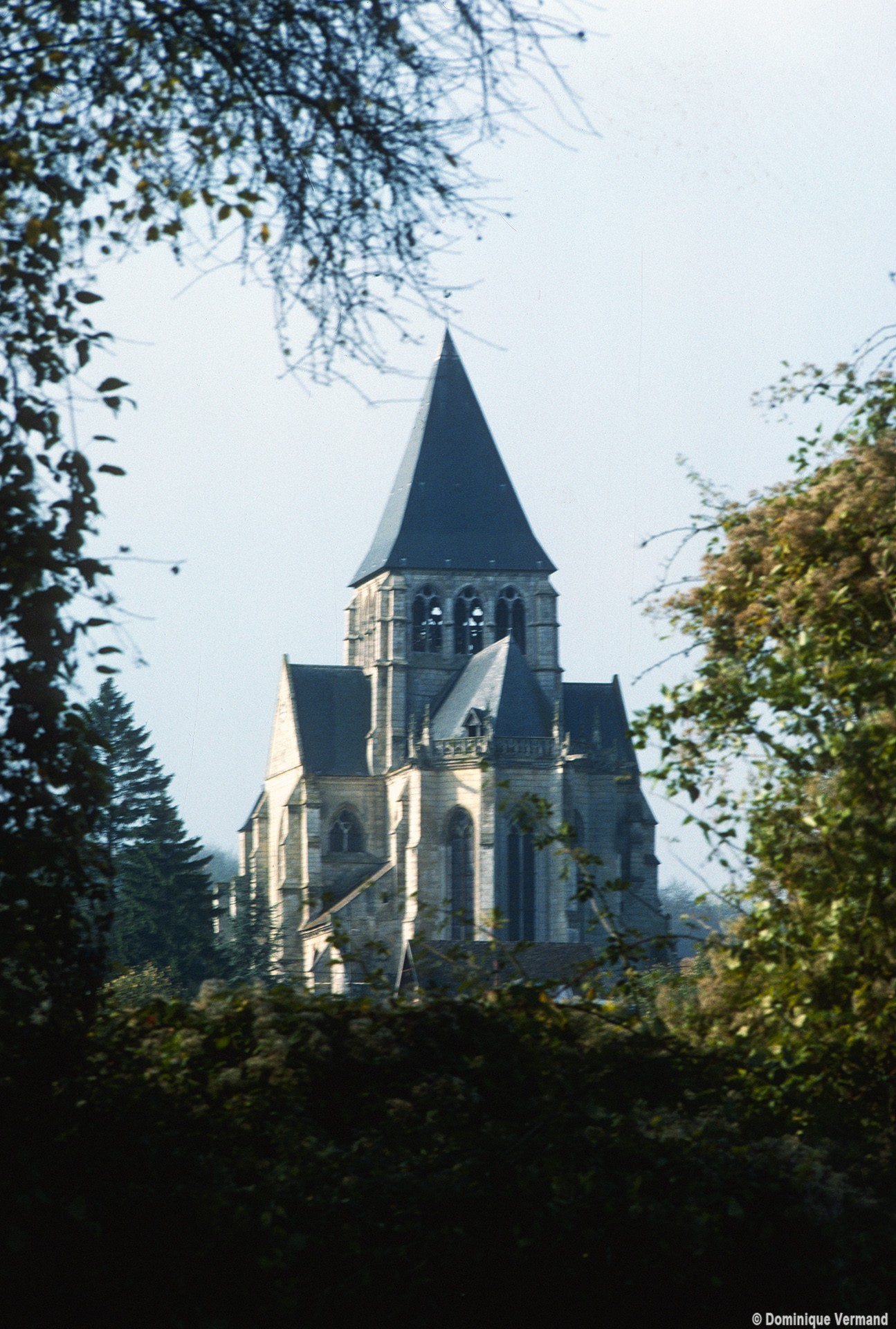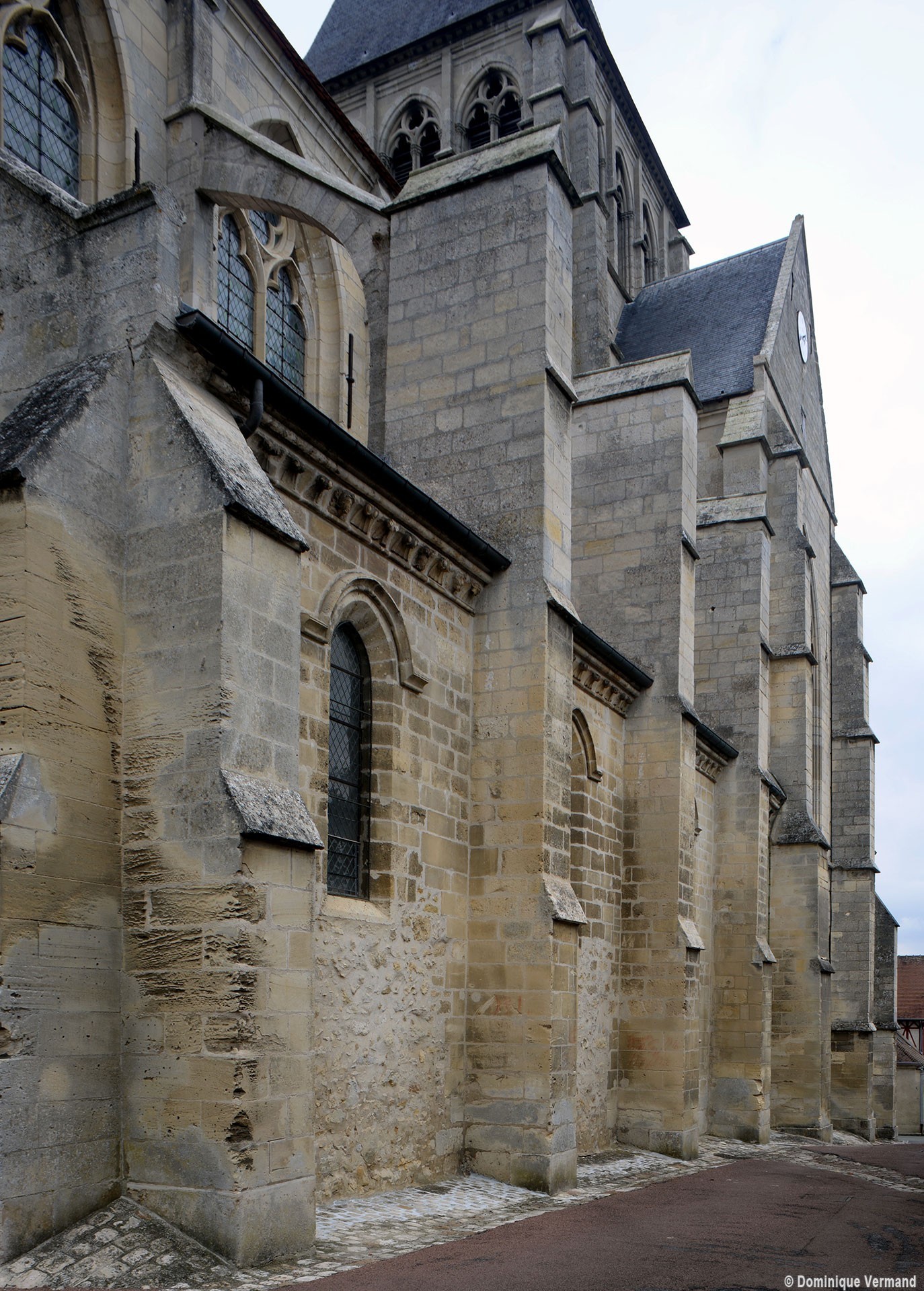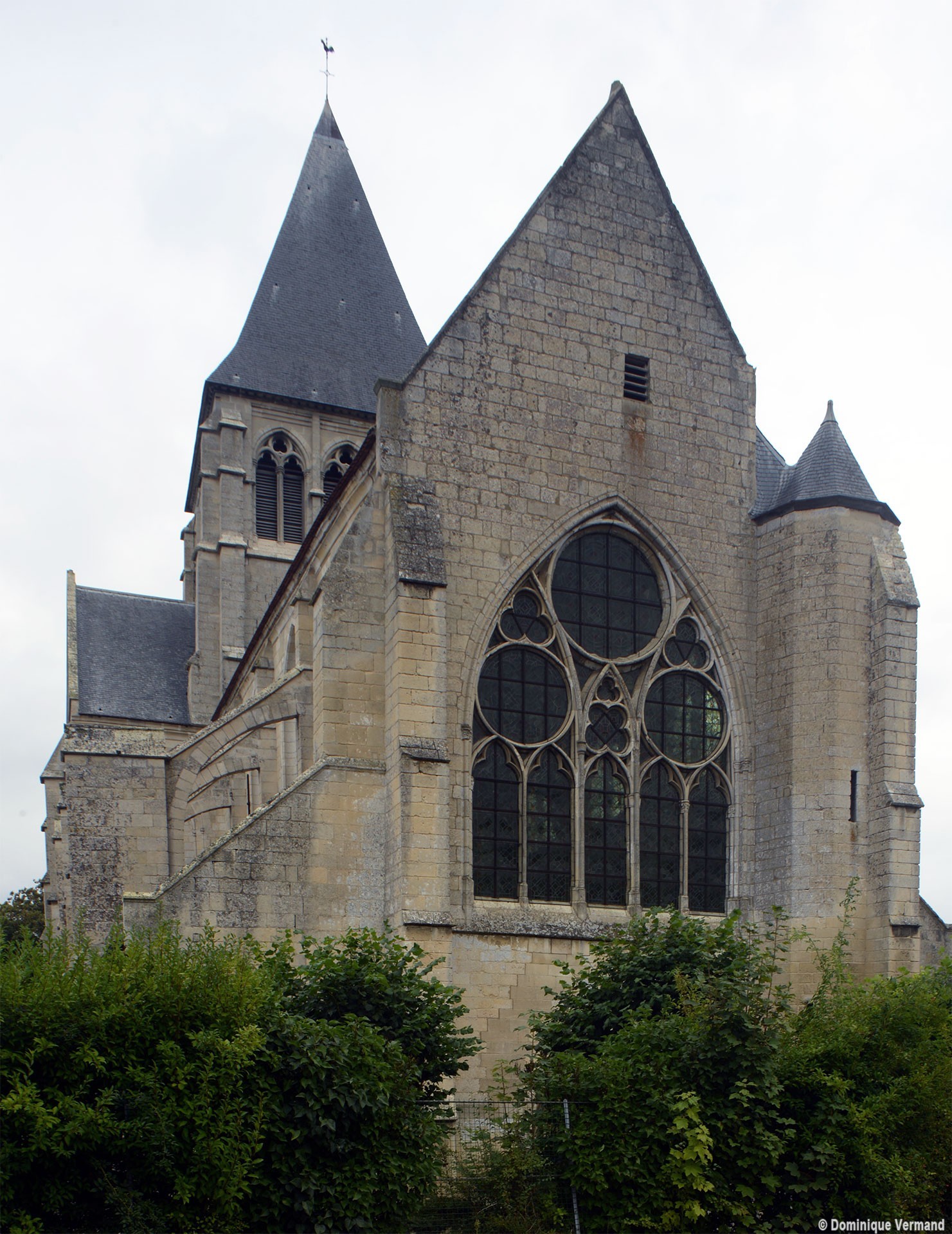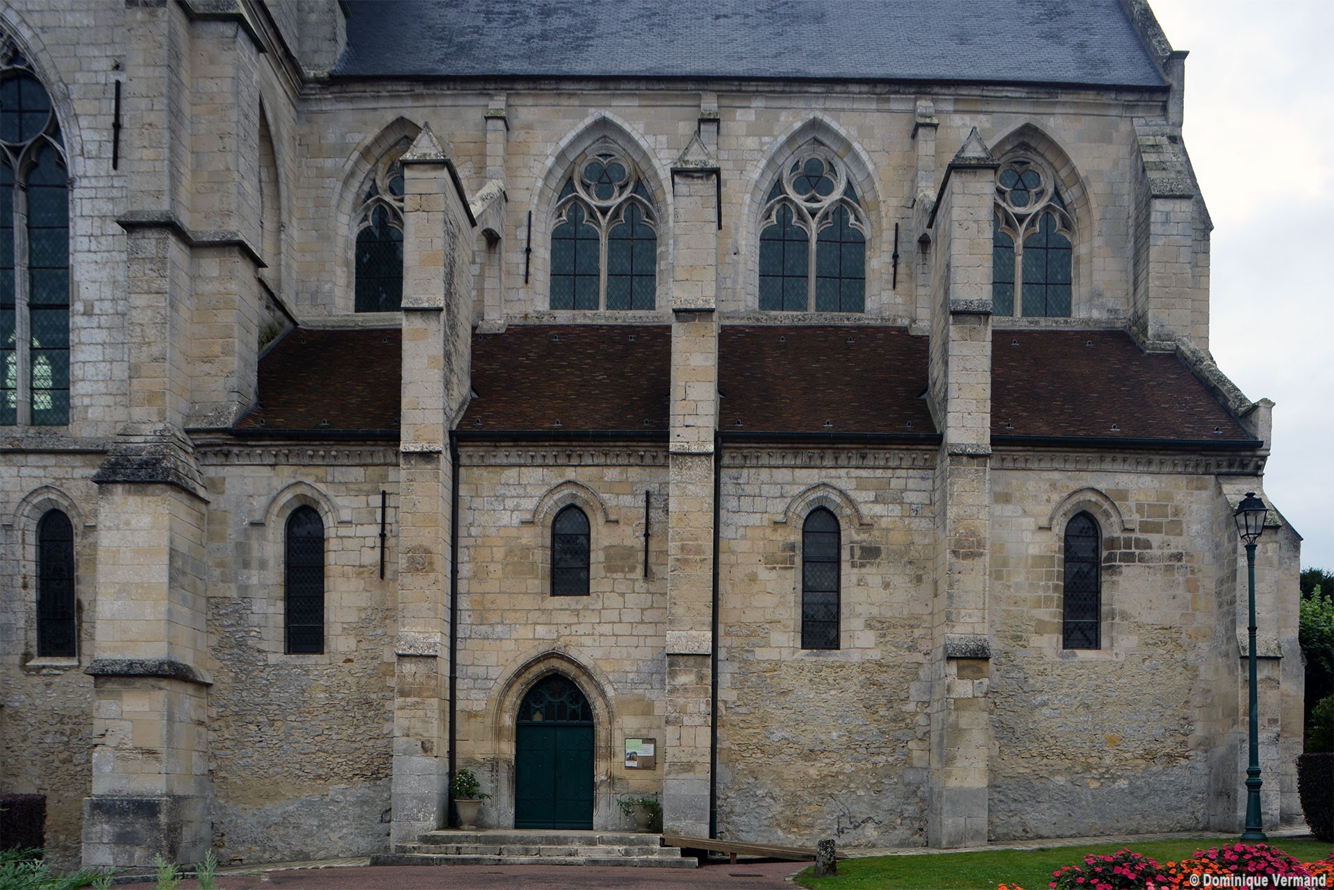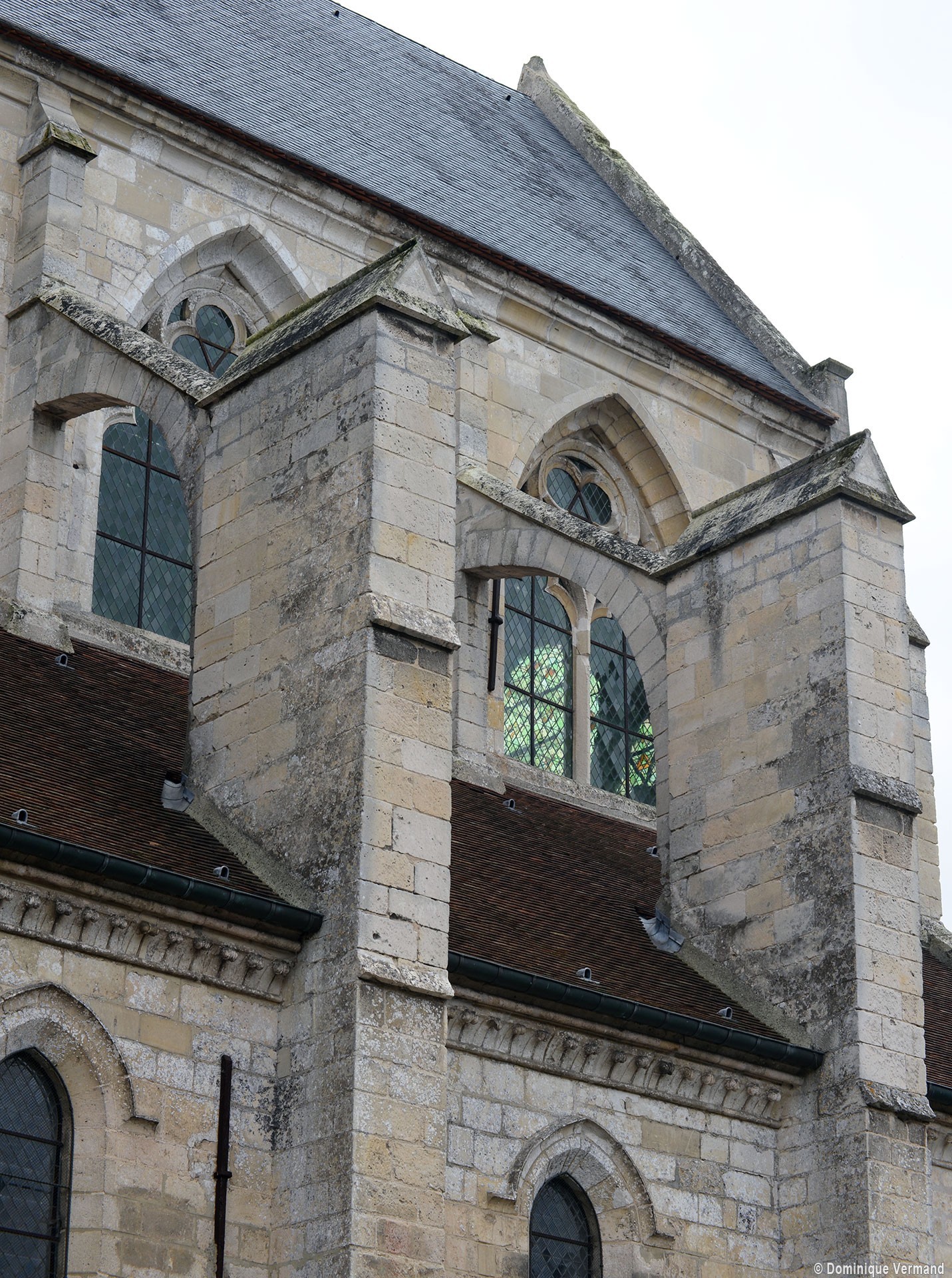 Une immense fenêtre au complexe et magnifique réseau rayonnant – dont la composition rappelle celle du chevet de Nointel – occupe, en façade, toute la largeur de la nef. Elle contraste avec le discret portail qui, séparé d’elle par un feston d’arcatures aveugles, s’ouvre au-dessous. Comme dans les grands édifices, des arcs-boutants épaulent, à l’extérieur, le vaisseau central. Le transept non saillant, éclairé au nord et au sud par deux grandes fenêtres rayonnantes, et la partie droite du chœur, accostée de bas-côtés, appartiennent également au 13ème siècle.