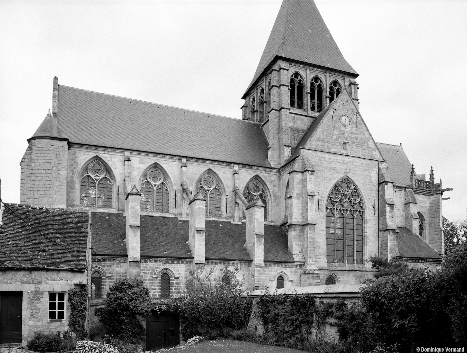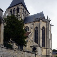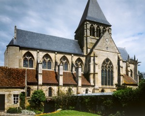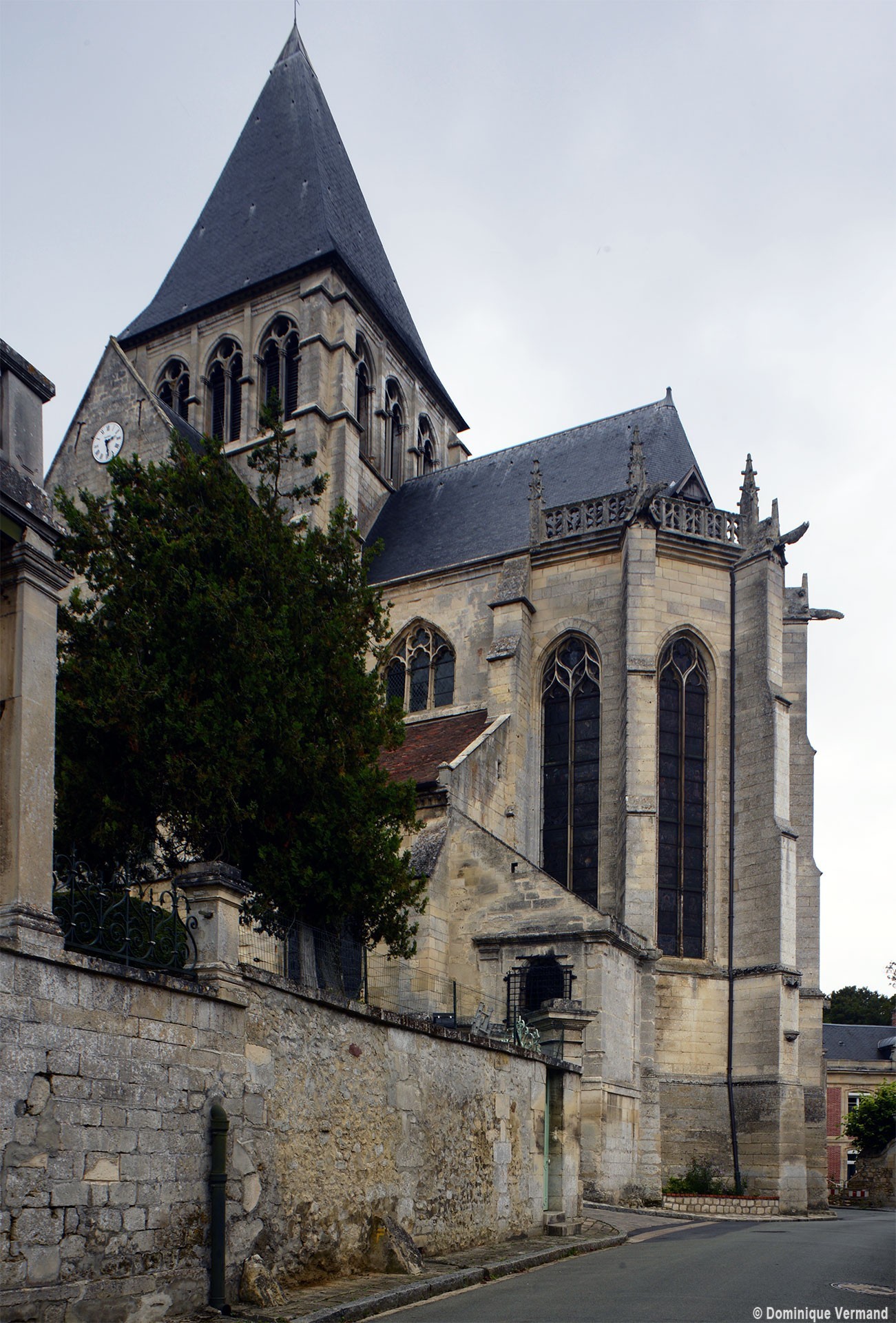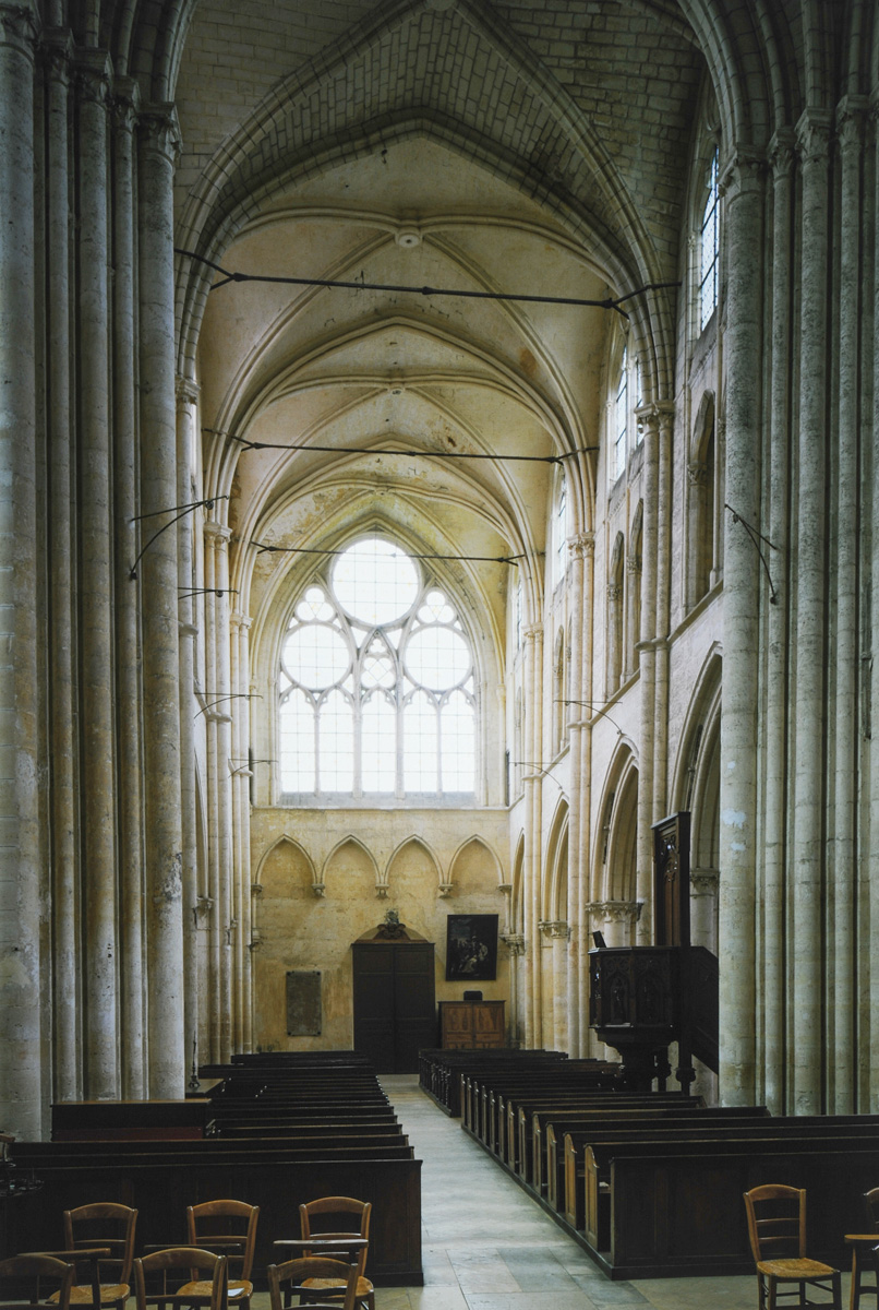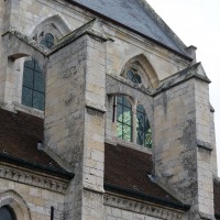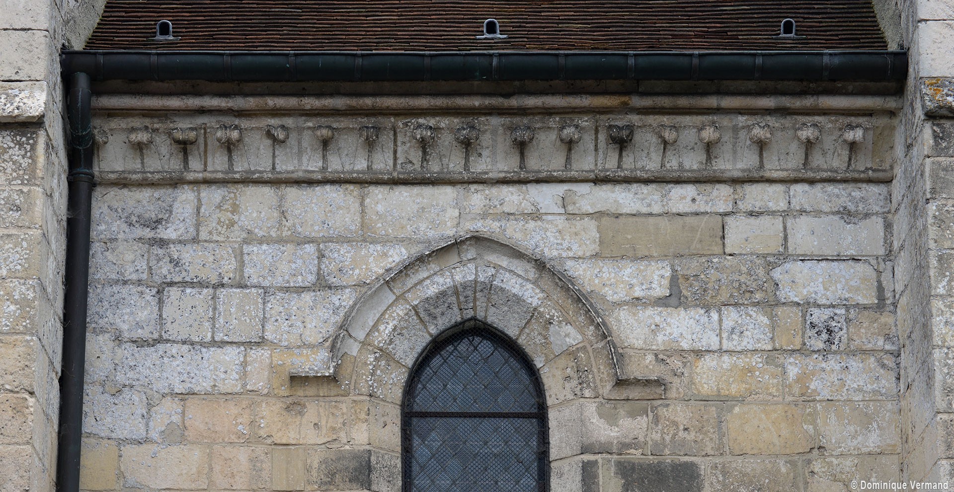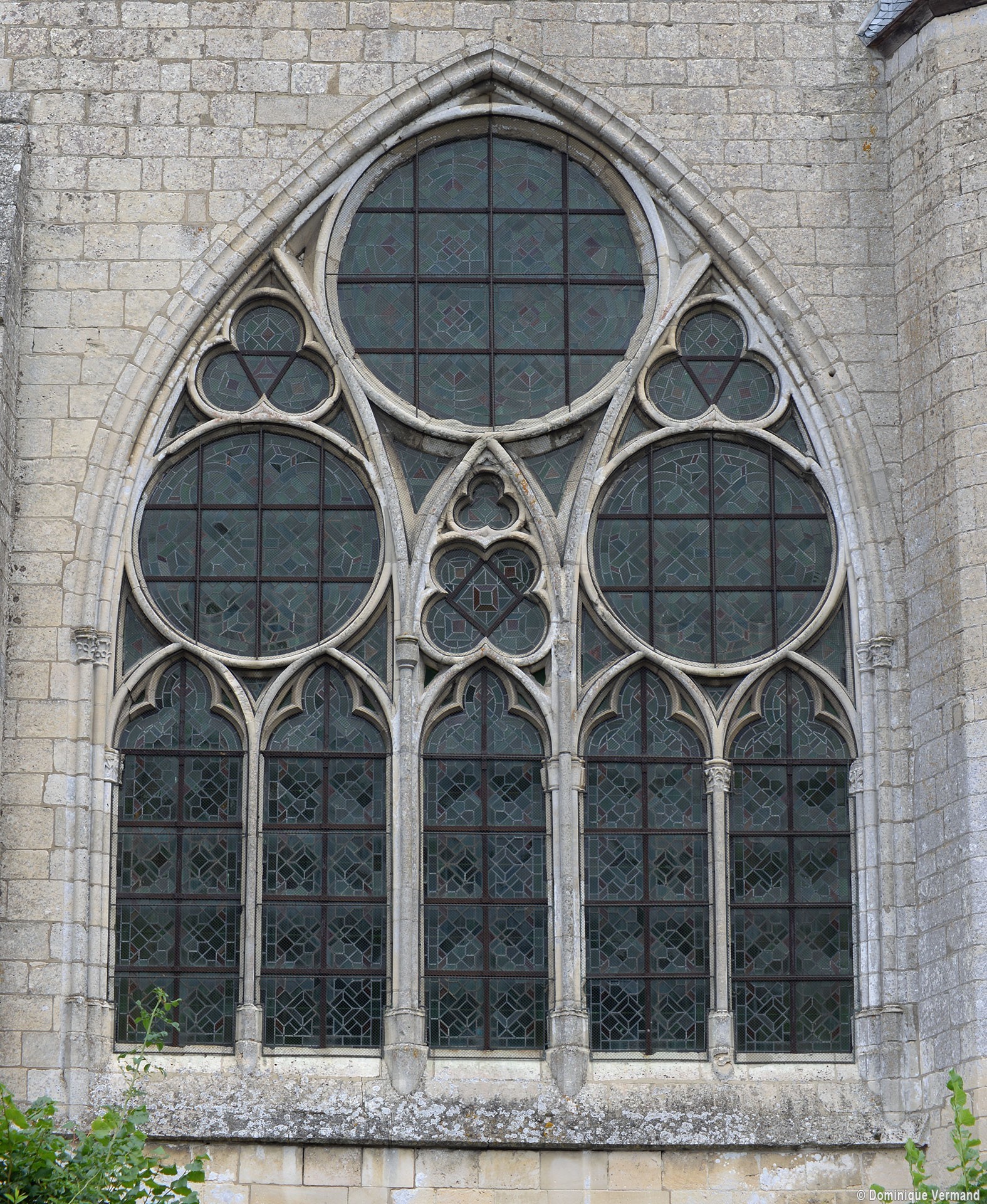 Une immense fenêtre au complexe et magnifique réseau rayonnant – dont la composition rappelle celle du chevet de Nointel – occupe, en façade, toute la largeur de la nef. Elle contraste avec le discret portail qui, séparé d’elle par un feston d’arcatures aveugles, s’ouvre au-dessous. Comme dans les grands édifices, des arcs-boutants épaulent, à l’extérieur, le vaisseau central. Le transept non saillant, éclairé au nord et au sud par deux grandes fenêtres rayonnantes, et la partie droite du chœur, accostée de bas-côtés, appartiennent également au 13ème siècle.