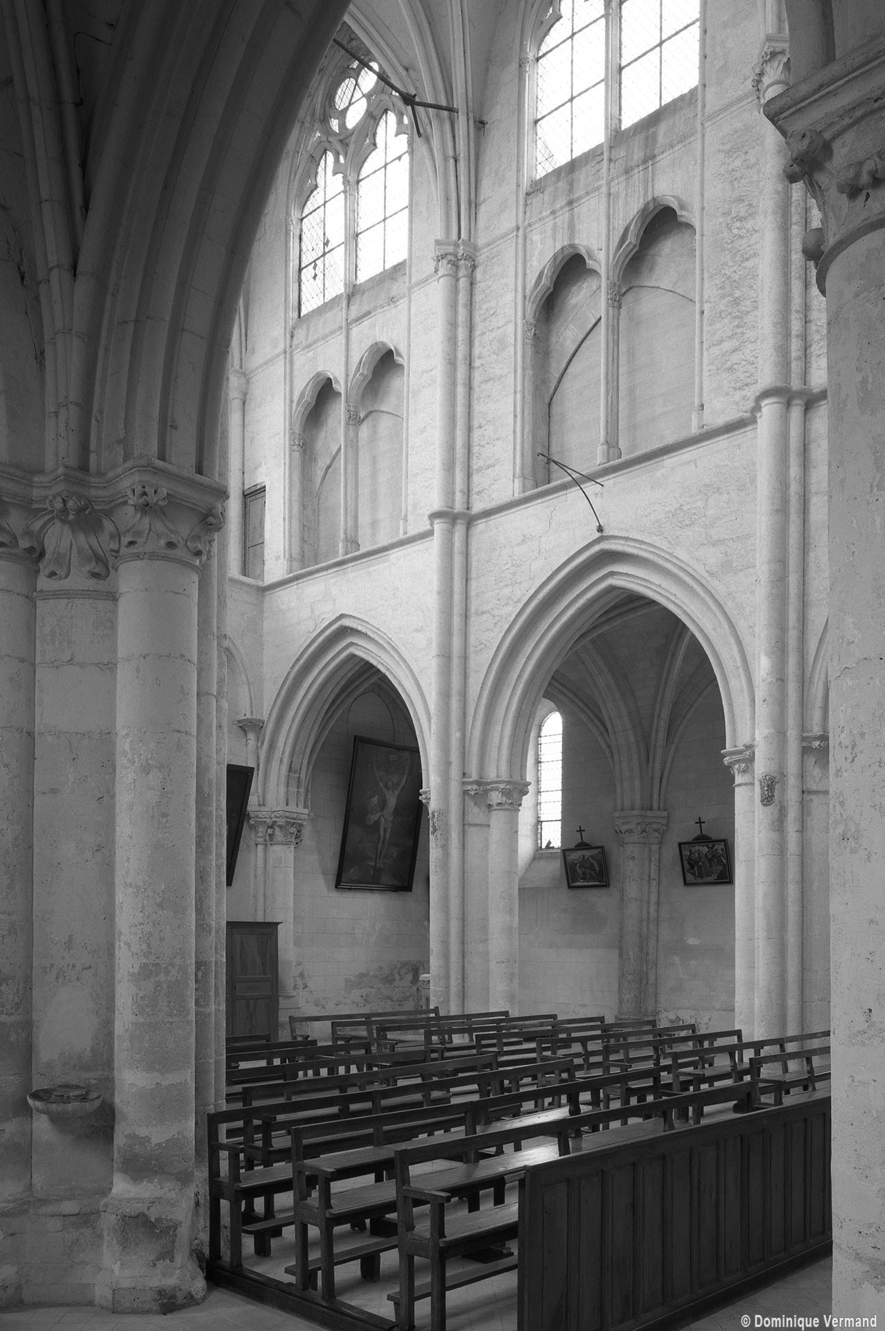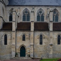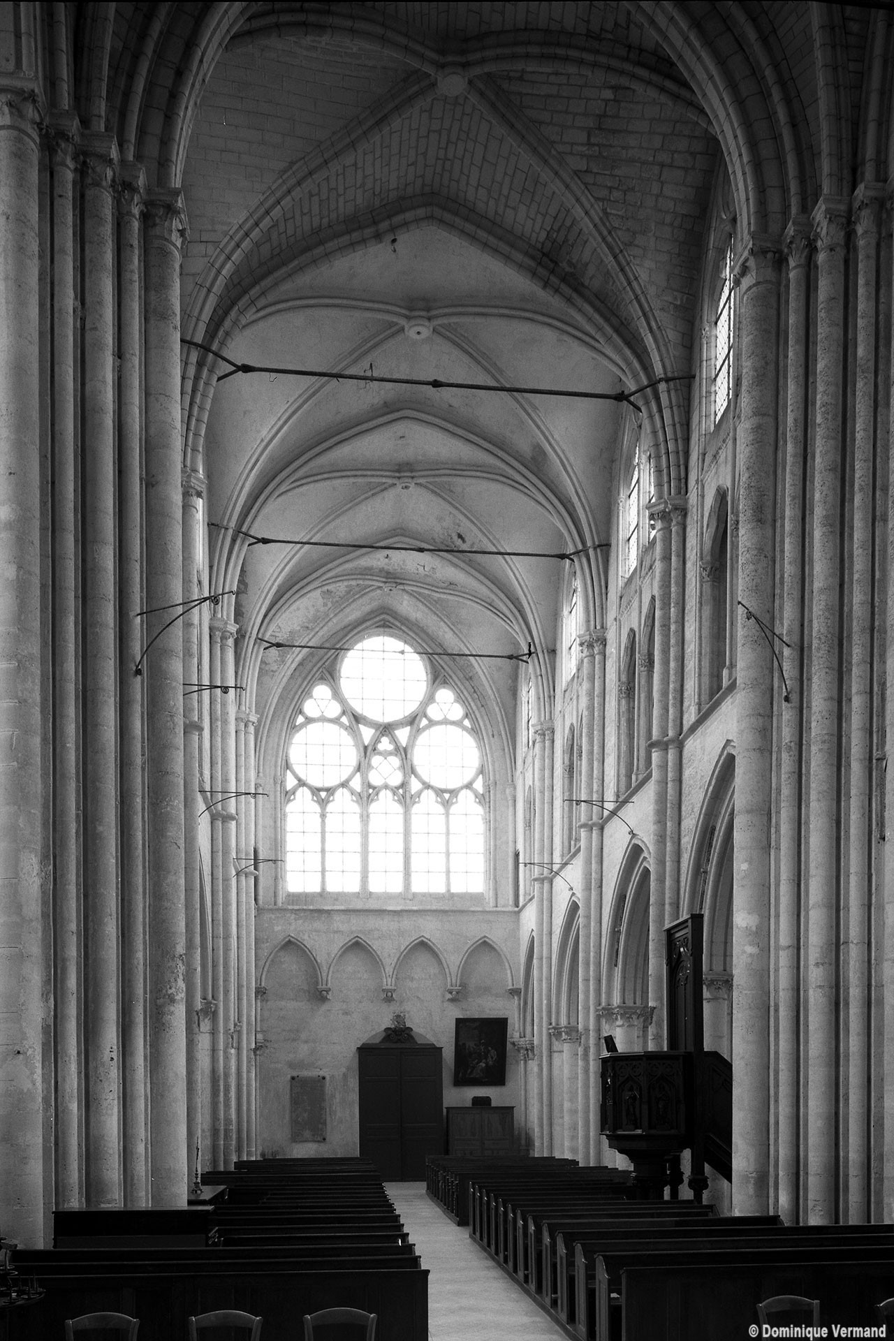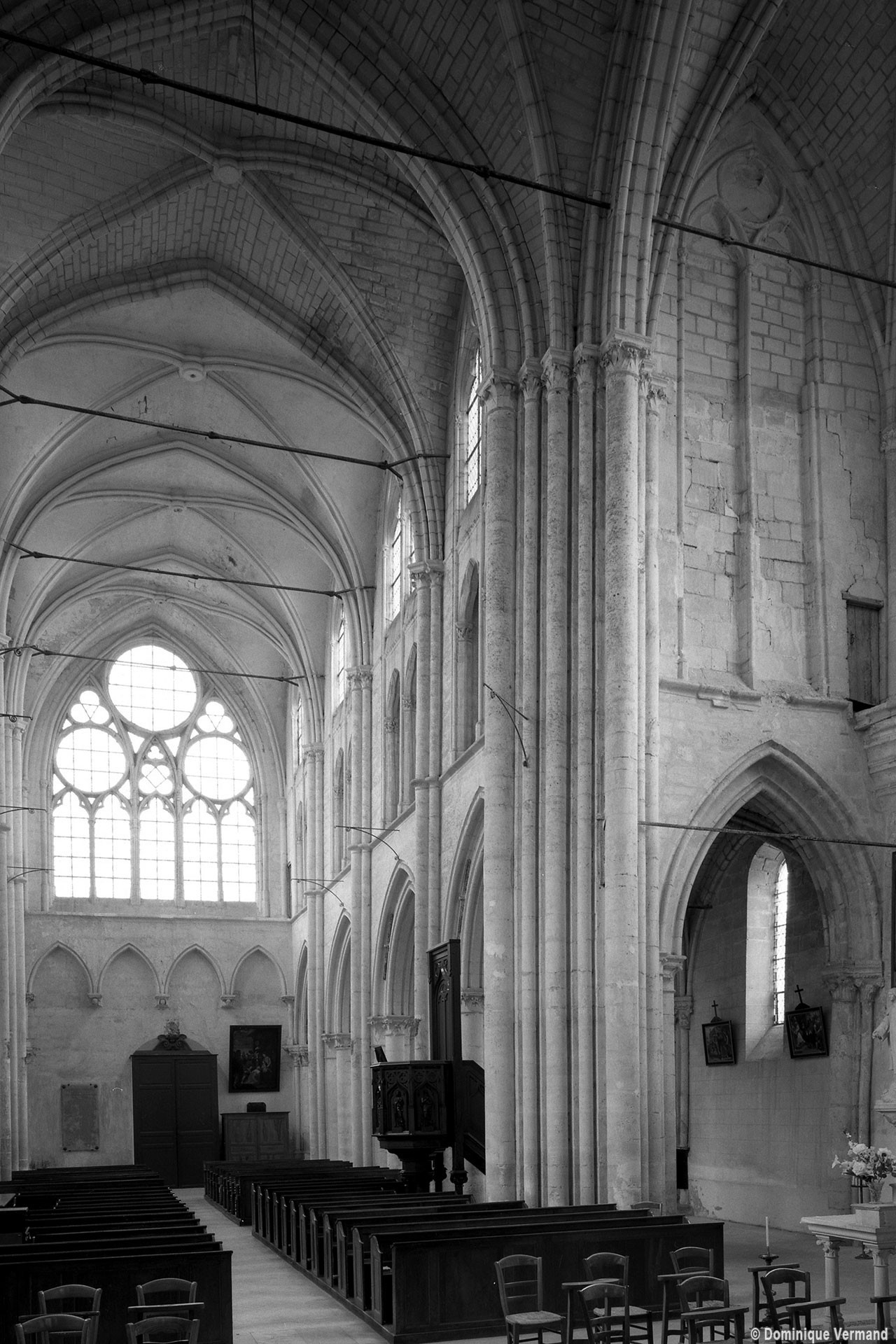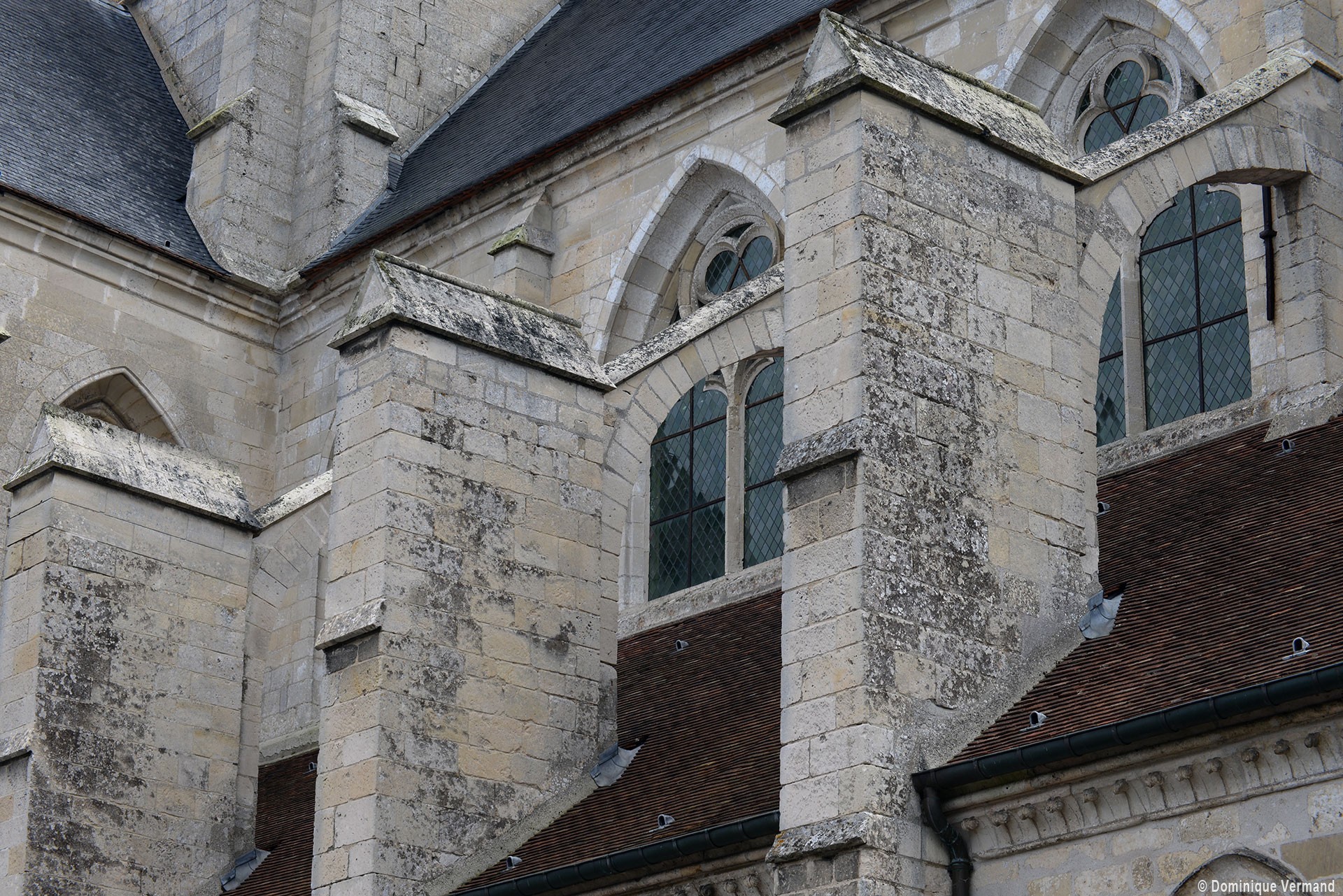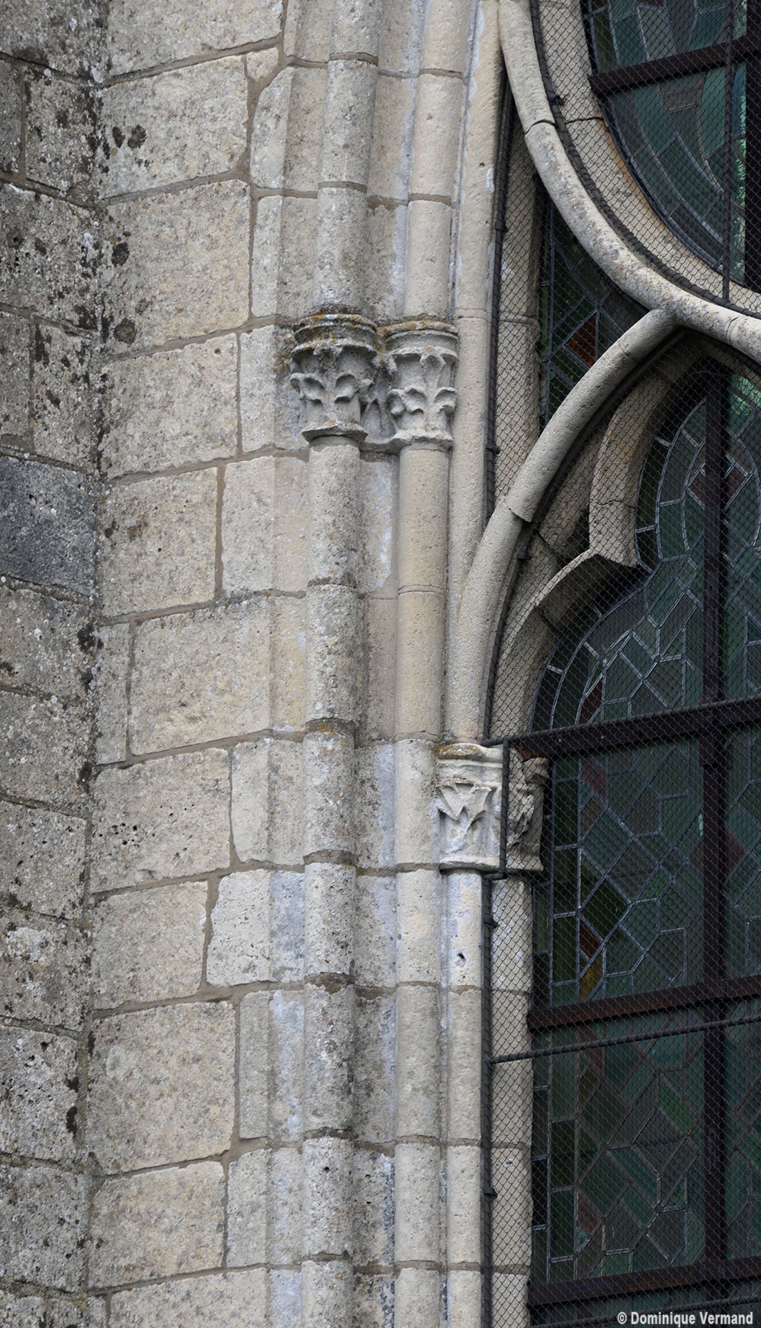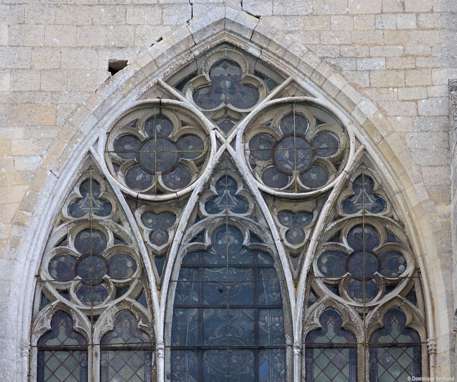 Une immense fenêtre au complexe et magnifique réseau rayonnant – dont la composition rappelle celle du chevet de Nointel – occupe, en façade, toute la largeur de la nef. Elle contraste avec le discret portail qui, séparé d’elle par un feston d’arcatures aveugles, s’ouvre au-dessous. Comme dans les grands édifices, des arcs-boutants épaulent, à l’extérieur, le vaisseau central. Le transept non saillant, éclairé au nord et au sud par deux grandes fenêtres rayonnantes, et la partie droite du chœur, accostée de bas-côtés, appartiennent également au 13ème siècle.