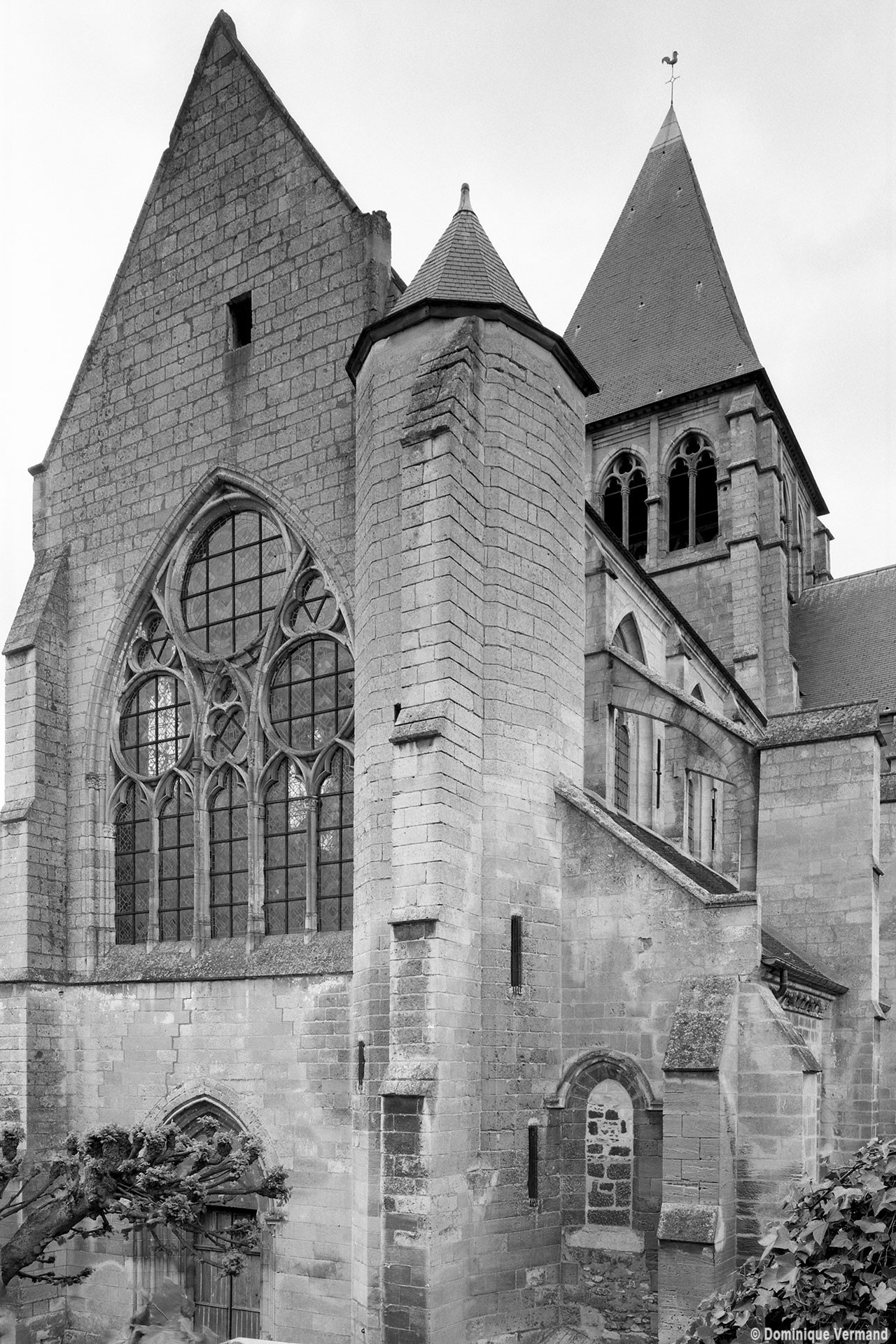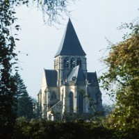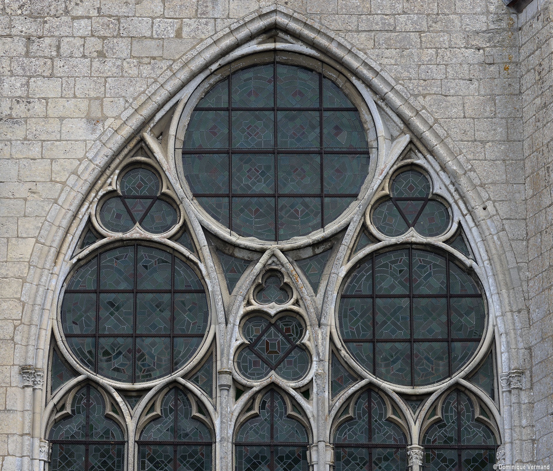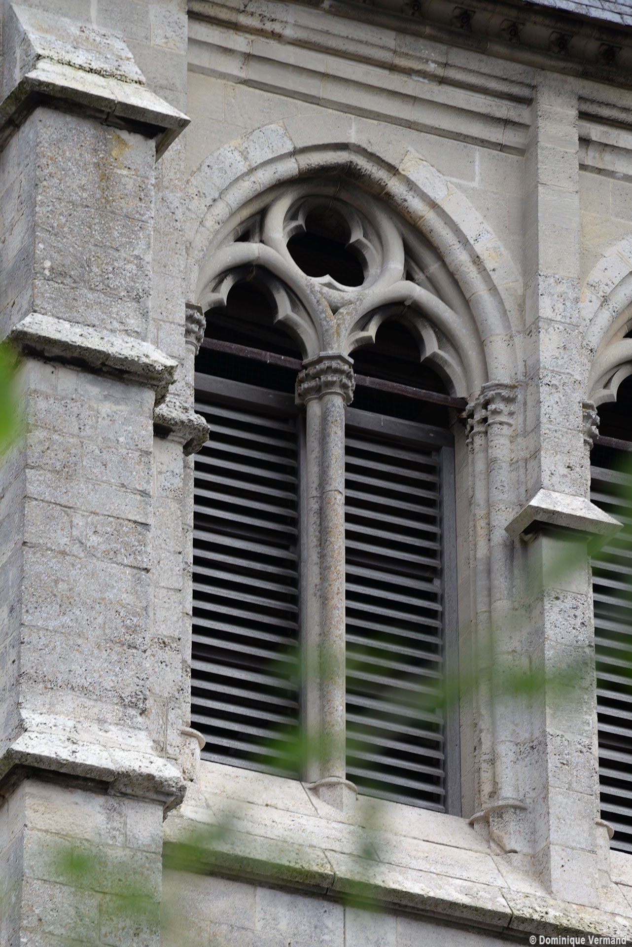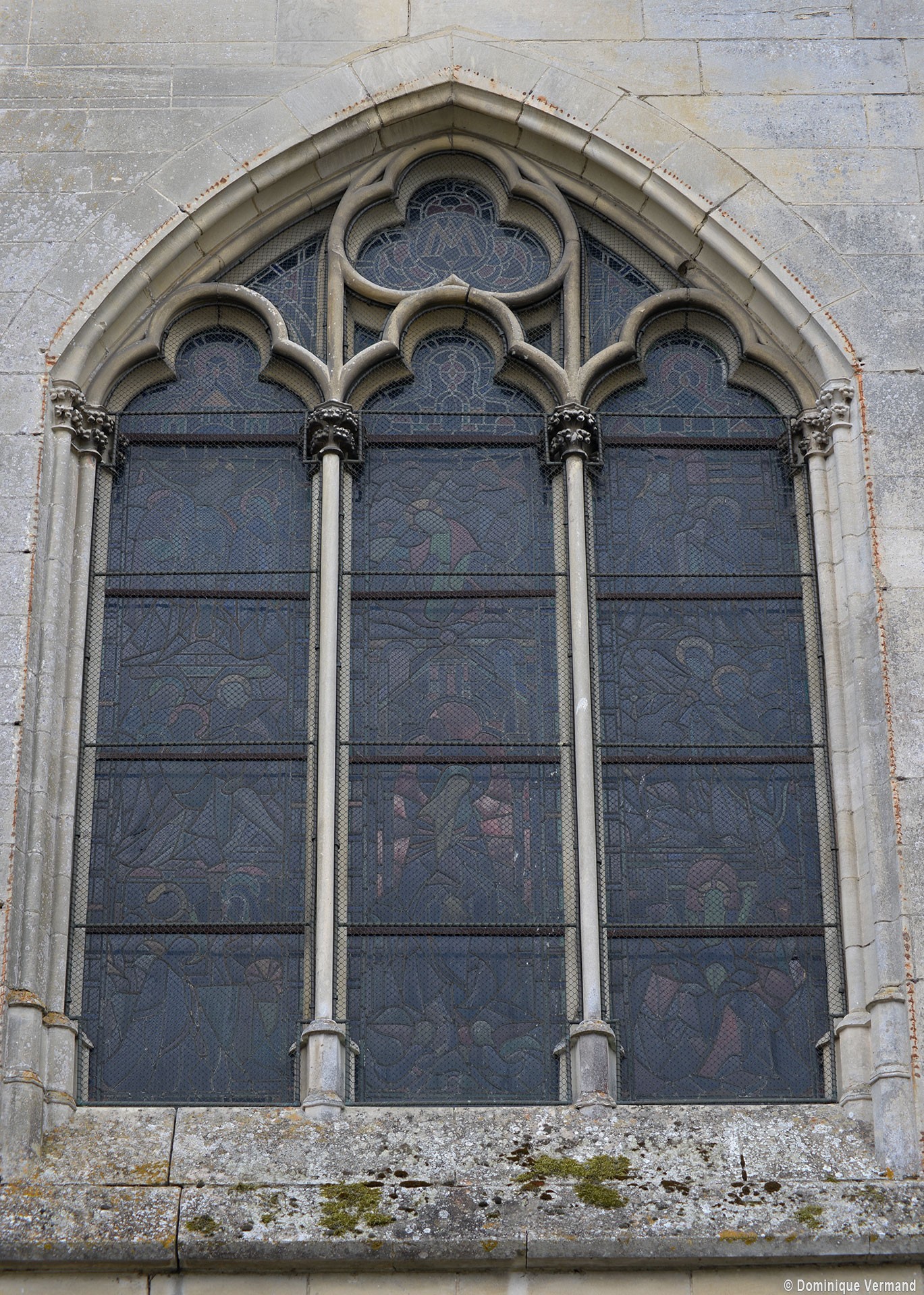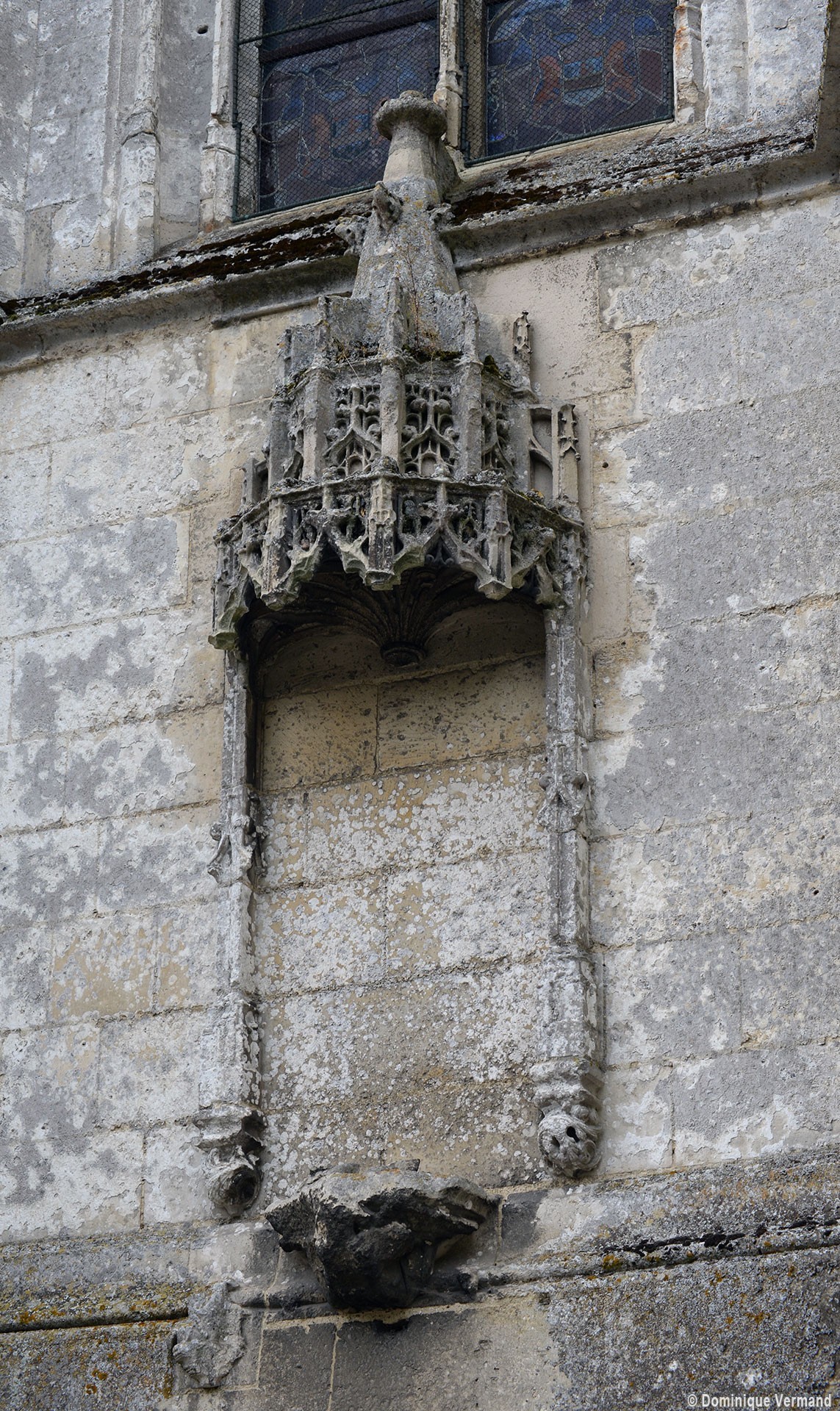 Une immense fenêtre au complexe et magnifique réseau rayonnant – dont la composition rappelle celle du chevet de Nointel – occupe, en façade, toute la largeur de la nef. Elle contraste avec le discret portail qui, séparé d’elle par un feston d’arcatures aveugles, s’ouvre au-dessous. Comme dans les grands édifices, des arcs-boutants épaulent, à l’extérieur, le vaisseau central. Le transept non saillant, éclairé au nord et au sud par deux grandes fenêtres rayonnantes, et la partie droite du chœur, accostée de bas-côtés, appartiennent également au 13ème siècle.