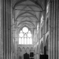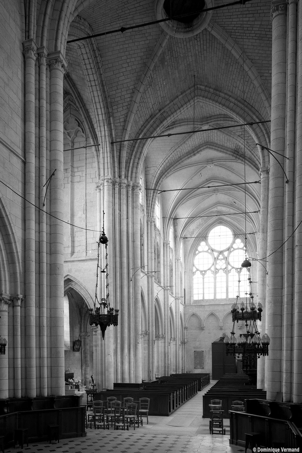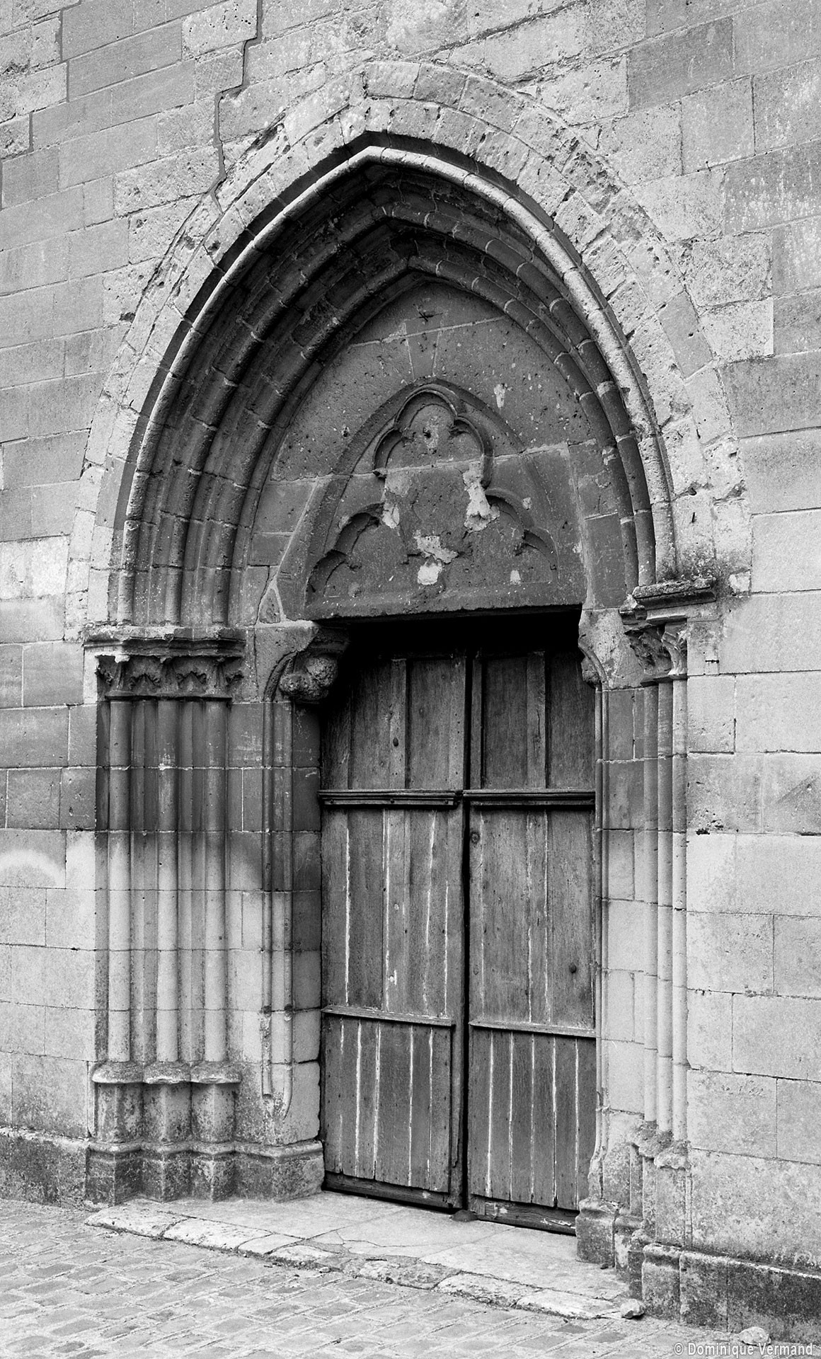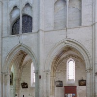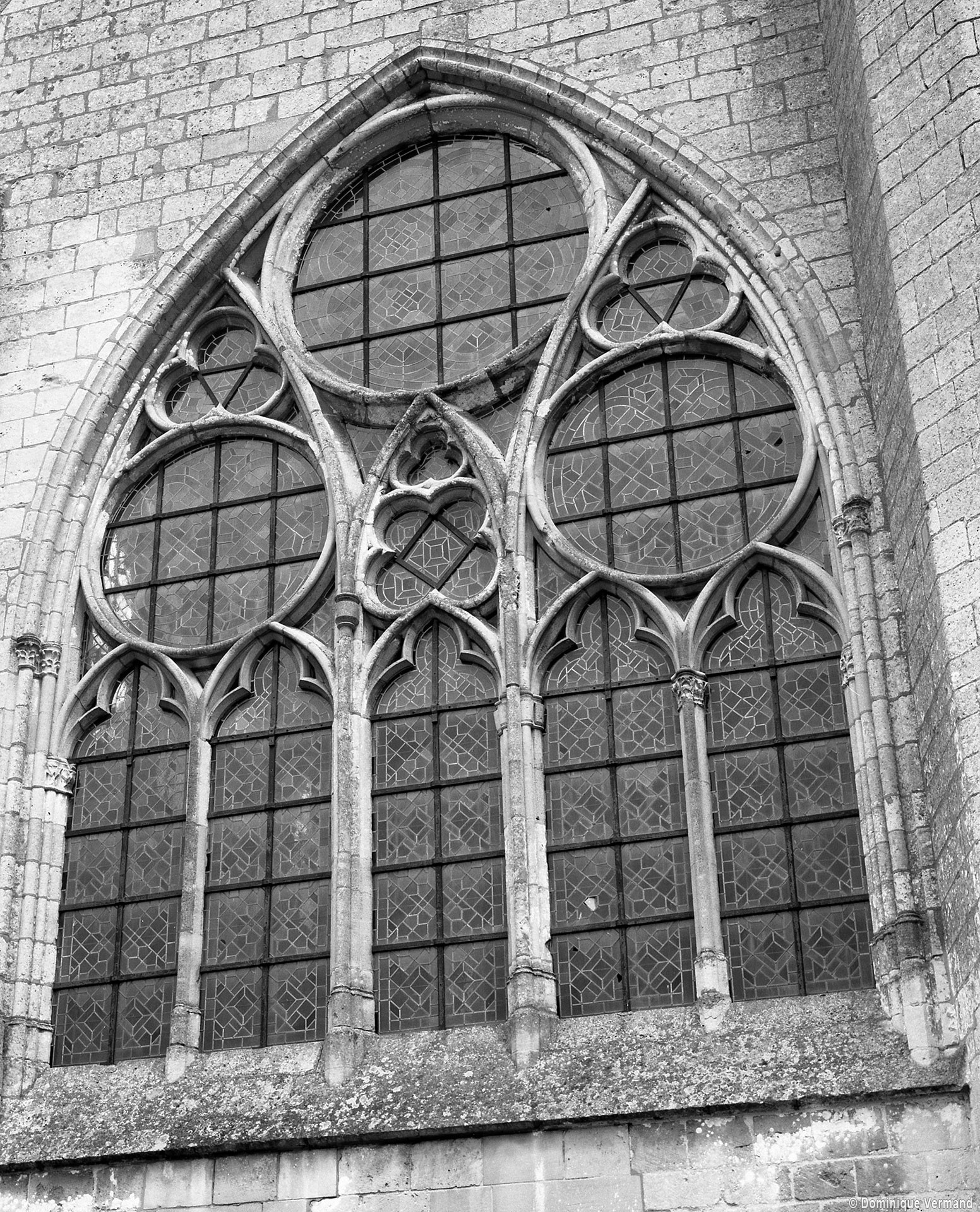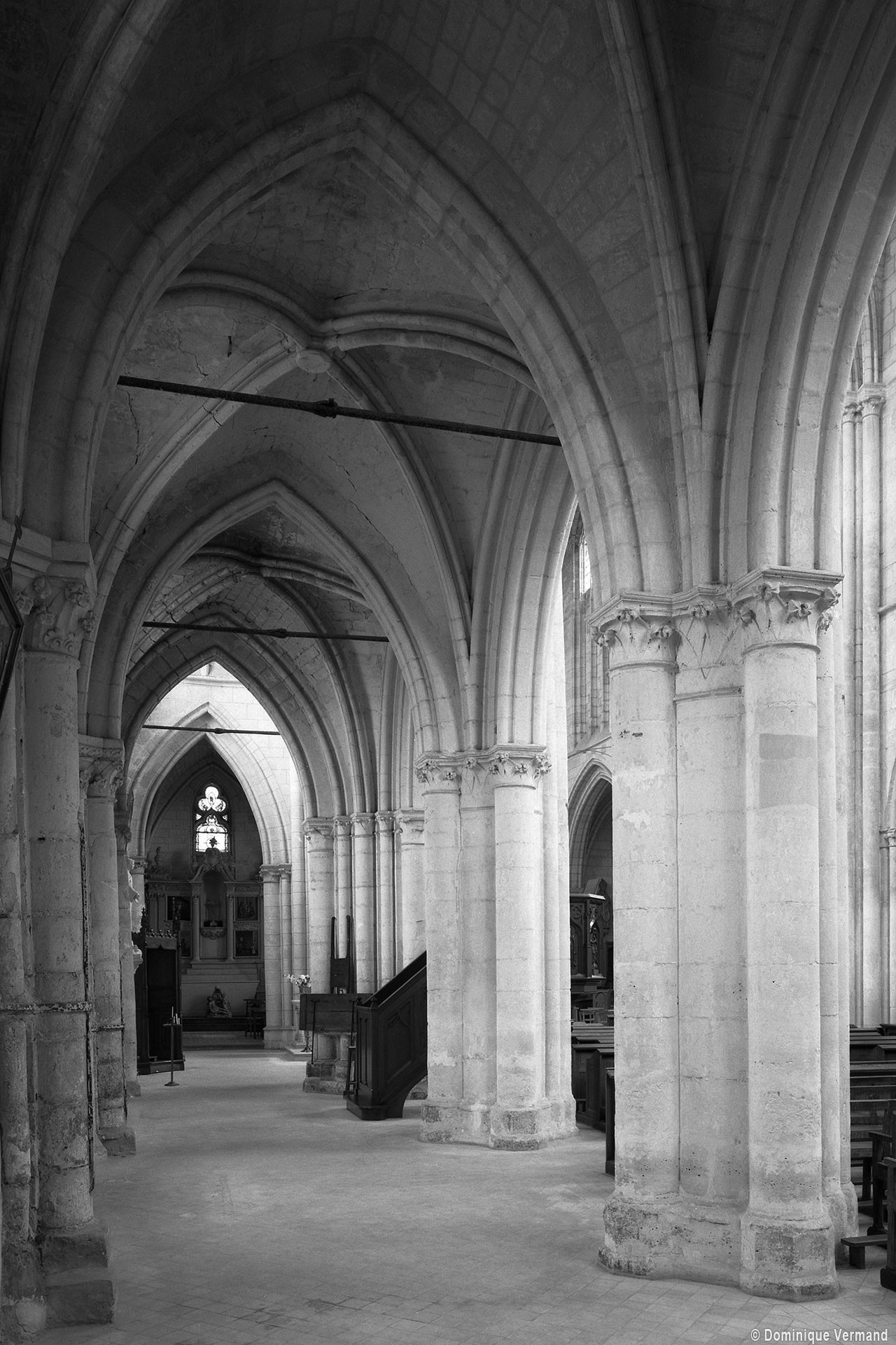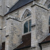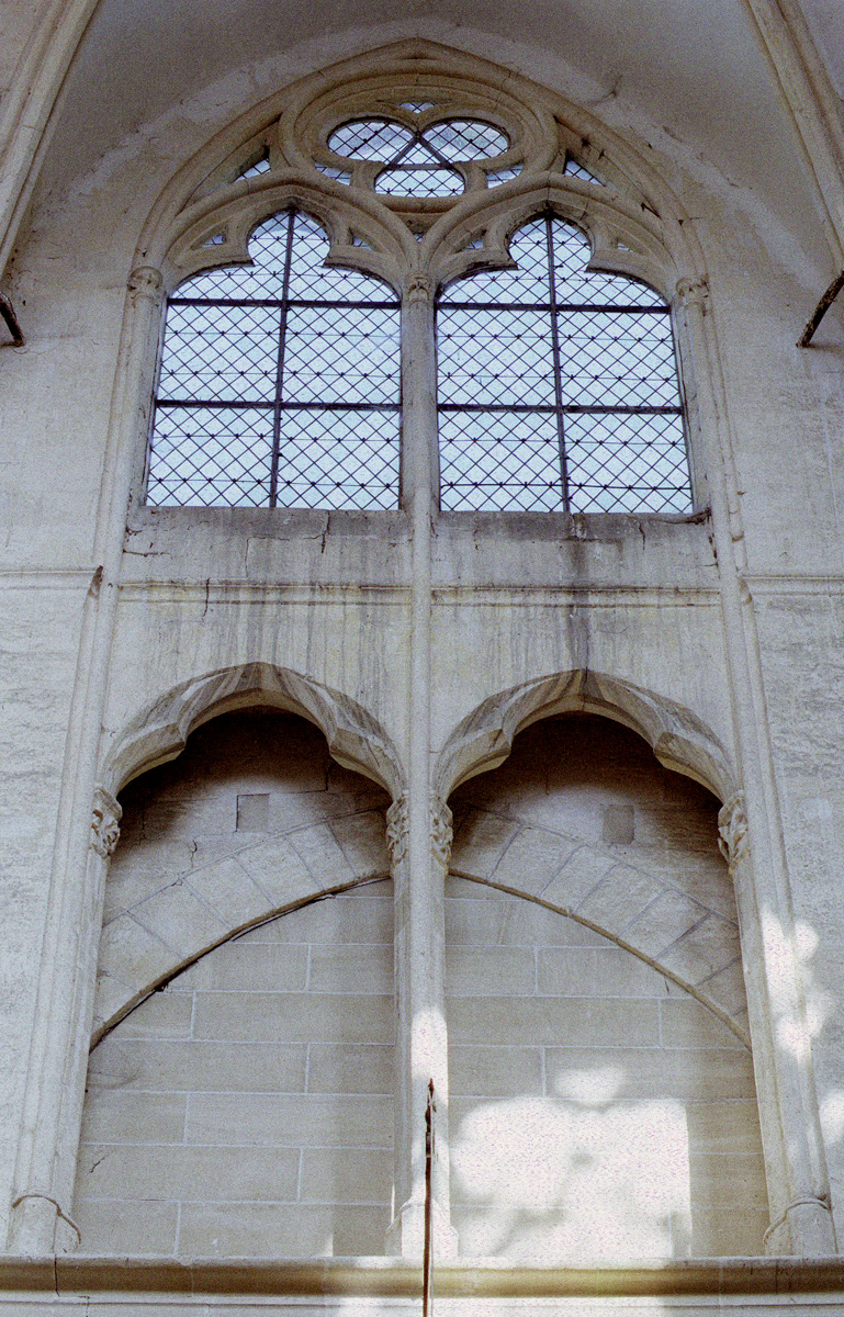 Une immense fenêtre au complexe et magnifique réseau rayonnant – dont la composition rappelle celle du chevet de Nointel – occupe, en façade, toute la largeur de la nef. Elle contraste avec le discret portail qui, séparé d’elle par un feston d’arcatures aveugles, s’ouvre au-dessous. Comme dans les grands édifices, des arcs-boutants épaulent, à l’extérieur, le vaisseau central. Le transept non saillant, éclairé au nord et au sud par deux grandes fenêtres rayonnantes, et la partie droite du chœur, accostée de bas-côtés, appartiennent également au 13ème siècle.