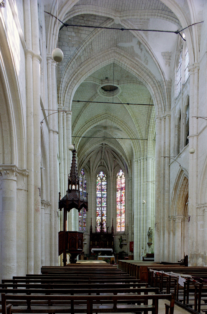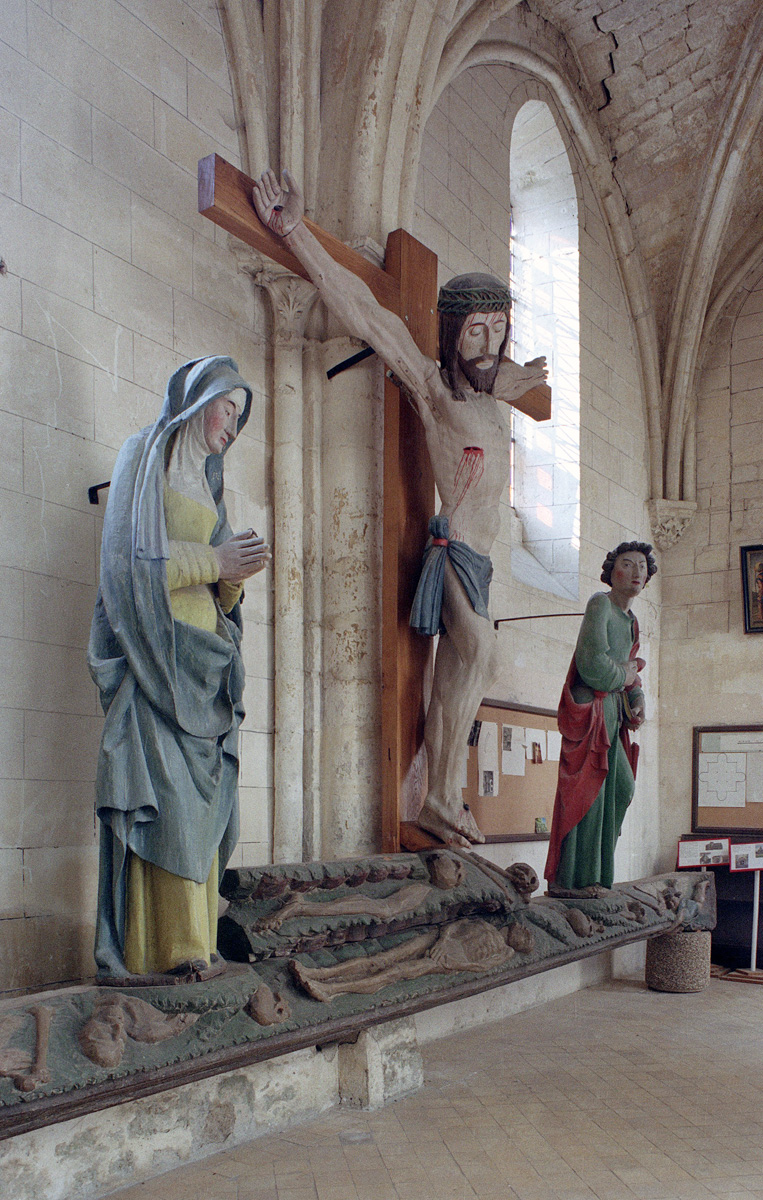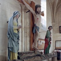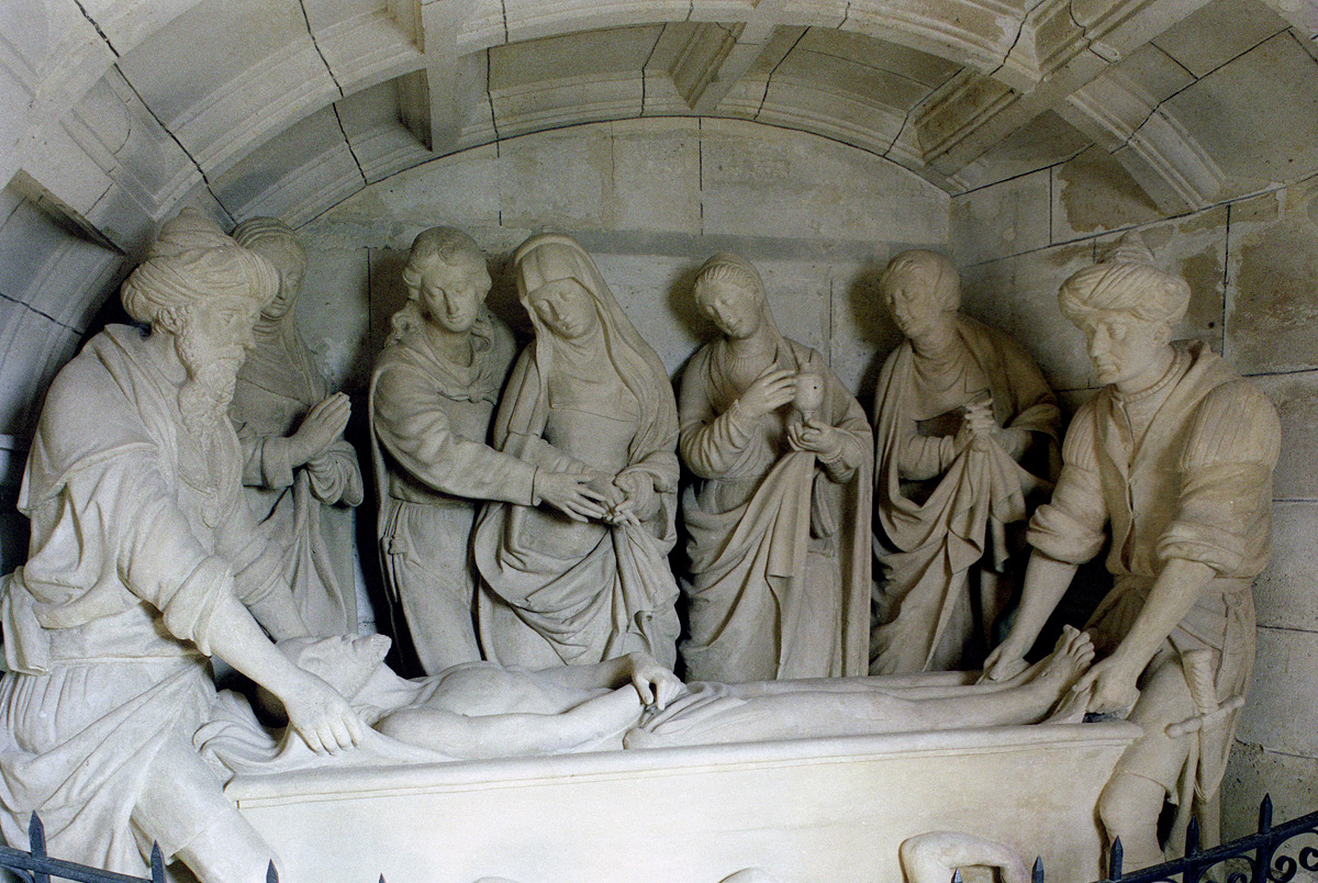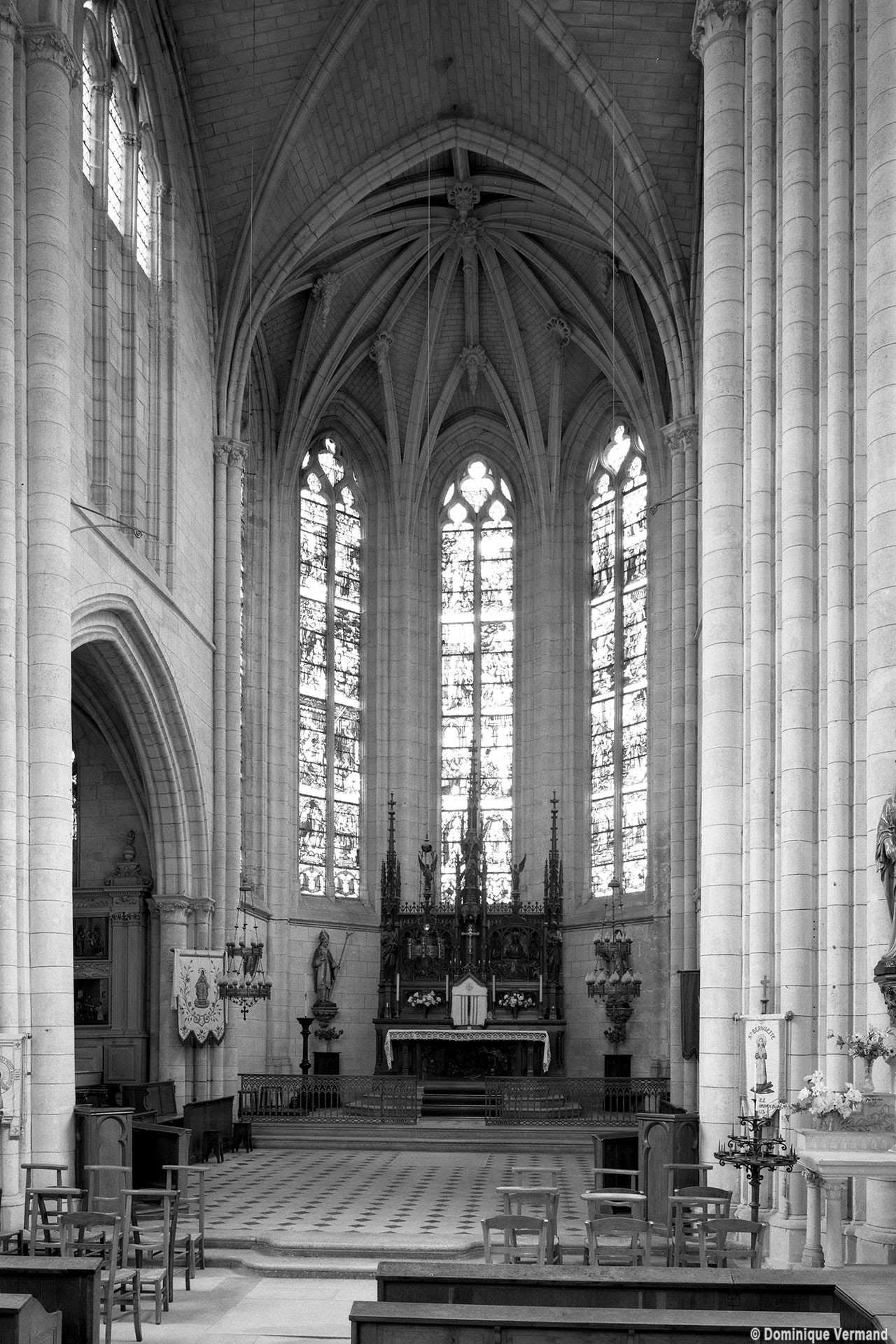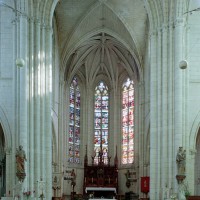 L’élégante abside pentagonale, dont les hautes et étroites fenêtres gardent encore quelques vitraux anciens, a été reconstruite dans les années 1530. La voûte, qui comporte des liernes et des tiercerons, est d’un dessin remarquable. C’est durant le troisième quart du 16ème siècle que l’on a bâti la sacristie, surmontant une sorte de caveau destiné à racheter la déclivité du terrain et renfermant une Mise au Tombeau traitée dans un style réaliste et emphatique.