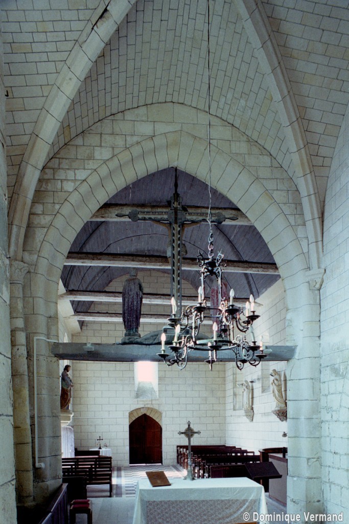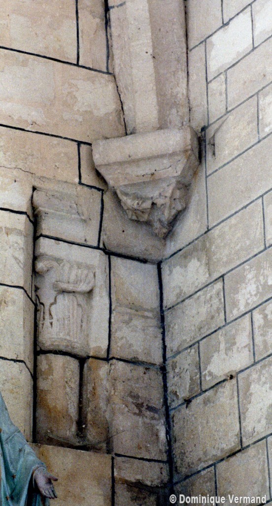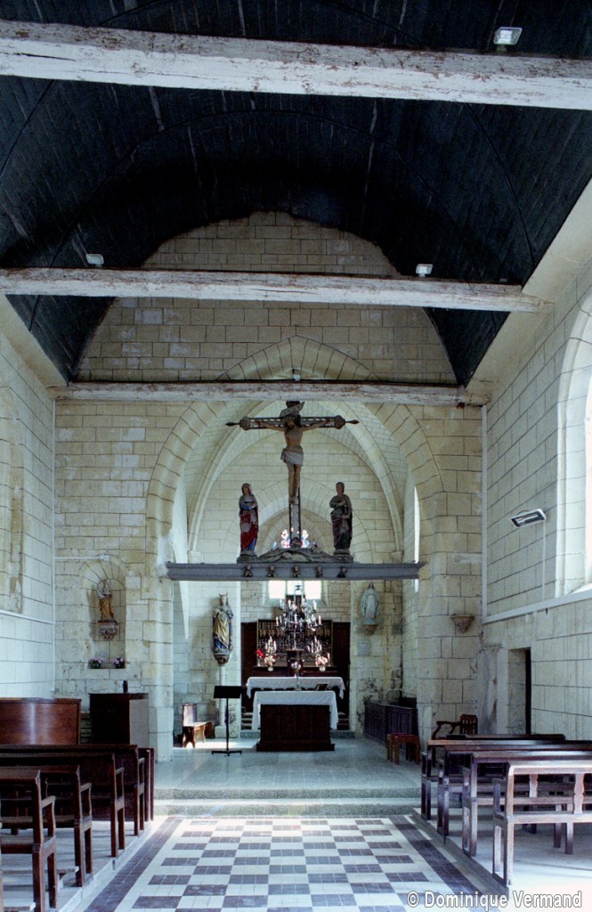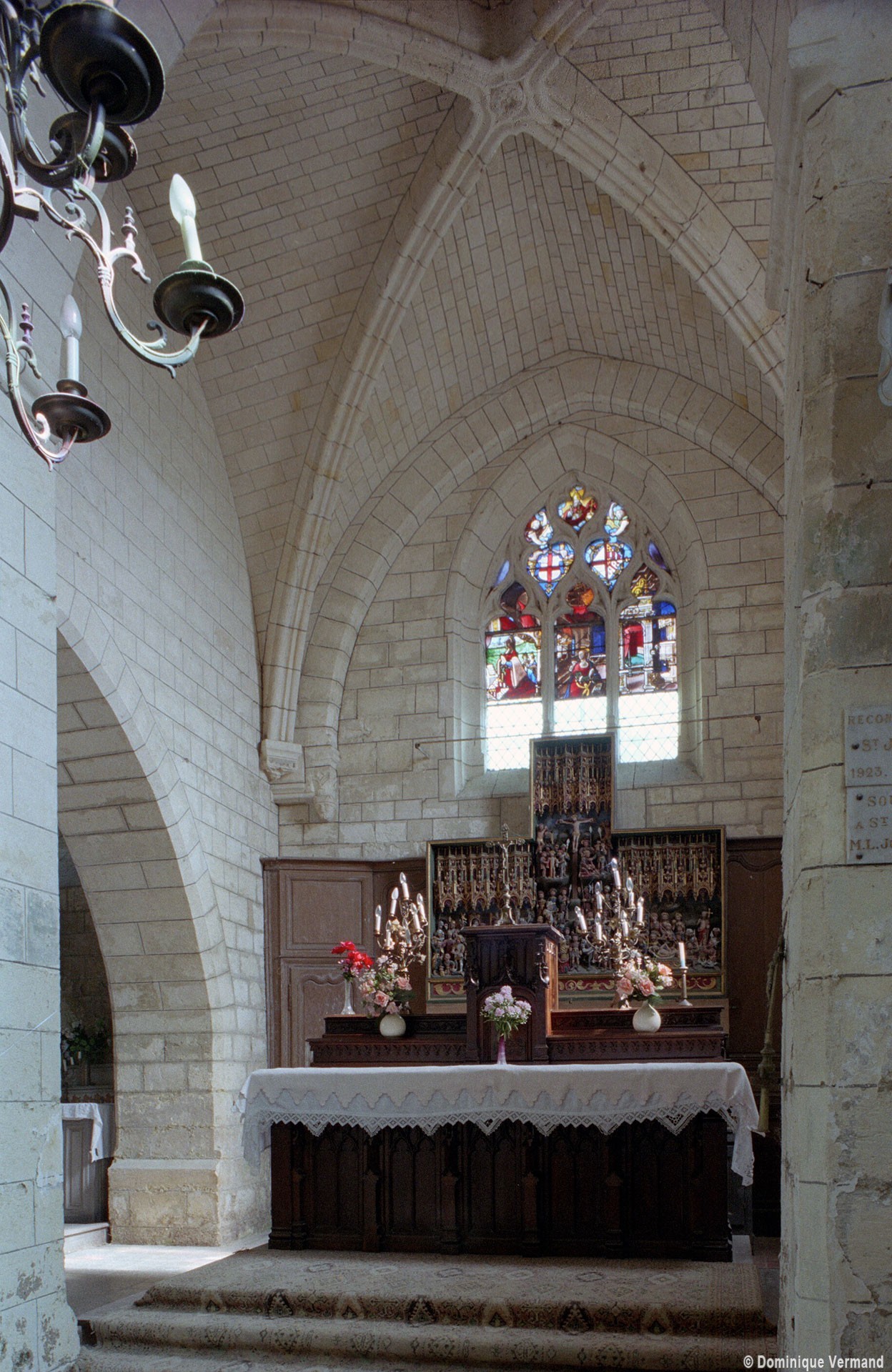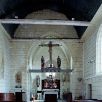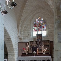 L’intérieur, bien que considérablement modifié et renforcé (arcade séparant les deux travées du chœur), a conservé sa voûte du 12ème siècle à la seconde travée (celle de la première travée est des 15ème/16ème siècles) et des chapiteaux sculptés de feuilles stylisées au sud de la première travée et au mur est de la seconde. Il n’y a guère à dire du bas-côté, sans style, qui flanque le chœur au nord.