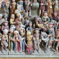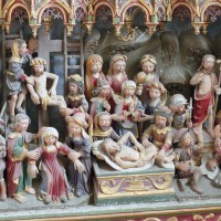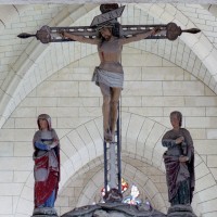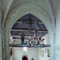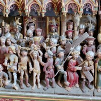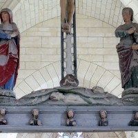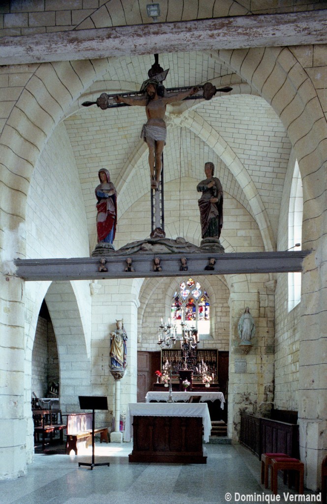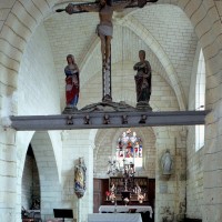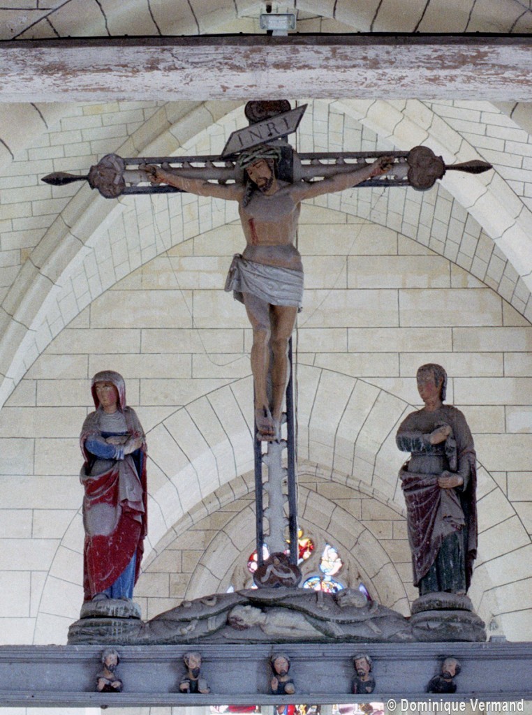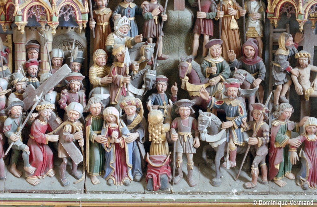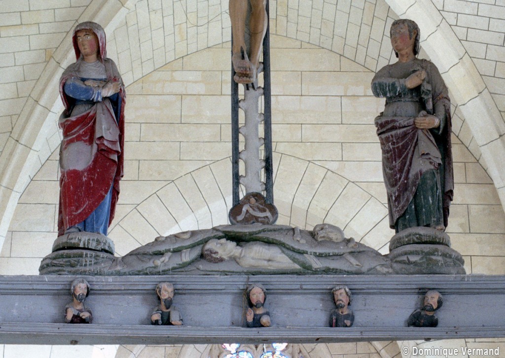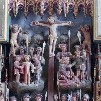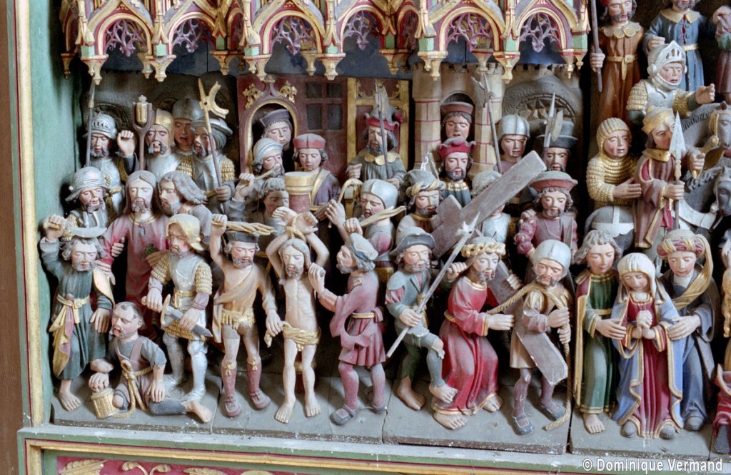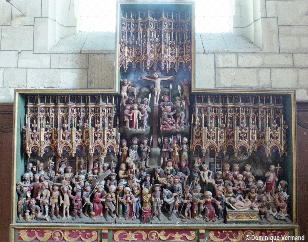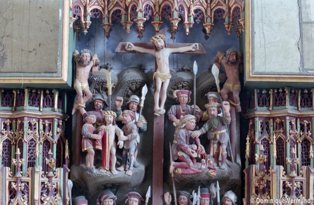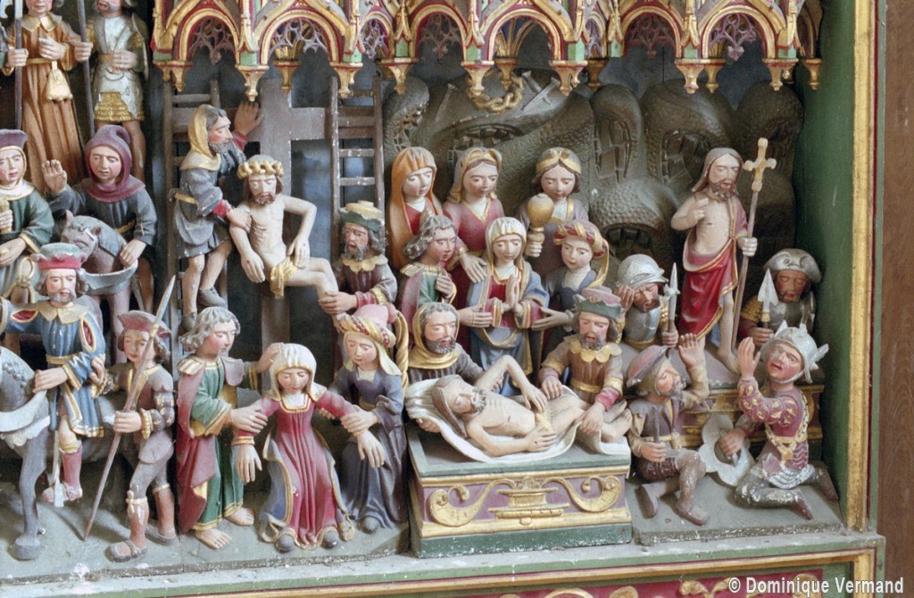 Mais bien plus que par son architecture, l’église vaut par deux éléments mobiliers absolument remarquables. Le retable de la Crucifixion en bois sculpté du début du 16ème siècle est une pièce exceptionnelle. Investit par des dizaines de personnages polychromés et pleins de vie, qu’abritent des dais sculptés avec minutie, véritables architectures en miniature, il a en outre le mérite d’être absolument complet et intact. Il en est de même de la poutre de gloire, de la fin du 16ème siècle, dont la croix s’élève au-dessus d’un petit tertre formant un ossuaire laissant apparaître partiellement un corps allongé.