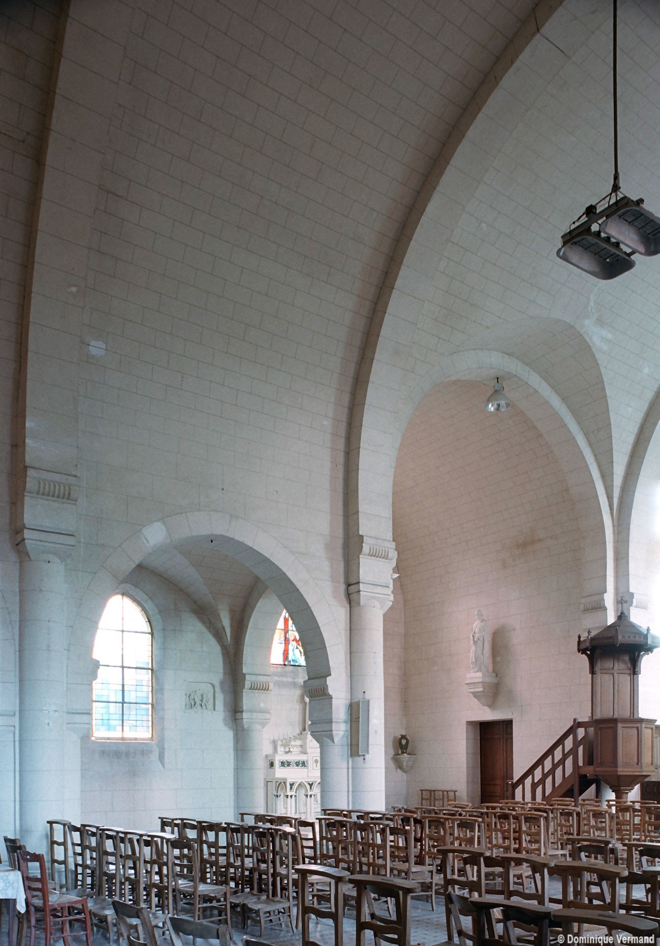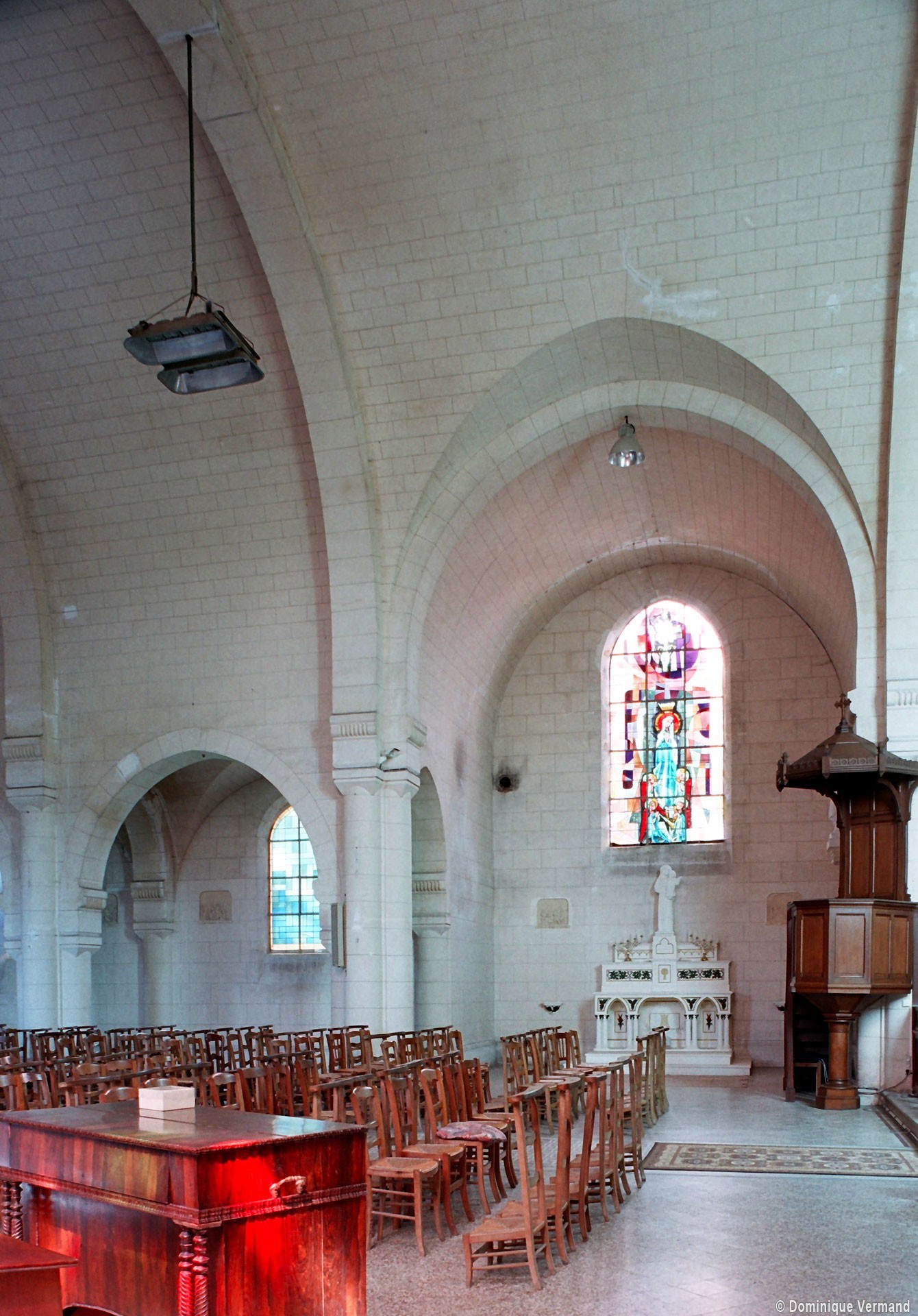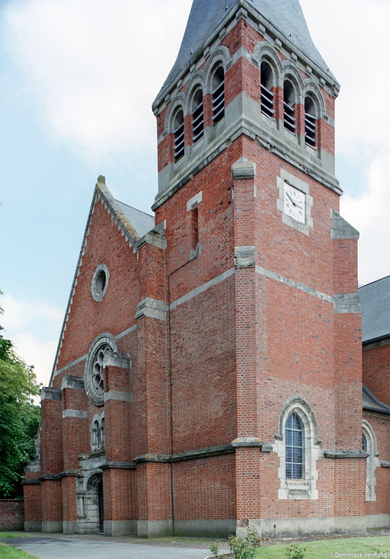 Construite en briques, elle comporte une nef de deux travées avec bas-côtés, un transept saillant et un choeur pentagonal. Le clocher est bâti sur la première travée du bas-côté sud. L’ensemble est de style gothique tardif, excepté le clocher dont l’étage du beffroi est ajouré sur chaque face de trois baies en plein cintre. L’intérieur est couvert de voûtes en berceau (nef et croisillons) ou d’arêtes, en plâtre. Dans la nef, les retombées s’effectuent sur des piliers composés de quatre demi-colonnes qui ajoutent au caractère hétéroclite de la construction.