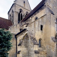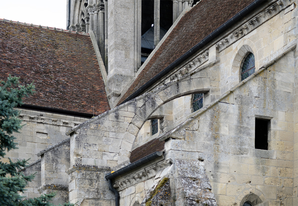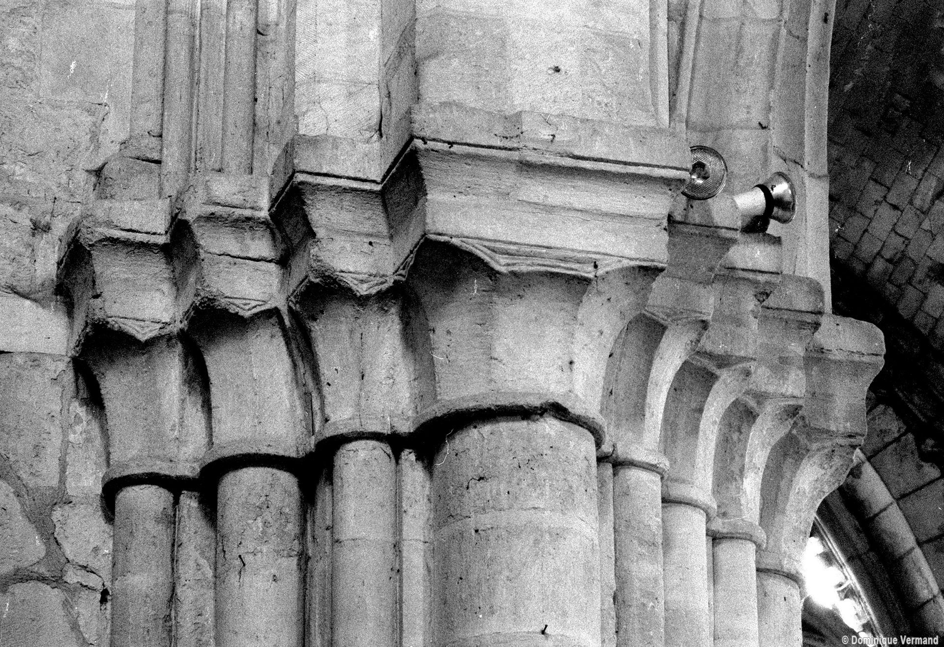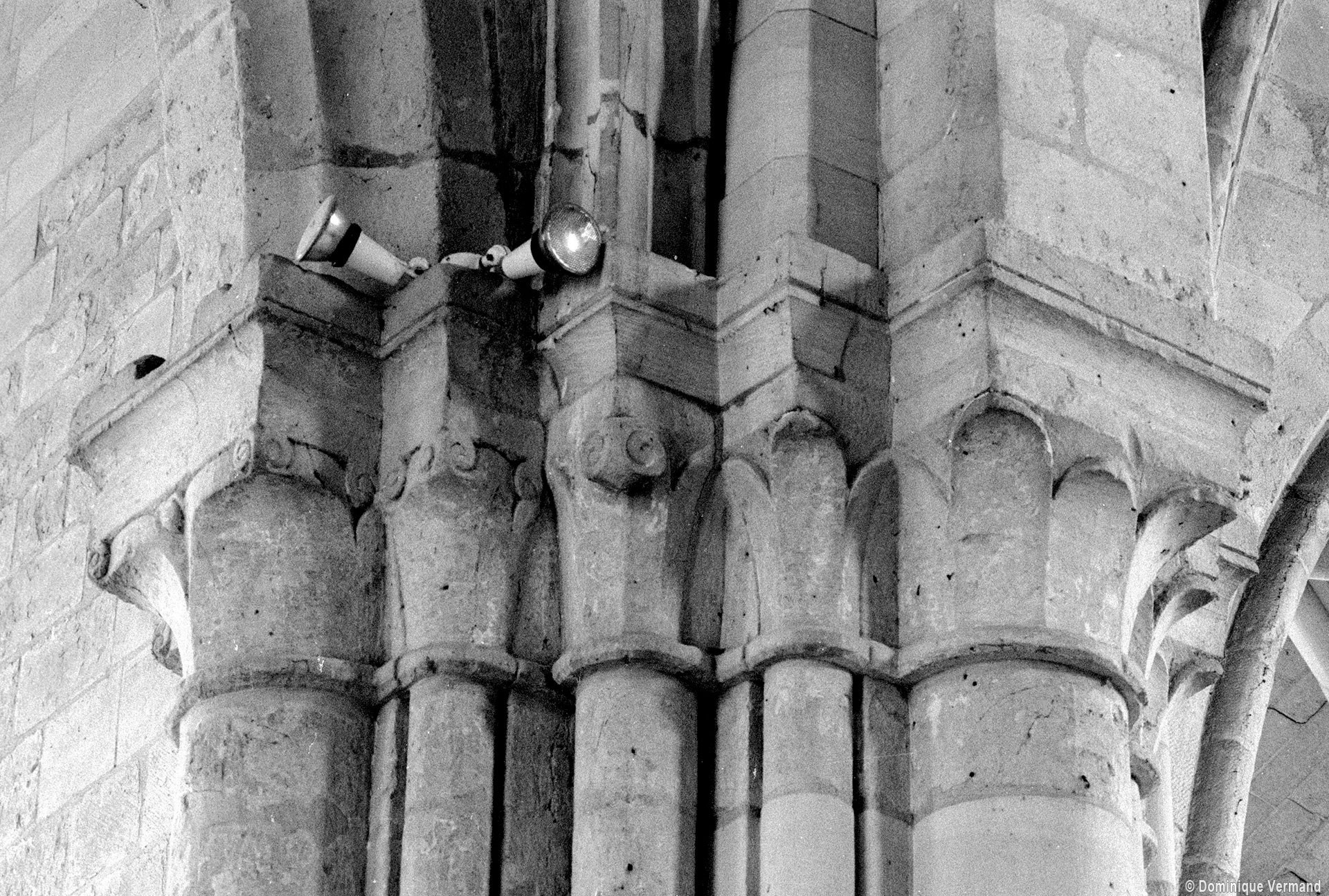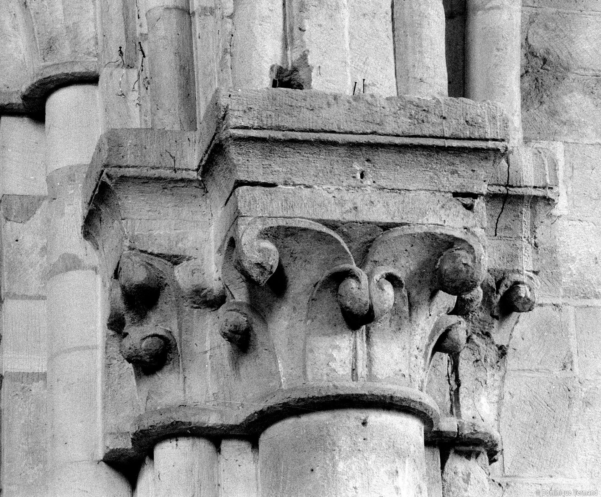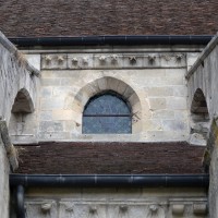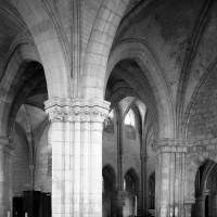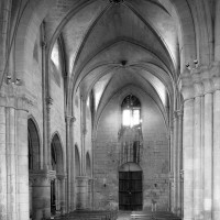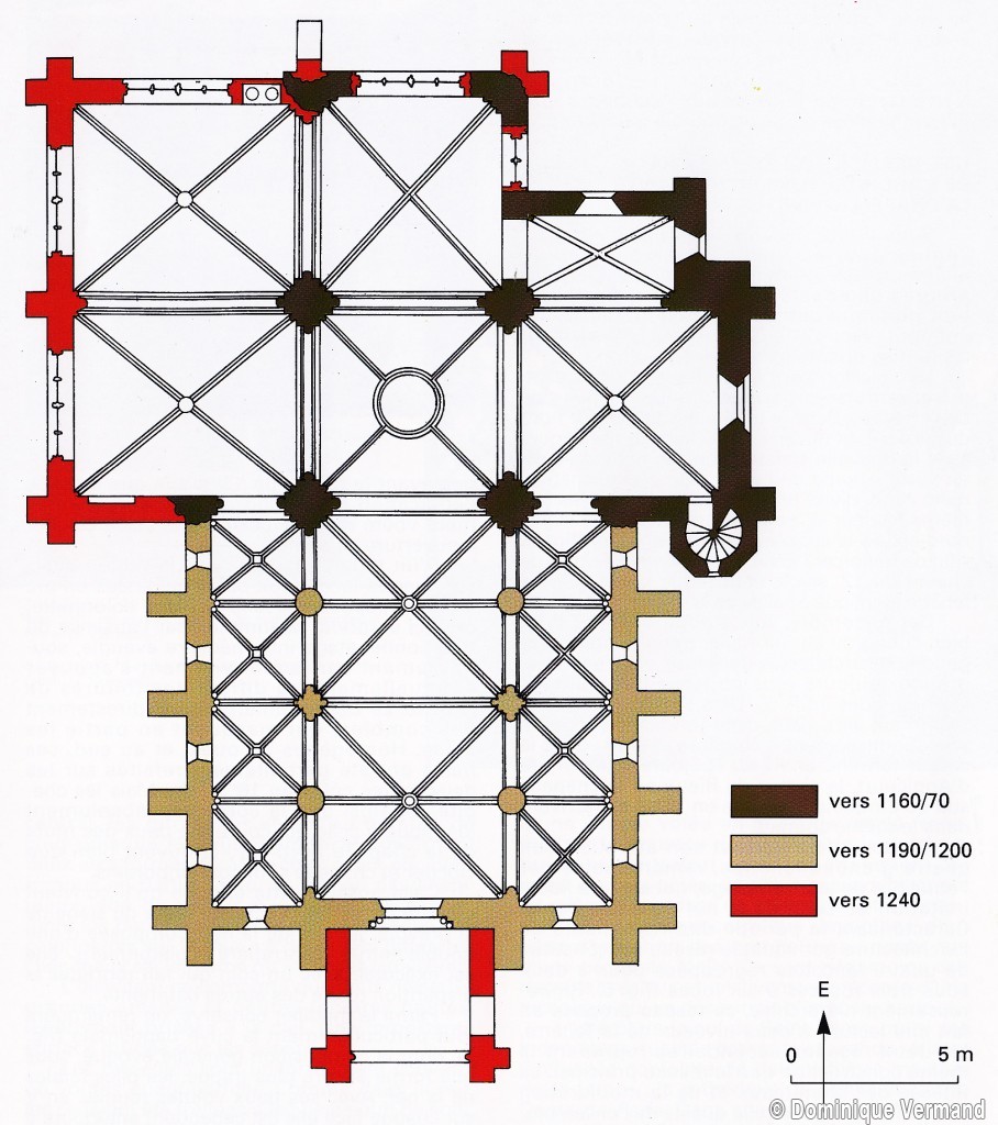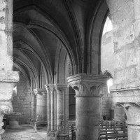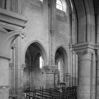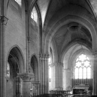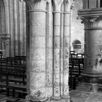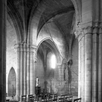 Durant le dernier quart du 12ème siècle, une seconde campagne voit l’édification de la nef, couverte par deux voûtes sexpartites qui retombent alternativement sur de courtes piles cruciformes flanquées de colonnettes – piles fortes – ou bien circulaires – piles faibles. La sculpture des gros chapiteaux à crochets qui surmontent les piles circulaires est remarquable de vigueur. L’élévation ne comporte que deux niveaux : grandes arcades et fenêtres hautes. L’alternance des supports, bien que d’un bel effet, ainsi que la présence d’arcs-boutants, ne se justifient cependant guère dans cet édifice aux dimensions modestes et traduisent davantage un désir d’imitation qu’un choix technique raisonné.