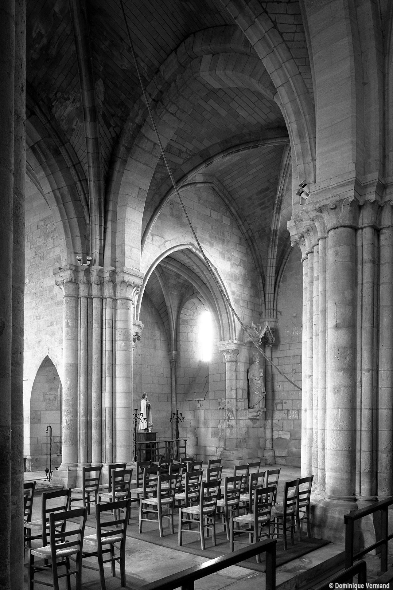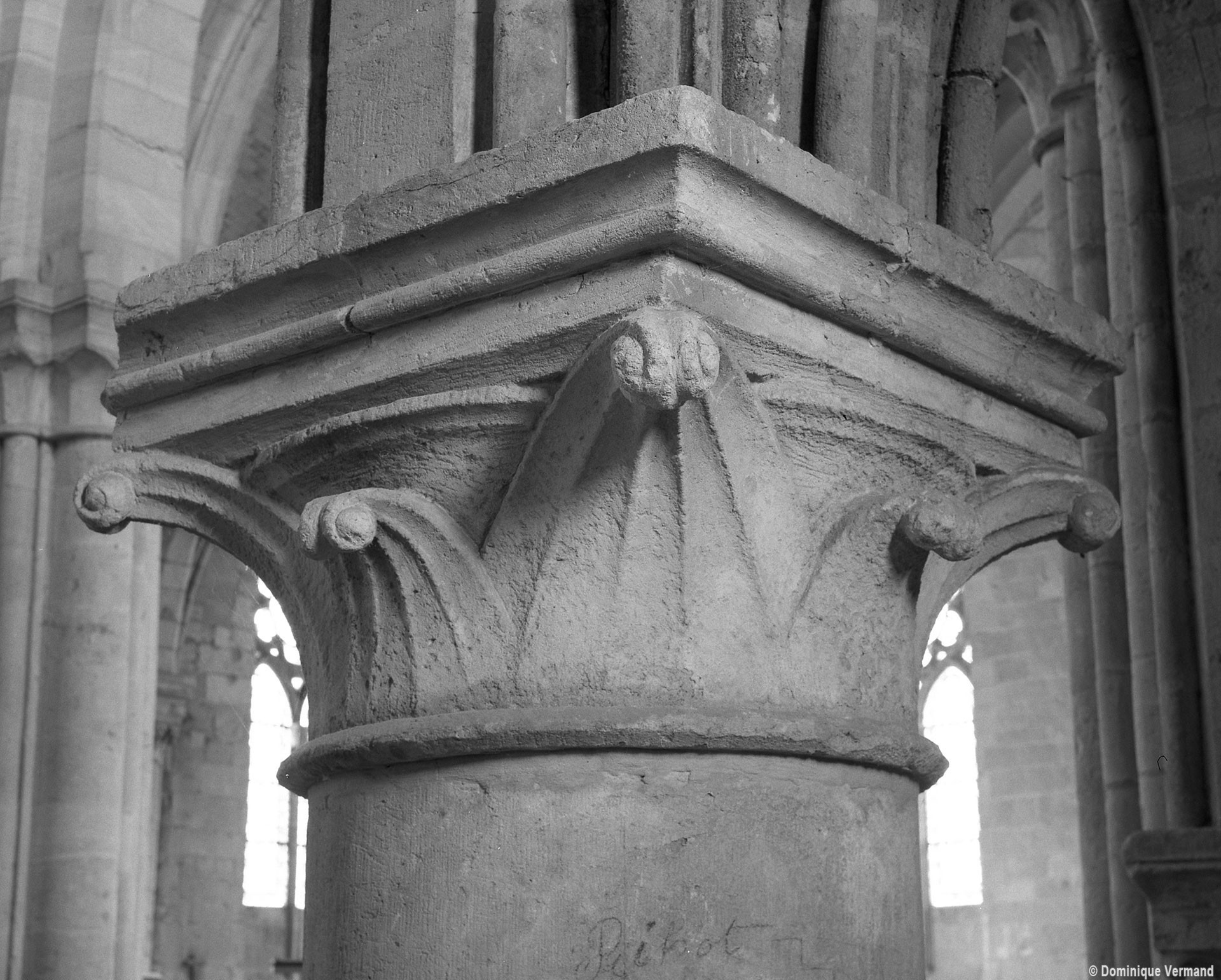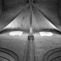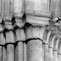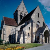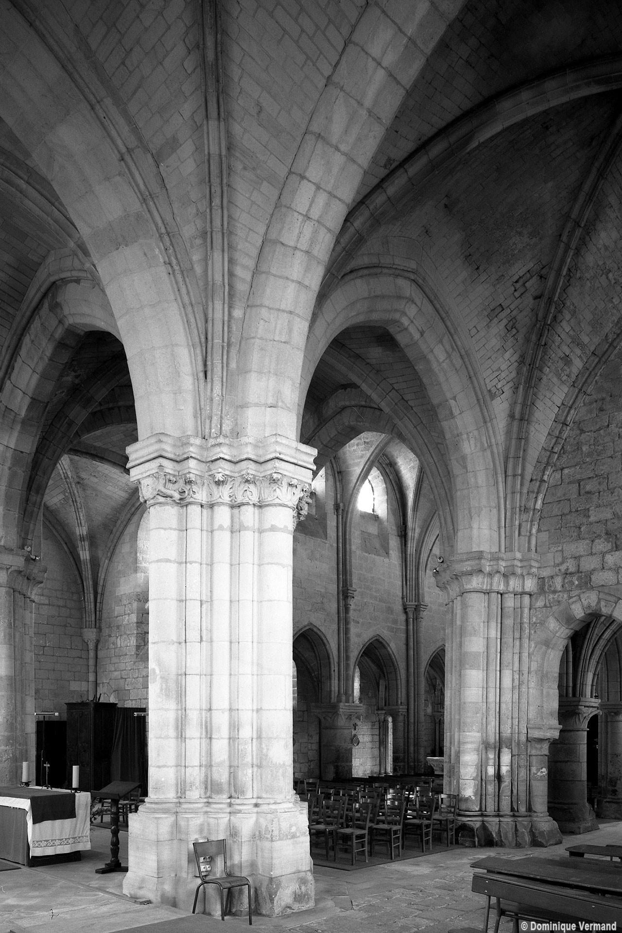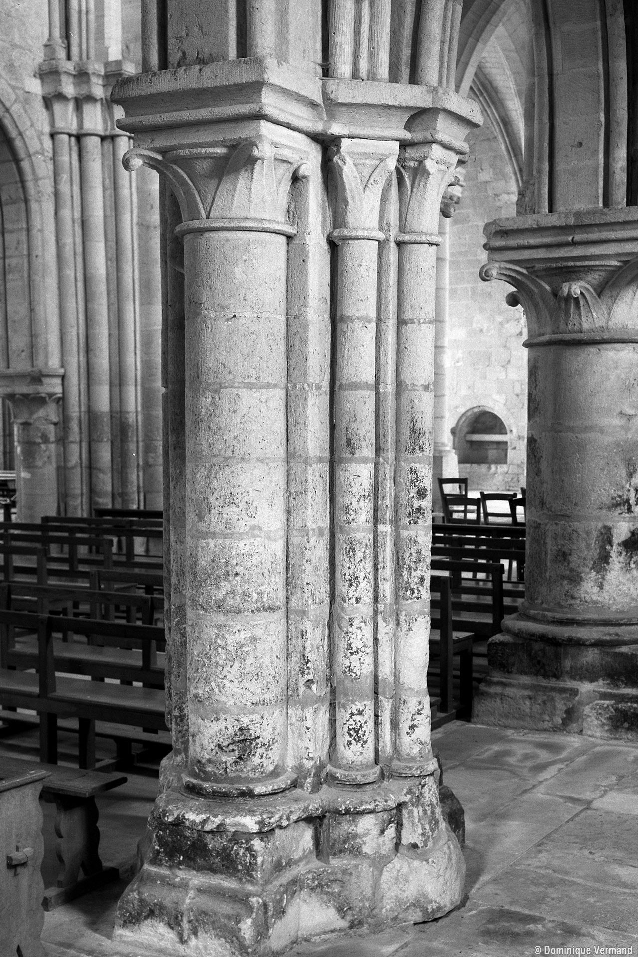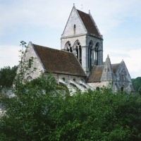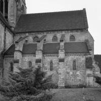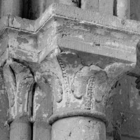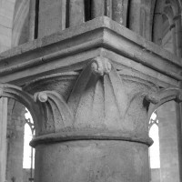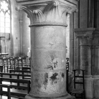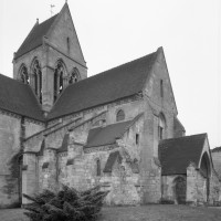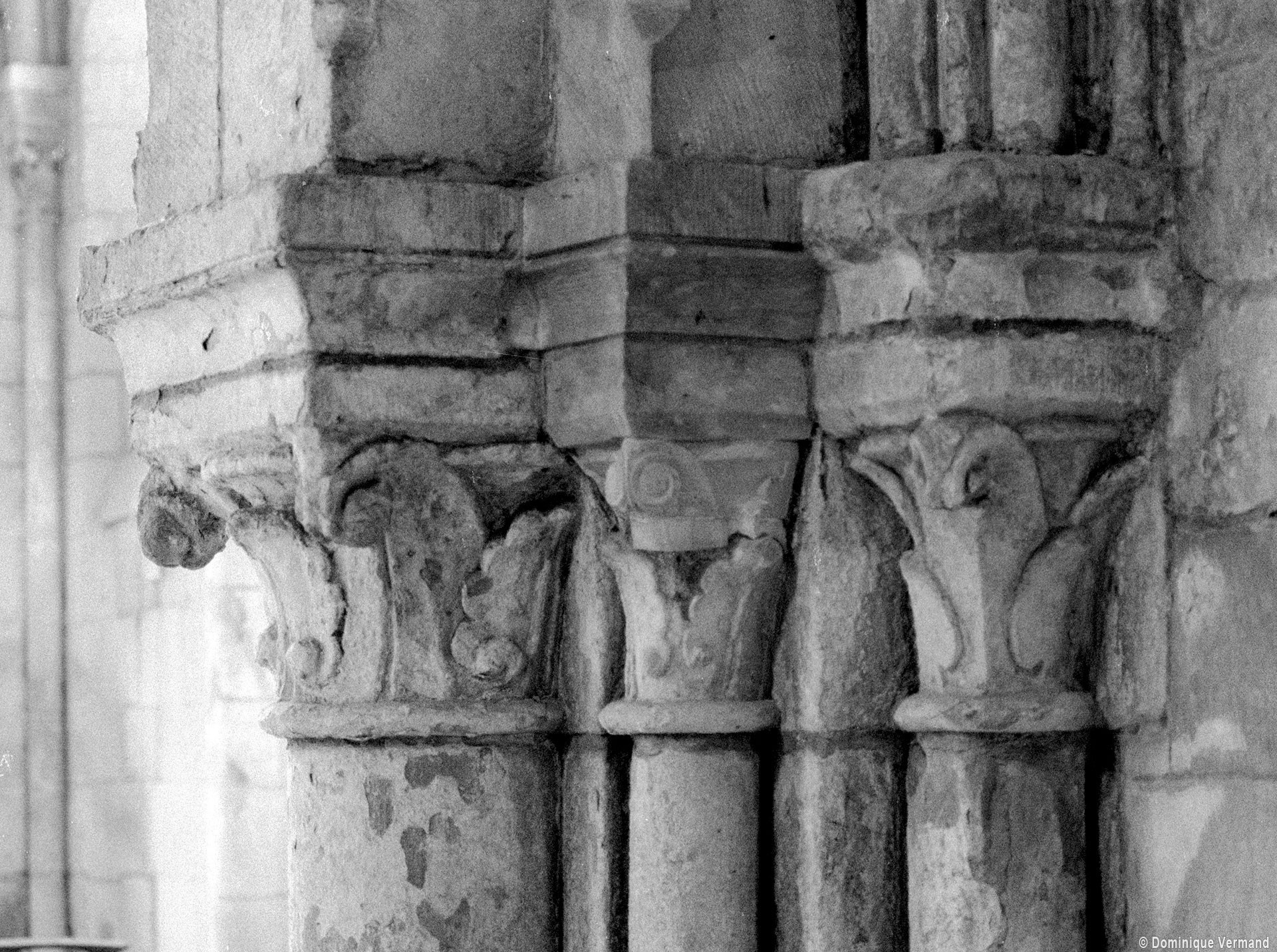 Durant le dernier quart du 12ème siècle, une seconde campagne voit l’édification de la nef, couverte par deux voûtes sexpartites qui retombent alternativement sur de courtes piles cruciformes flanquées de colonnettes – piles fortes – ou bien circulaires – piles faibles. La sculpture des gros chapiteaux à crochets qui surmontent les piles circulaires est remarquable de vigueur. L’élévation ne comporte que deux niveaux : grandes arcades et fenêtres hautes. L’alternance des supports, bien que d’un bel effet, ainsi que la présence d’arcs-boutants, ne se justifient cependant guère dans cet édifice aux dimensions modestes et traduisent davantage un désir d’imitation qu’un choix technique raisonné.