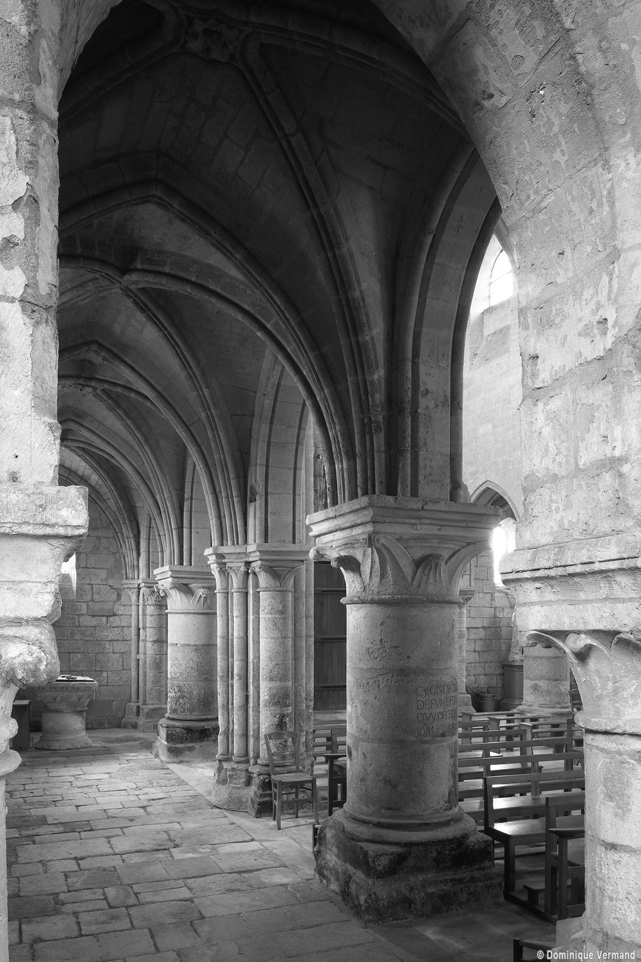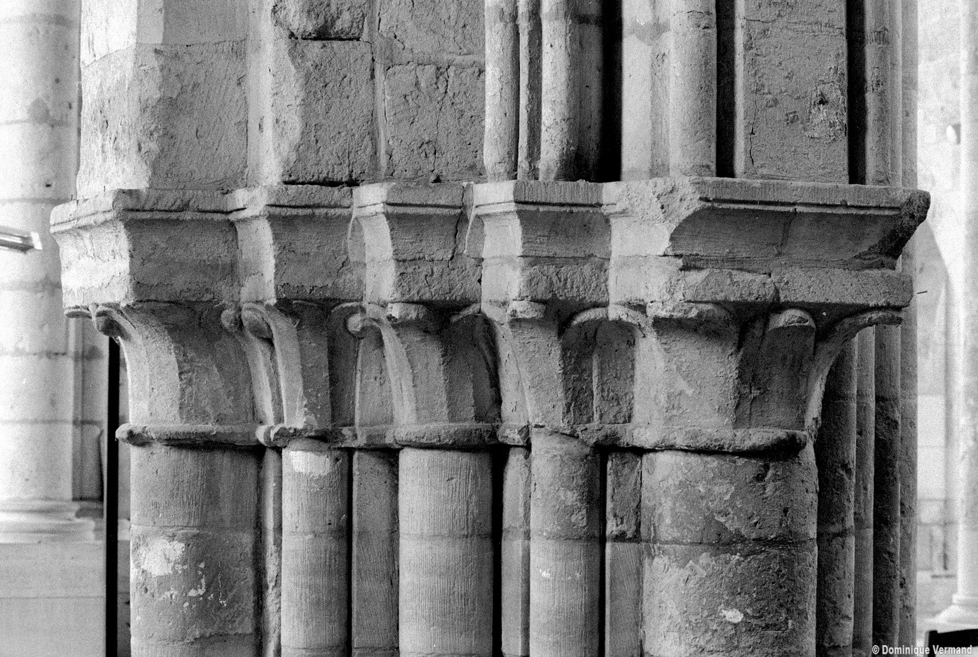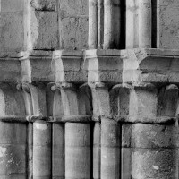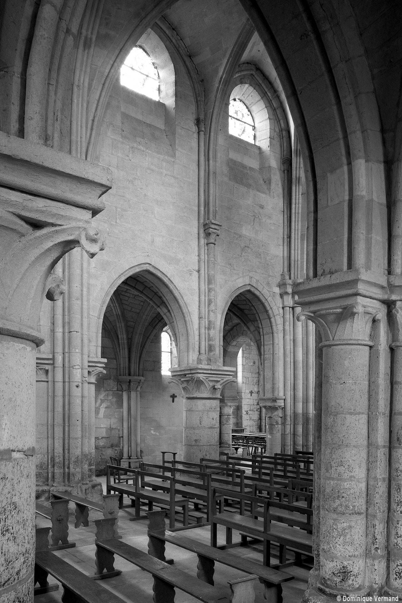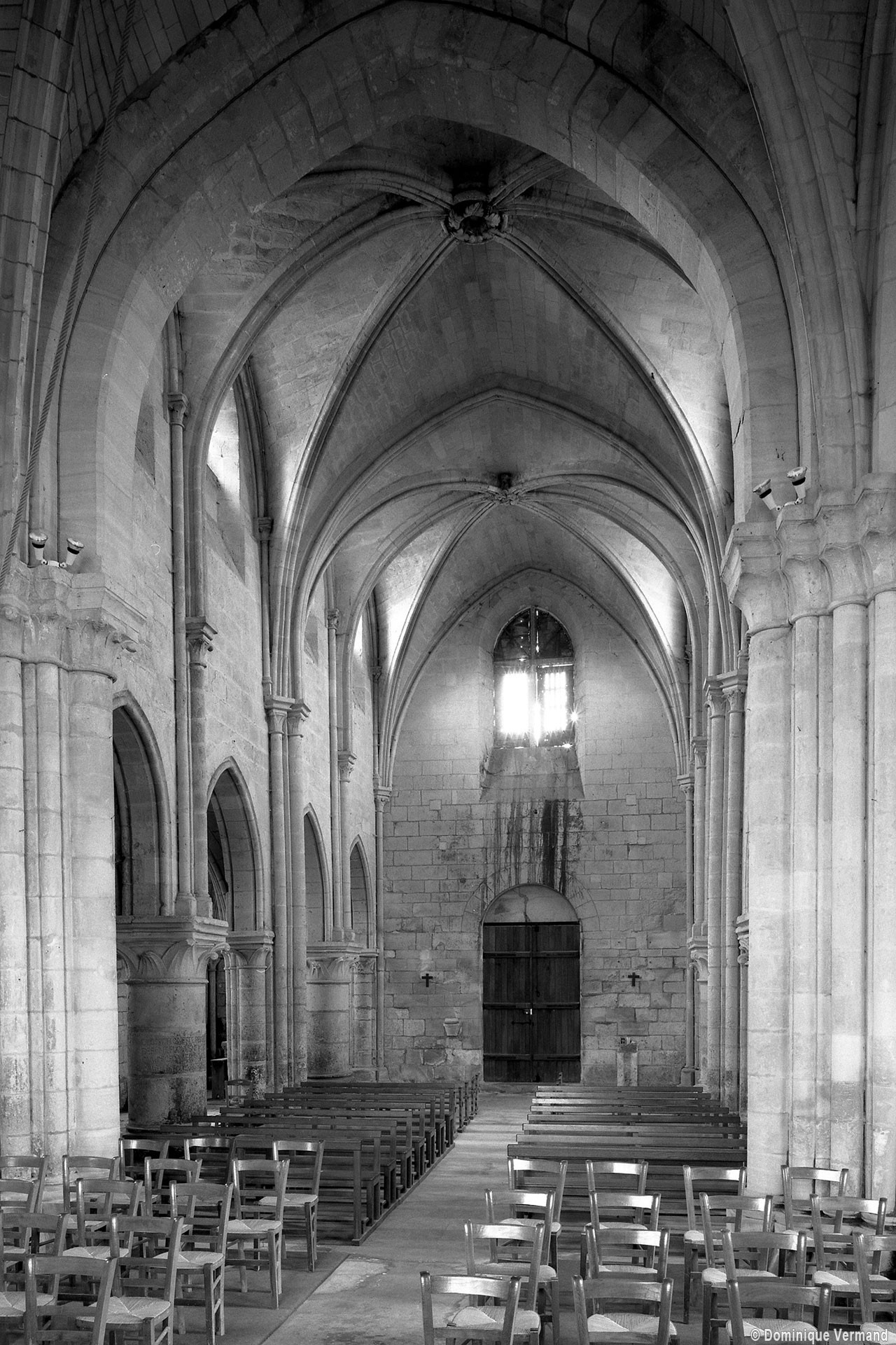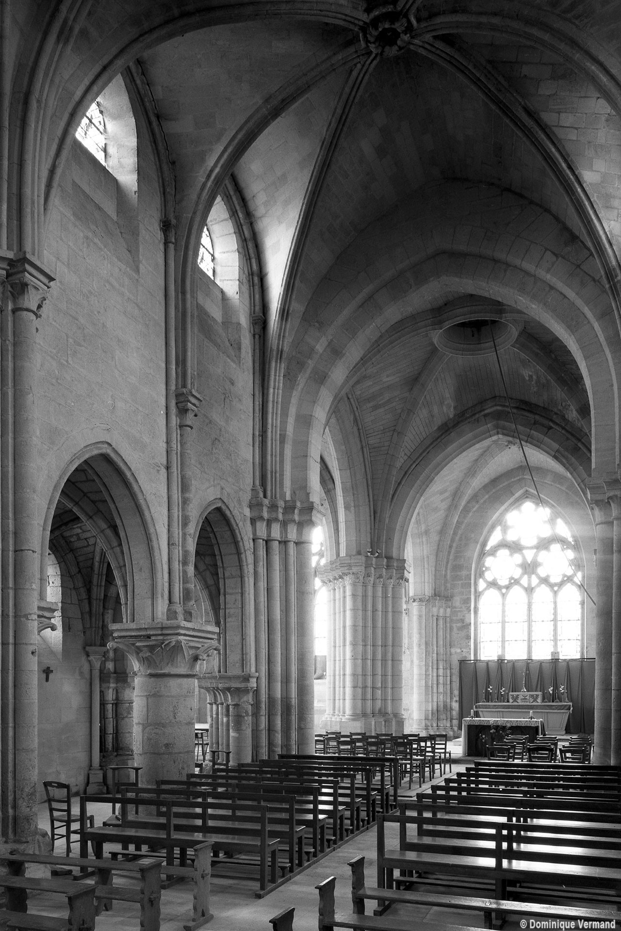 Durant le dernier quart du 12ème siècle, une seconde campagne voit l’édification de la nef, couverte par deux voûtes sexpartites qui retombent alternativement sur de courtes piles cruciformes flanquées de colonnettes – piles fortes – ou bien circulaires – piles faibles. La sculpture des gros chapiteaux à crochets qui surmontent les piles circulaires est remarquable de vigueur. L’élévation ne comporte que deux niveaux : grandes arcades et fenêtres hautes. L’alternance des supports, bien que d’un bel effet, ainsi que la présence d’arcs-boutants, ne se justifient cependant guère dans cet édifice aux dimensions modestes et traduisent davantage un désir d’imitation qu’un choix technique raisonné.
