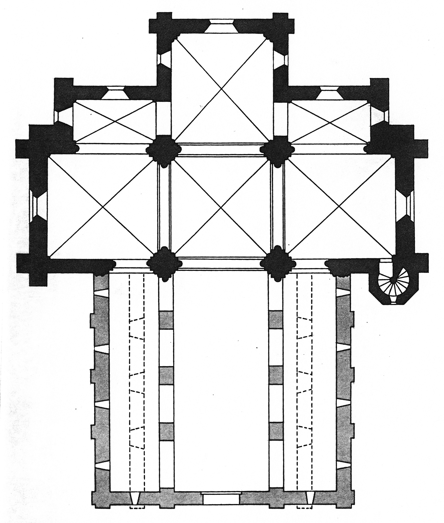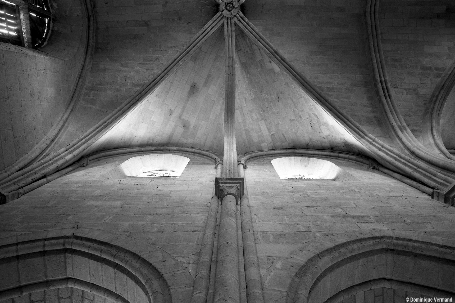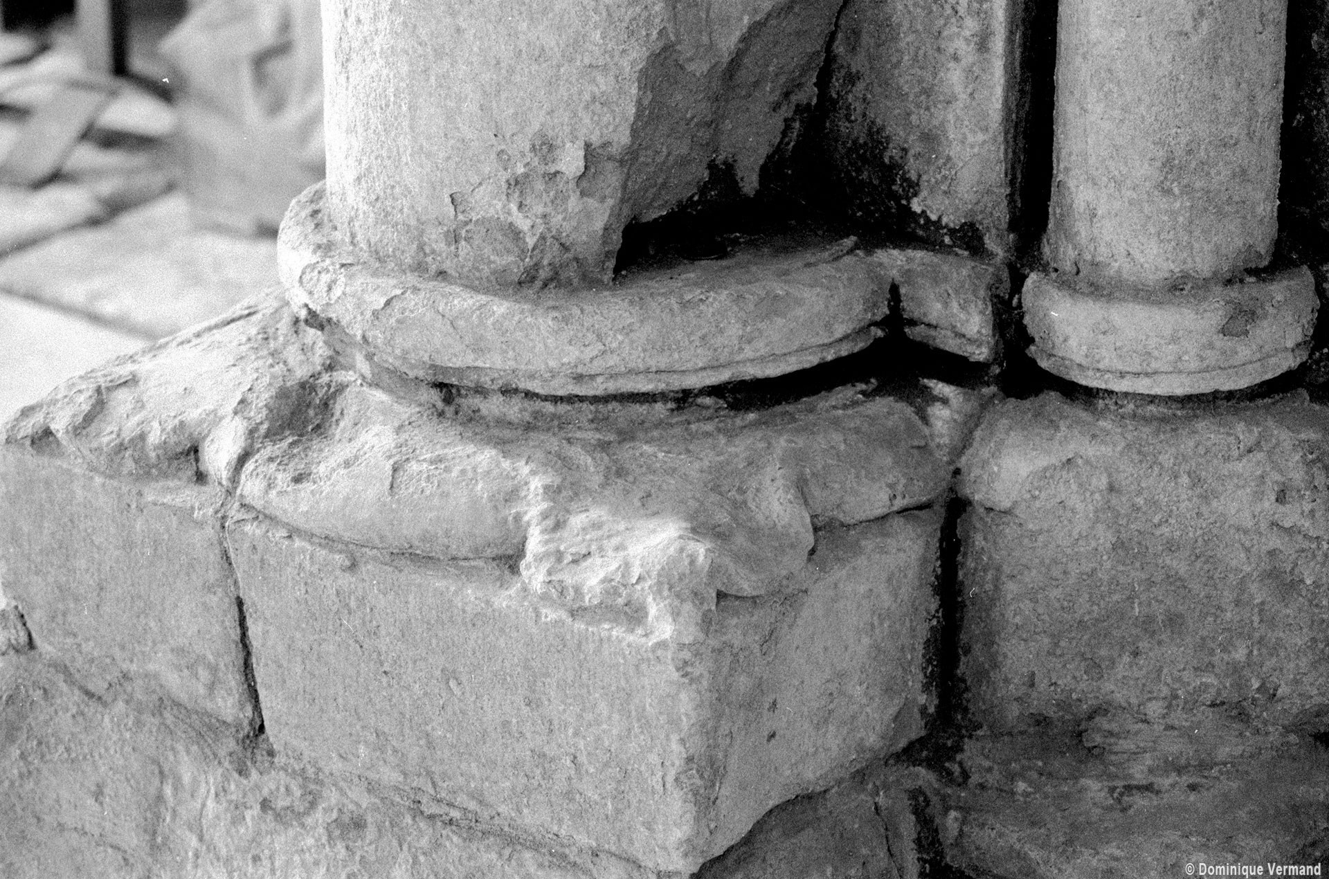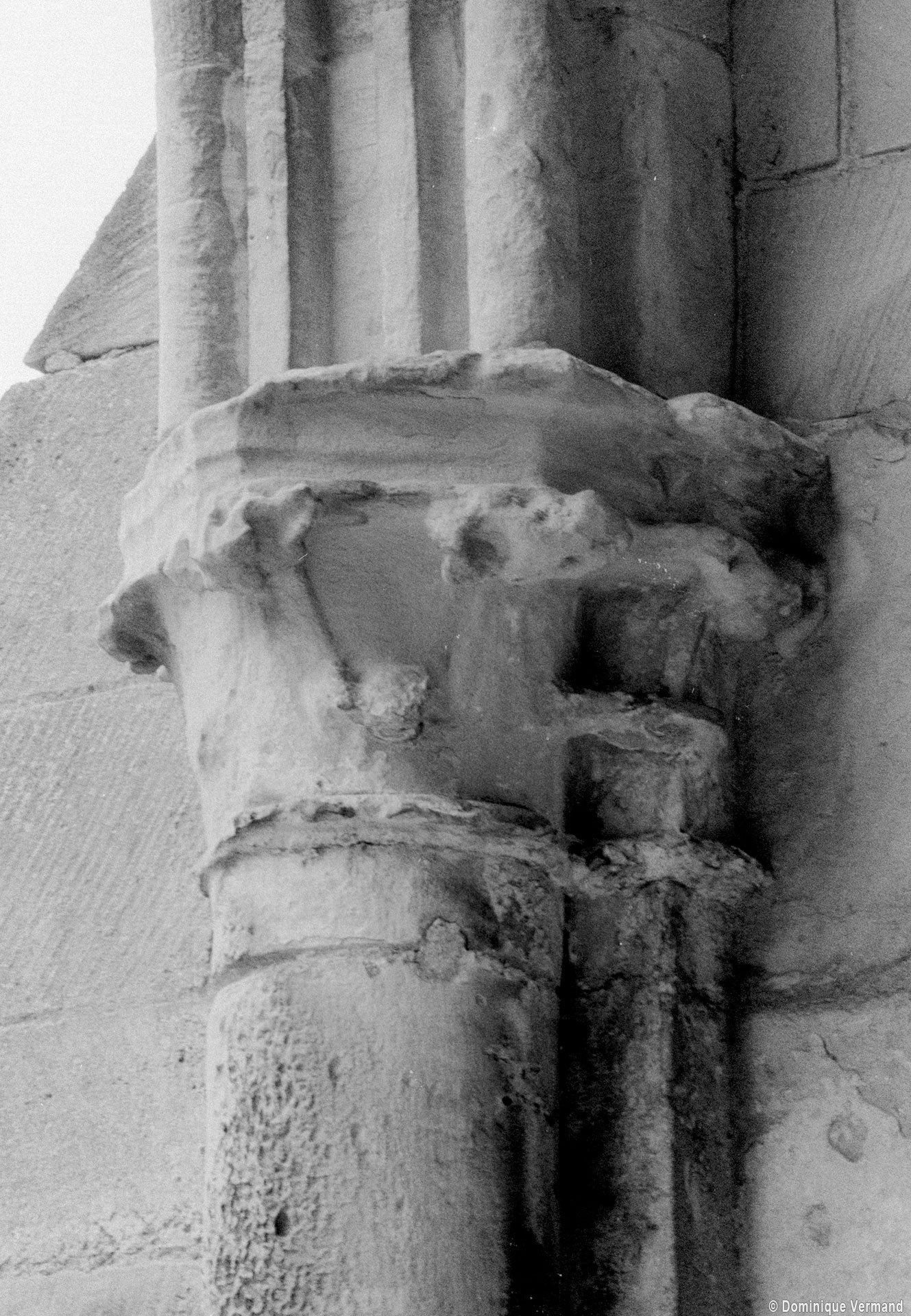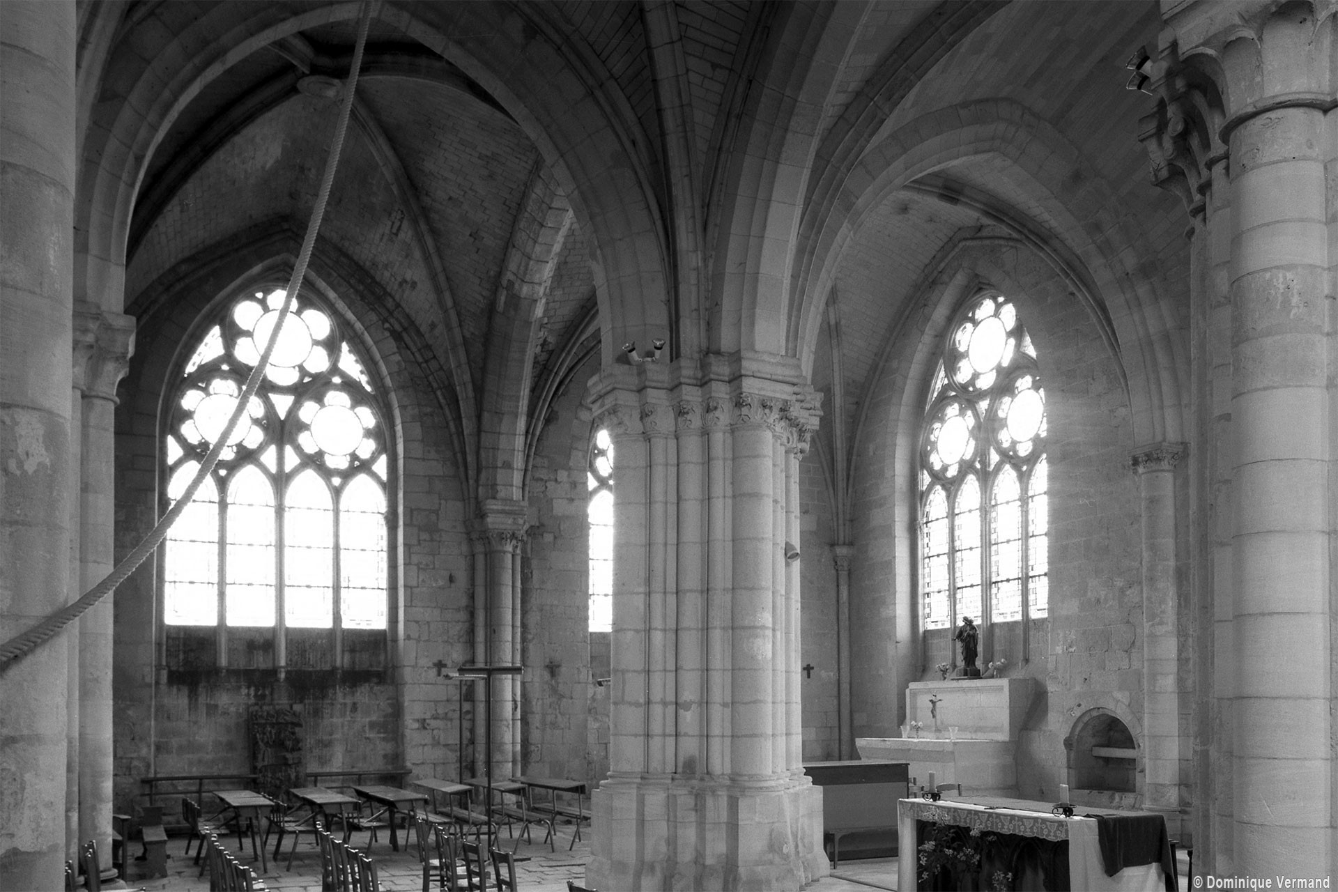 Durant le dernier quart du 12ème siècle, une seconde campagne voit l’édification de la nef, couverte par deux voûtes sexpartites qui retombent alternativement sur de courtes piles cruciformes flanquées de colonnettes – piles fortes – ou bien circulaires – piles faibles. La sculpture des gros chapiteaux à crochets qui surmontent les piles circulaires est remarquable de vigueur. L’élévation ne comporte que deux niveaux : grandes arcades et fenêtres hautes. L’alternance des supports, bien que d’un bel effet, ainsi que la présence d’arcs-boutants, ne se justifient cependant guère dans cet édifice aux dimensions modestes et traduisent davantage un désir d’imitation qu’un choix technique raisonné.
