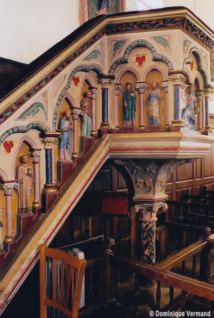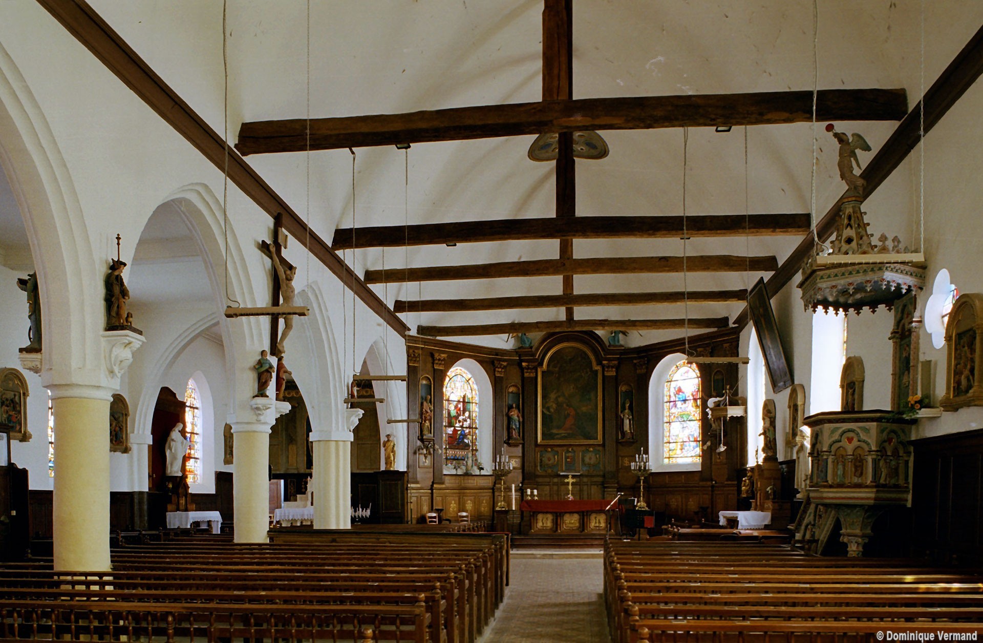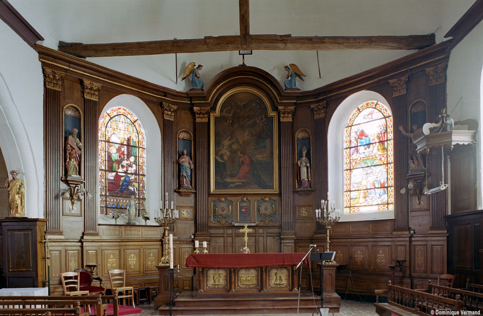 On remarquera surtout les belles boiseries du chœur, de la fin du 17ème siècle, encadrant deux vitraux de l’atelier Bazin-Latteux (1875-76) et une amusante chaire en plâtre peint, avec la représentation des douze Apôtres, mélangeant les styles néo-roman et gothique (2005).