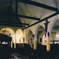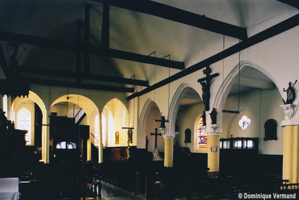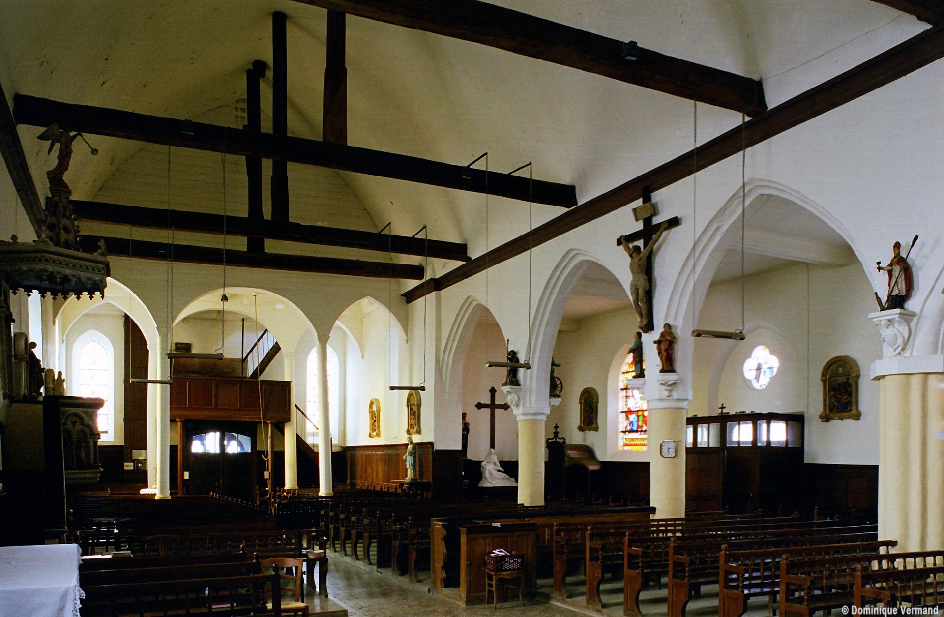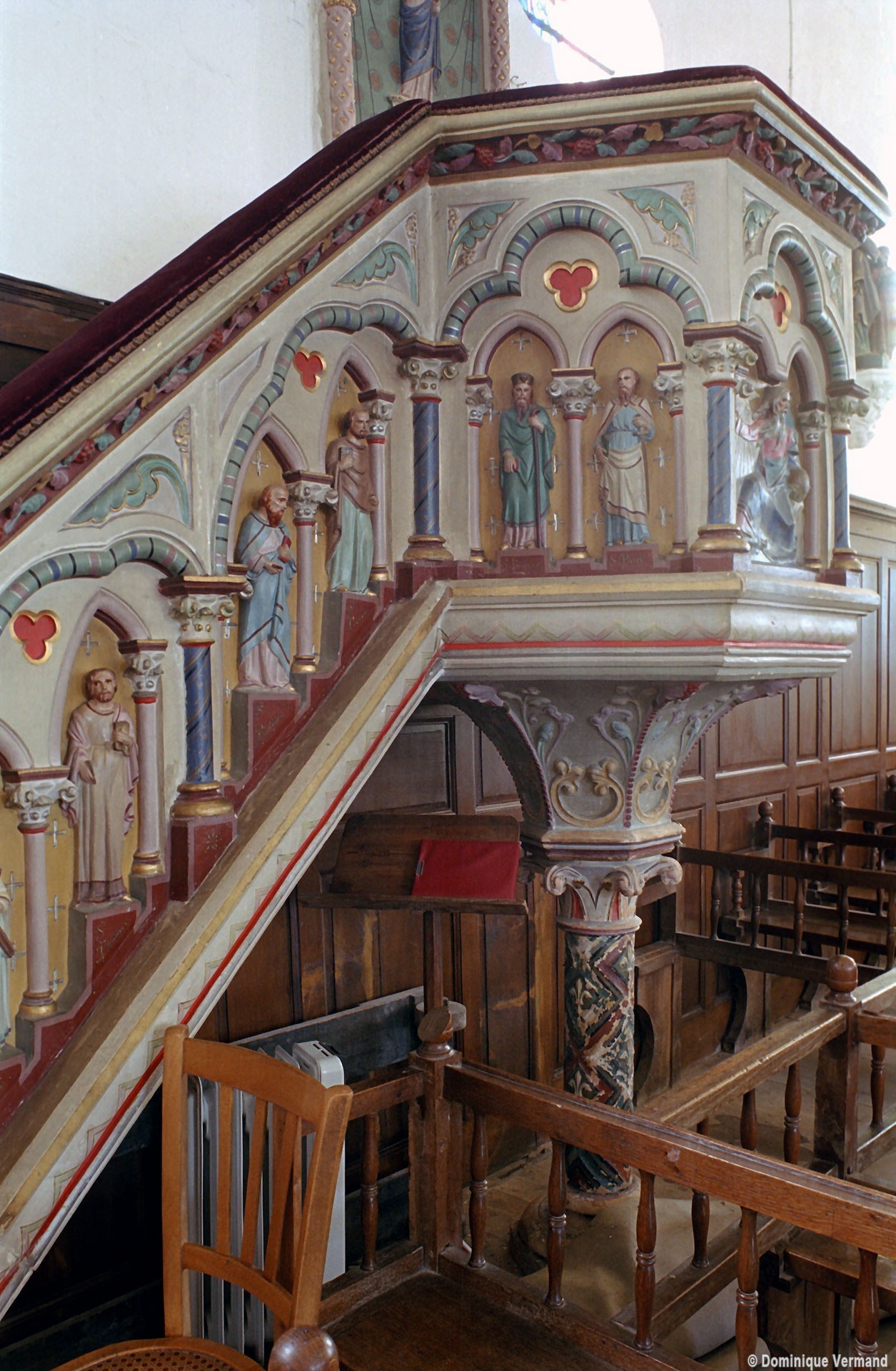 On remarquera surtout les belles boiseries du chœur, de la fin du 17ème siècle, encadrant deux vitraux de l’atelier Bazin-Latteux (1875-76) et une amusante chaire en plâtre peint, avec la représentation des douze Apôtres, mélangeant les styles néo-roman et gothique (2005).