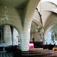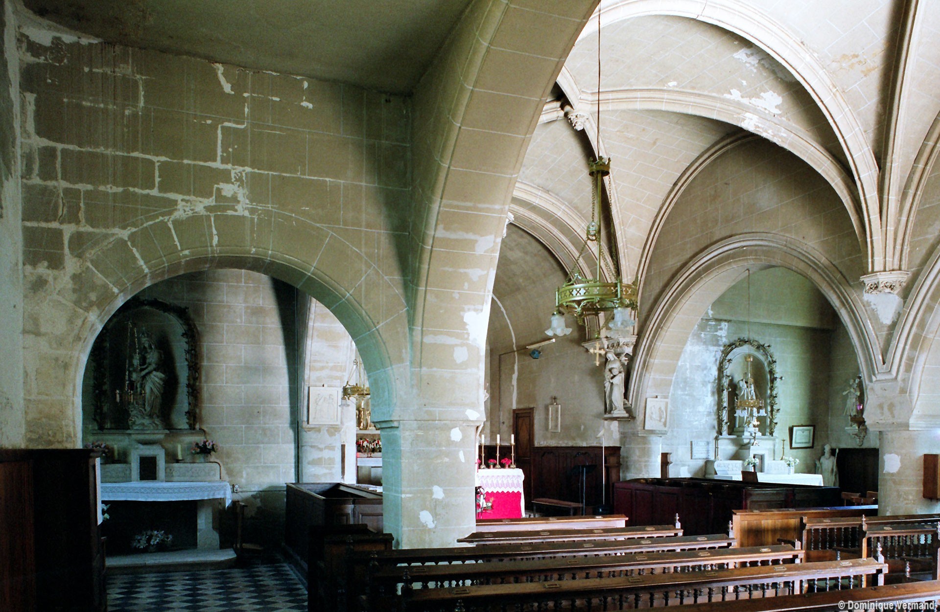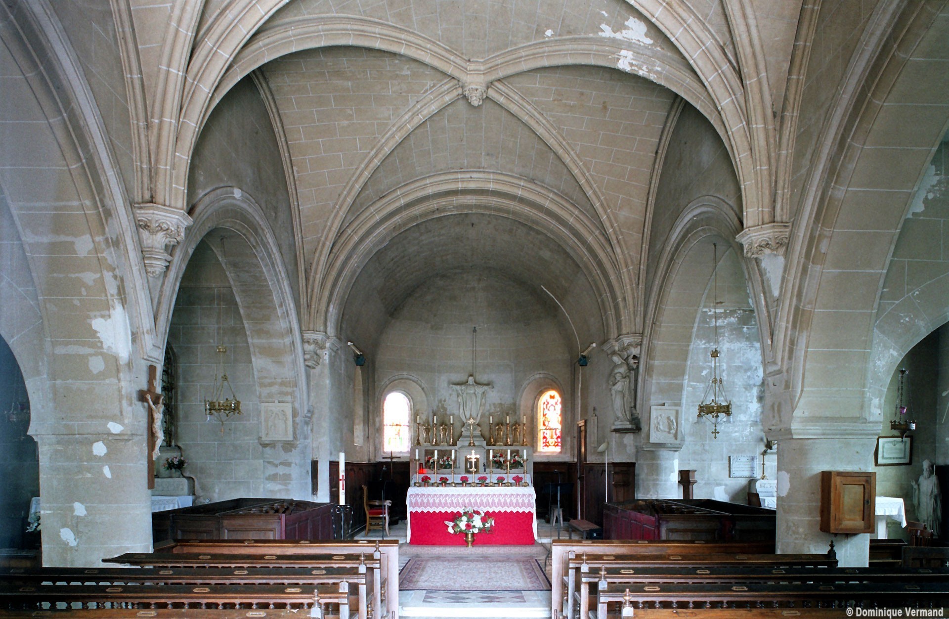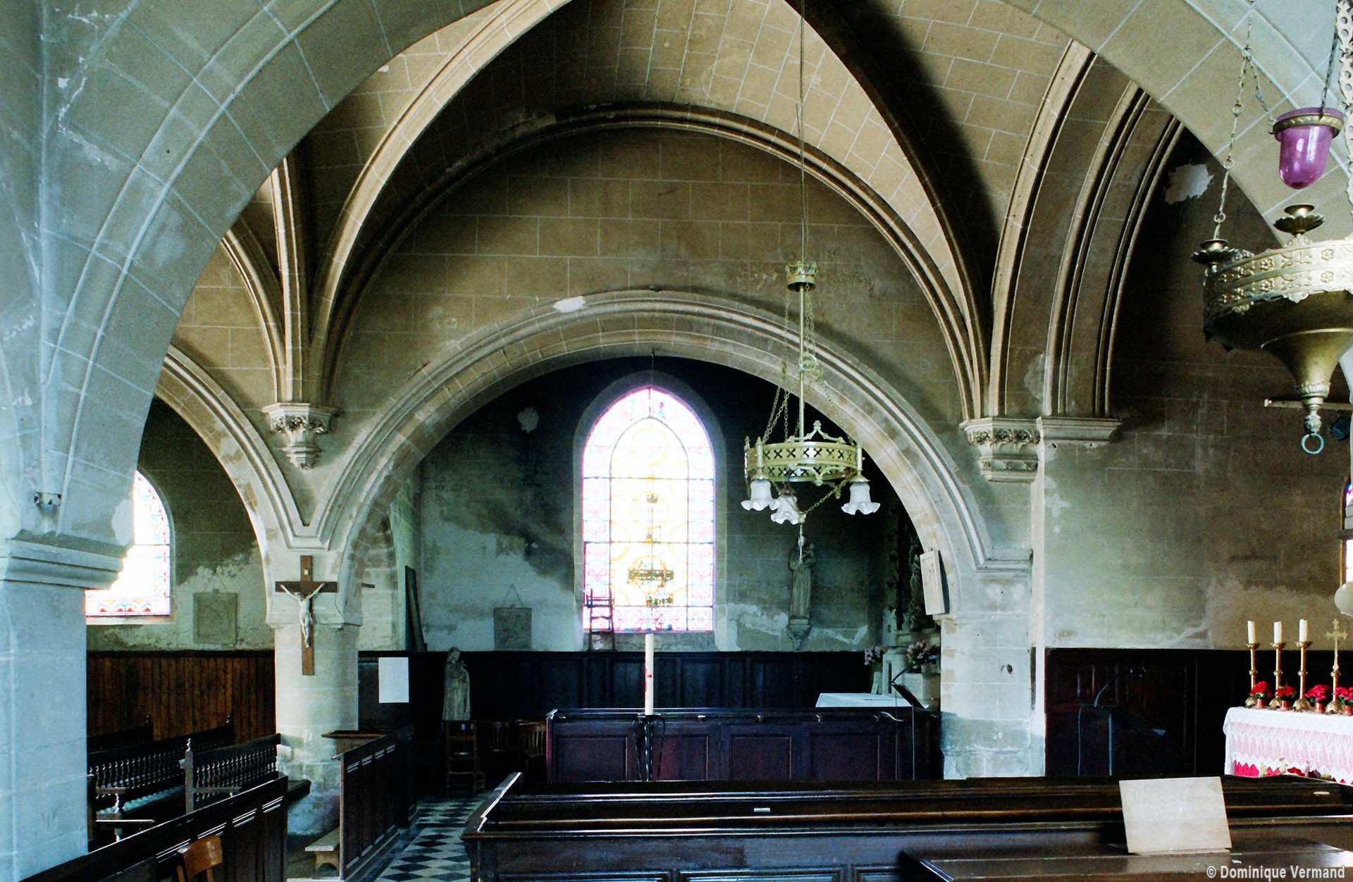 Très largement reconstruite à l’identique après la Guerre 14-18, Saint-Médard remontait, dans ses parties les plus anciennes, au 16ème siècle. A cette époque pouvaient être attribués la nef, le transept fortement saillant et le choeur, terminé par une abside à trois pans. Un soubassement en grès caractérise encore aujourd’hui cet ensemble, qui relève d’une architecture réduite à sa plus simple expression et dénuée de toute recherche esthétique. Montées une première fois au 19ème siècle à la place d’un lambris, les deux voûtes d’ogives en plâtre de la nef ont été refaites.