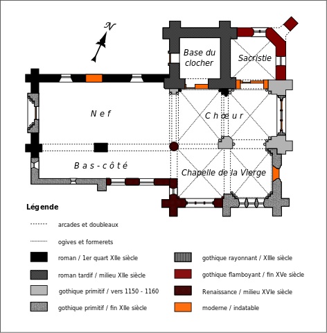 Après l’adjonction, au 13ème siècle, d’une chapelle non voûtée et assez atypique au sud-ouest de la nef (chapelle des fonts baptismaux), l’église connaîtra un répit qui ne cessera qu’à la fin de la Guerre de Cent ans : durant le dernier quart du 15ème siècle, une chapelle de style gothique flamboyant vient en effet combler, au nord-est, l’espace existant entre le clocher et le choeur tandis que celui subsistant au sud accueille, durant la première moitié du siècle suivant, une travée de bas-côté et une chapelle au style timidement teinté des apports de la Renaissance (1996, modifié 2016).
