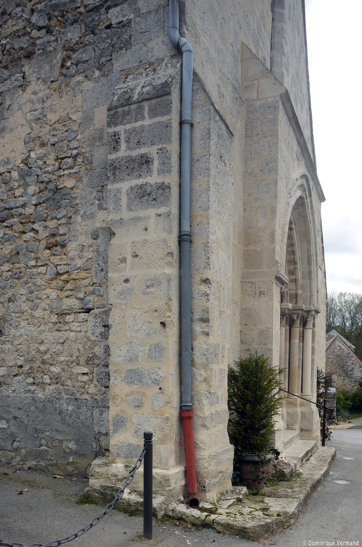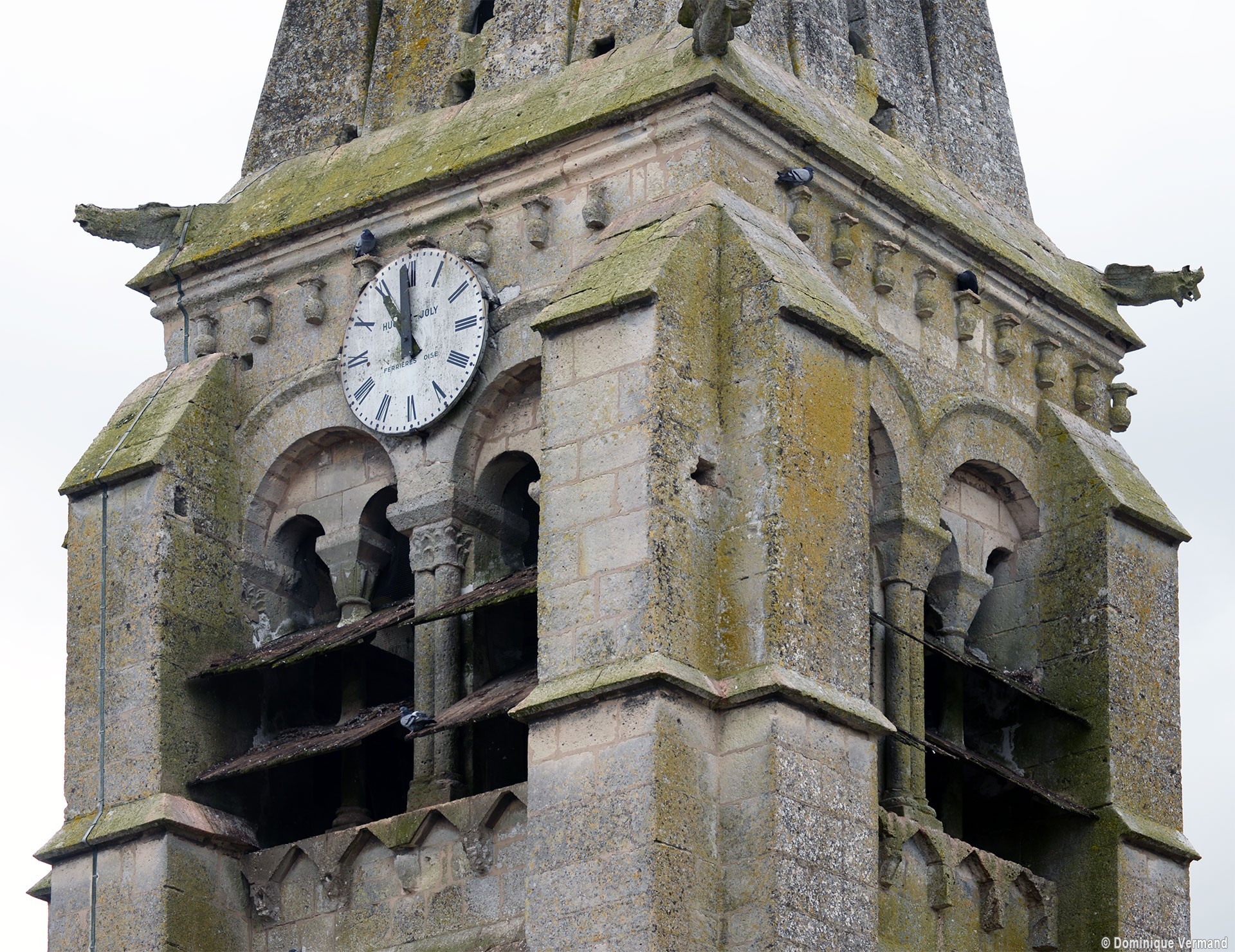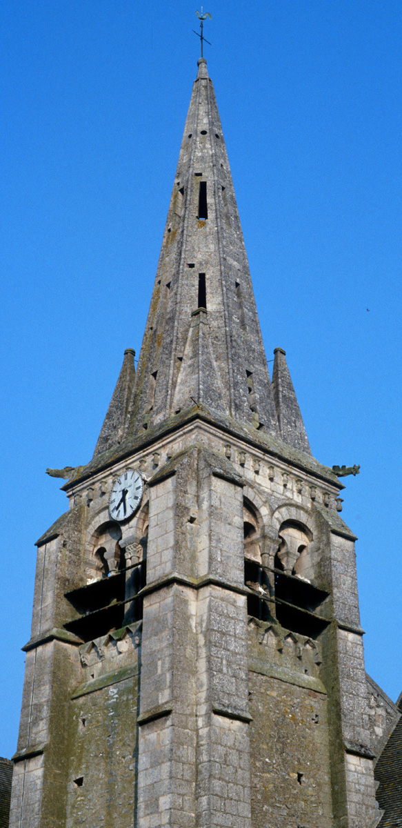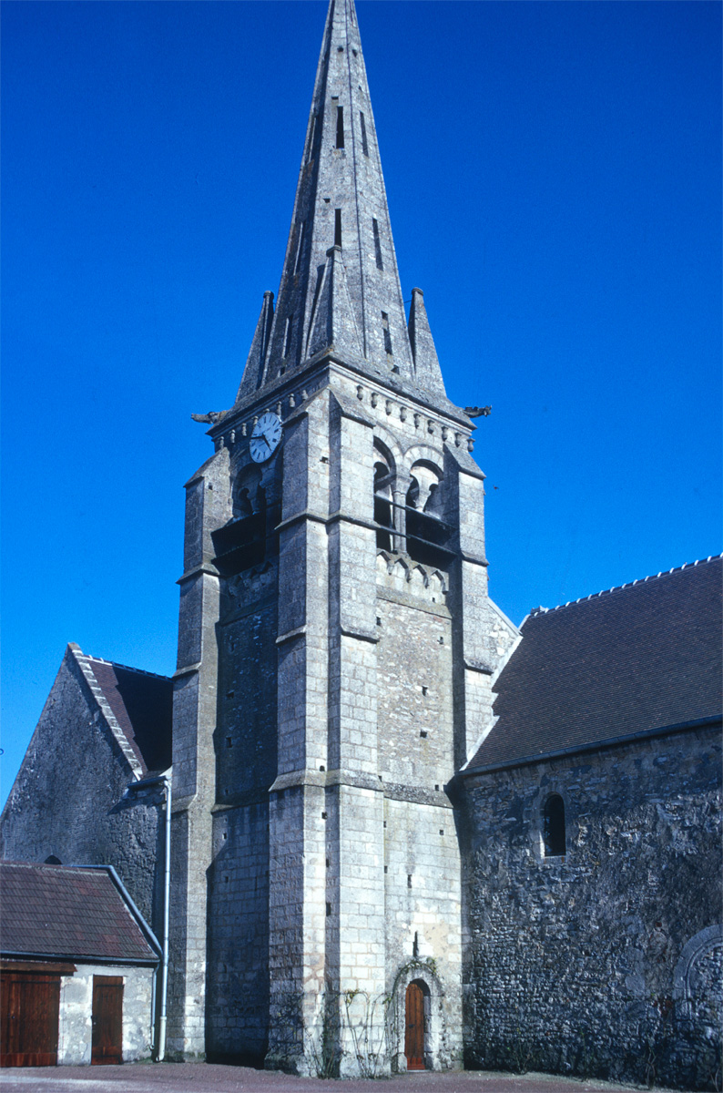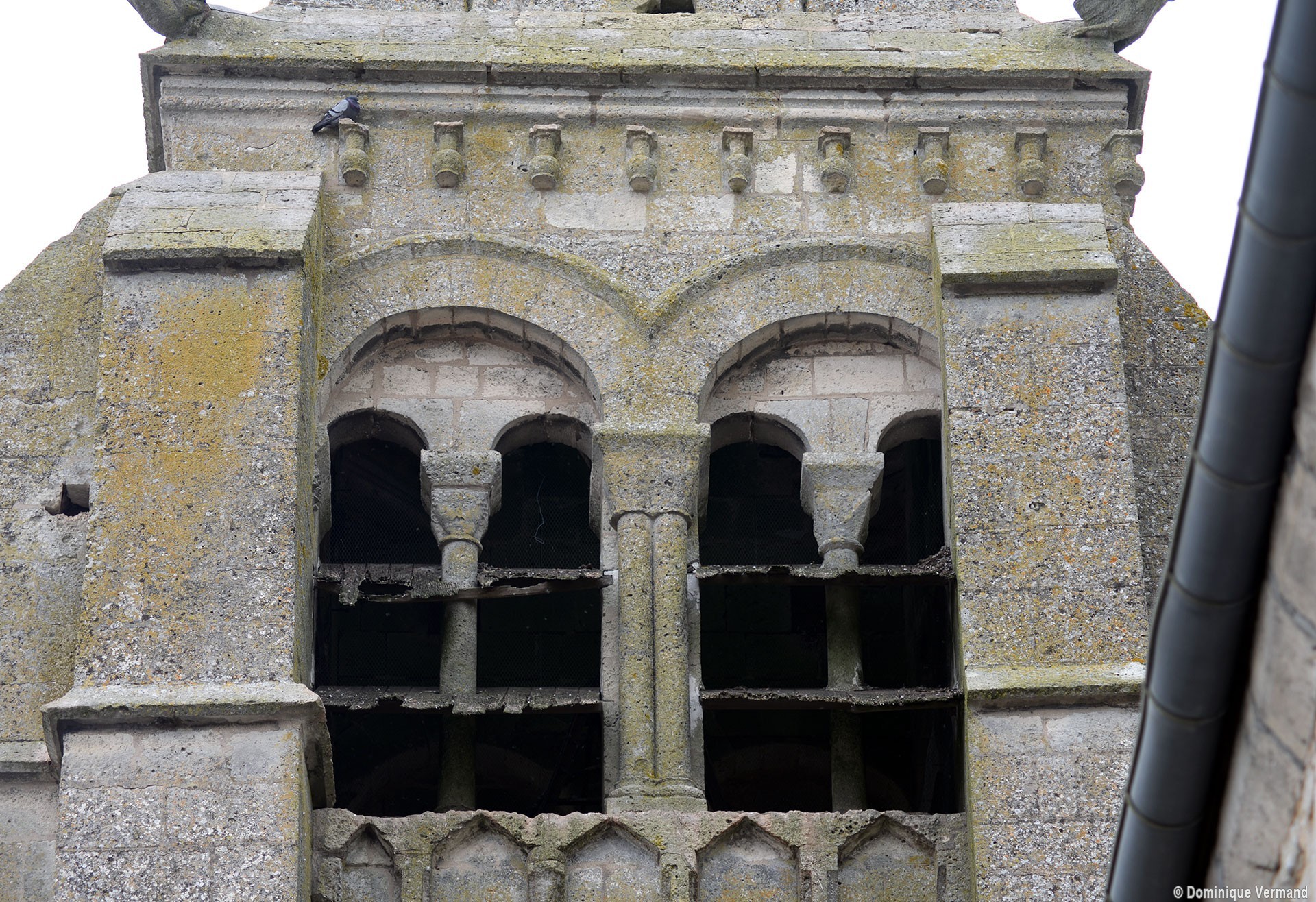 L’église du début du 12ème siècle comprenait une nef sans bas-côtés dont subsistent le mur nord avec une porte en plein cintre aujourd’hui bouchée, un choeur qui a conservé trois chapiteaux à la facture grossière – associés peut-être à l’origine à une voûte d’arêtes – et la partie inférieure du clocher. Son étage de beffroi, ajouré sur chaque face de deux baies géminées recoupées par une colonnette, ne sera édifié qu’un peu plus tard, dans les années 1140. C’est également la date de la flèche octogonale, garnie de petites pyramides d’angle et assez proche de celle de Béthisy-Saint-Martin. En partie haute, les contreforts empiètent d’une manière inesthétique sur les baies, résultat de travaux de renforcements réalisés au 16ème siècle et rendus nécessaires afin assurer une bonne stabilité à la flèche.